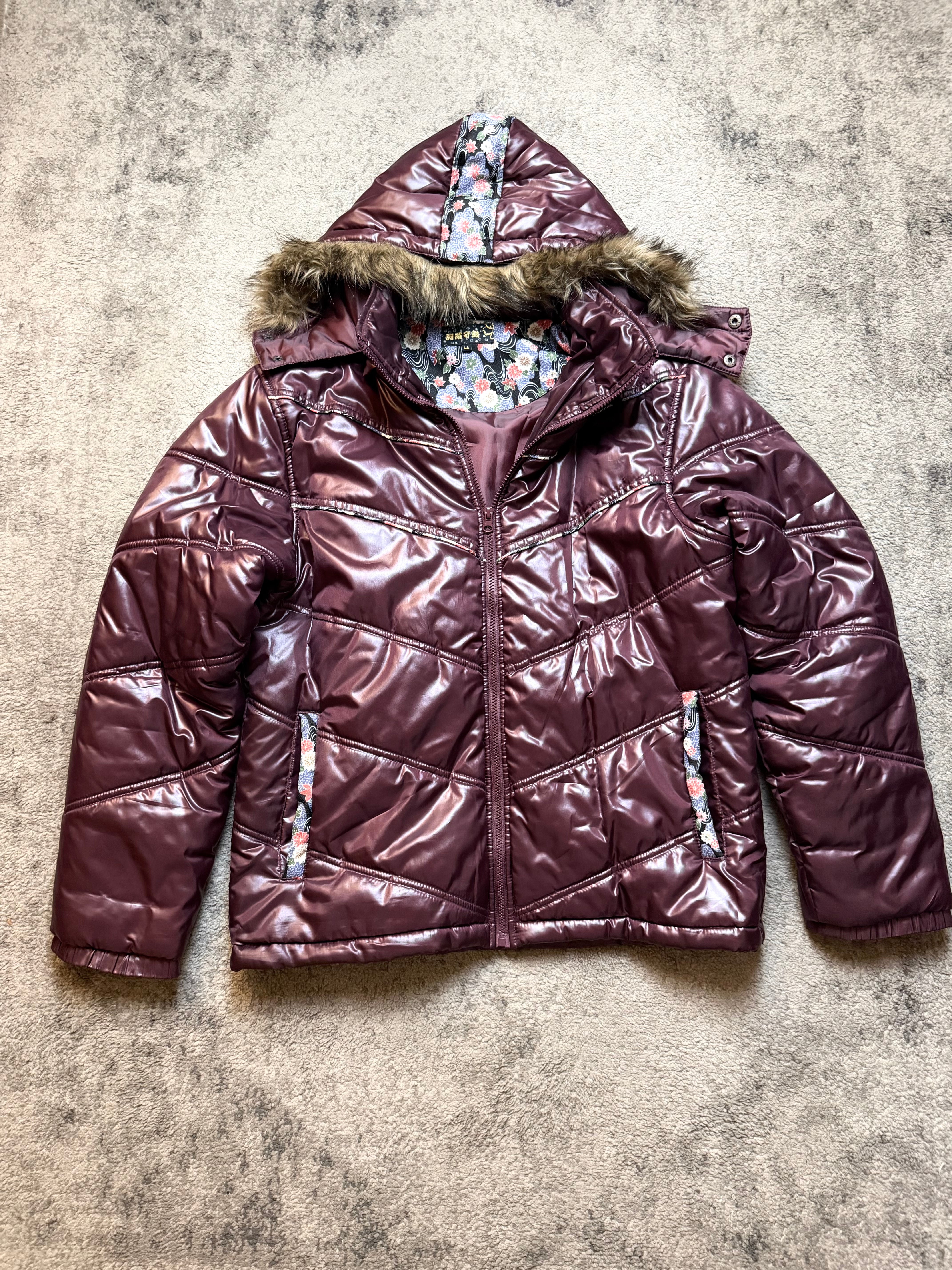 Gloss-coated outer shell with full quilt padding. Soft printed inner lining featuring colorful retro motifs. Faux-fur hood trim for extra comfort and Y2K flair.