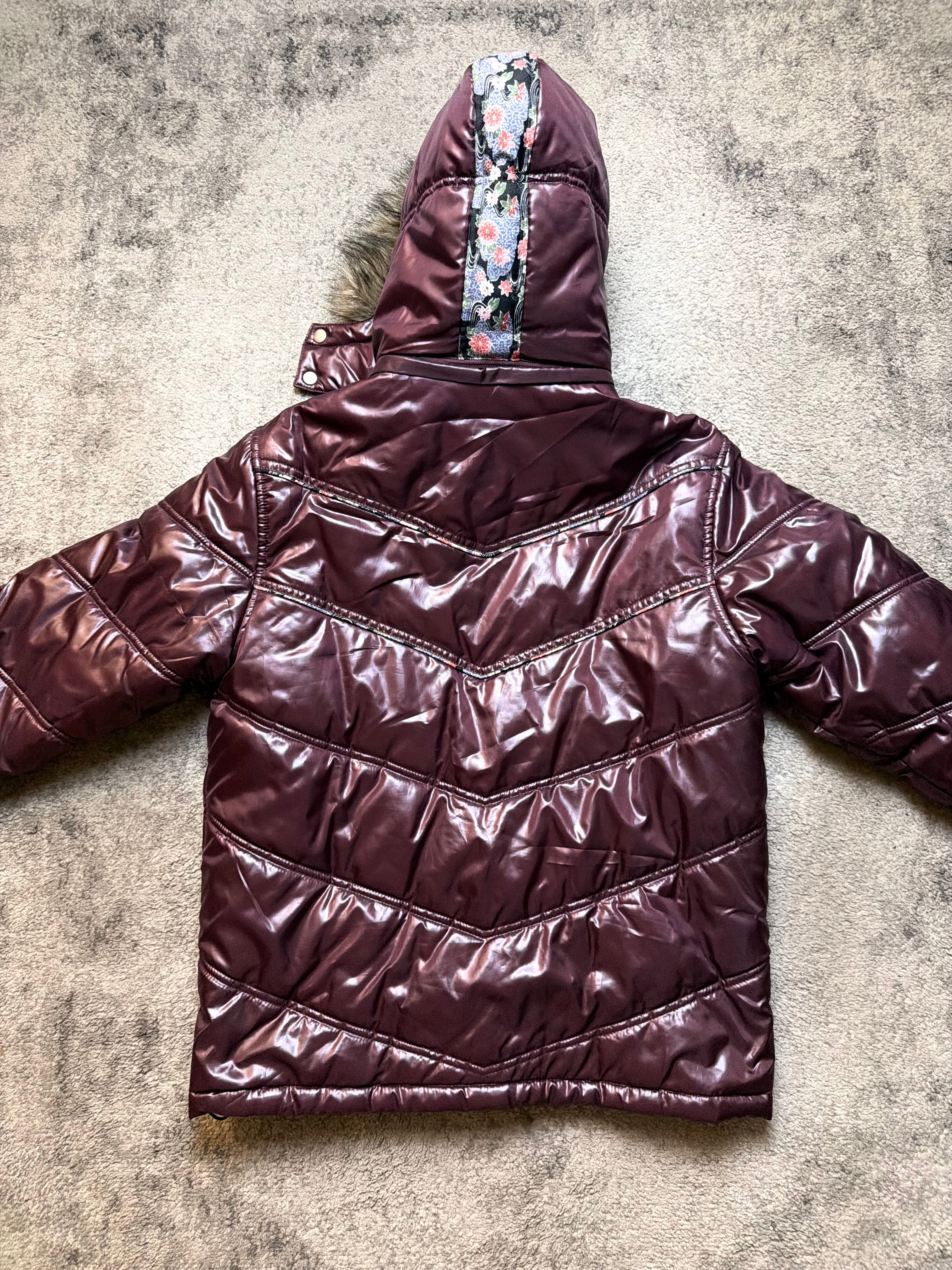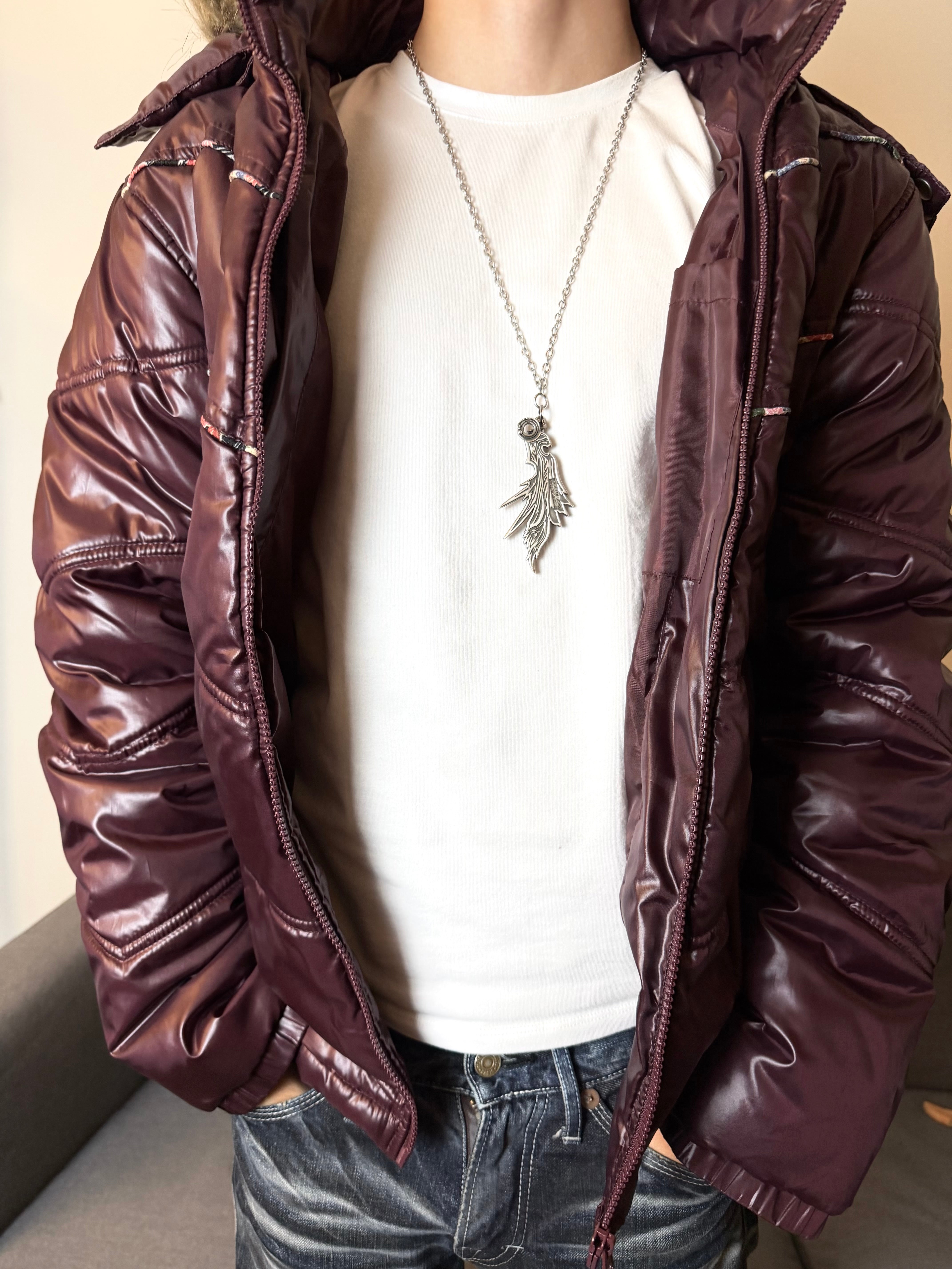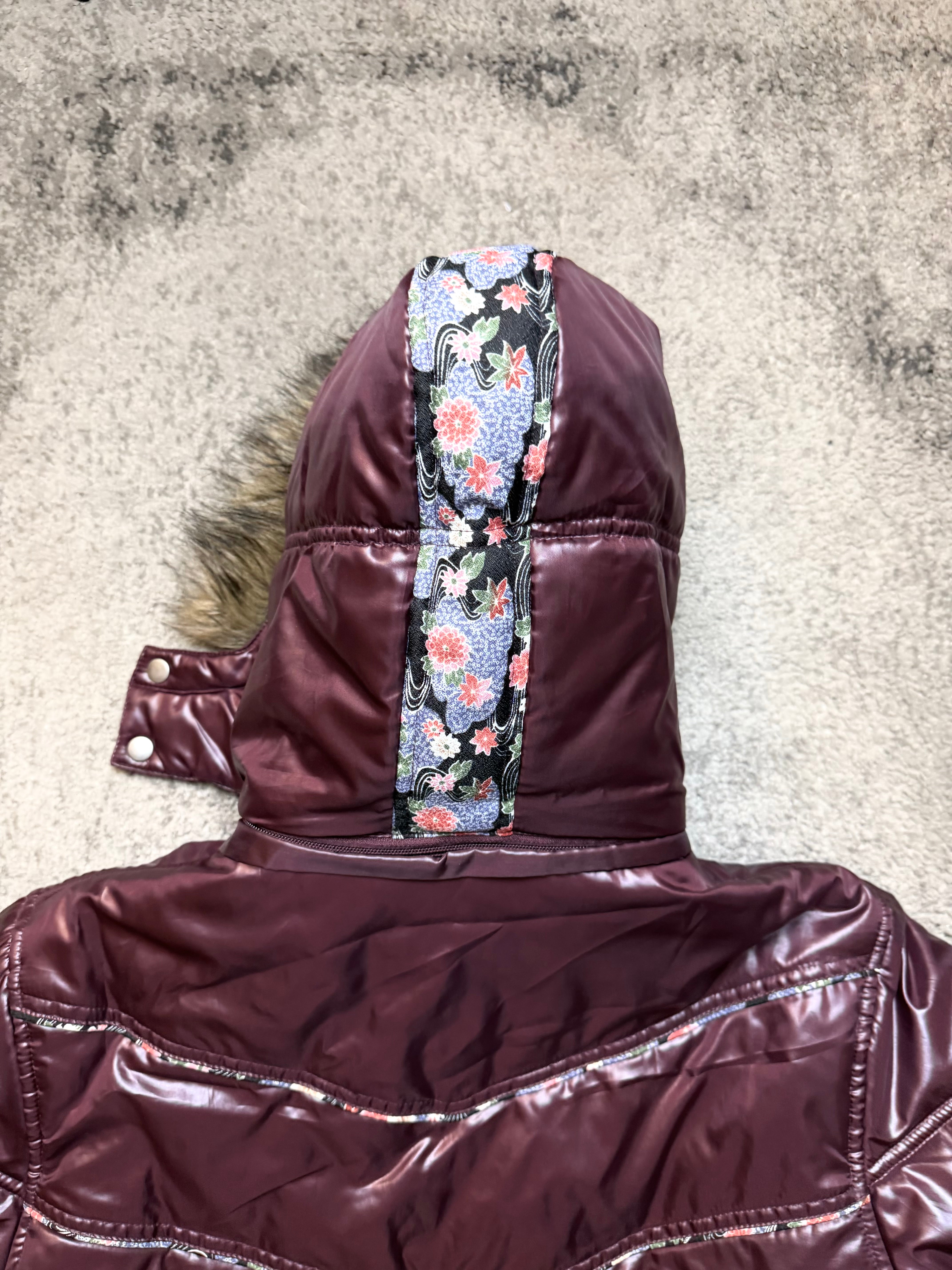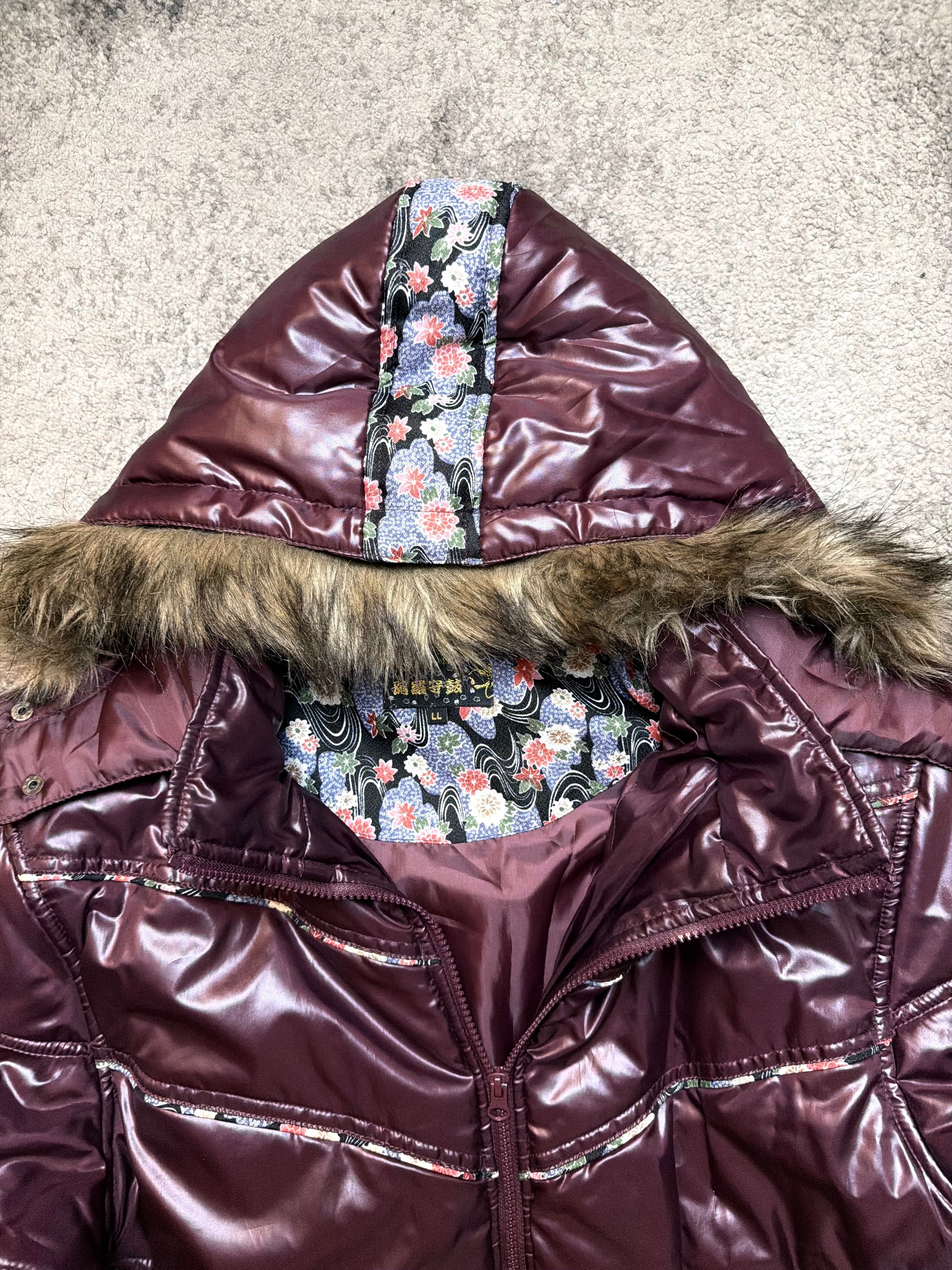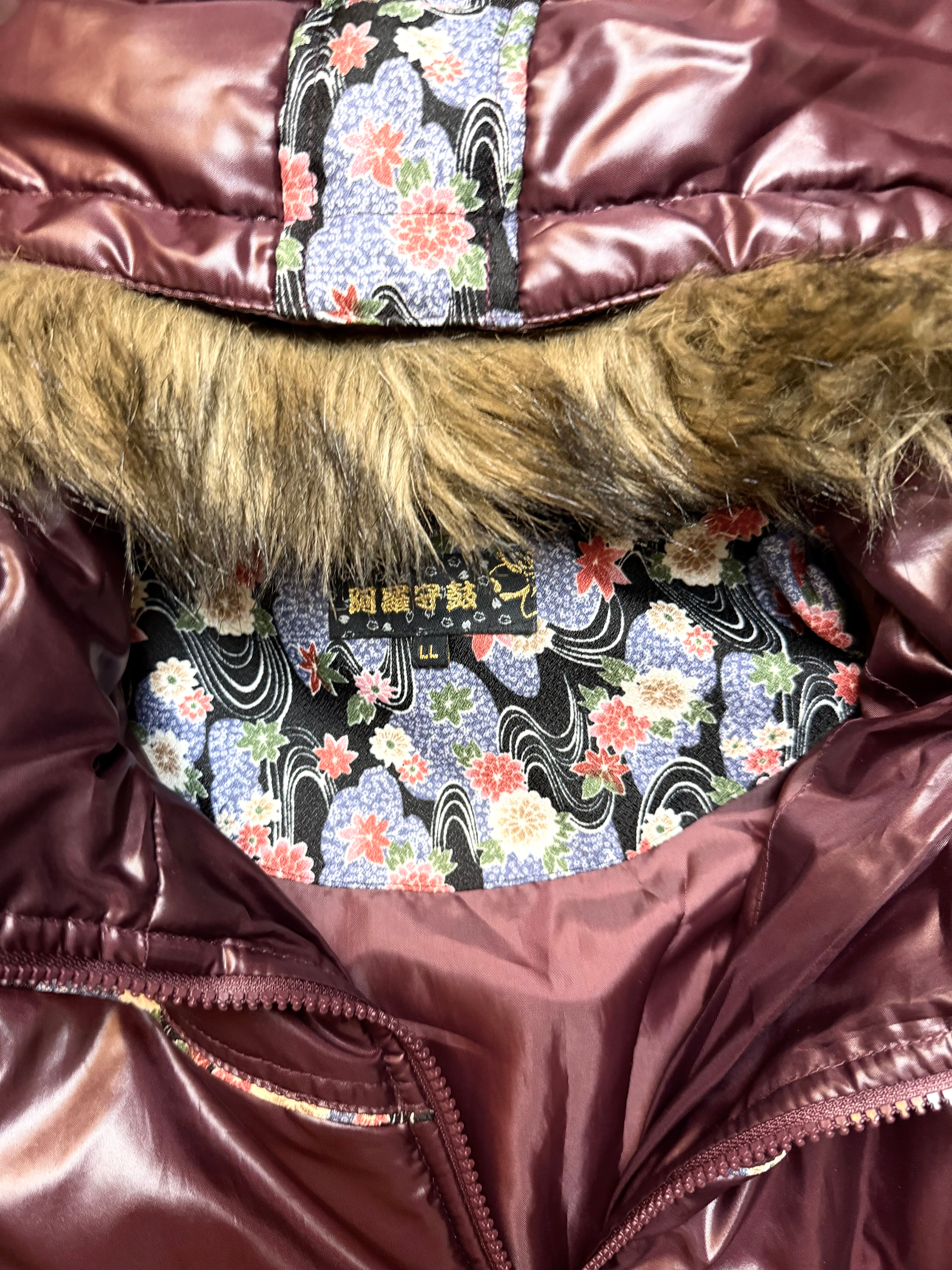 A rare, attitude-heavy winter piece in a striking plum tone—shiny, quilted, and lined with playful retro-print fabric that feels straight out of an early-2000s Harajuku closet. Cozy on the outside, chaotic on the inside.