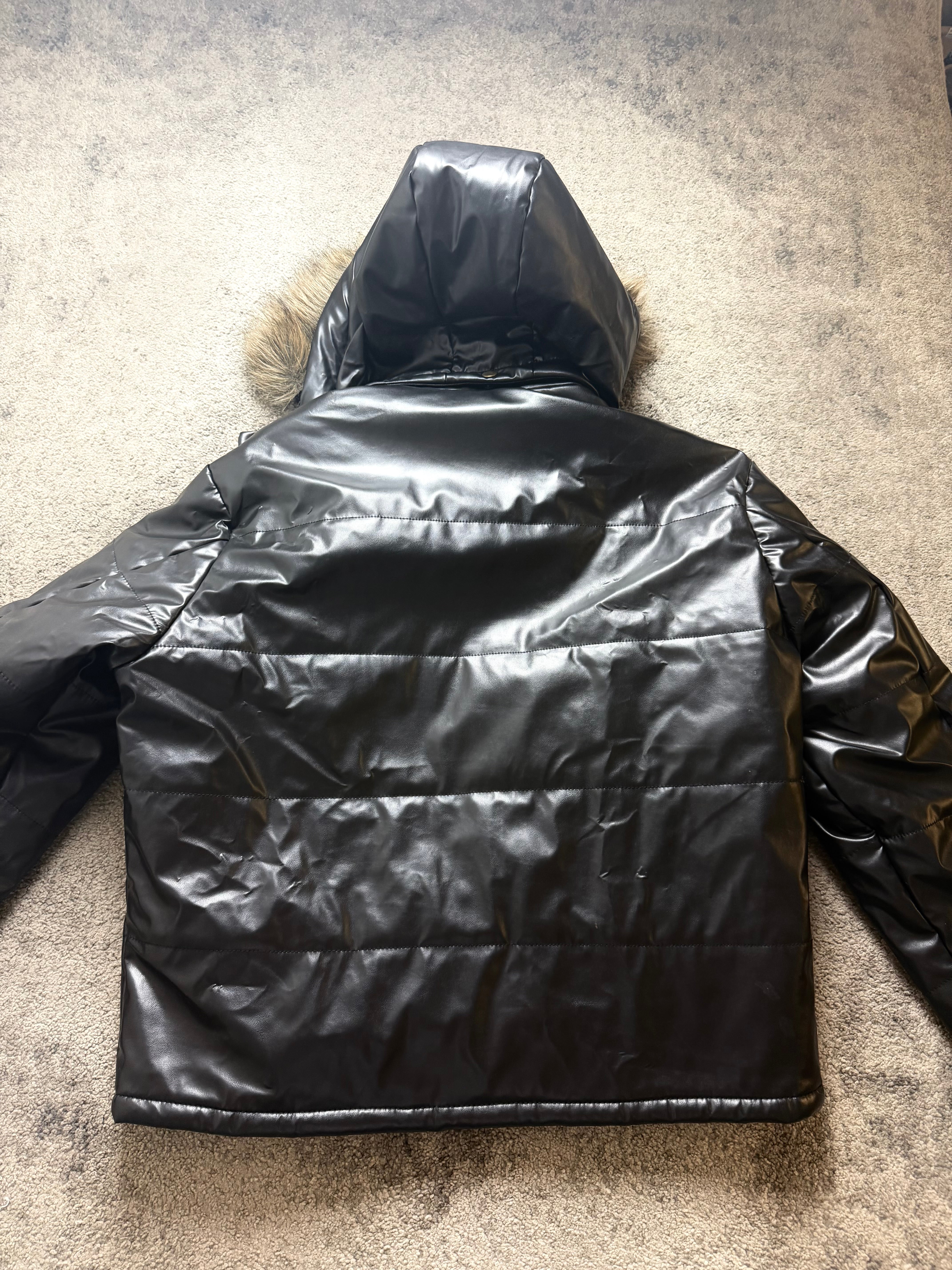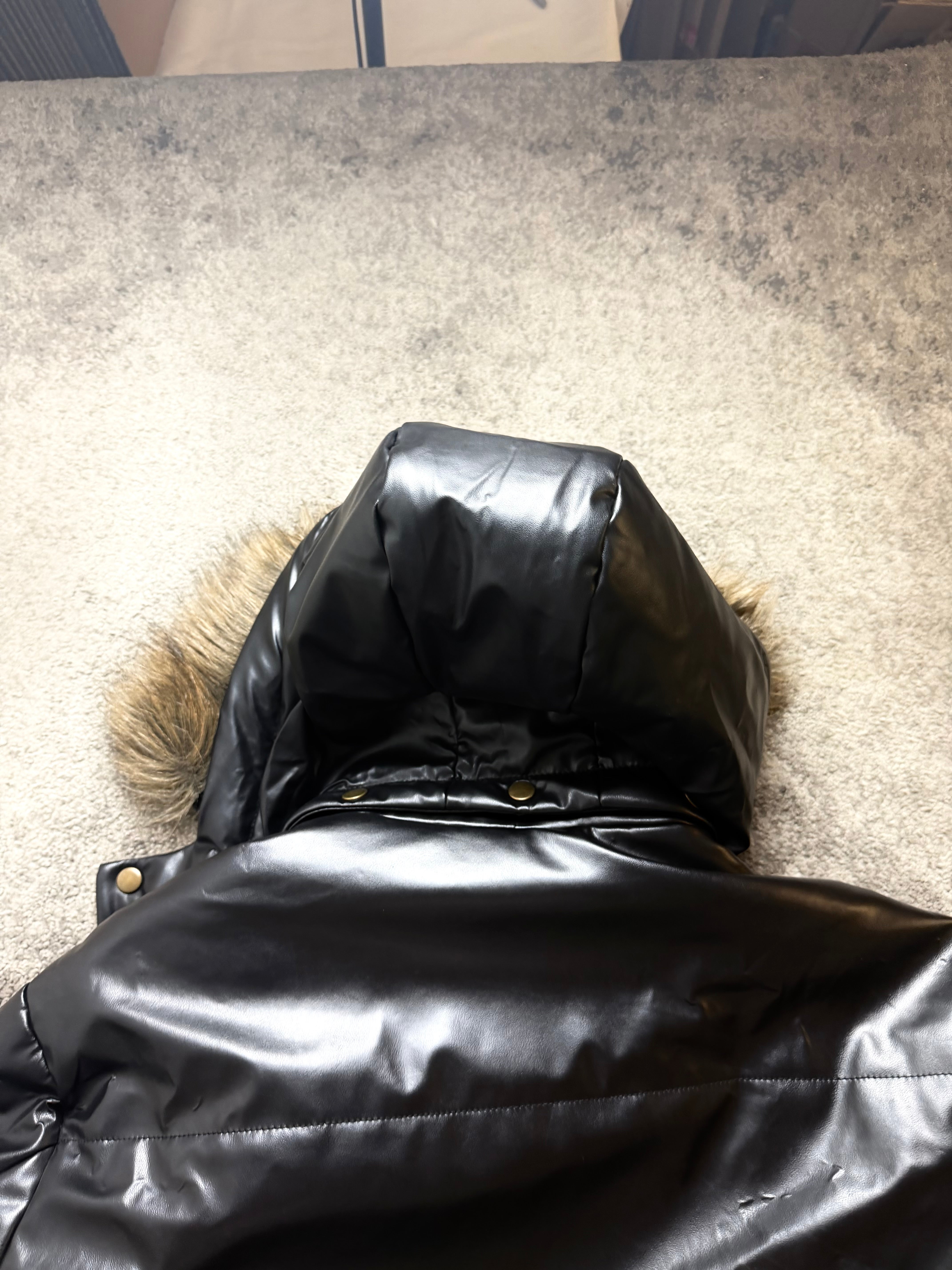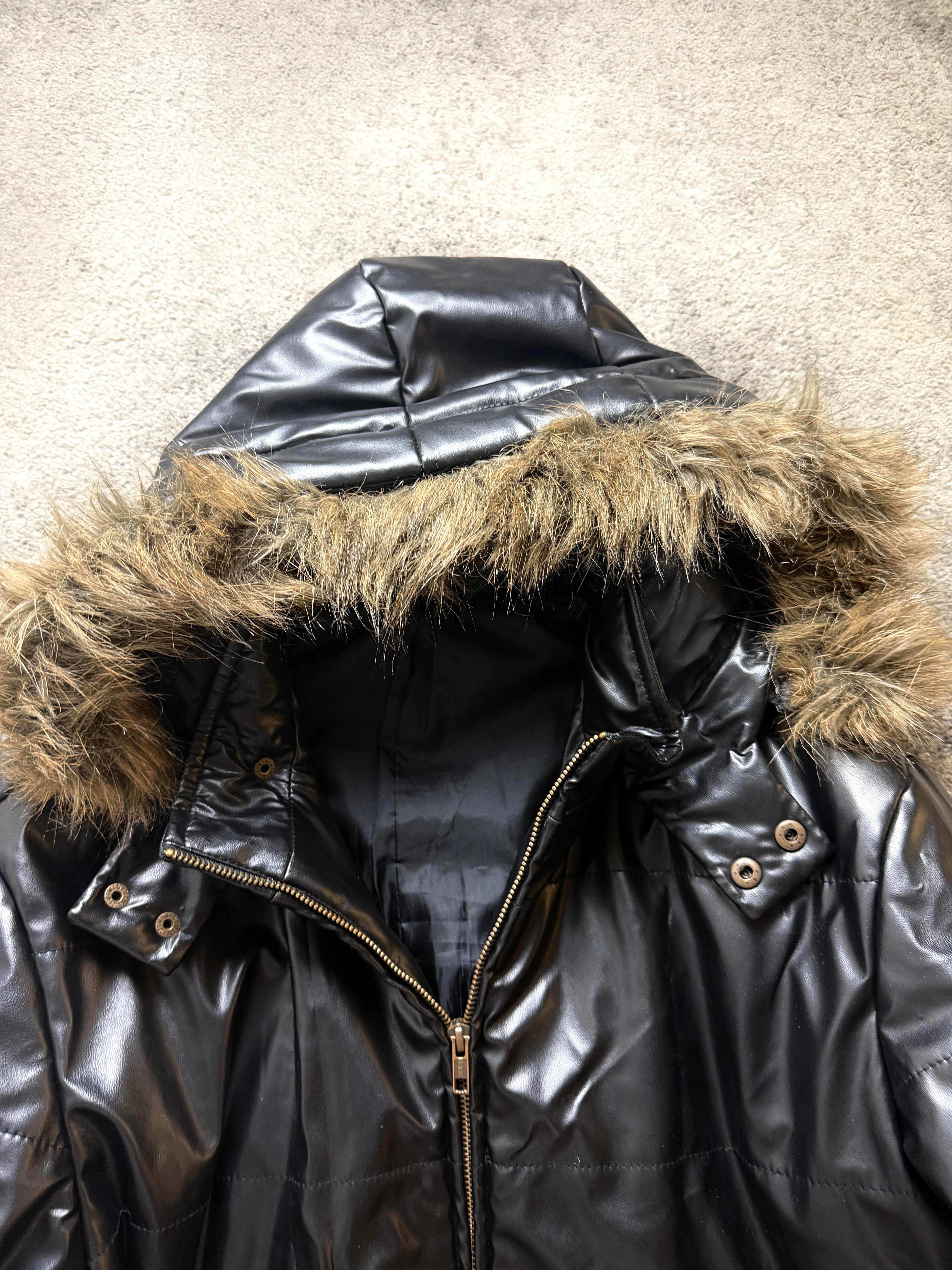 Shiny coated nylon shell with a smooth, slightly structured feel. Warm padded insulation for real winter comfort. Soft inner lining. Faux-fur trimmed hood for contrast and texture.