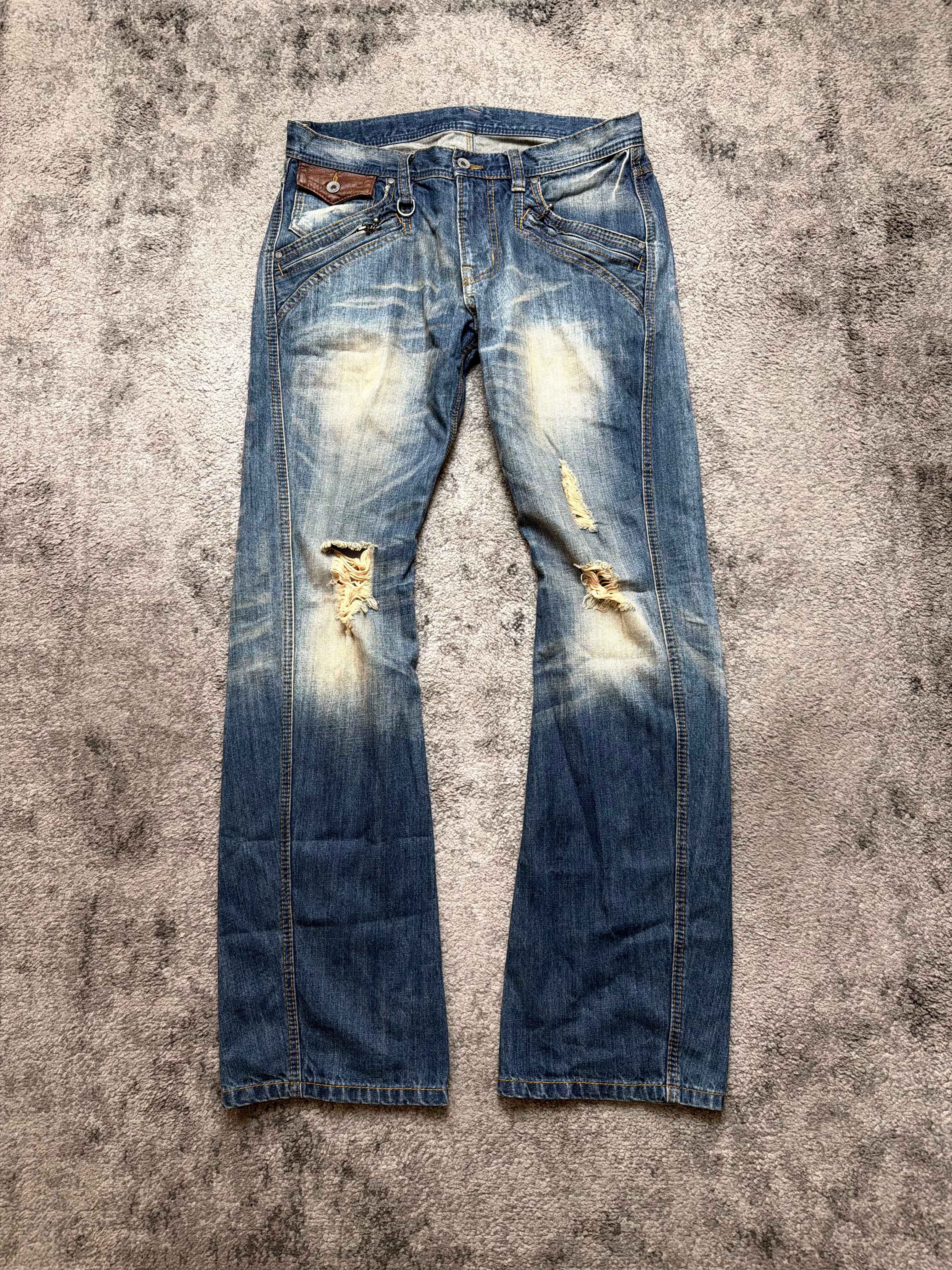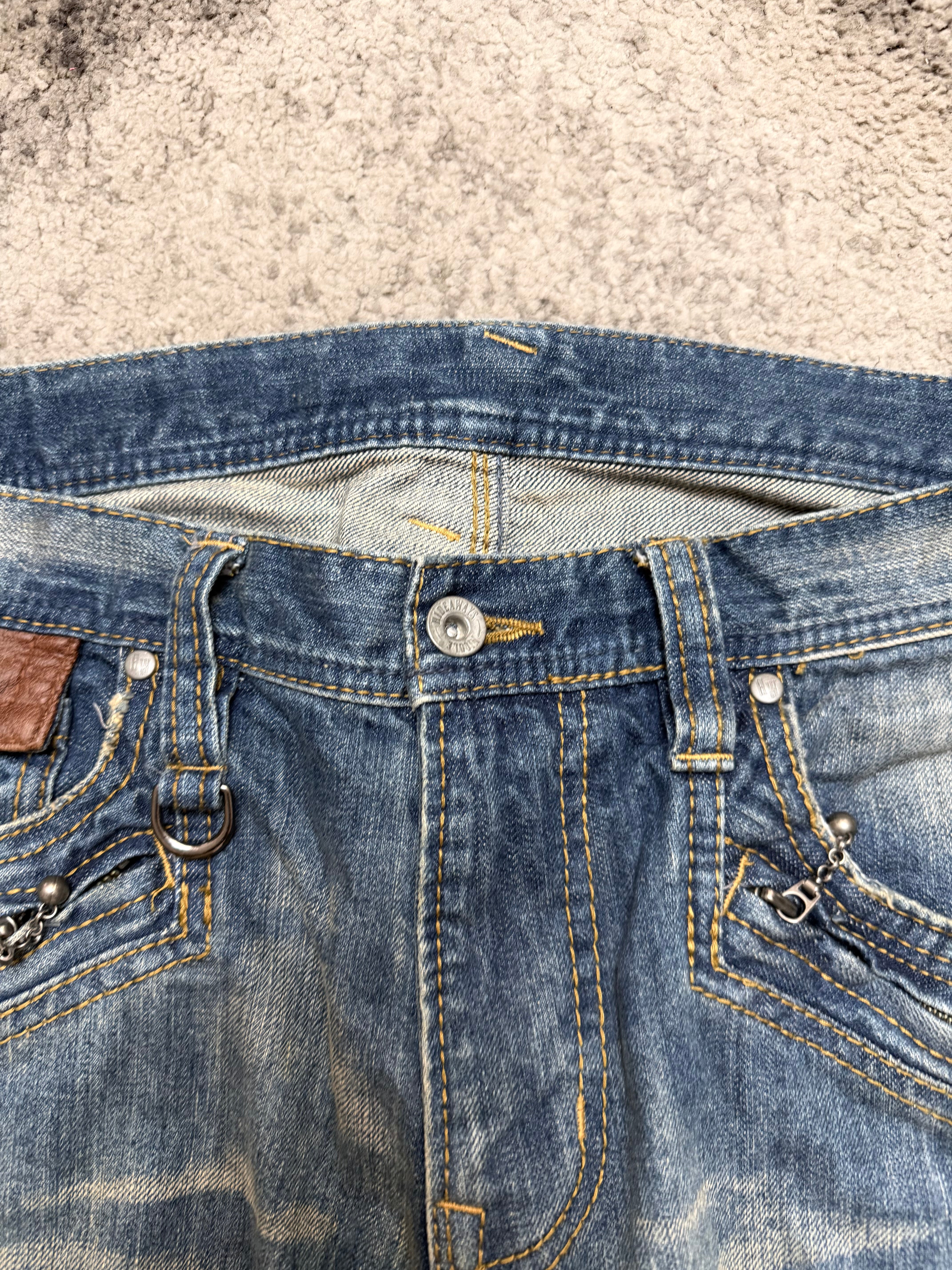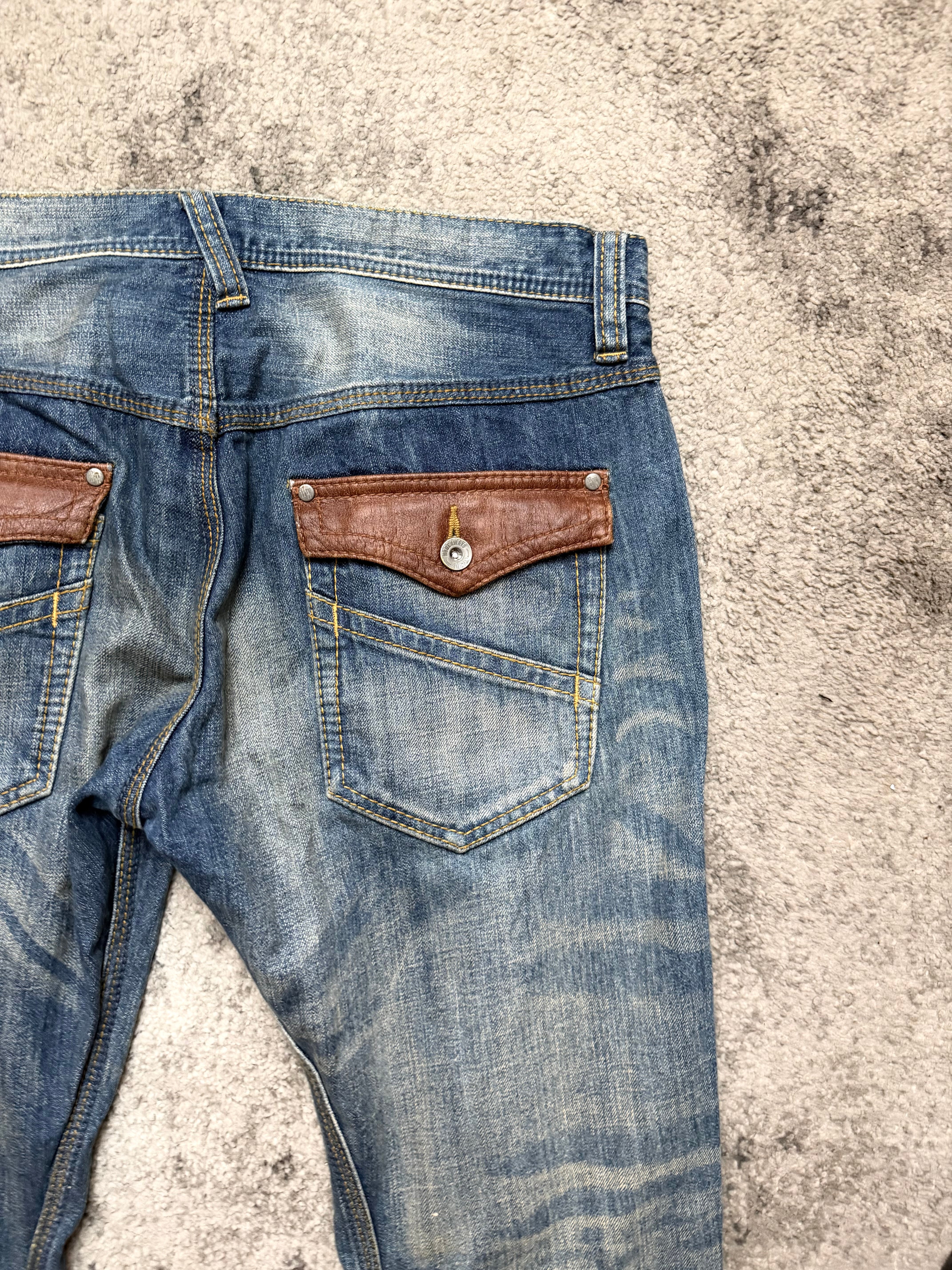 Styling: Asymmetric distressing, sharp panel seams and leather-trimmed coin pockets give it that archive Y2K energy – a little host-core, a little gyaruo rebel. The kind of denim that looks better thrown on than carefully planned.