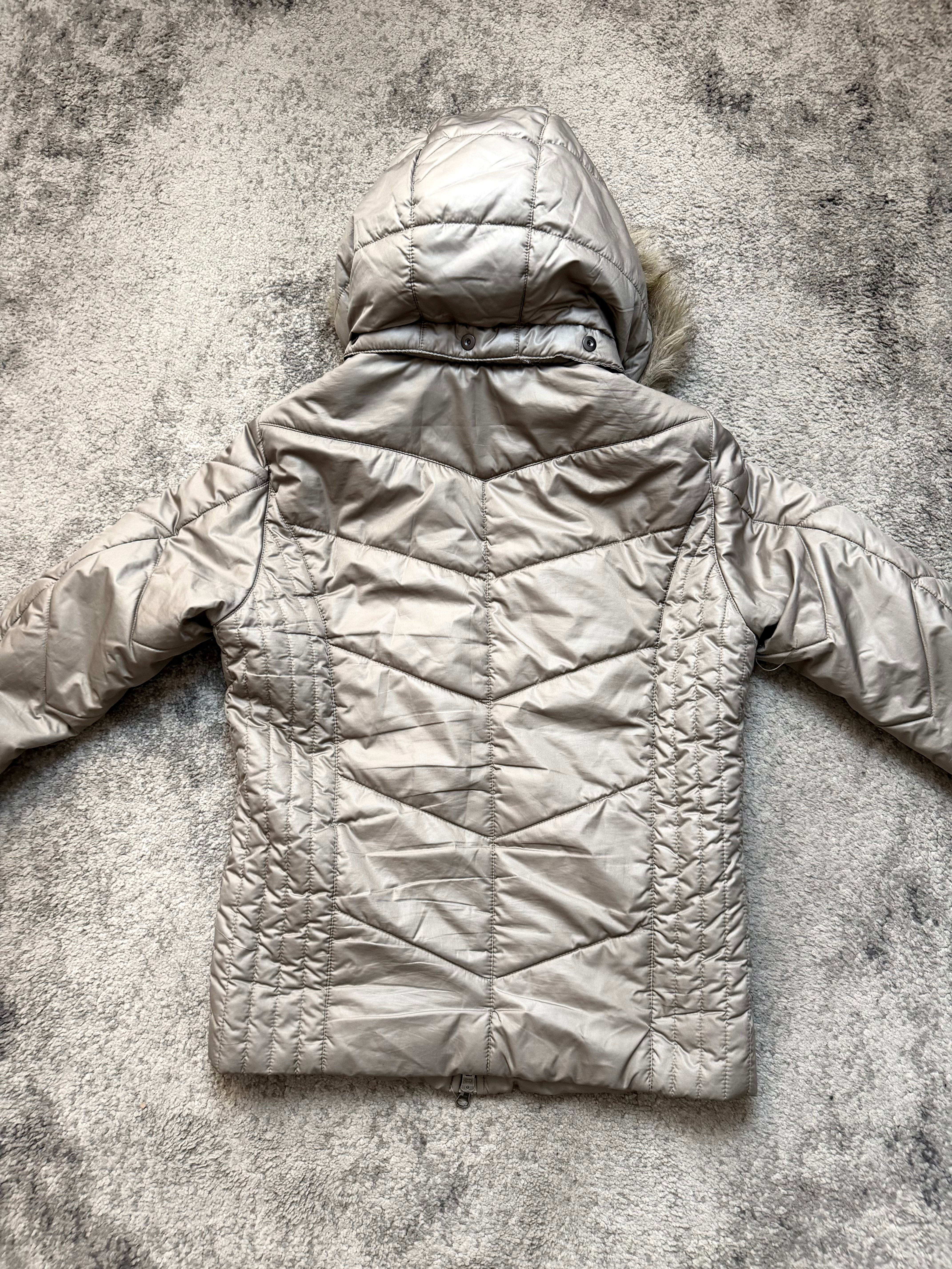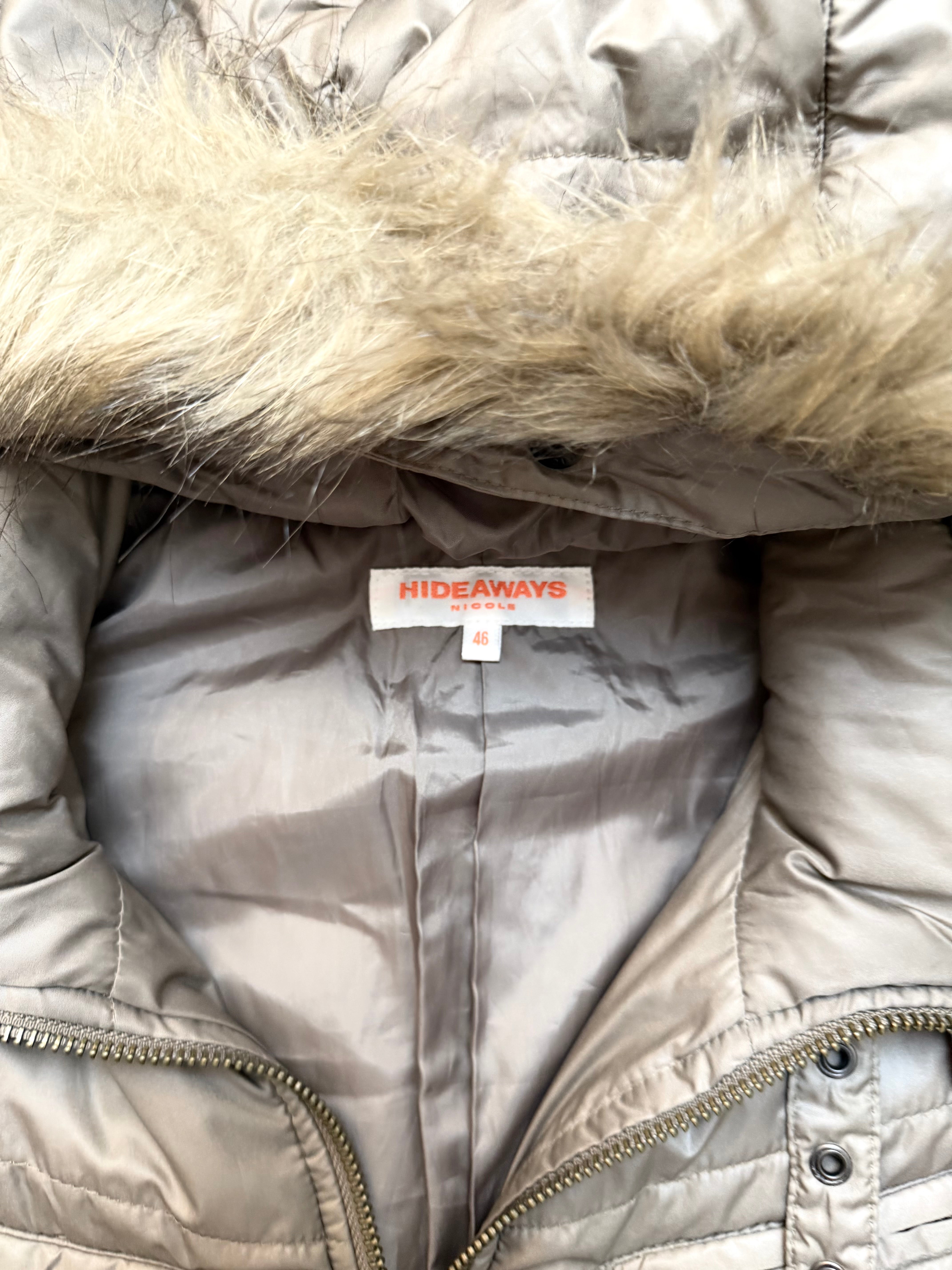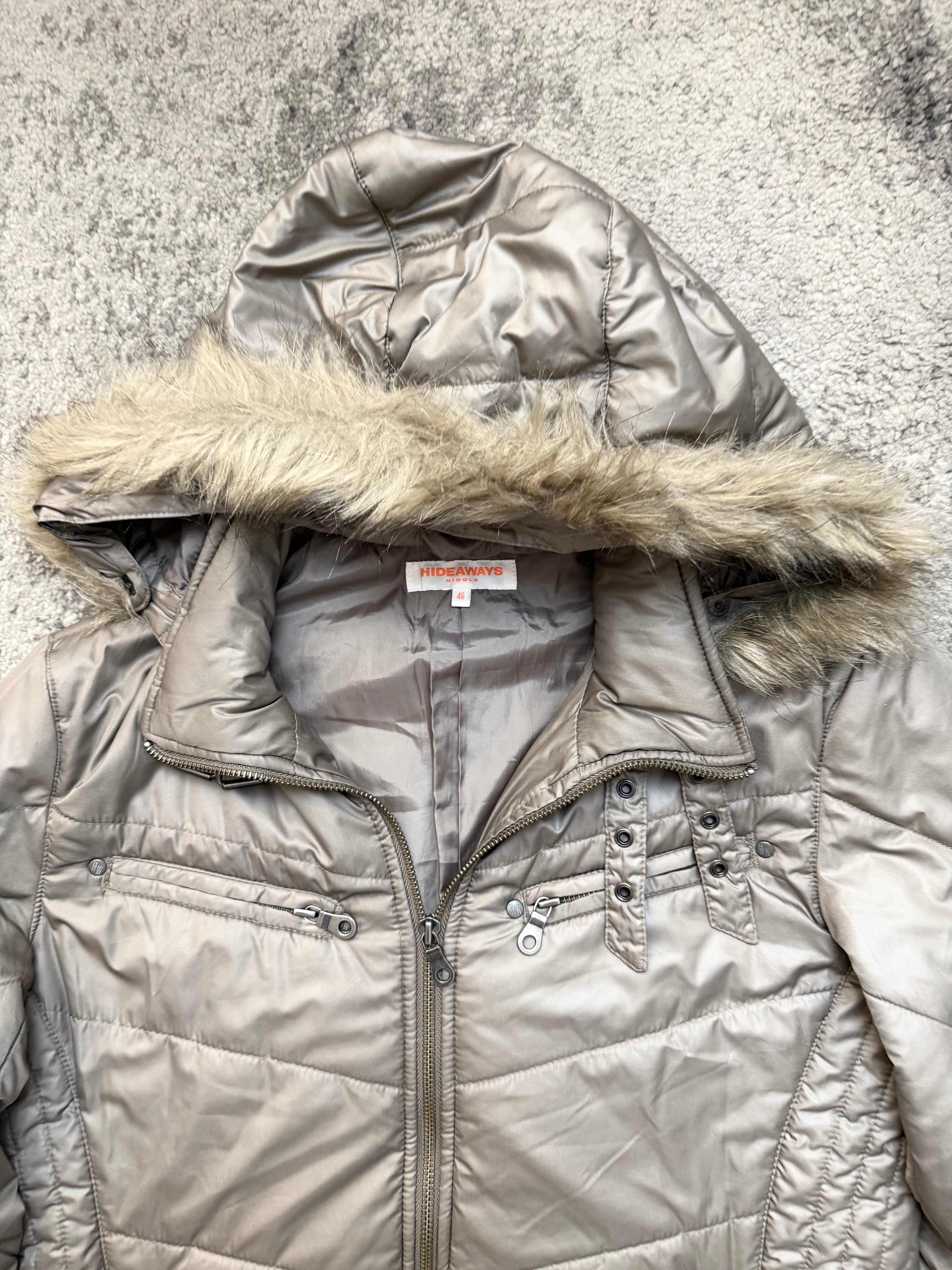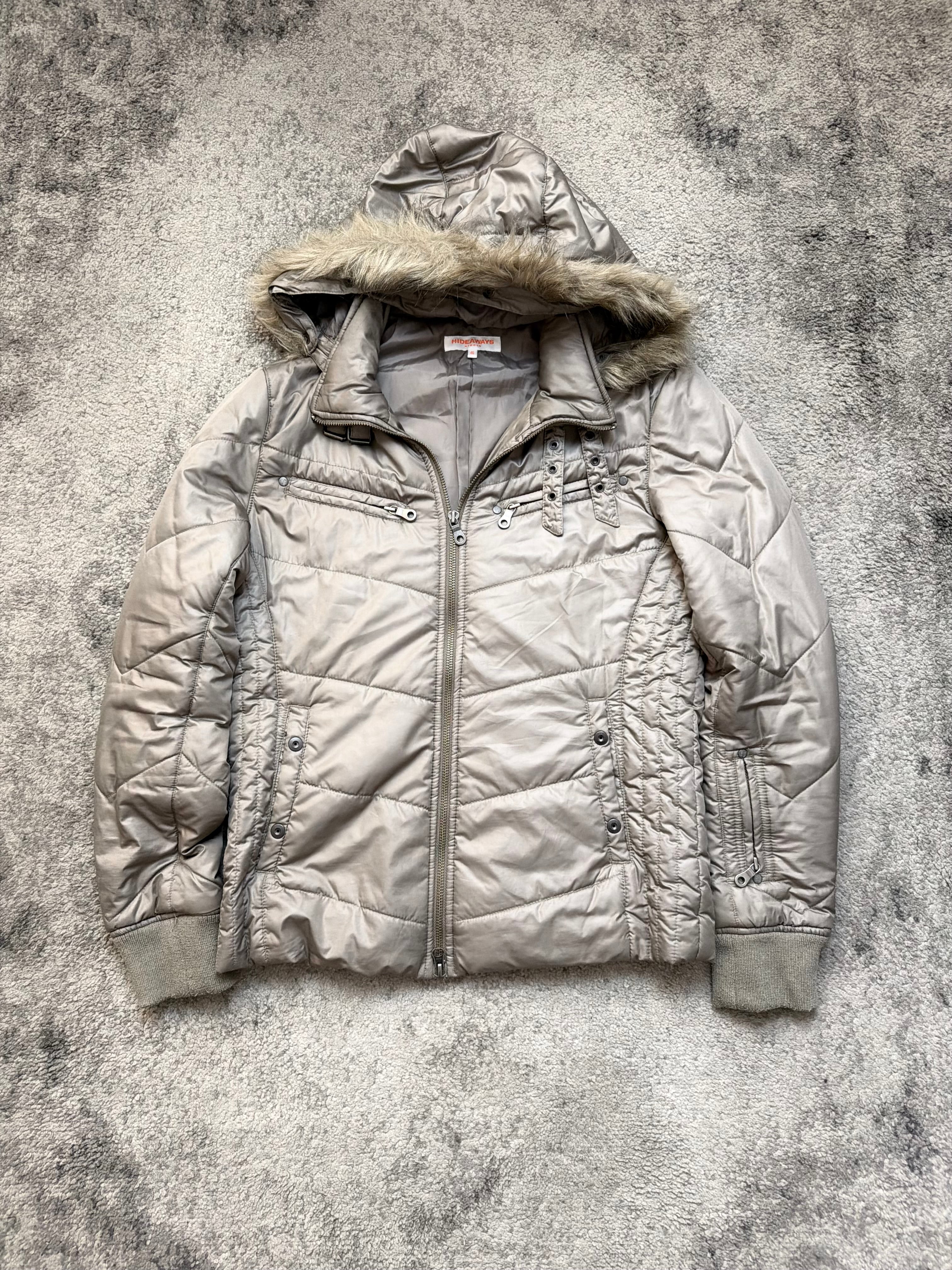 This piece from HIDEAWAYS embodies that early-2000s Tokyo street refinement — blending functionality with subtle drama. The metallic silver tone and asymmetric quilting give it an avant-garde presence, while the detachable faux-fur hood softens the silhouette with warmth and texture. A jacket made to move between the streets and the silence.
