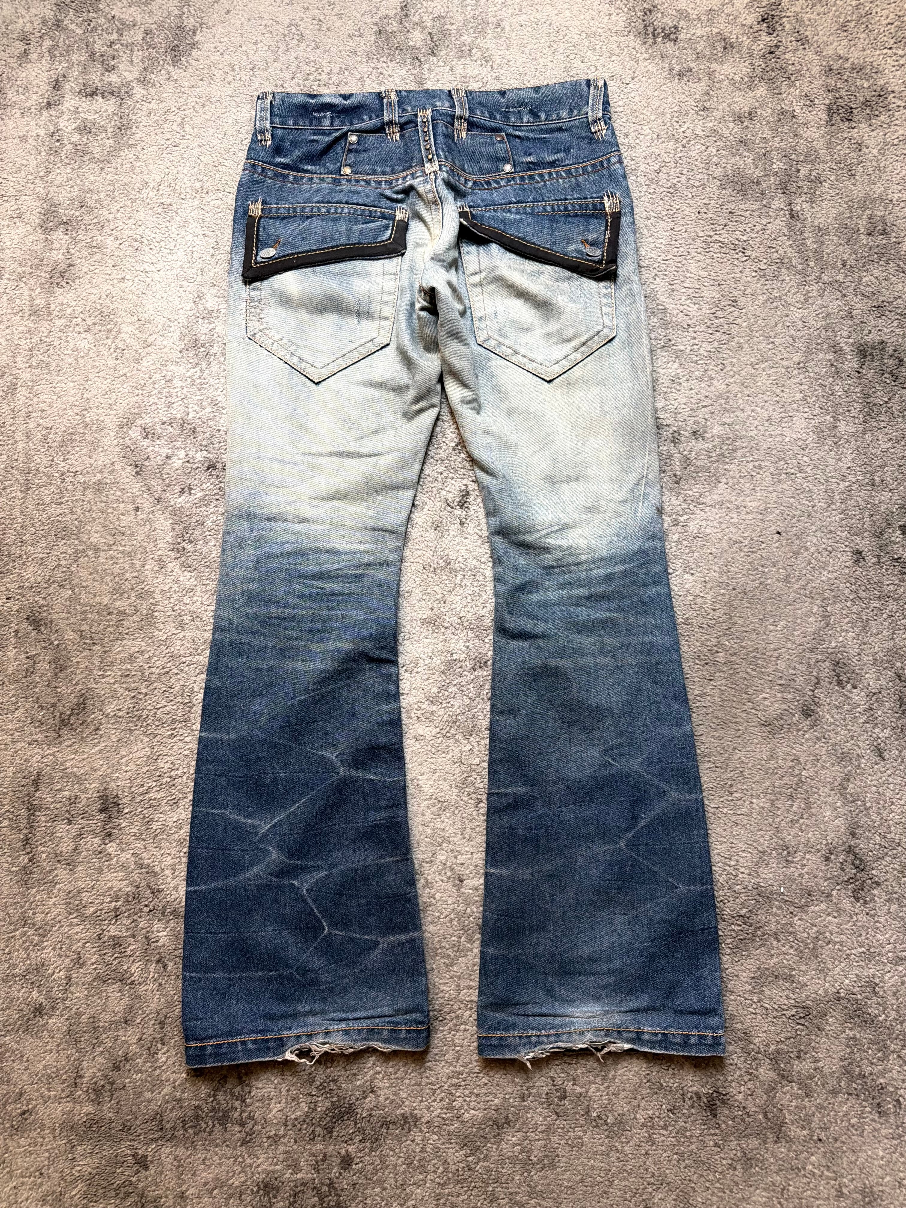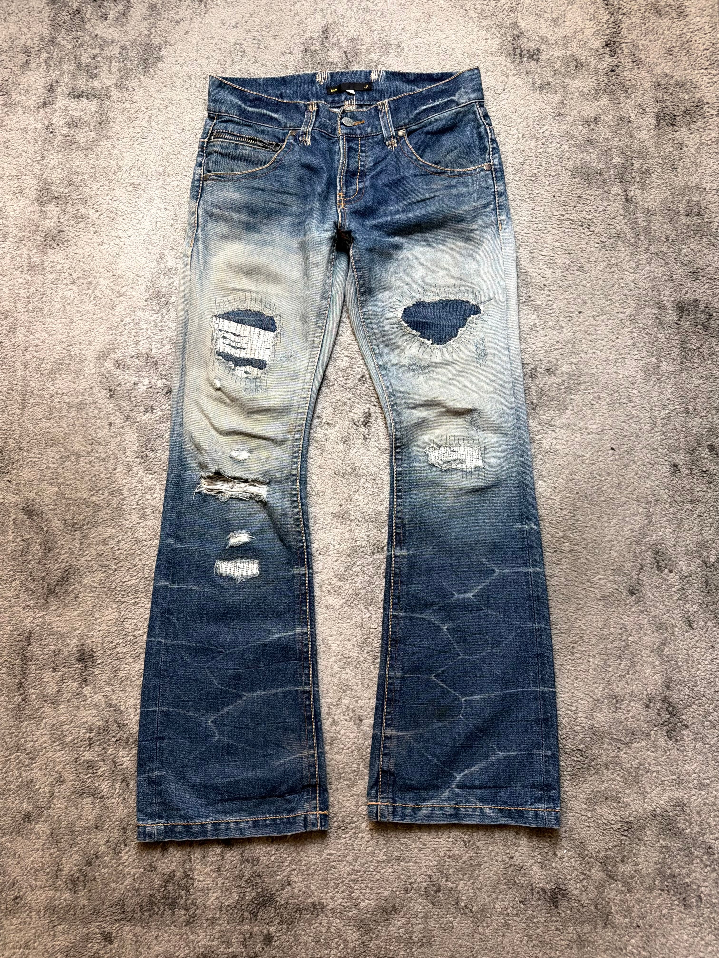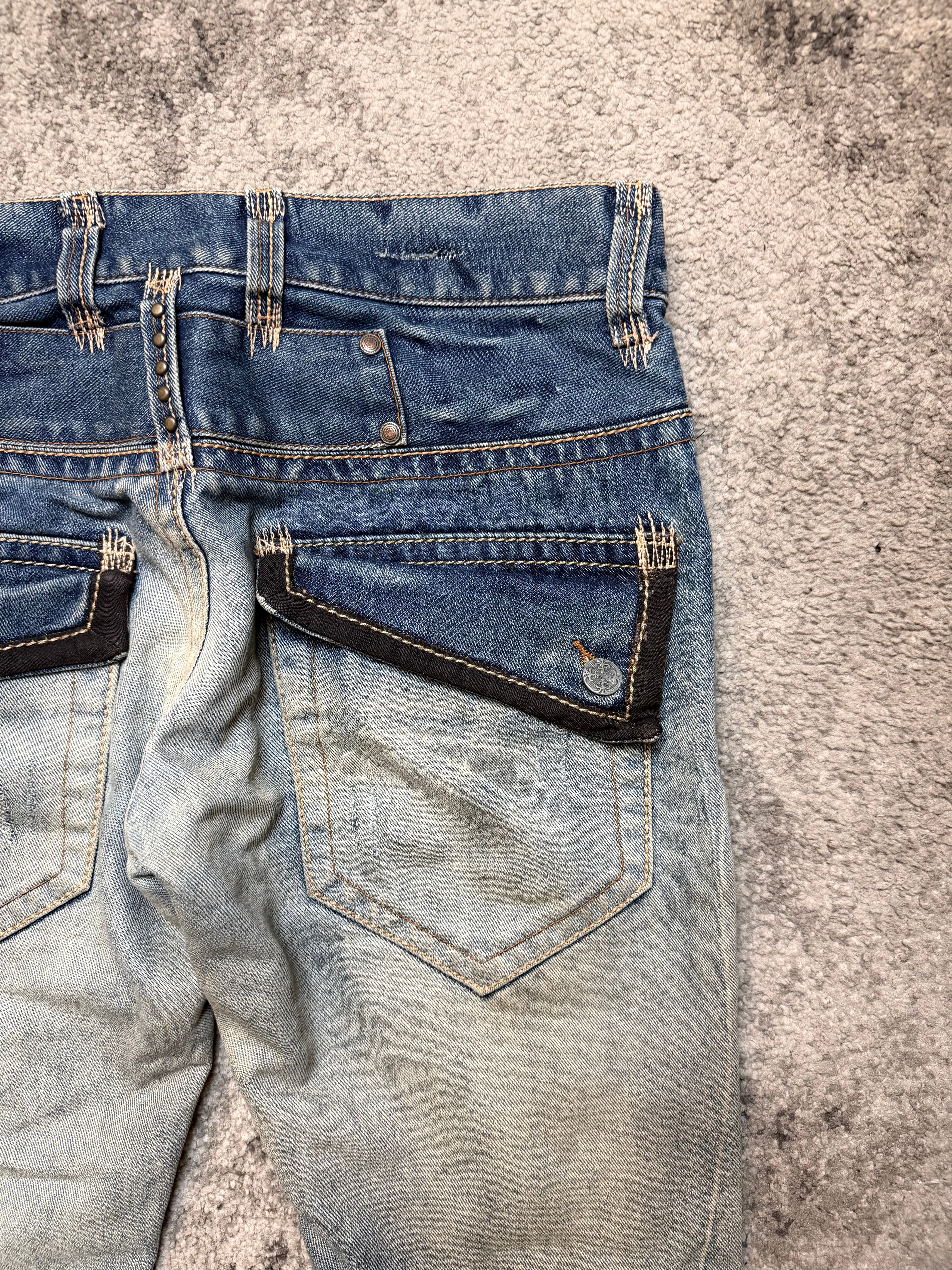 These aren’t just jeans – they’re a full-on archive fever dream, the kind of piece you’d expect to see backstage in early-2000s Tokyo rock clubs. Heavy distressing, sun-bleached knees, and that wild cracked fading at the legs… pure Number (N)ine energy with a touch of ifsixwasnine chaos.
