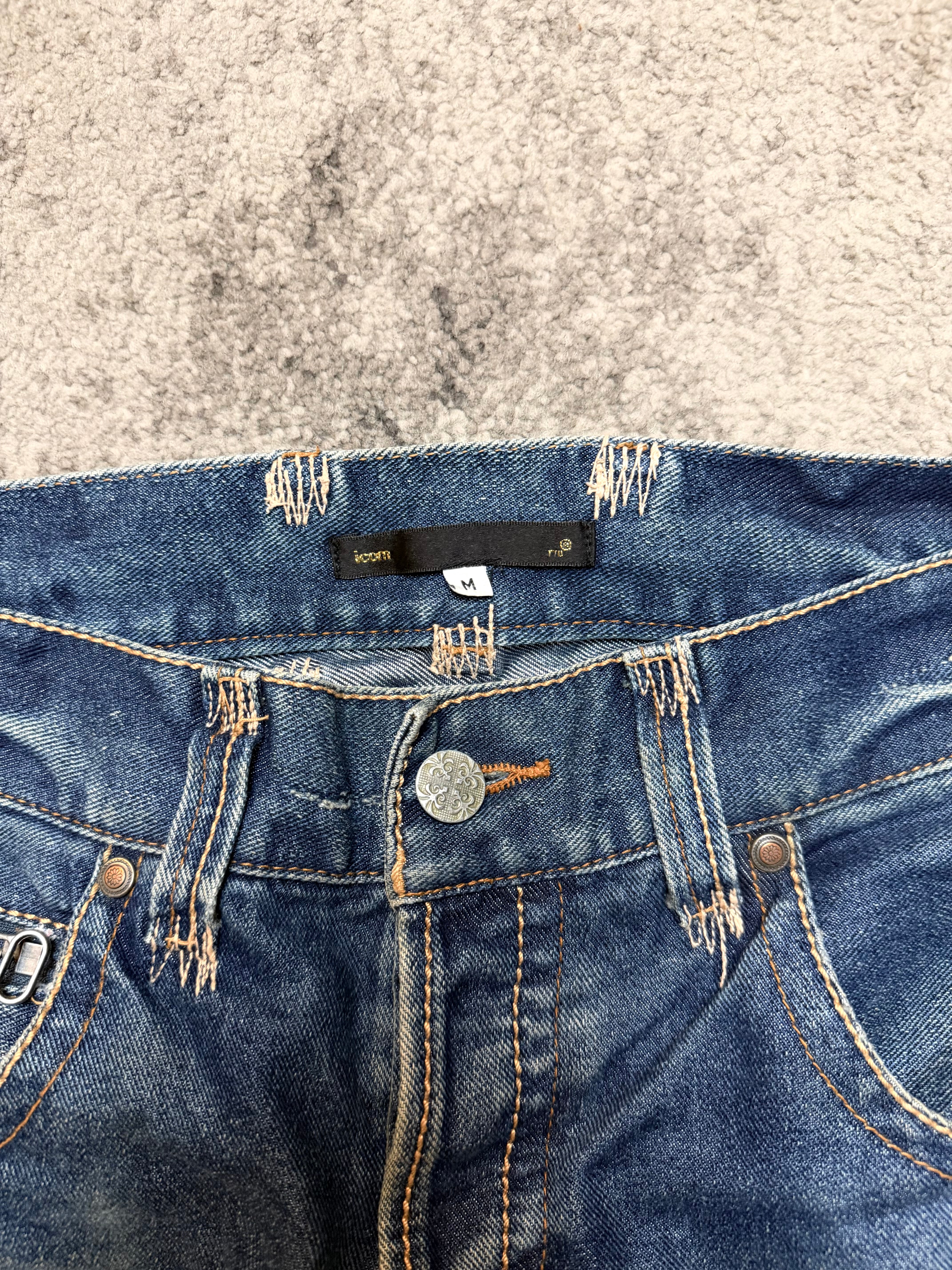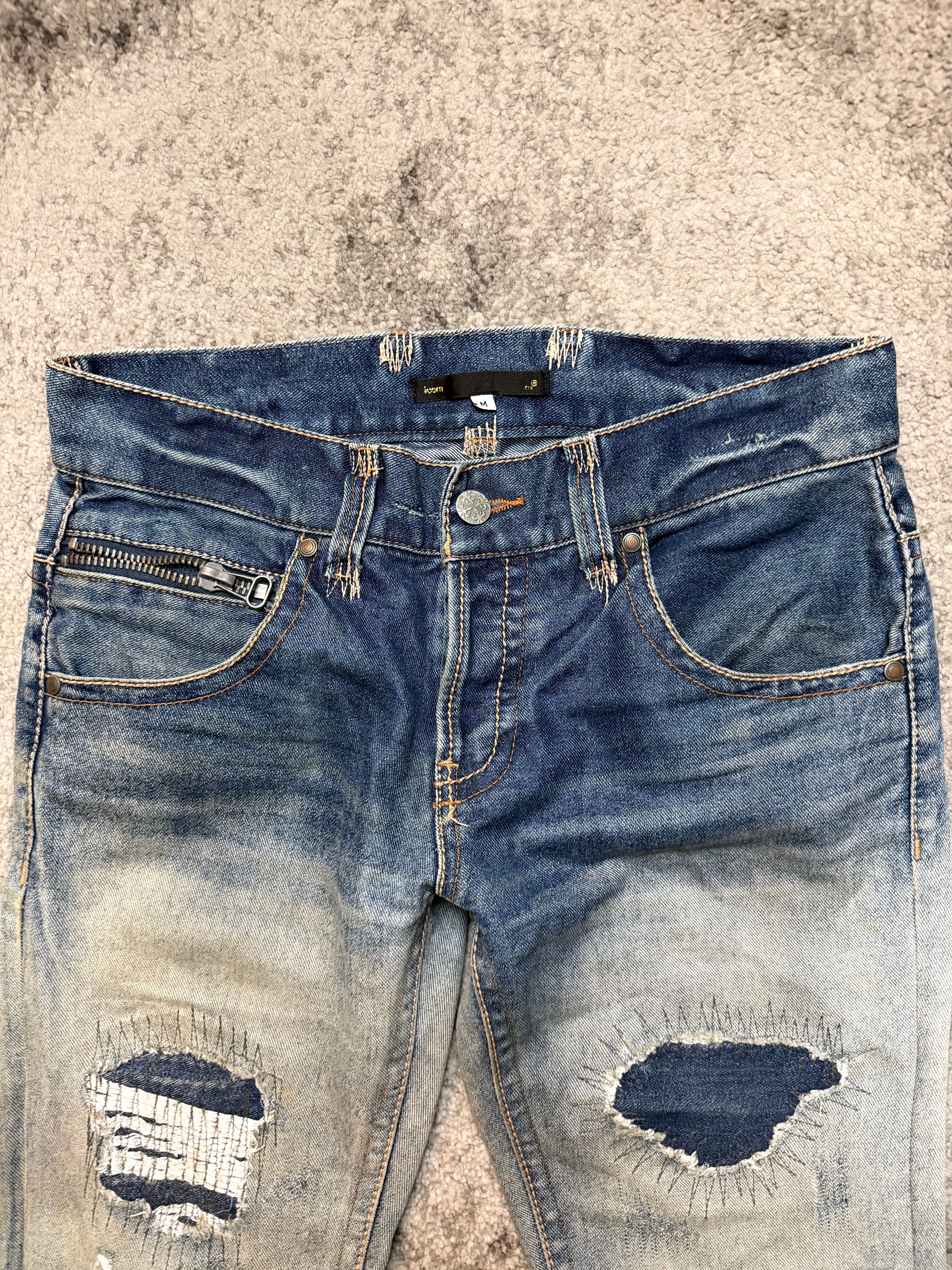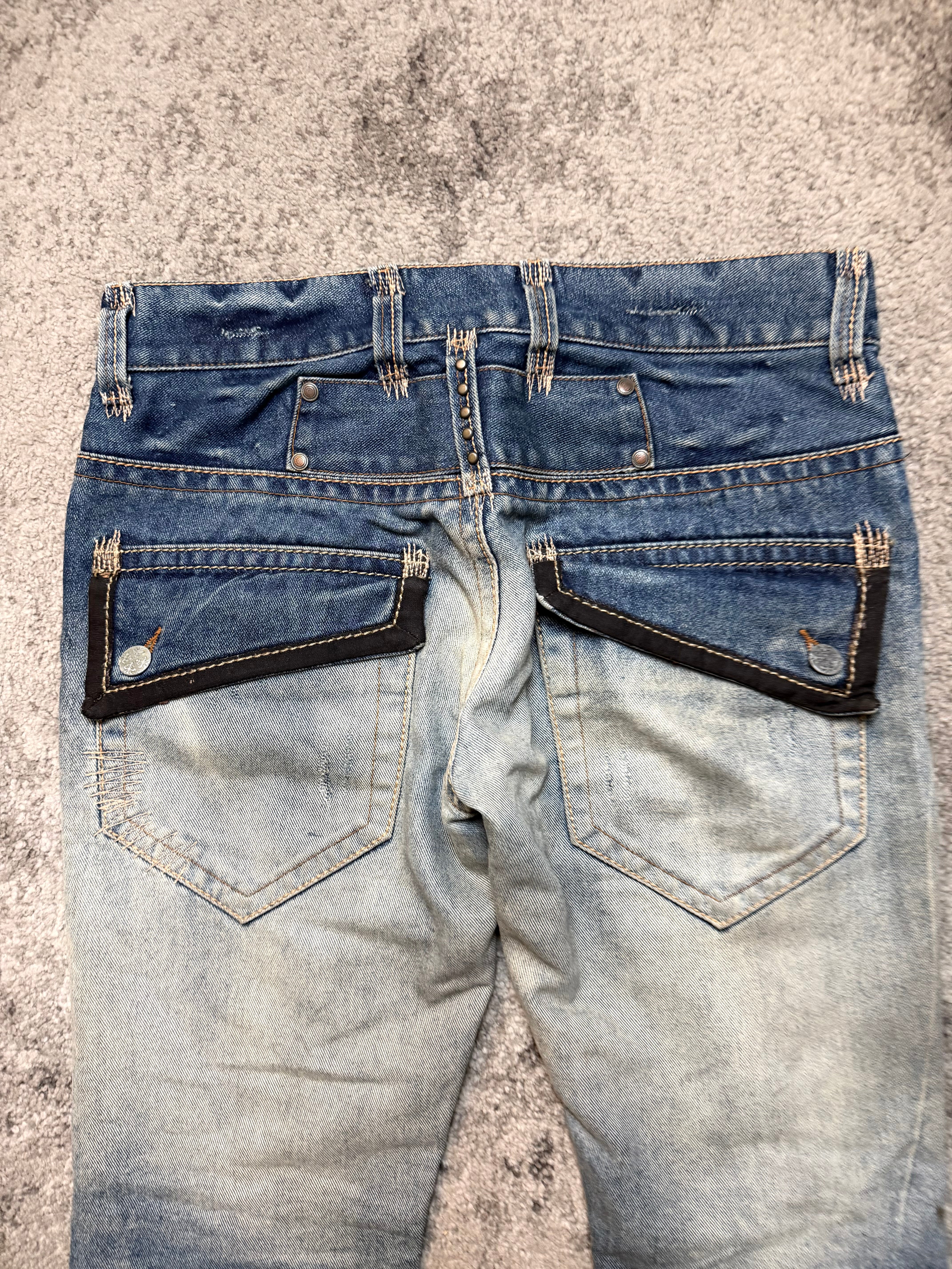 These aren’t just jeans – they’re a full-on archive fever dream, the kind of piece you’d expect to see backstage in early-2000s Tokyo rock clubs. Heavy distressing, sun-bleached knees, and that wild cracked fading at the legs… pure Number (N)ine energy with a touch of ifsixwasnine chaos.