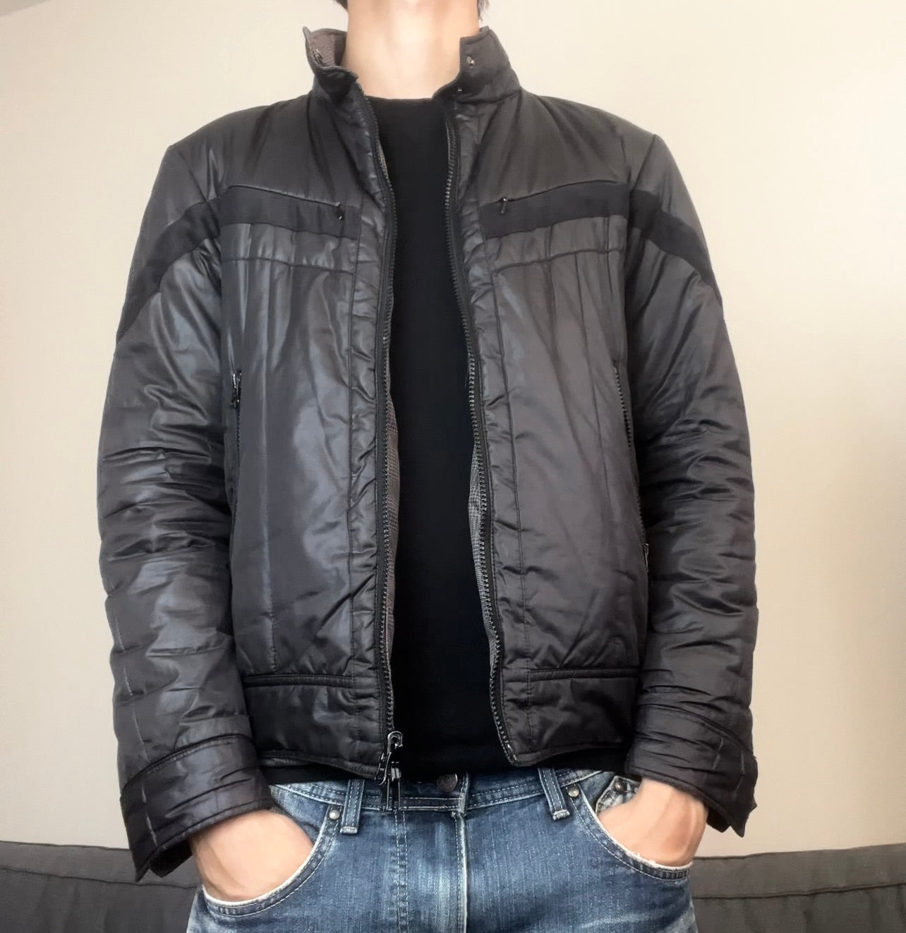 Constructed from a soft nylon shell with light insulation for warmth and movement. The two-way zipper, clean seamwork, and modernist lines evoke that quiet Tokyo noir energy — effortless, functional, and slightly mysterious.