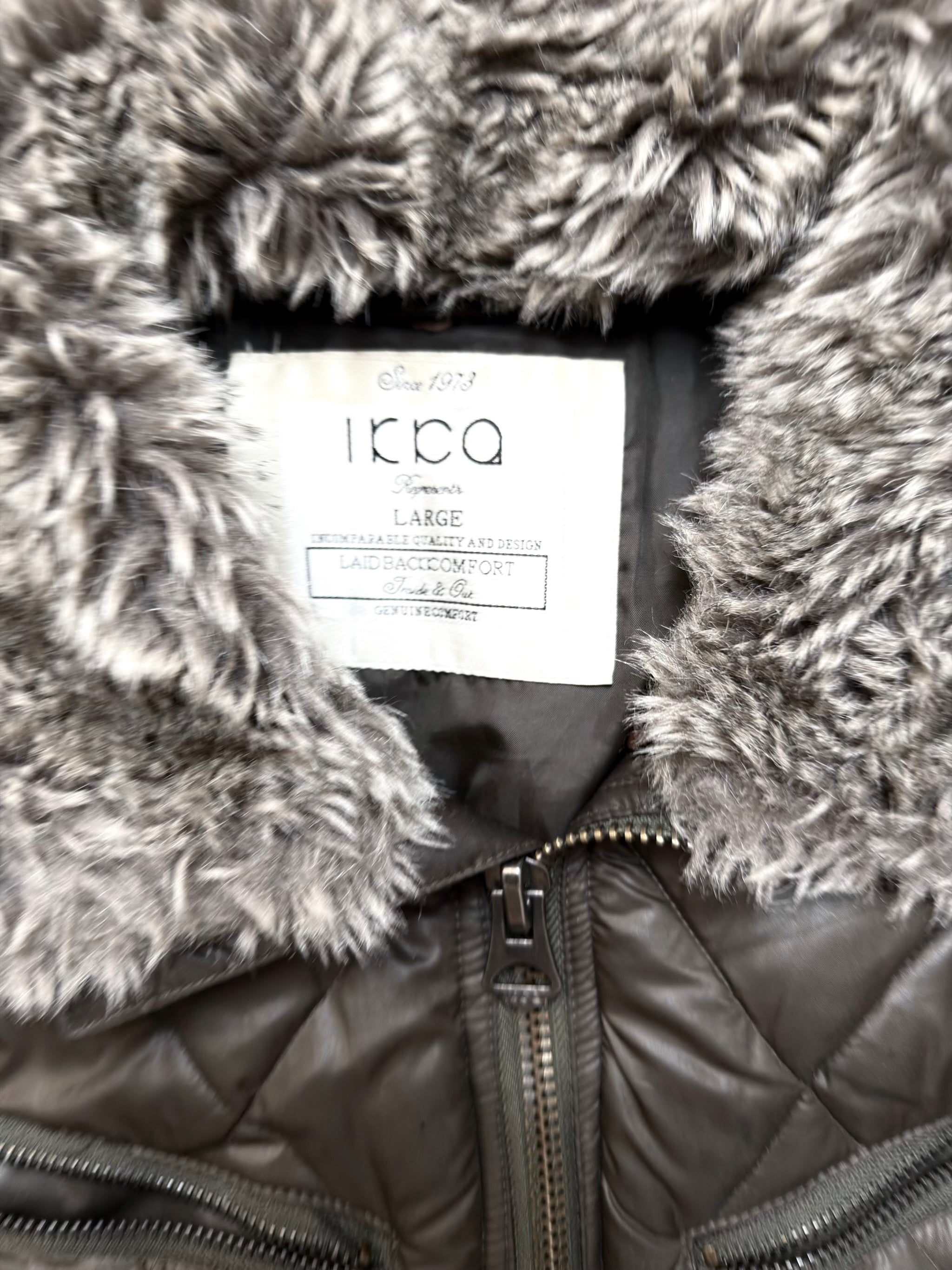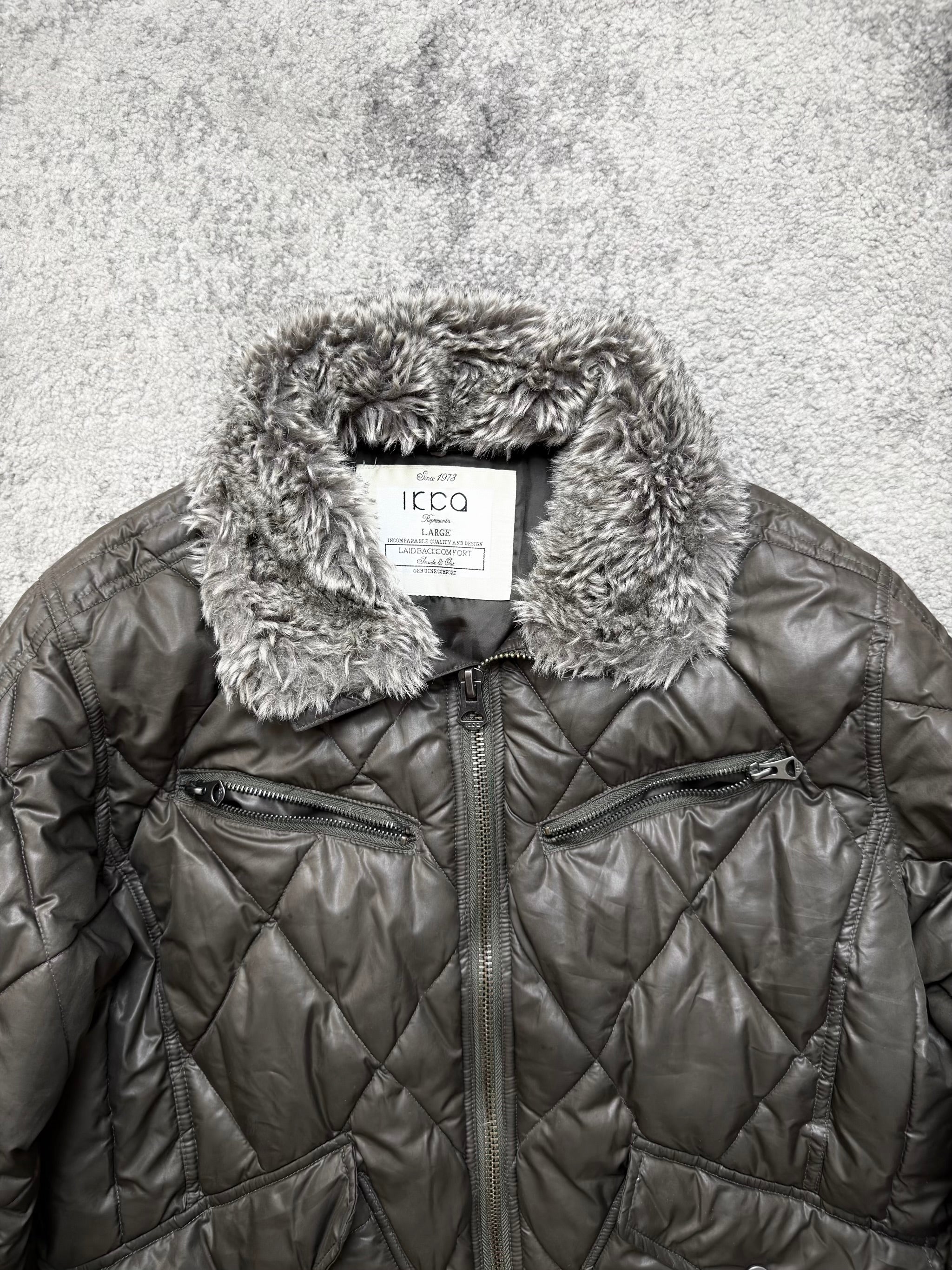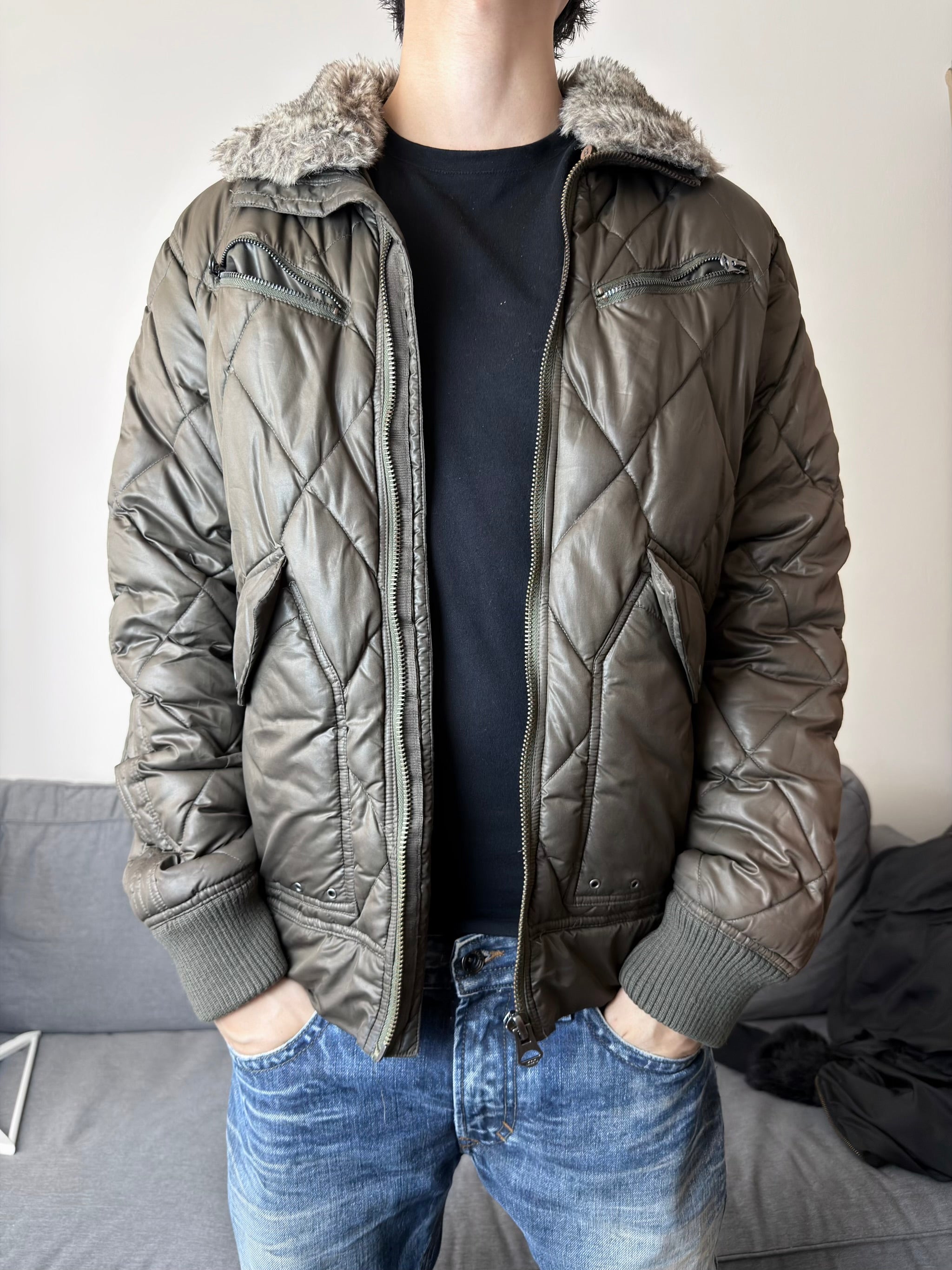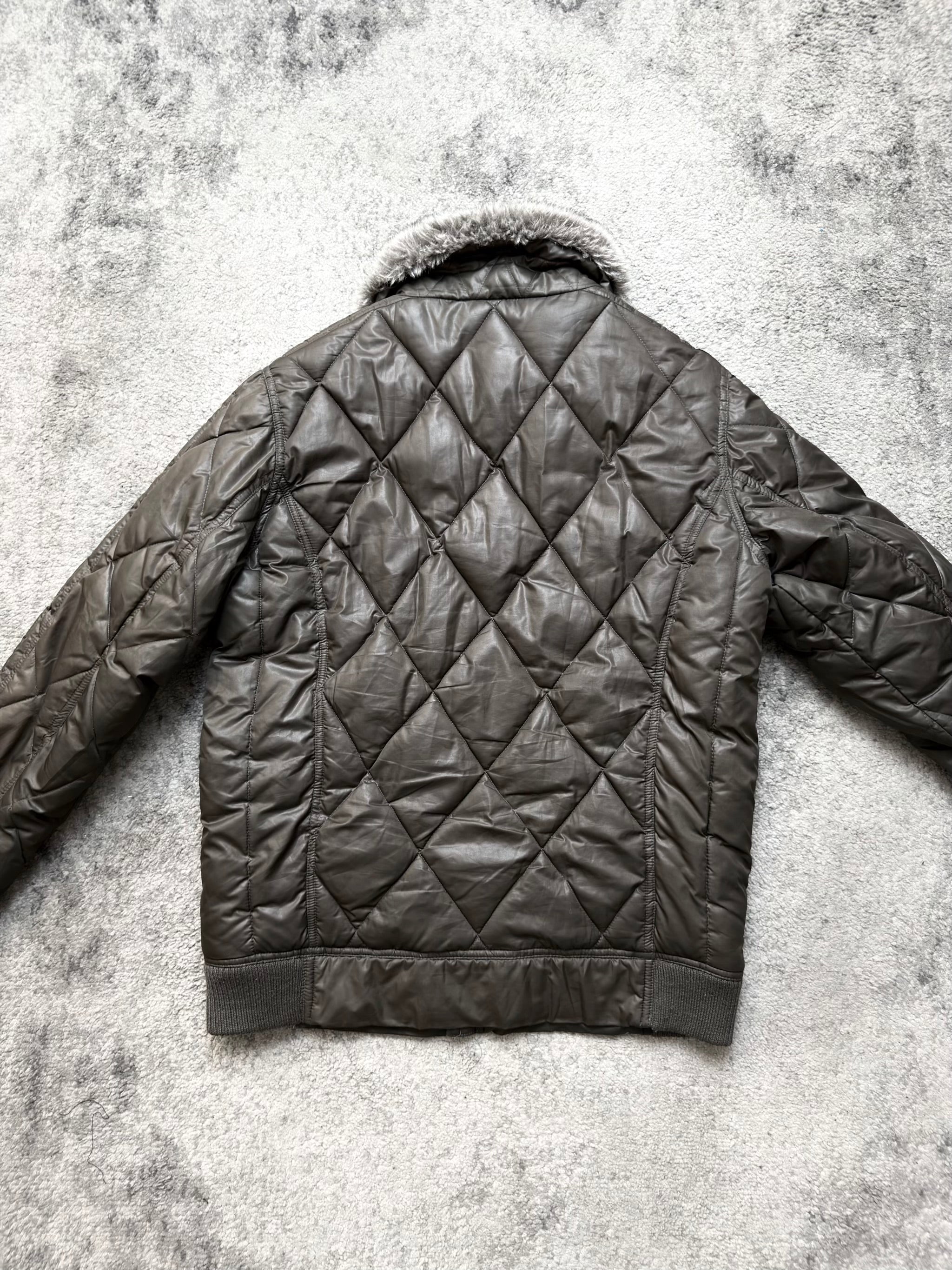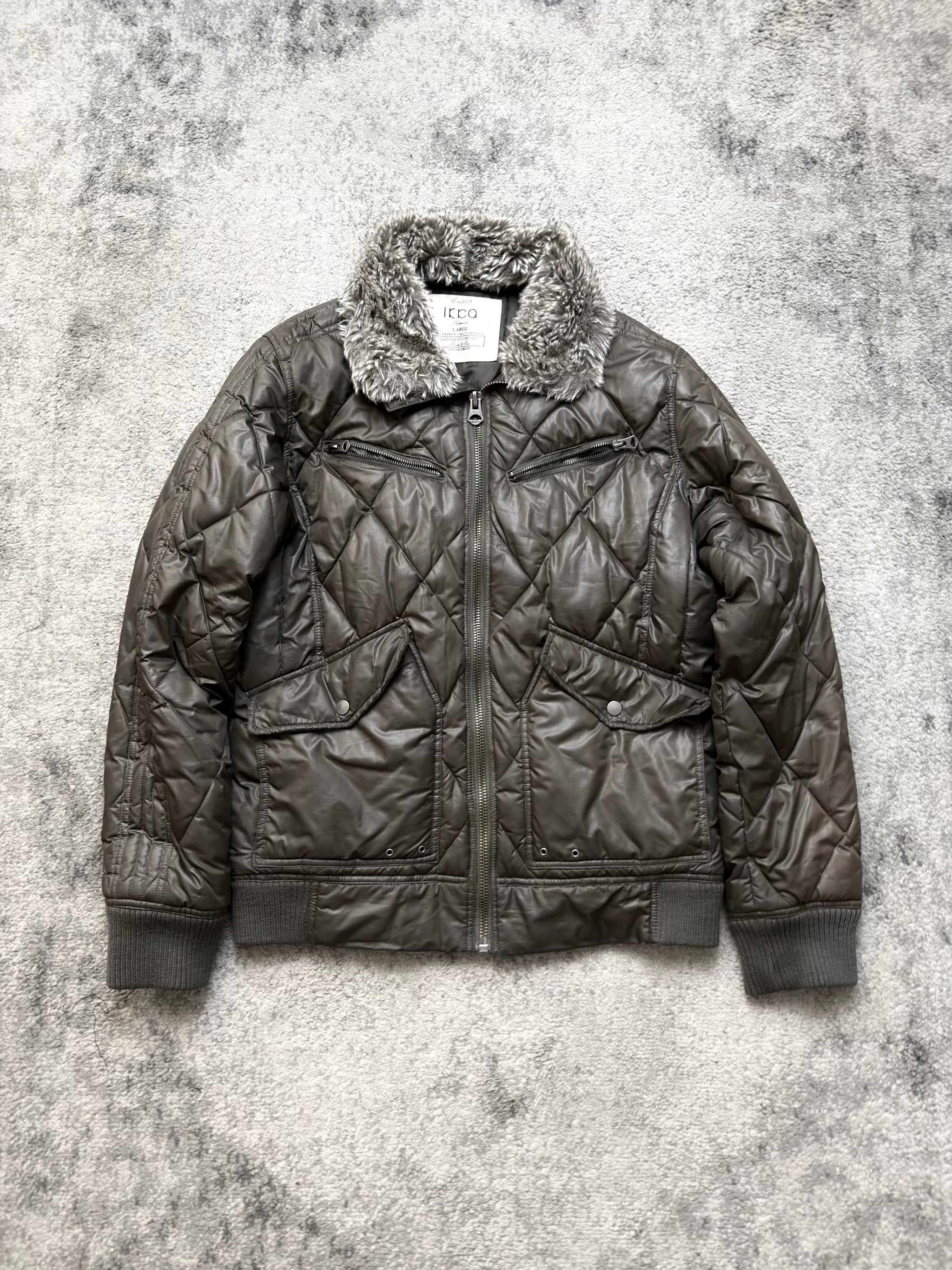 The faux fur collar adds warmth and texture, contrasting beautifully with the geometric diamond stitching. Ribbed cuffs and hem complete the structured silhouette, while multiple front and chest pockets give it that utilitarian edge seen in early 2000s Japanese archive outerwear.