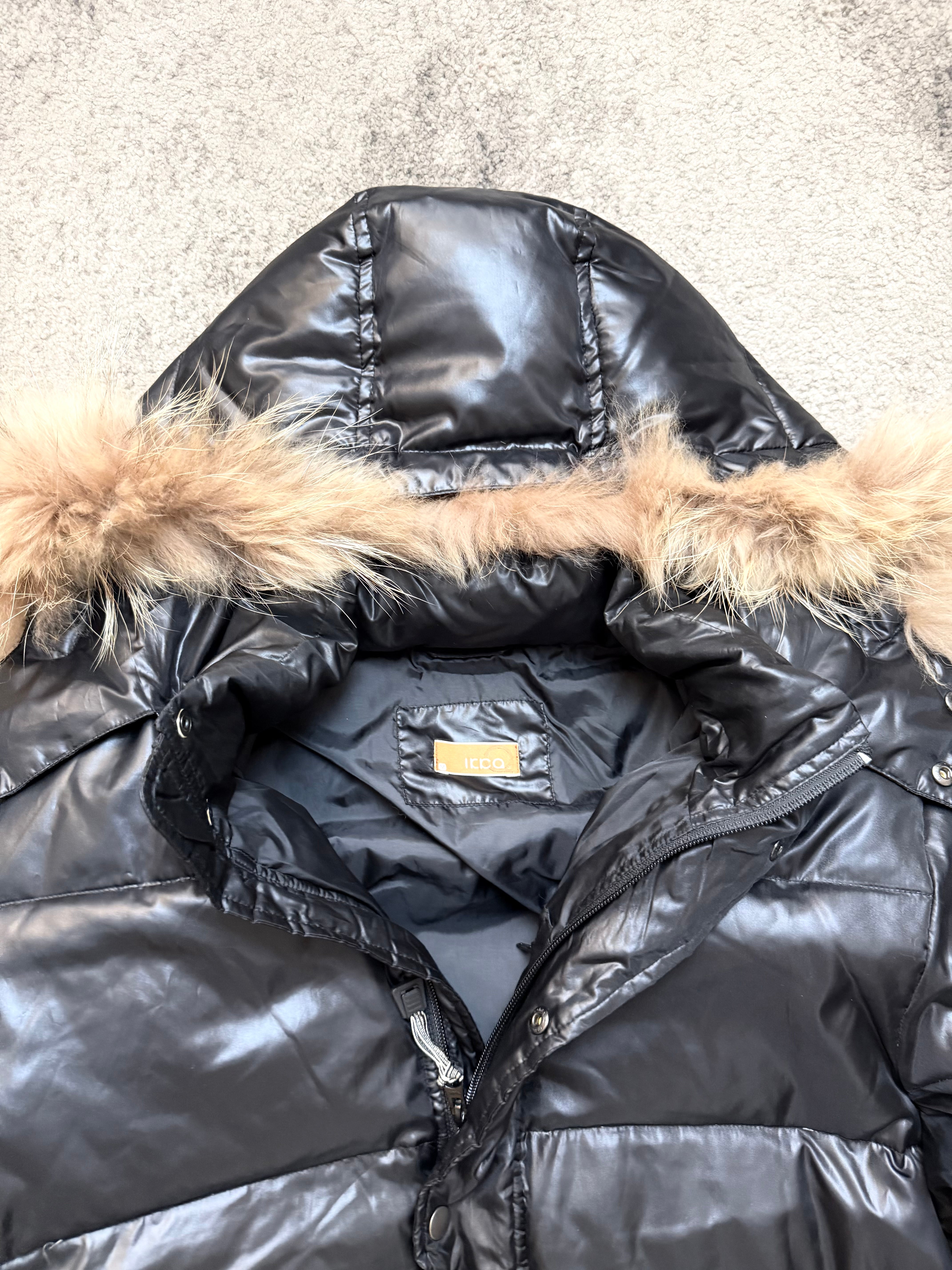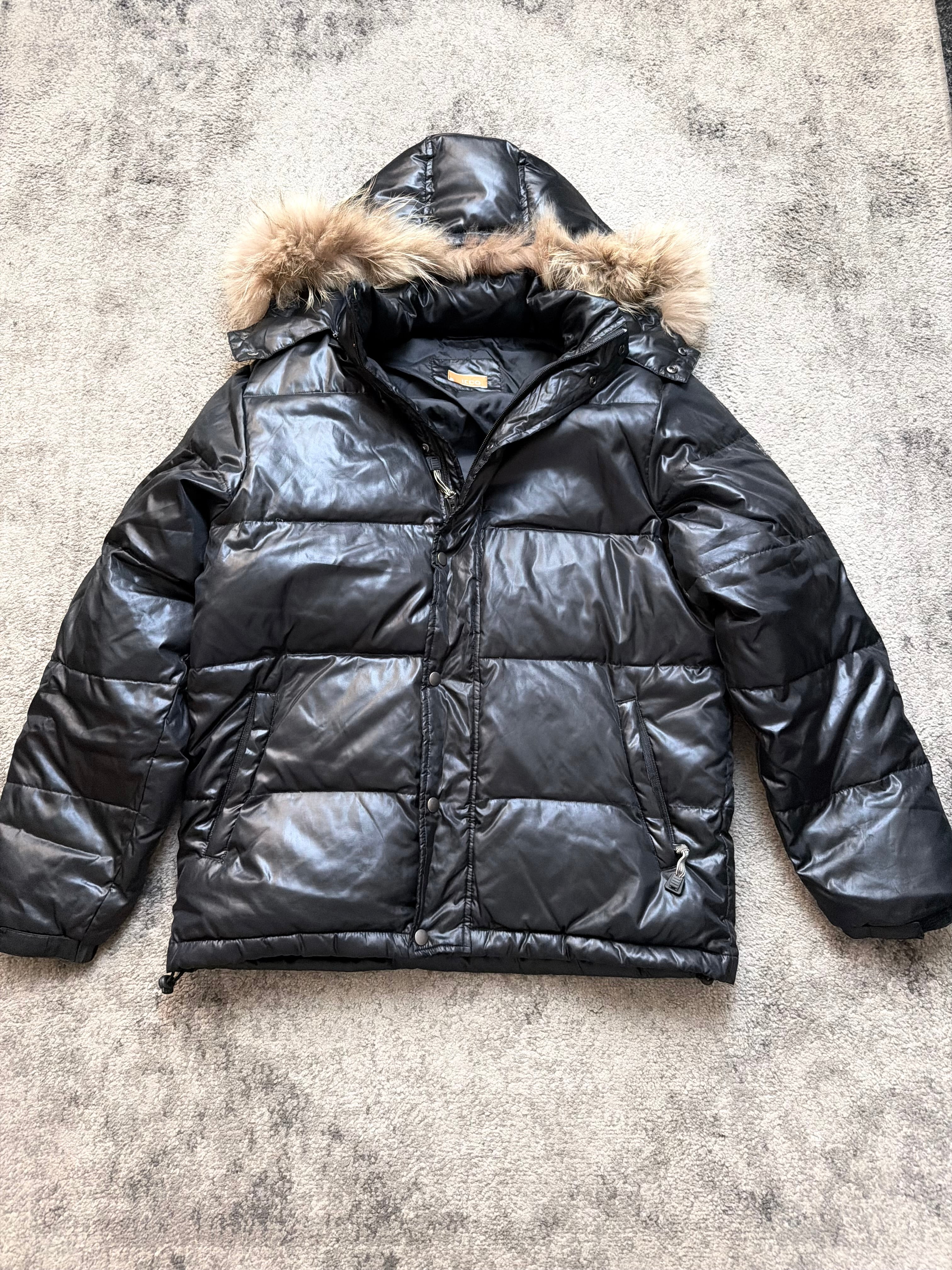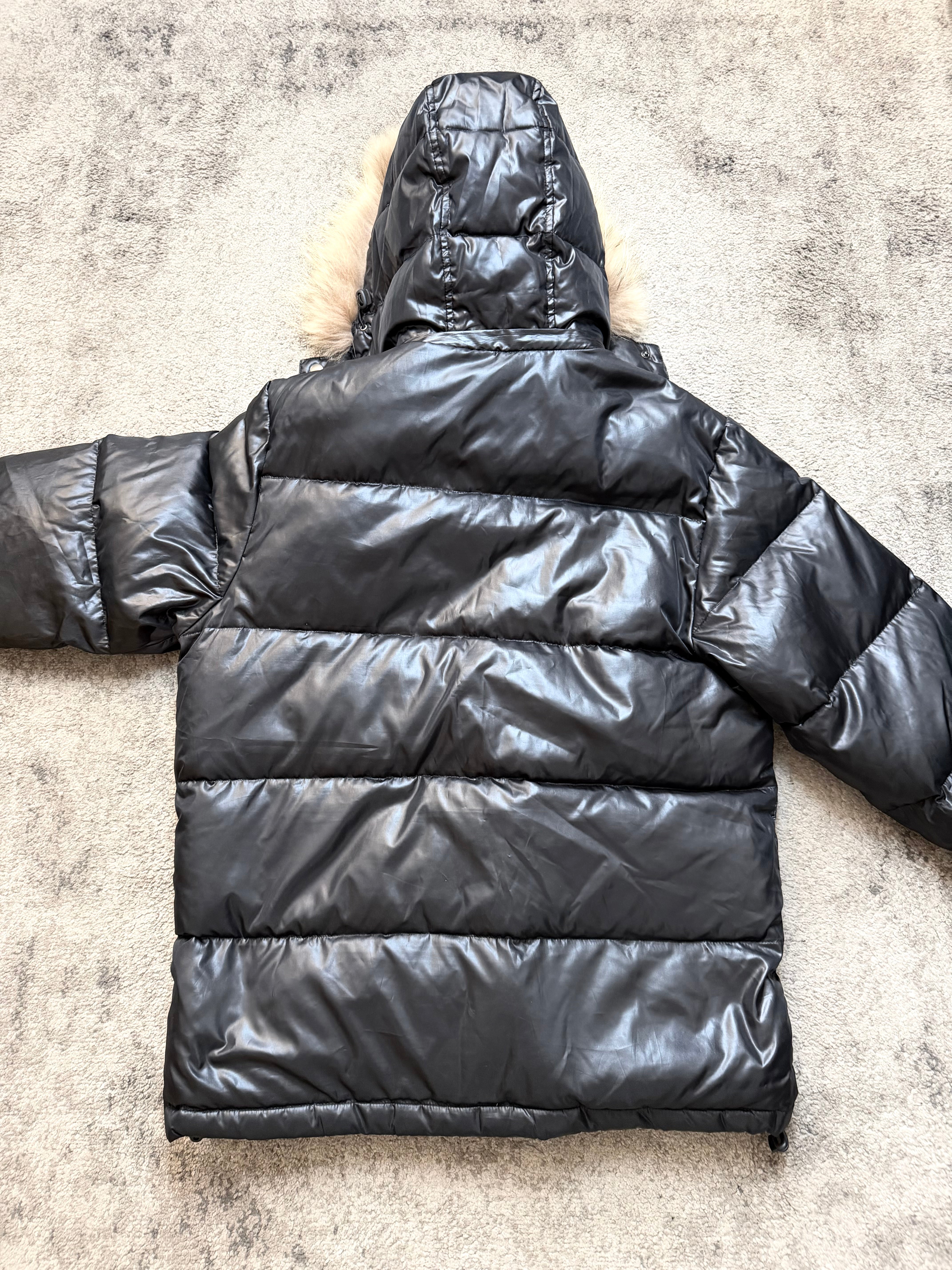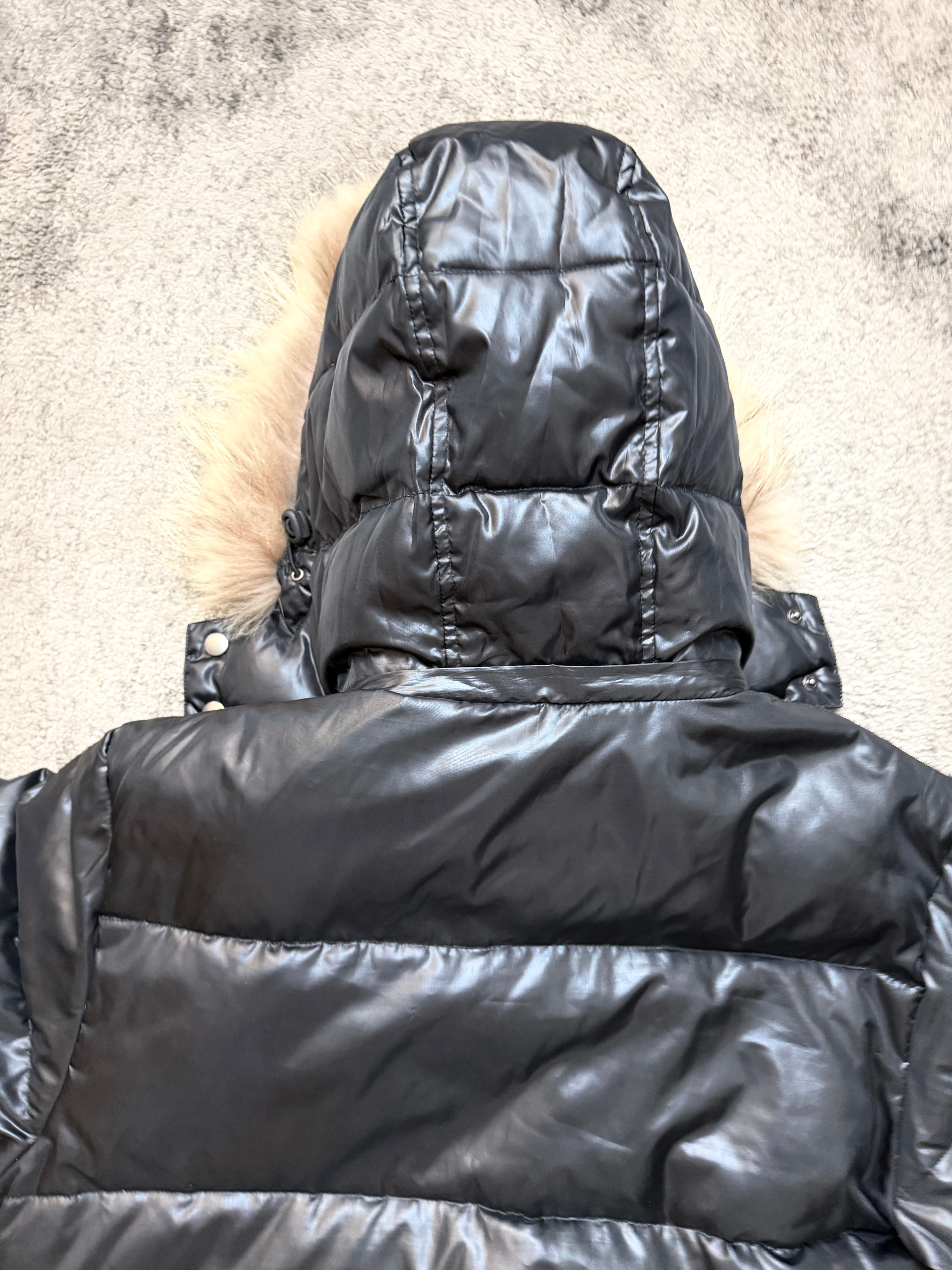 True winter attitude from the Japanese street archives. A glossy black padded down jacket with detachable fur-trimmed hood — built to punch through cold city mornings and late-night missions. That signature Japanese synthetic gloss finish gives it a sleek, almost leather-like presence. Quiet flex… but loud if you know.