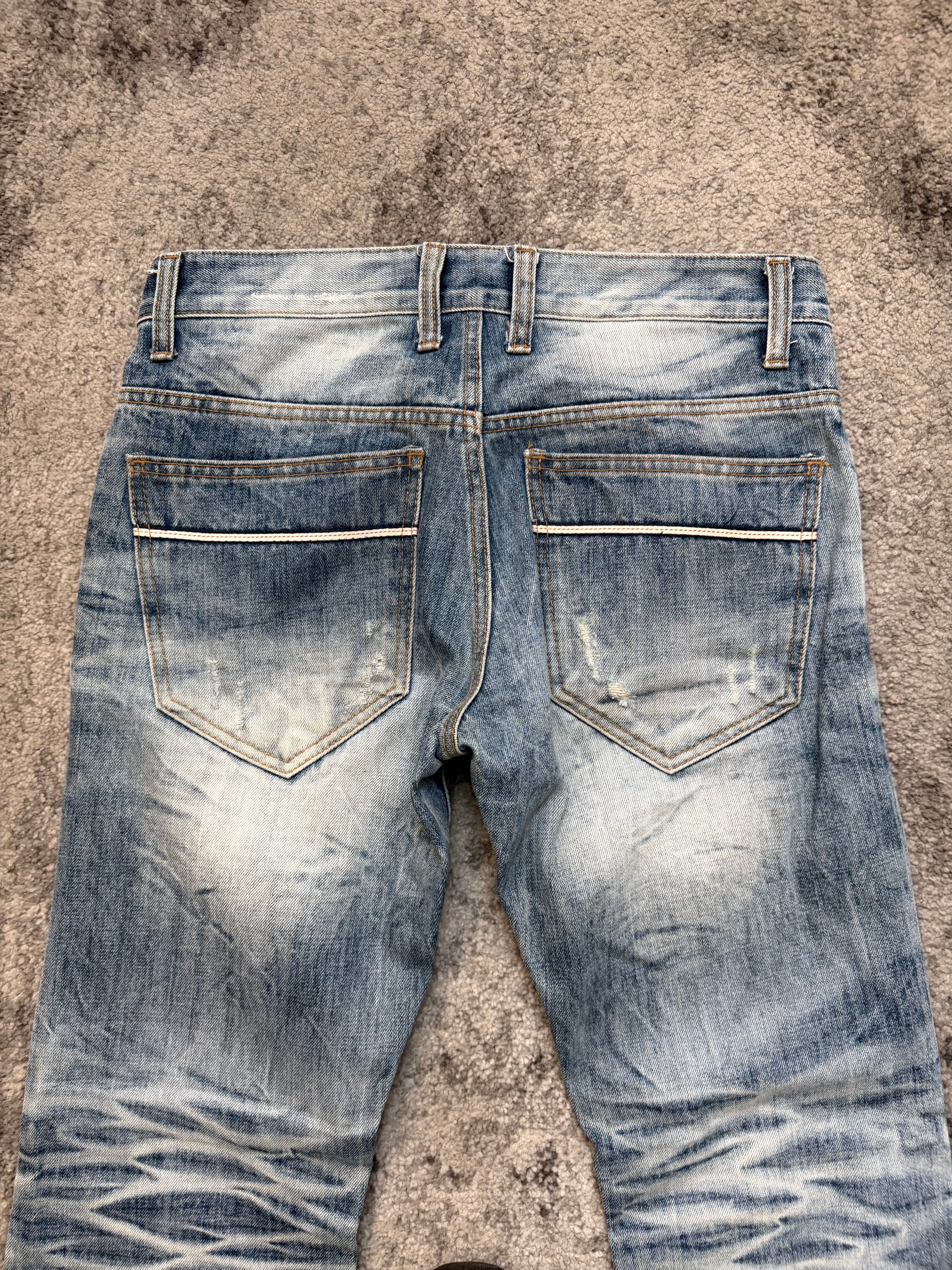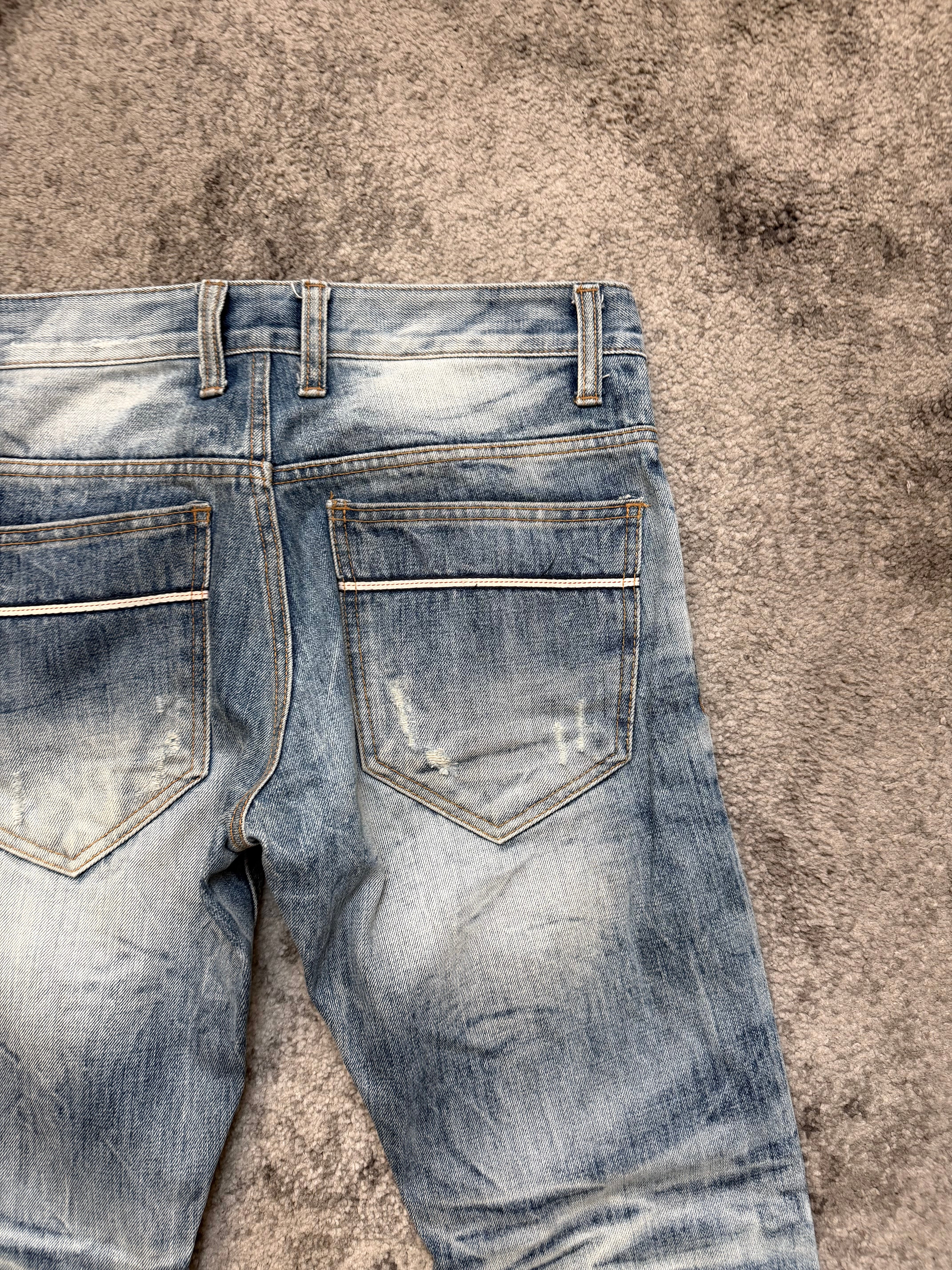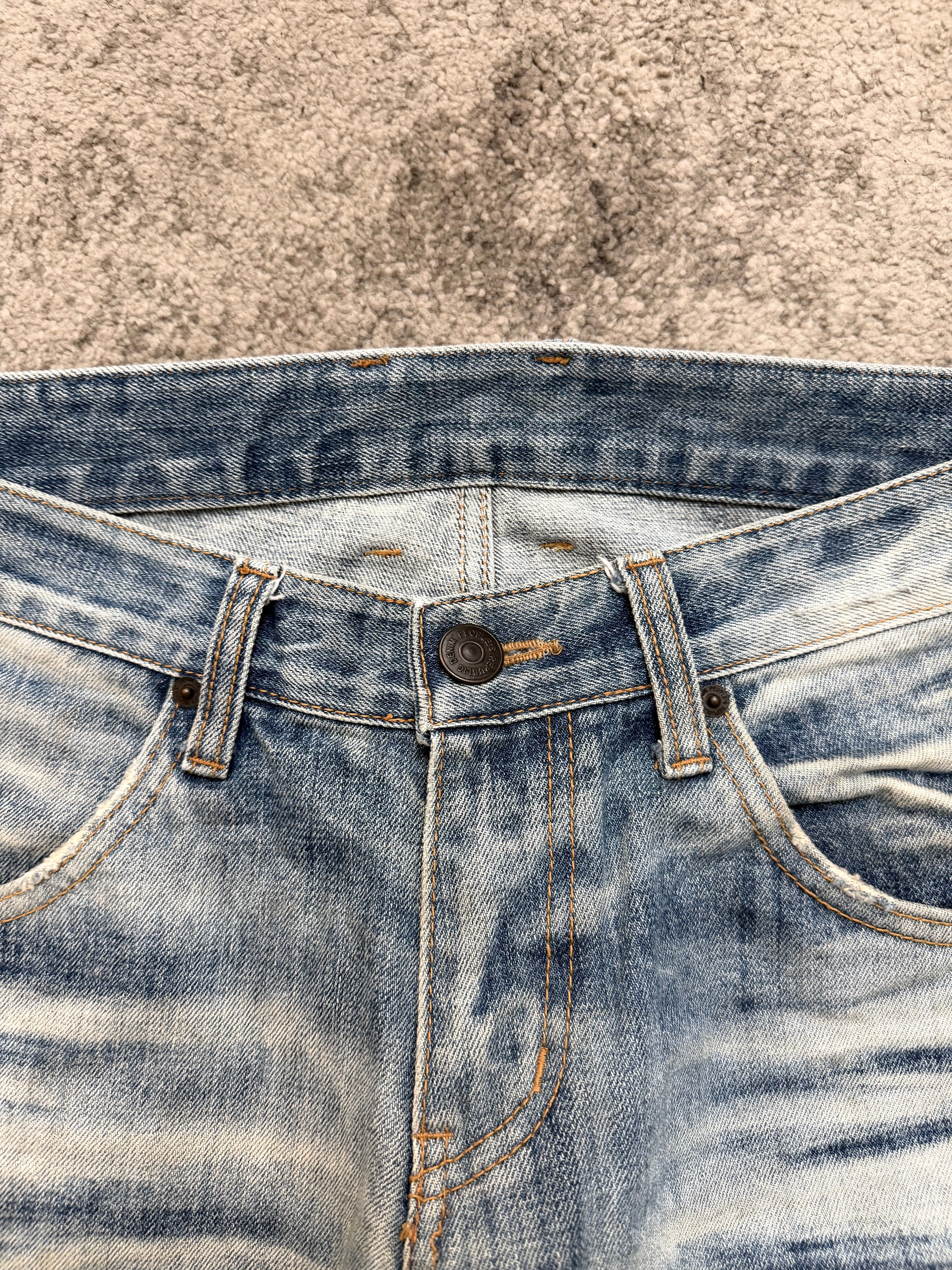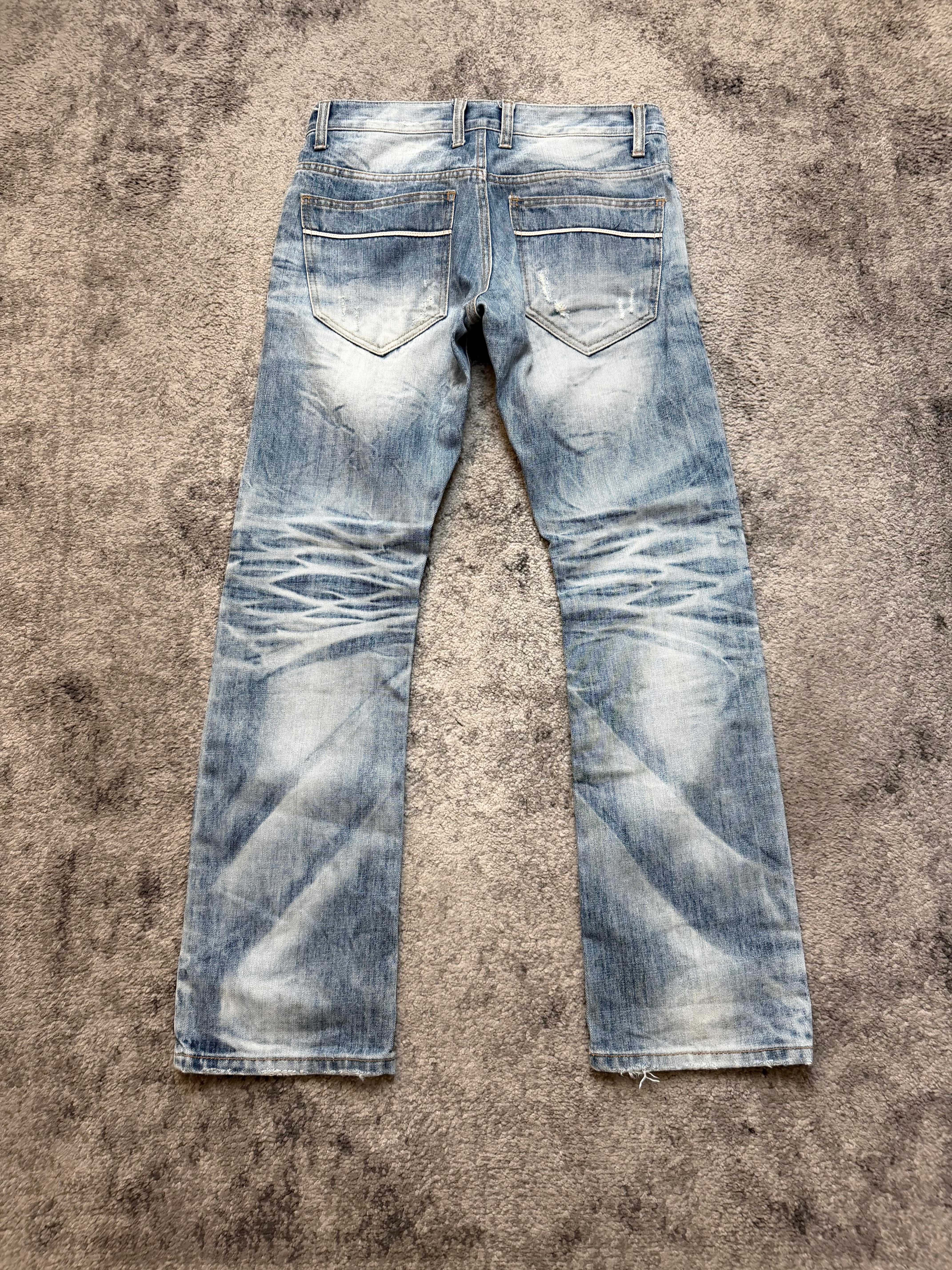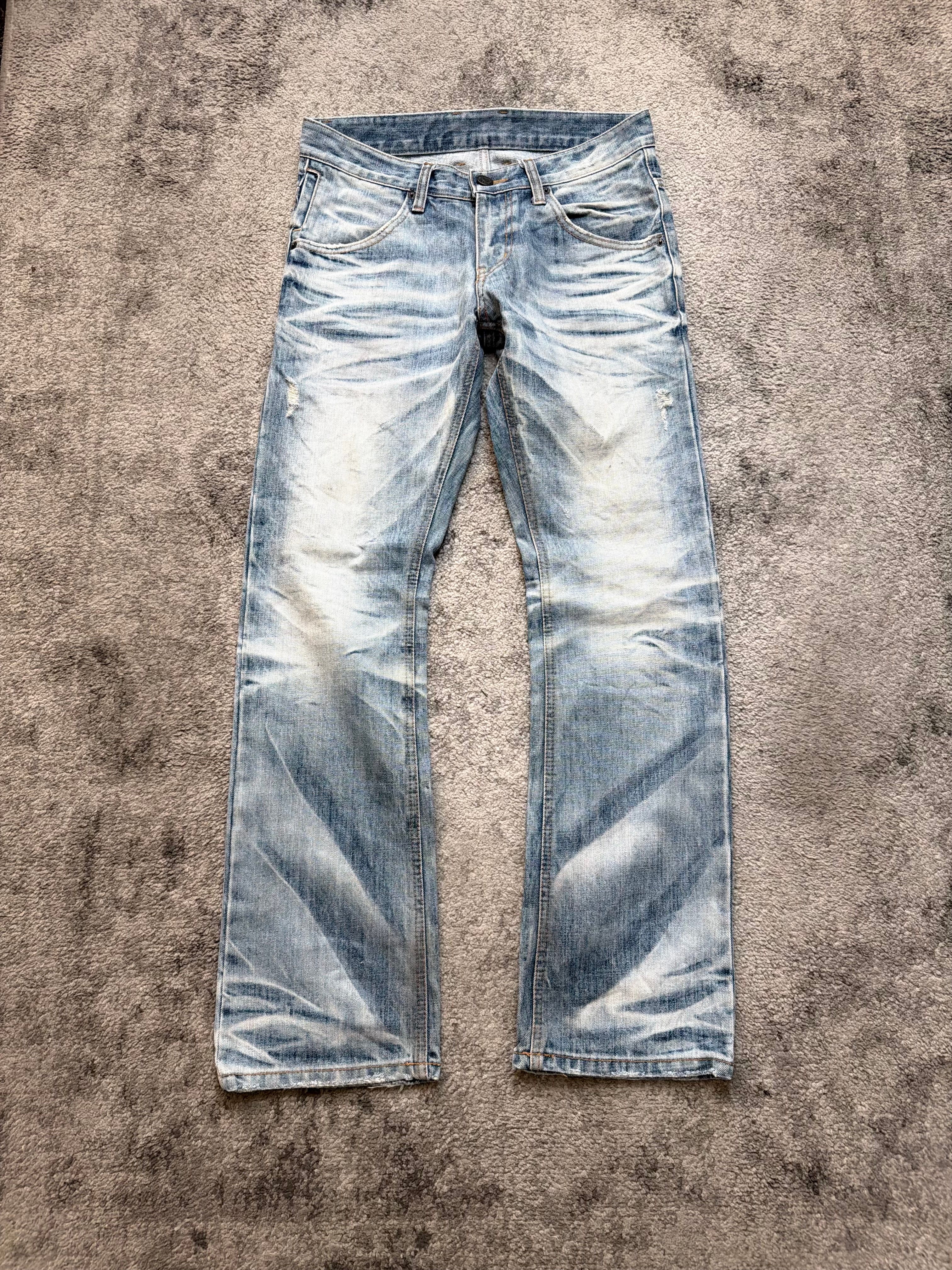 A pair that feels straight out of a late-2000s Harajuku night — the kind of washed-to-perfection denim you’d see in backstage photos of Number (N)ine kids, raw boots, and cigarette haze. Ultra-expressive whiskers, deep knee stacks, and a bleached sky-blue tone give these jeans a ghostly dream-punk aura. Worn, lived, and beautifully aged — true archive soul.