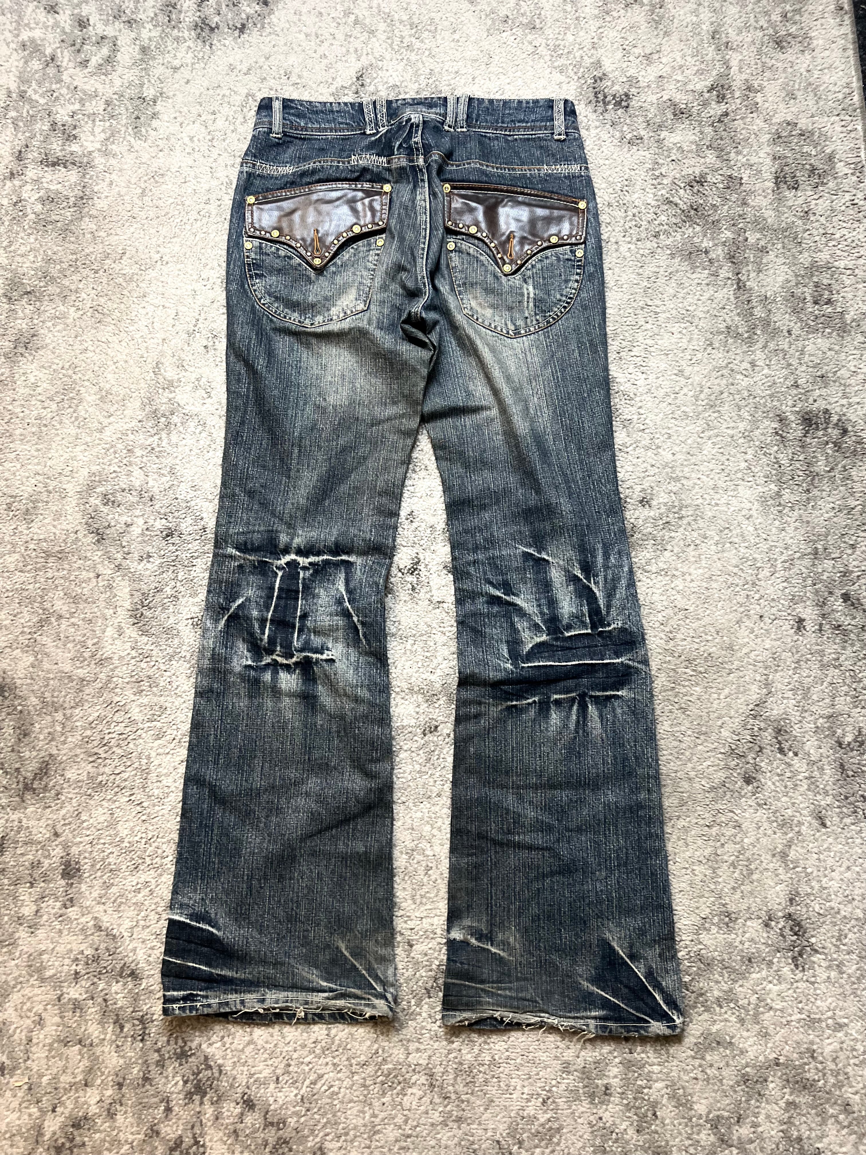 Made from premium Japanese cotton denim with leather-trimmed back pockets and metal rivet detailing. The flared silhouette and structured leg line echo early 2000s archive streetwear, balancing rebellion with precision tailoring.