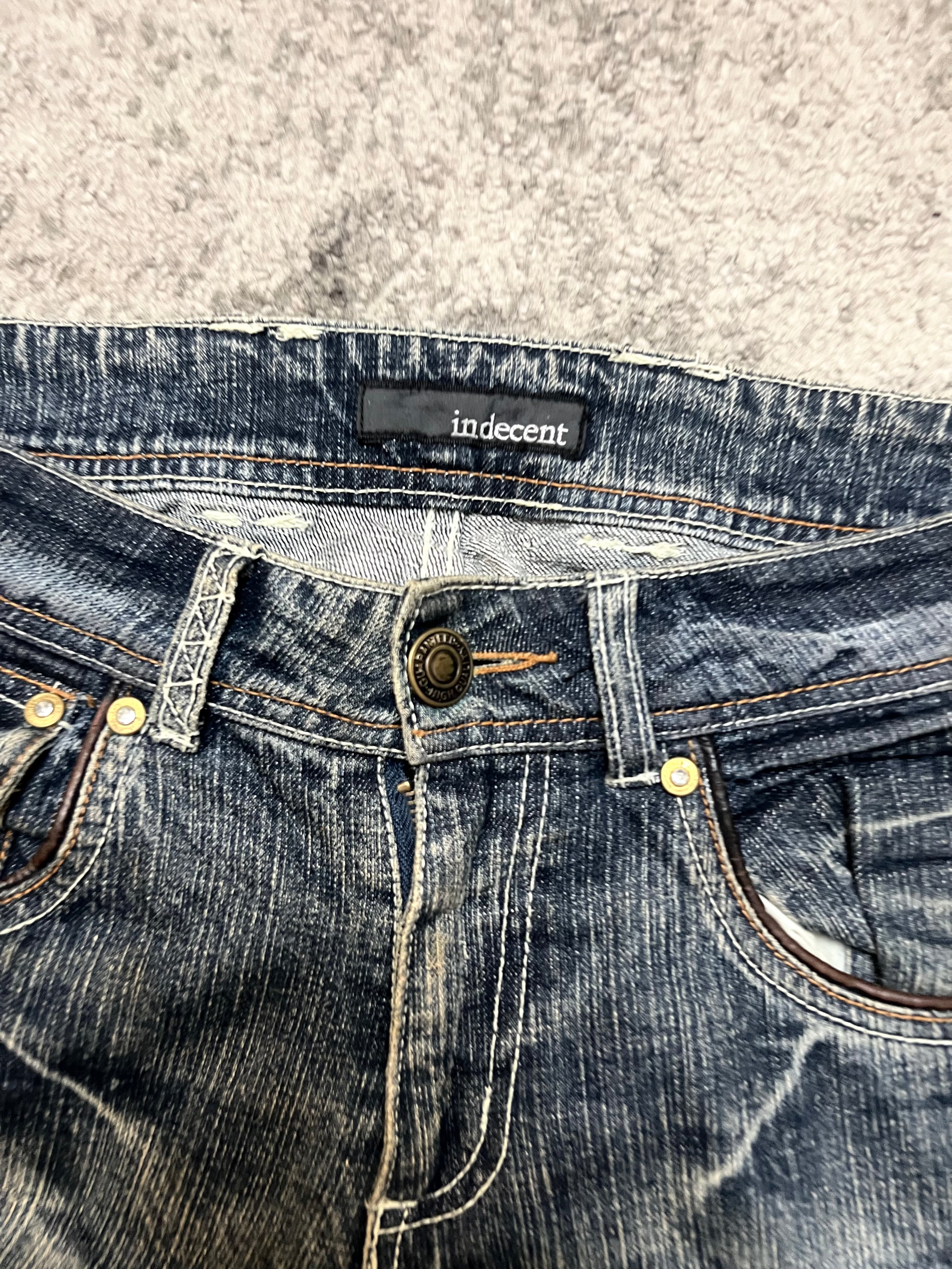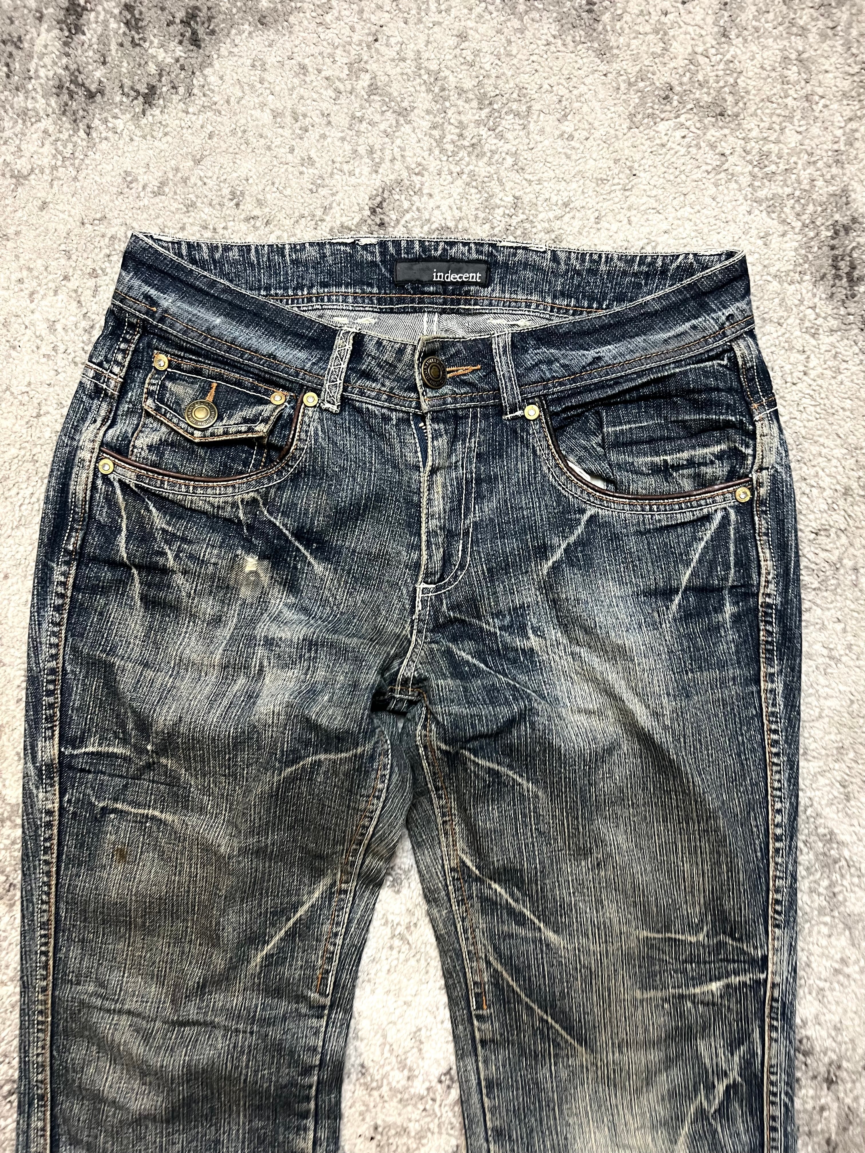An underground classic from INDECENT, blending raw Japanese denim craftsmanship with rock-inspired detailing. The heavy fading, whiskering, and distressed texture give this pair an unmistakable lived-in edge — the kind of wear that can’t be faked.