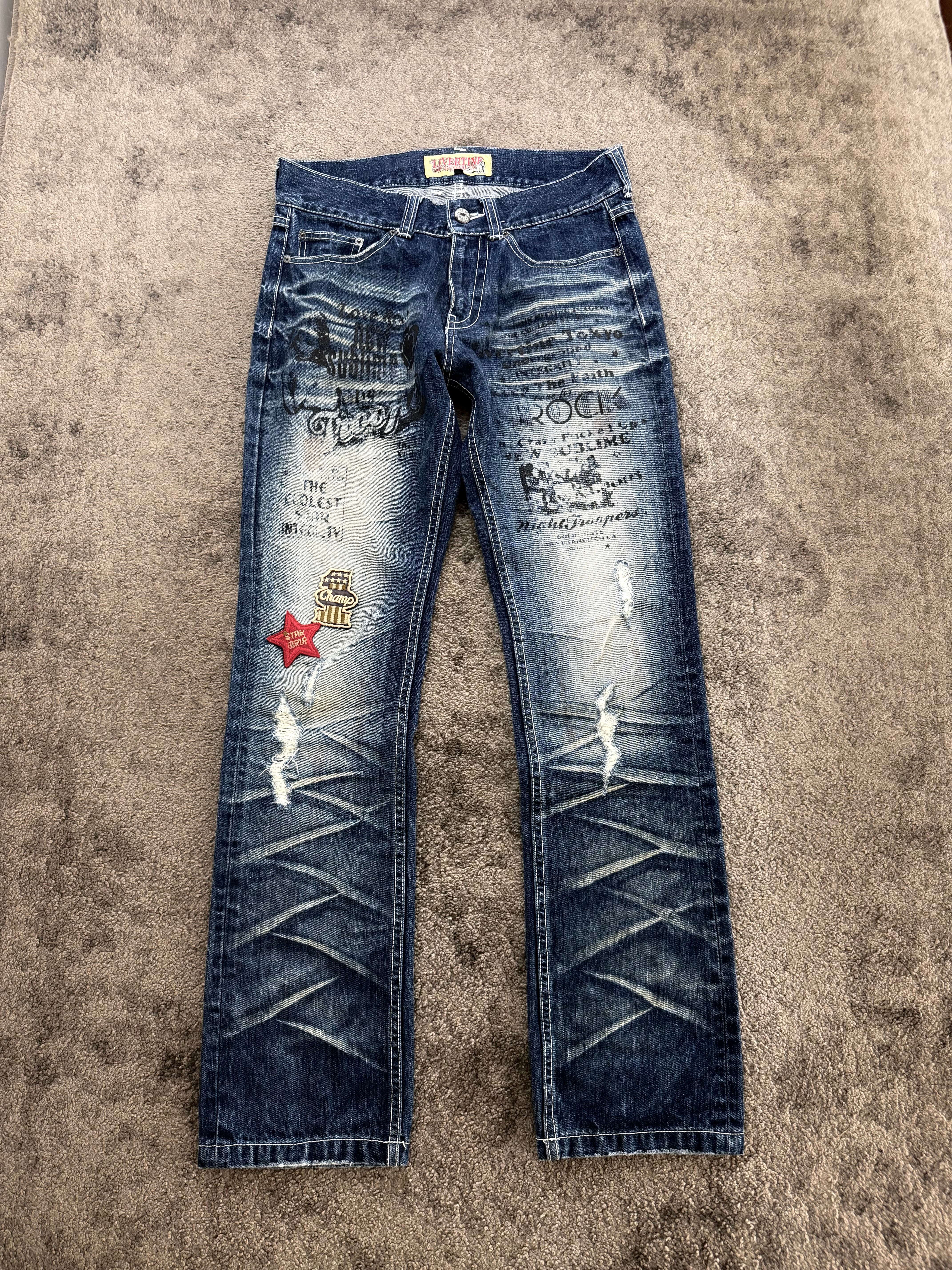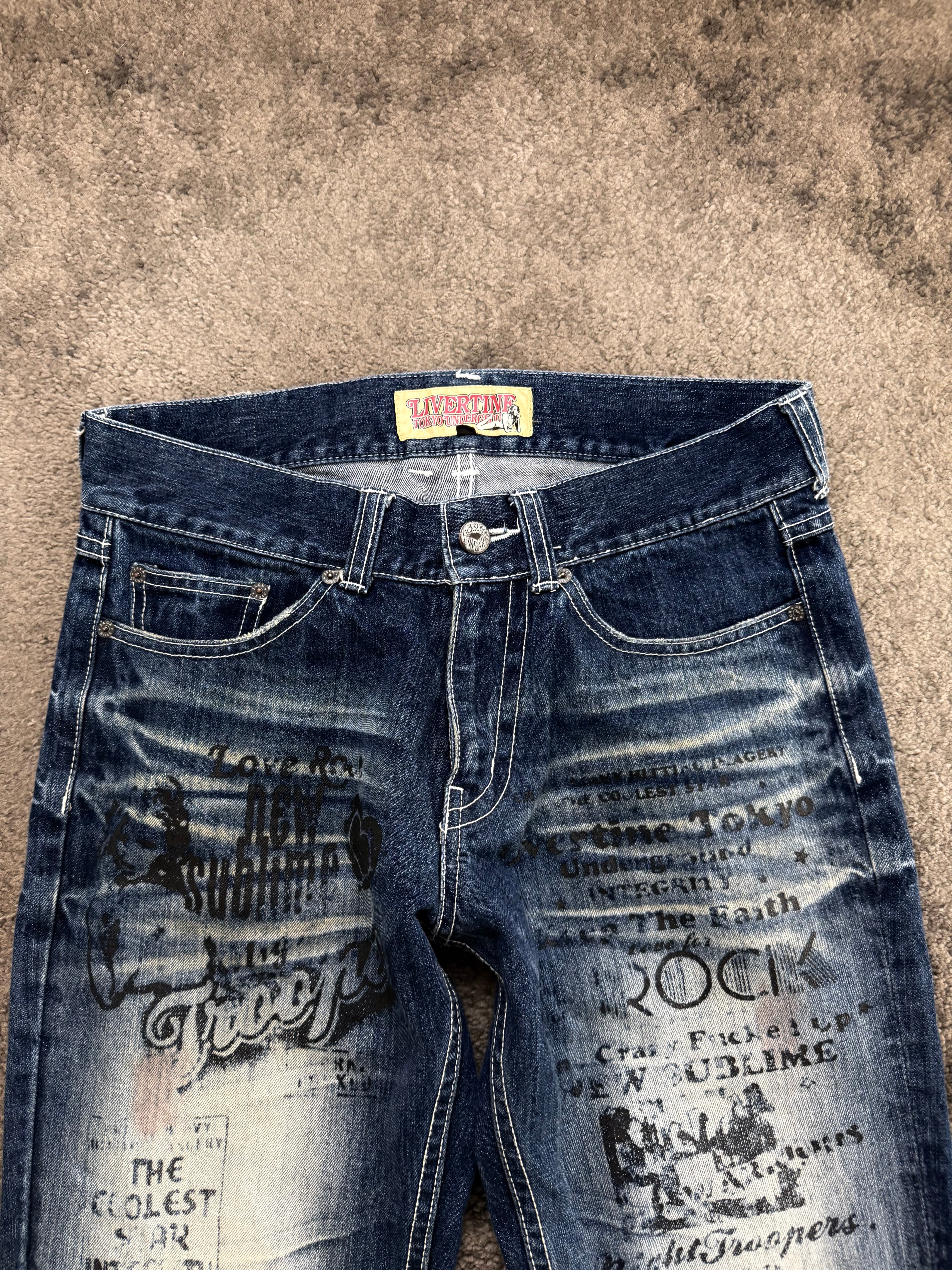 Condition: Very good pre-loved condition. The heavy fading, graphic overlays, and distressed details are intentional design elements. No major flaws – denim remains strong with excellent structure and visual impact.