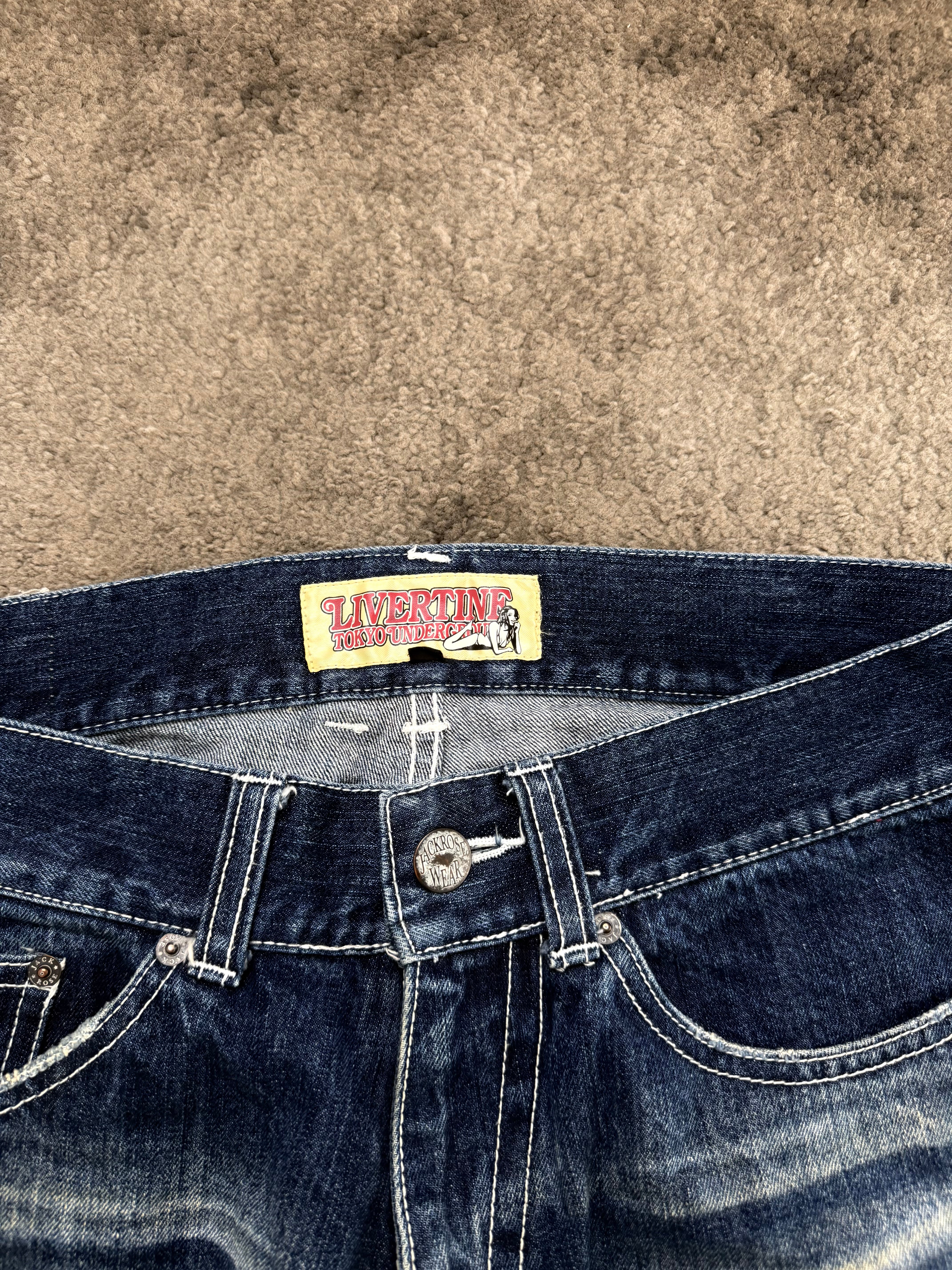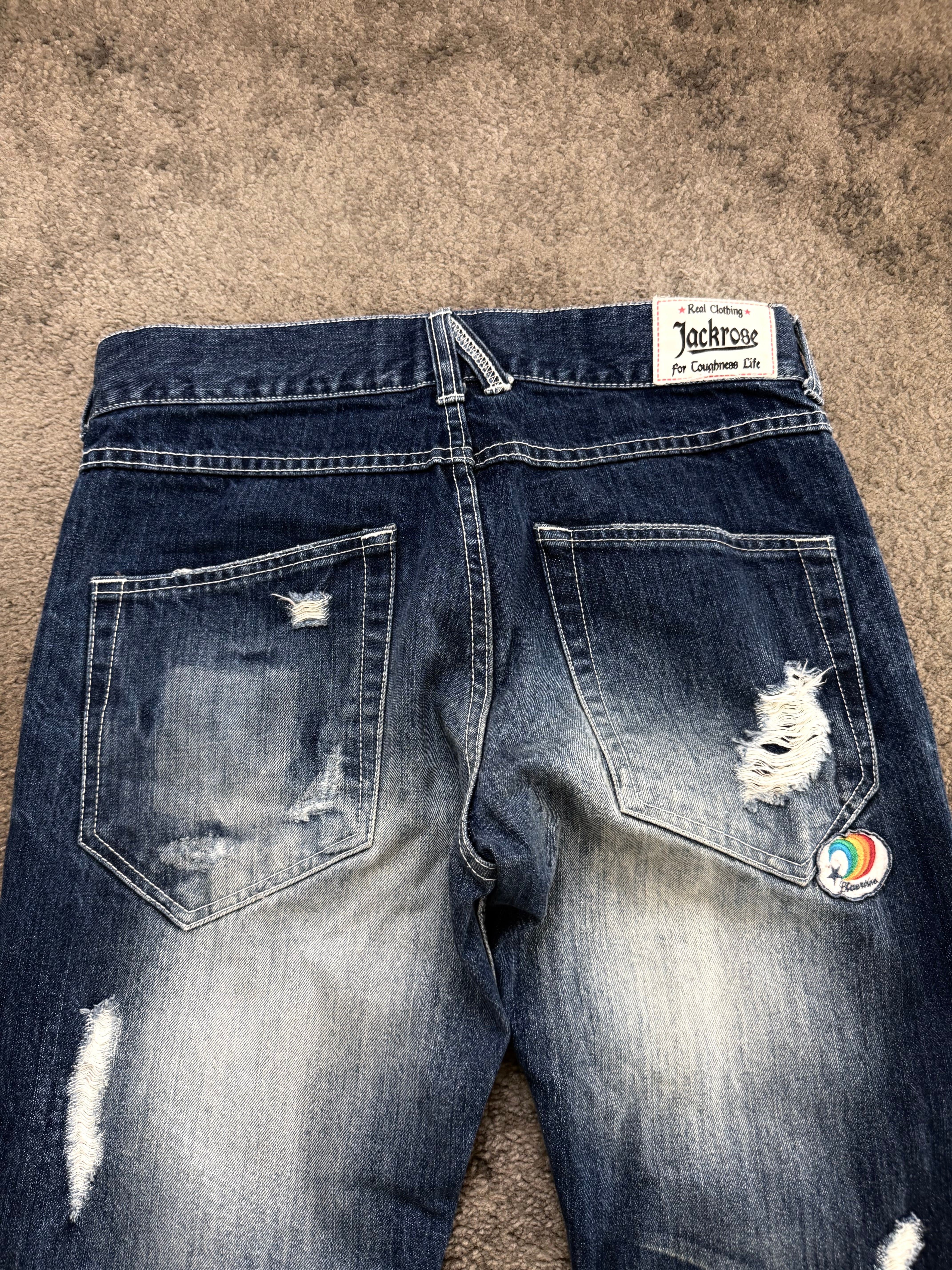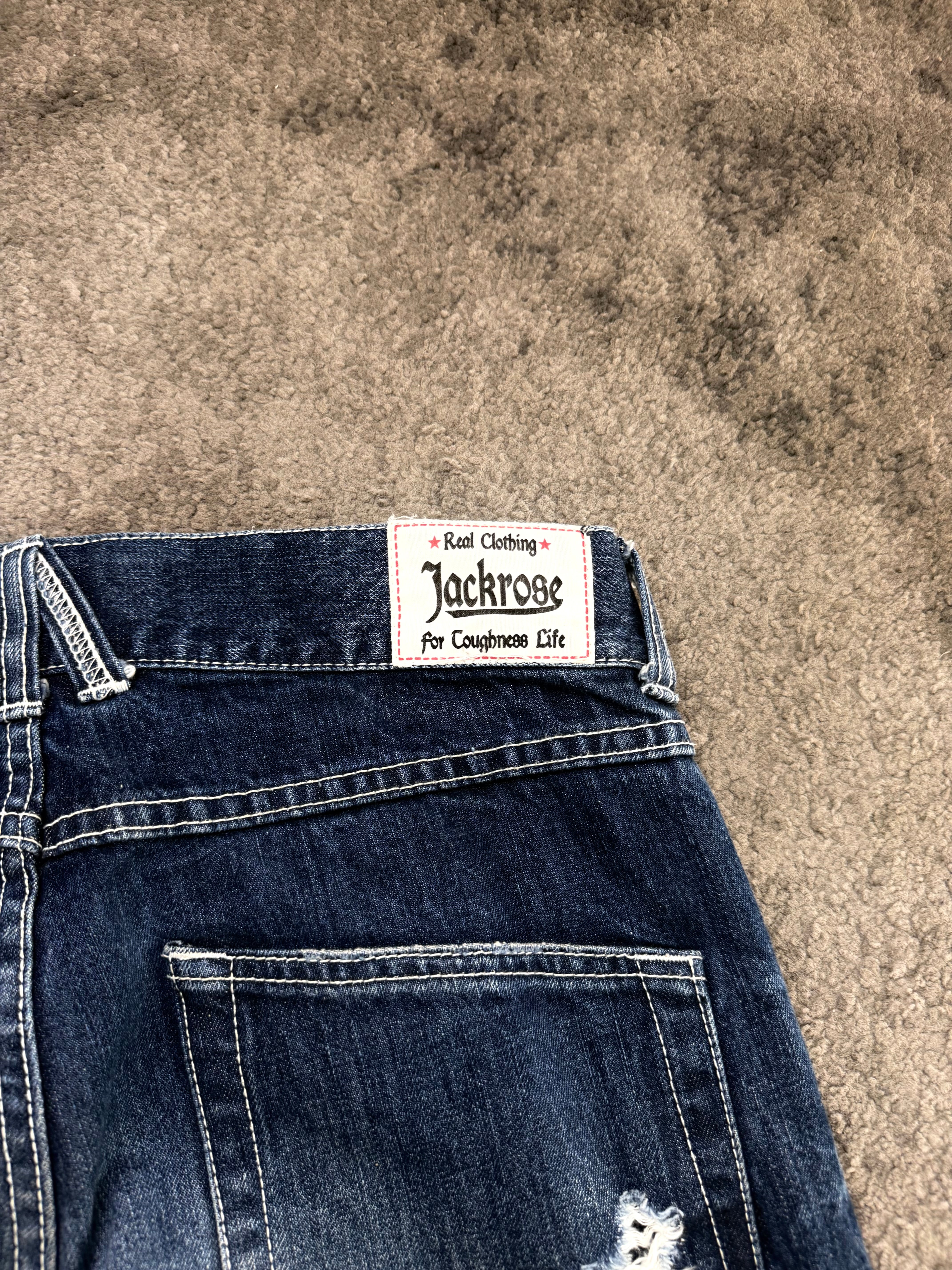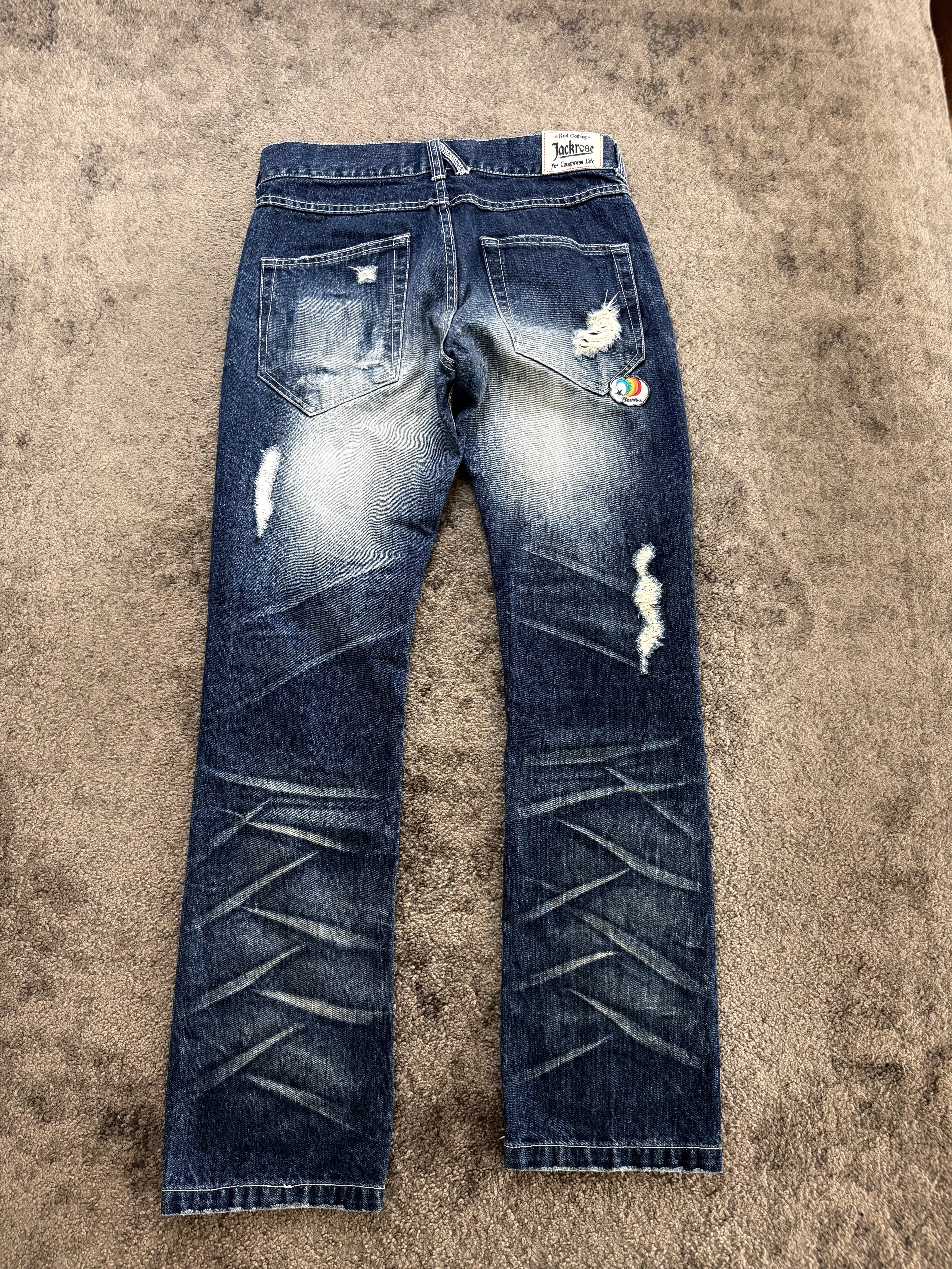 JACKROSE “Graphic Riot Archive” Flared Denim – bold front prints, aggressive whiskering, and raw distressing wrapped in a deep indigo base. A true statement piece that echoes the expressive chaos of early Number Nine / ifsixwasnine Japanese archive era – loud, emotional, and unapologetically cool.