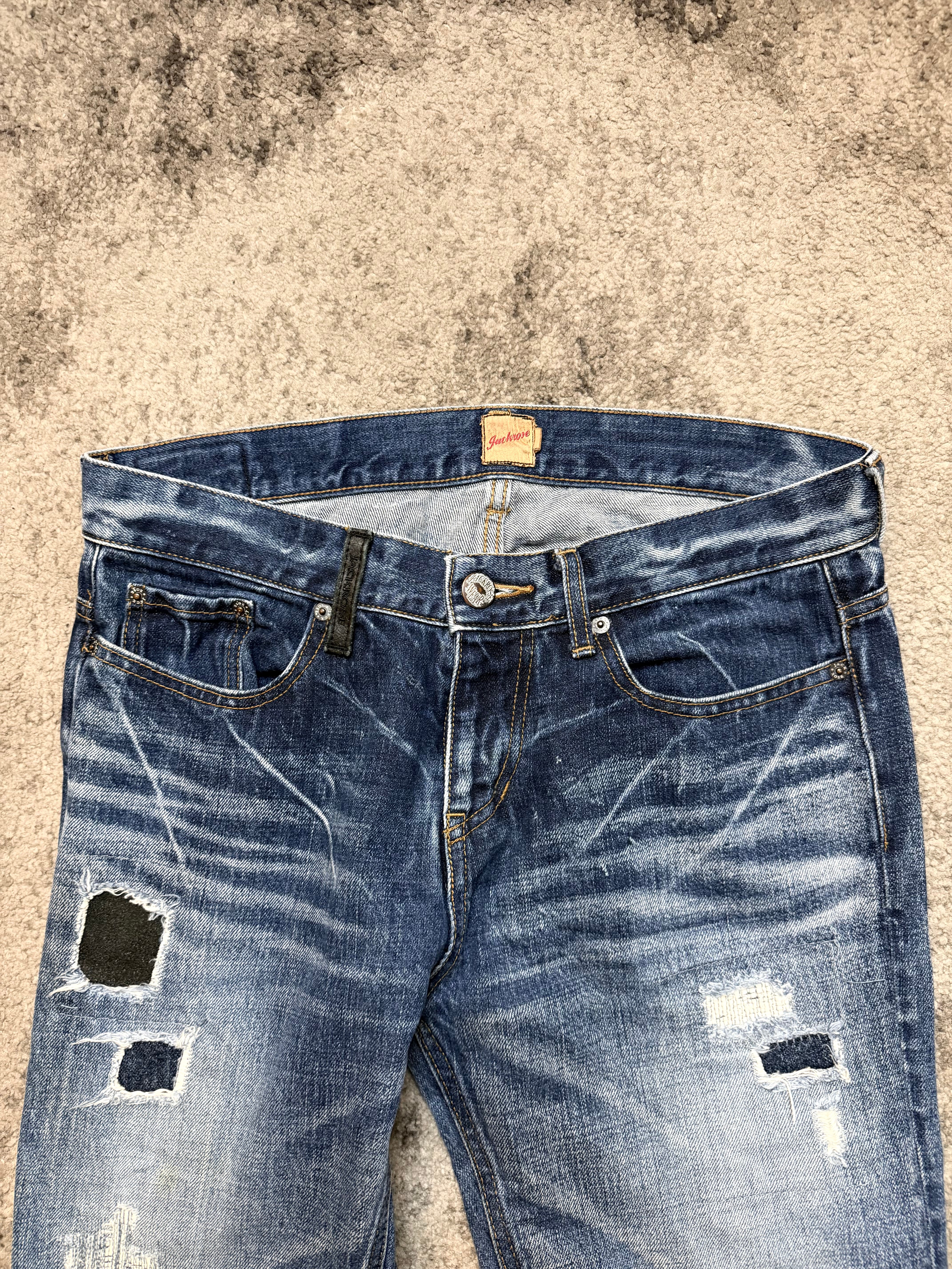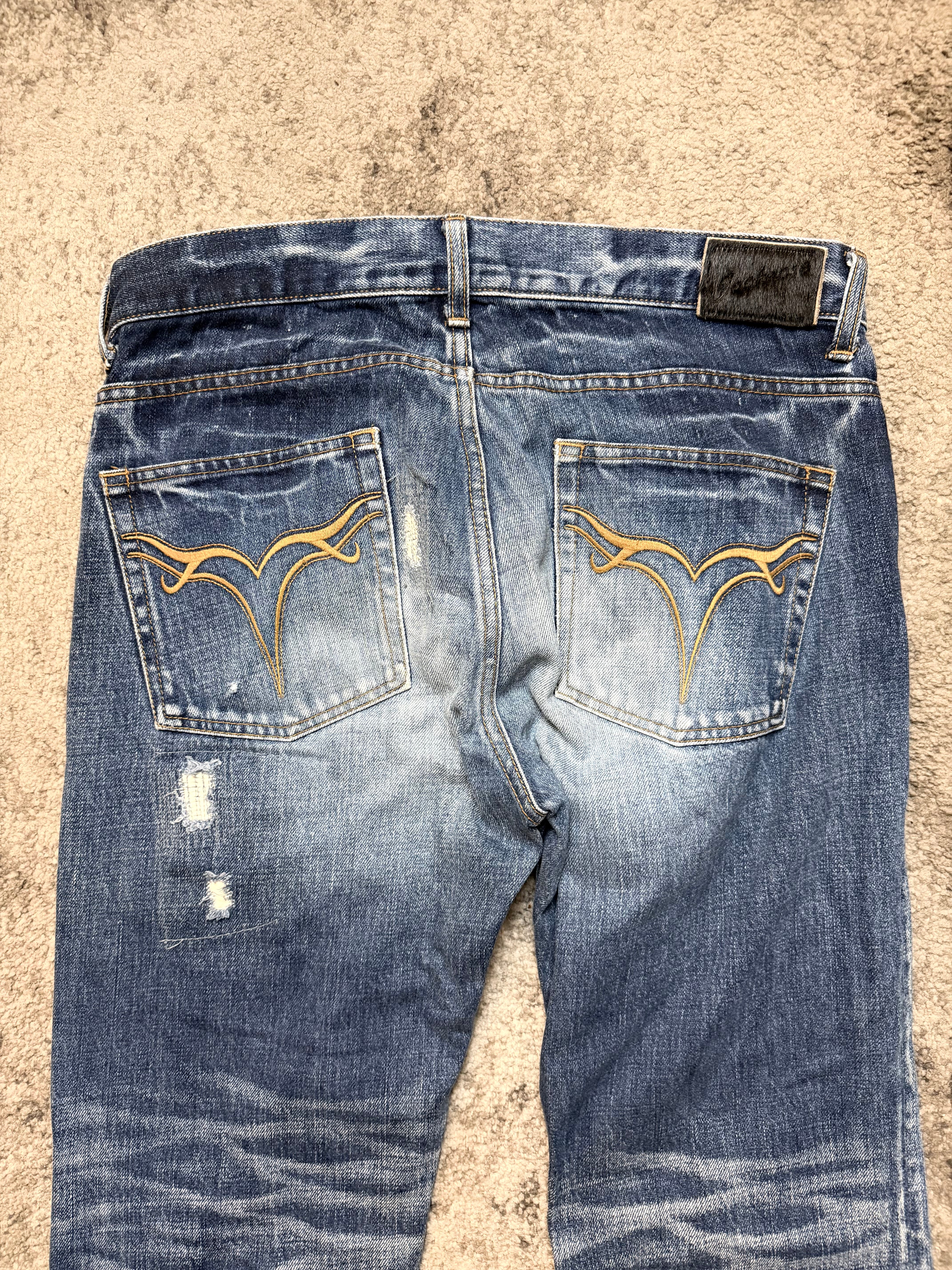 Excellent worn-in condition. Distressing and fading are intentional — the denim has softened naturally while retaining strong structure.