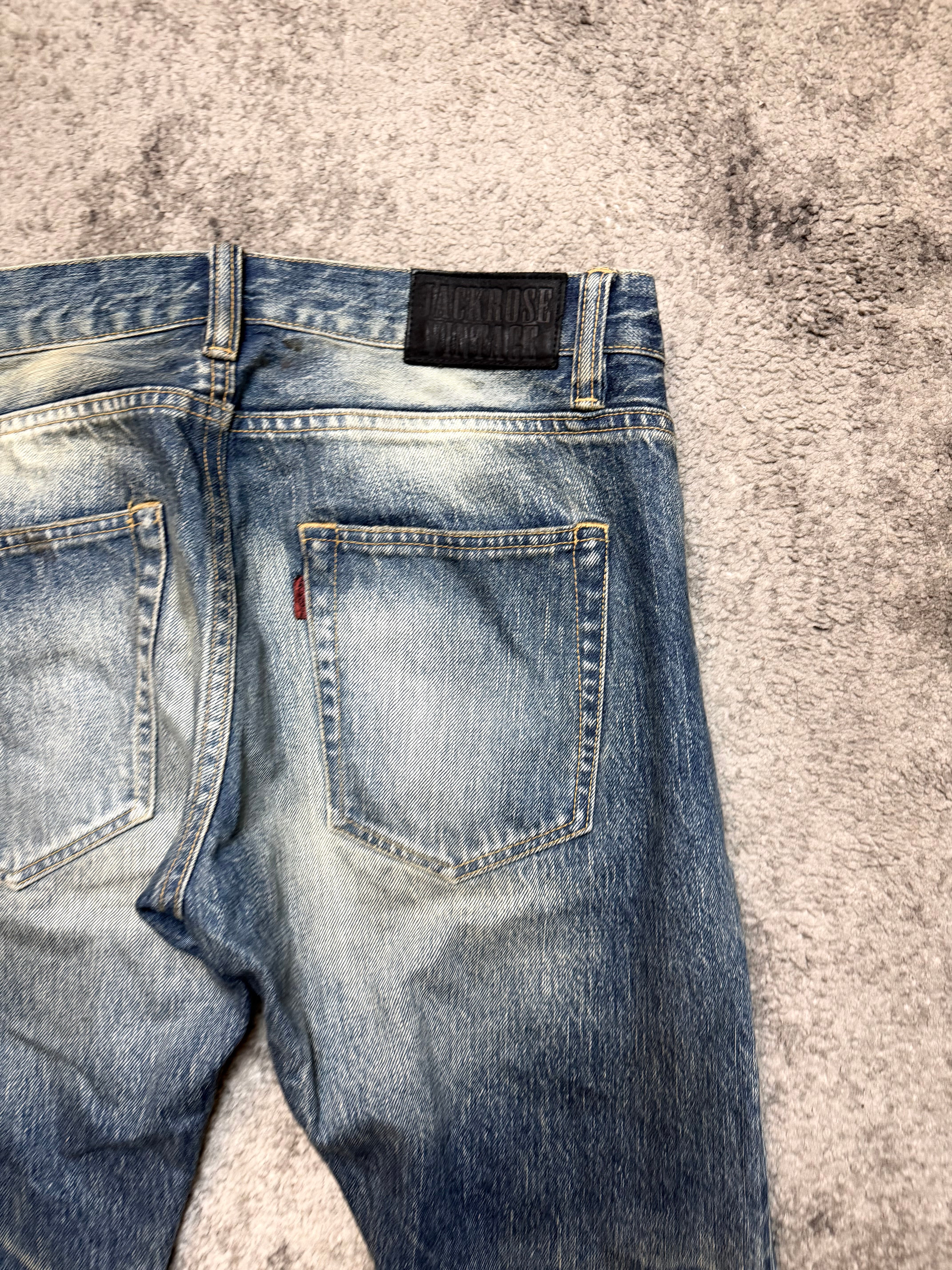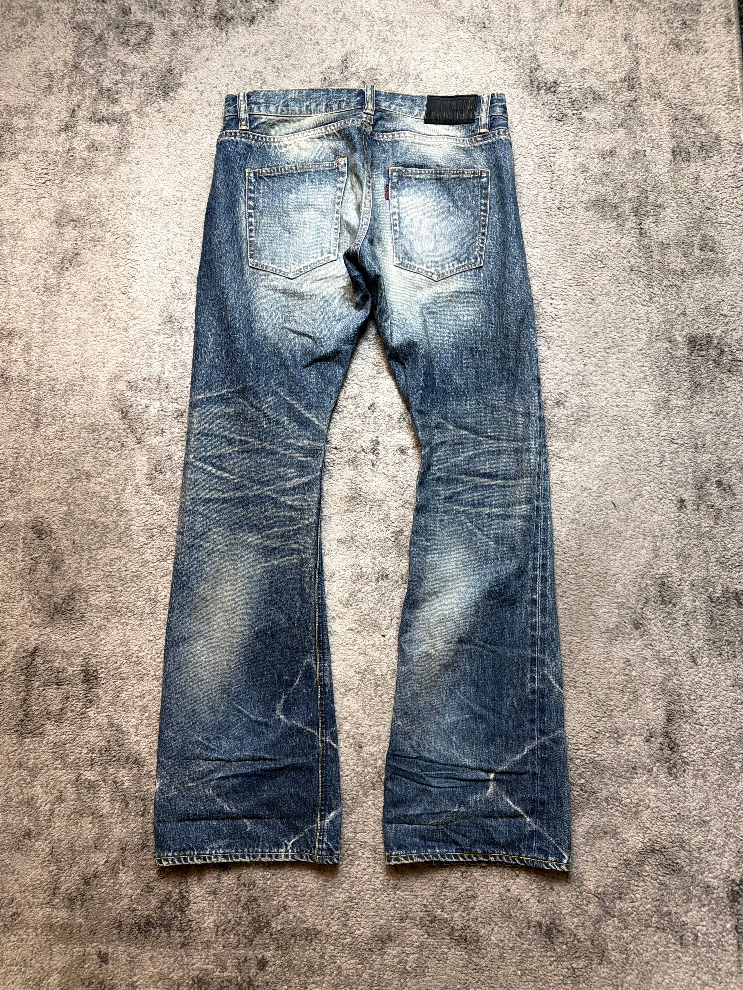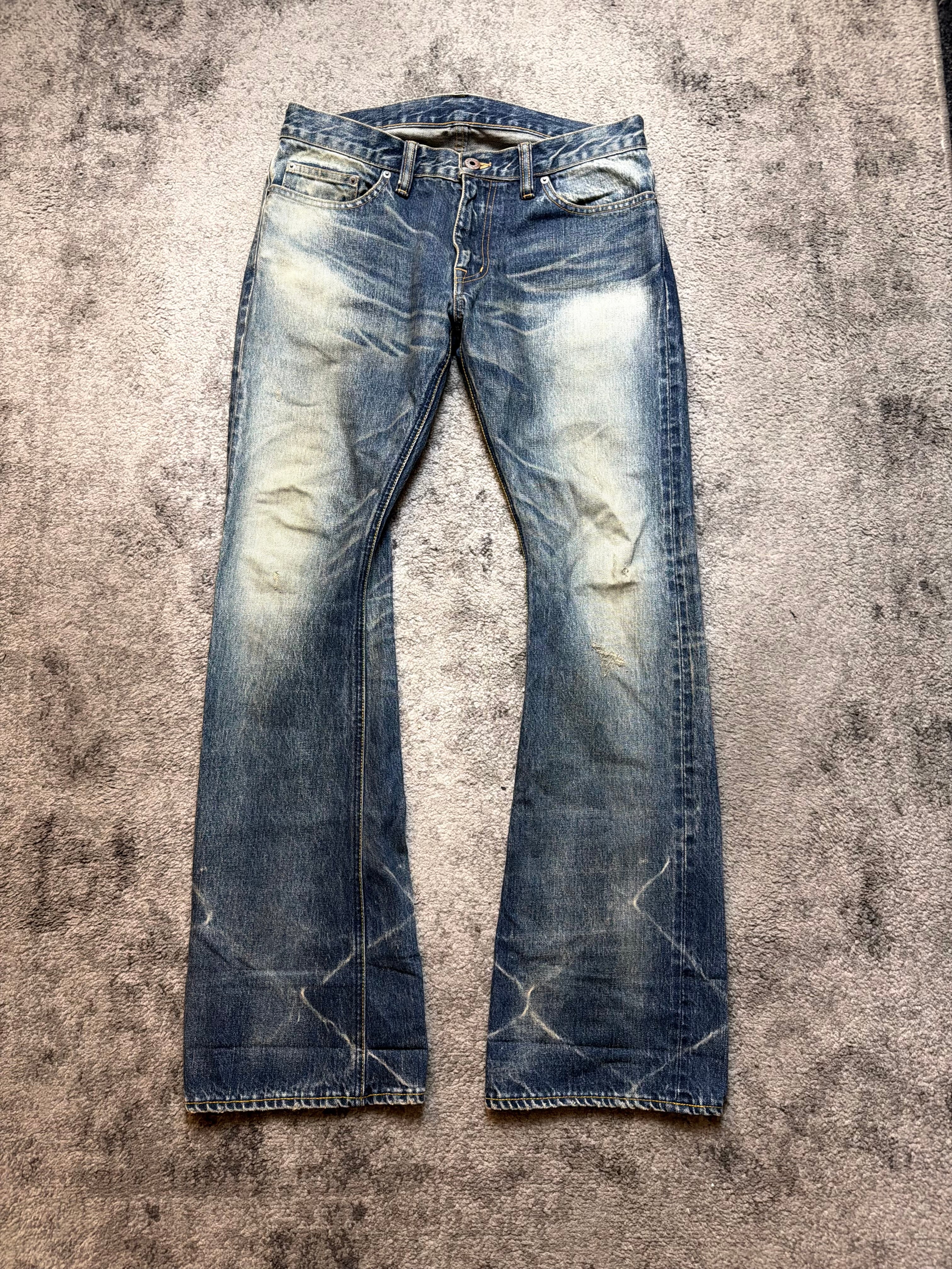 Perfect for Number (N)ine-style silhouettes, host-core layers, leather jackets, or anything built on mood and movement. The front carries classic high-contrast fade zones, while the lower legs show that signature Japanese “shattered” distress pattern. The back keeps it clean and minimal for pure archive vibes.