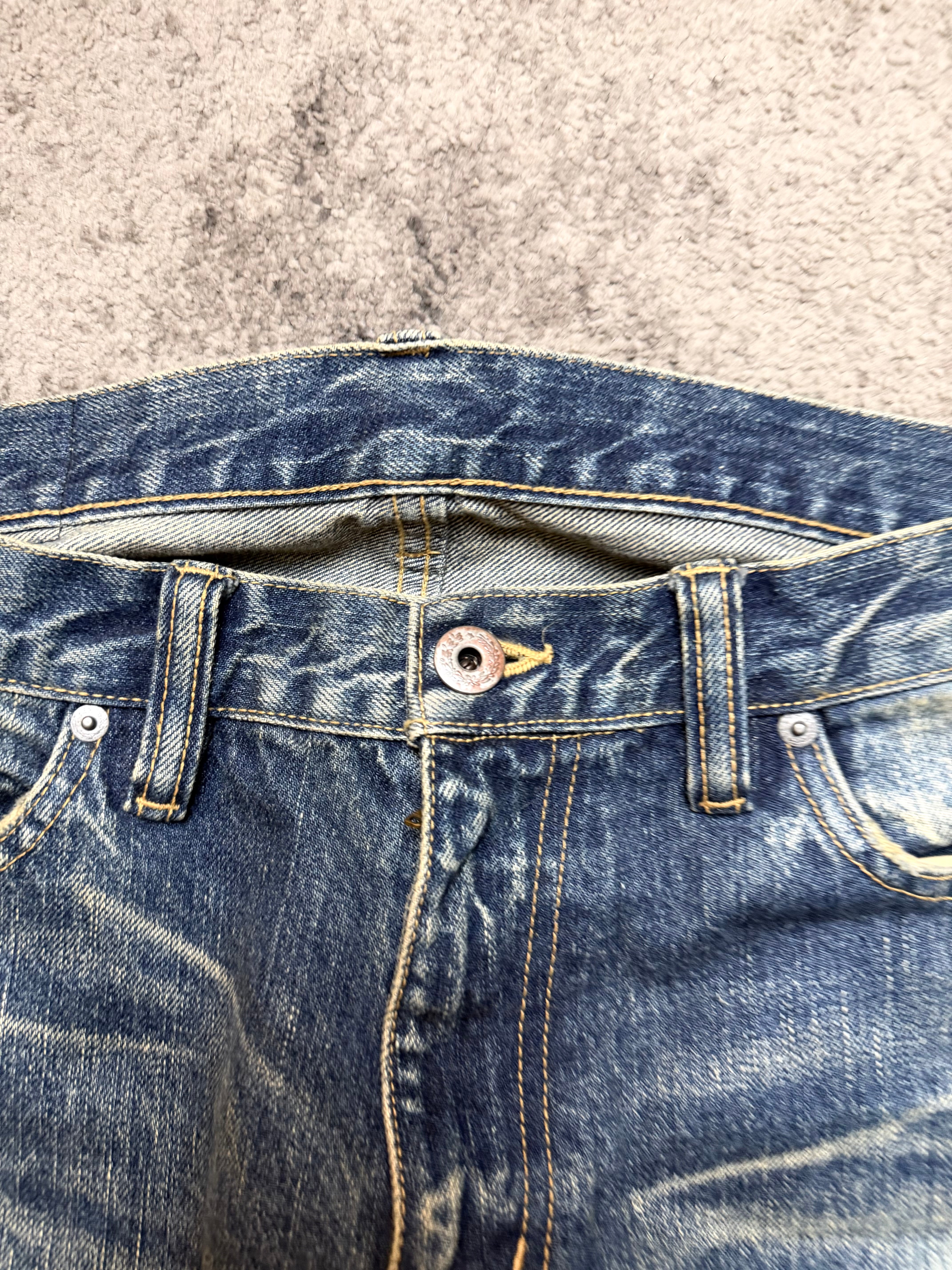 Mid-weight Japanese denim, washed into a warm vintage blue. Smooth on top with deeper grain and texture toward the lower legs.