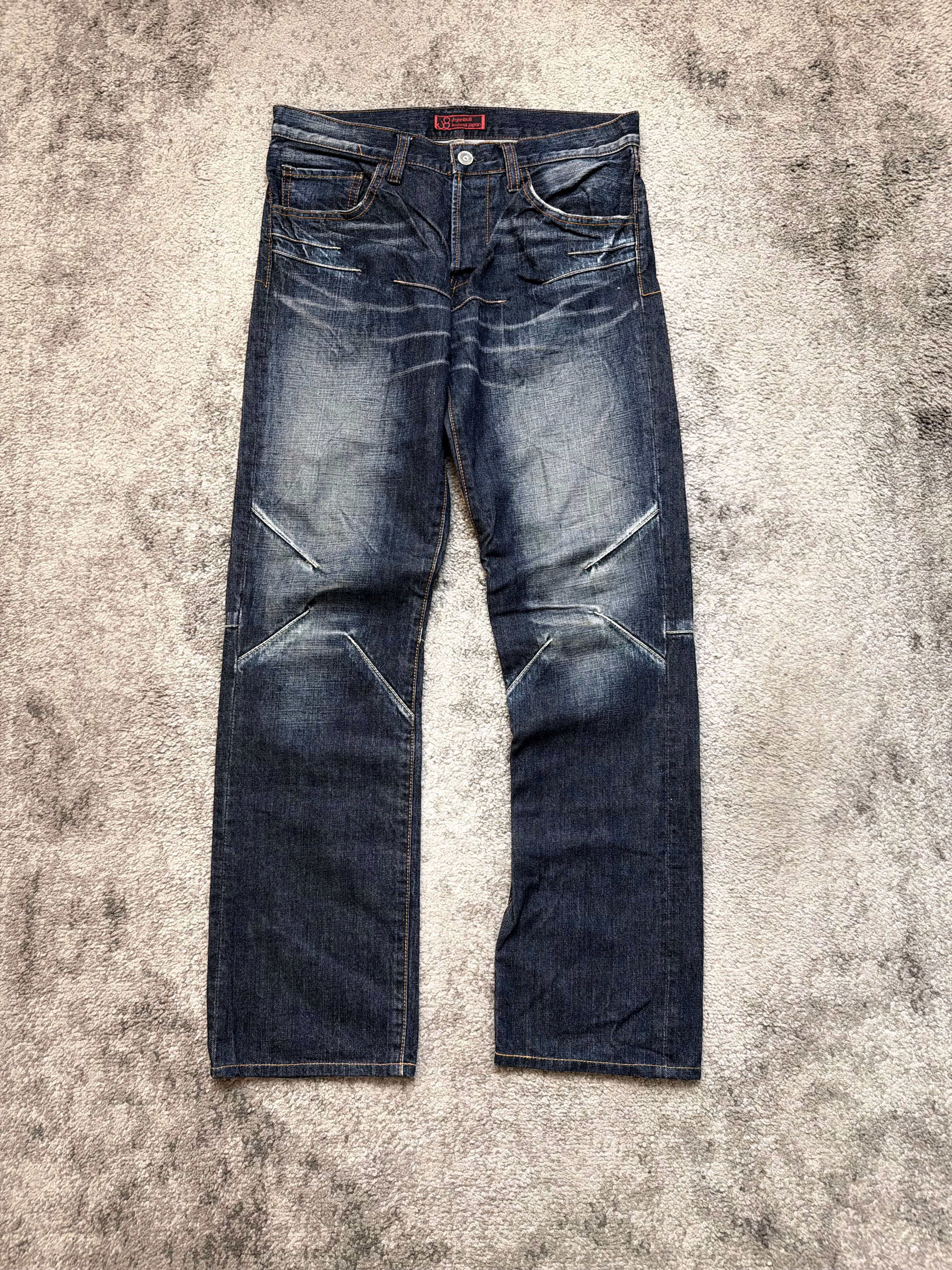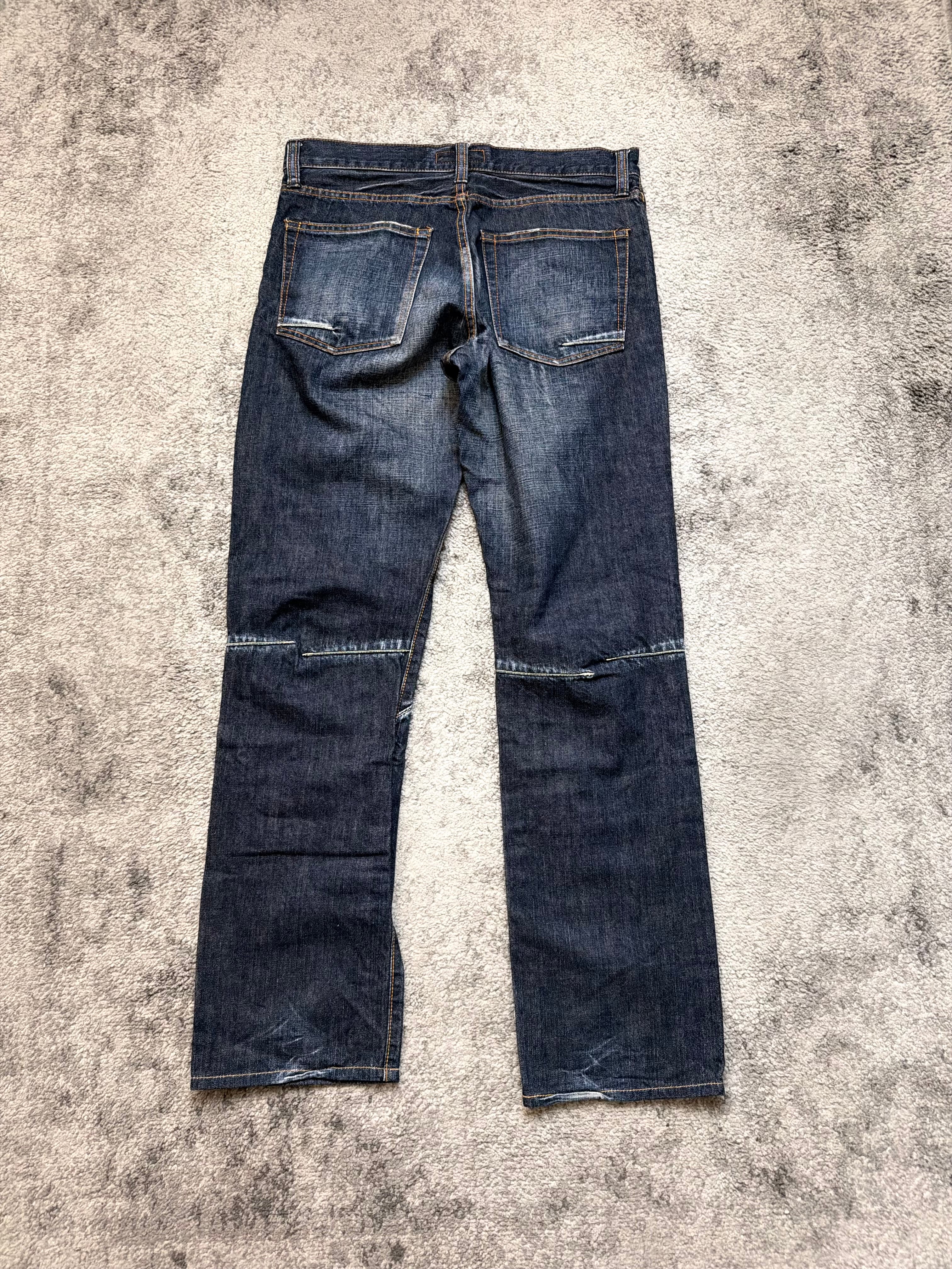 This pair from JOHN BULL captures the essence of Japanese reconstruction design — rugged yet intentional, with every fade and seam telling its own story. The geometric distressing and panel stitching across the knees nod to artisanal repair culture while maintaining a modern silhouette. It’s functional art — denim that feels alive.