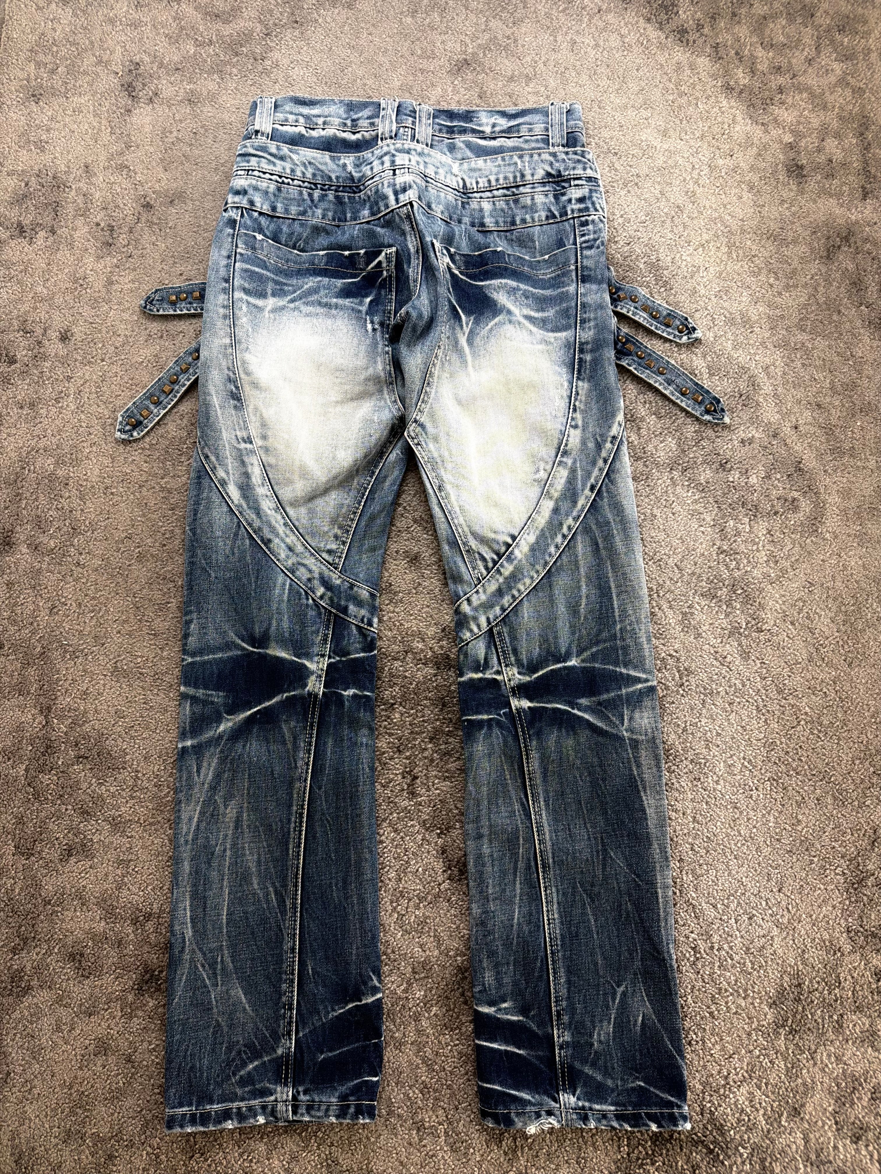 Condition: Very good pre-loved condition with strong intentional fading and dramatic whiskering throughout. Stud detailing is intact, no major flaws. The denim remains structurally solid and fully wearable.