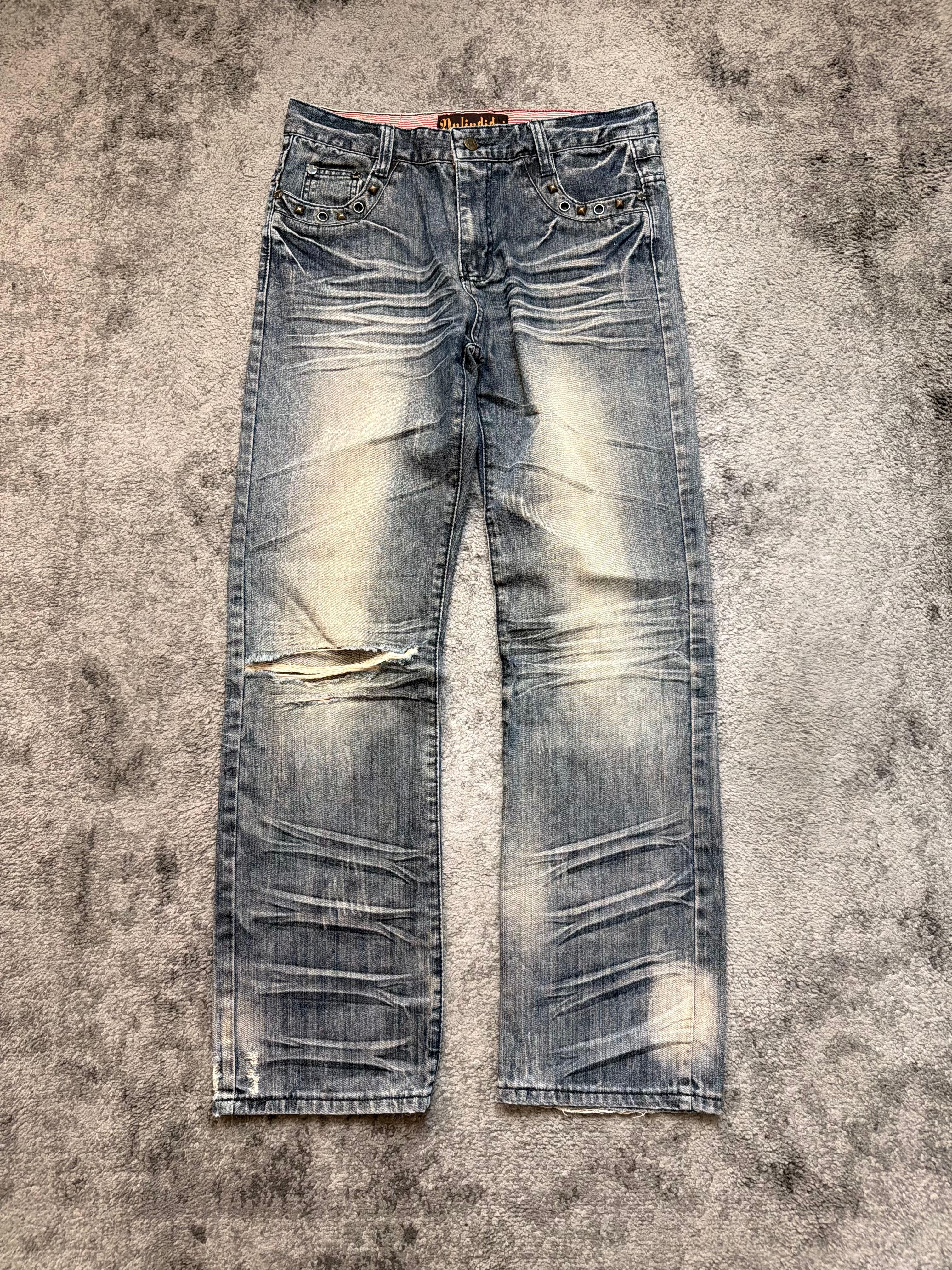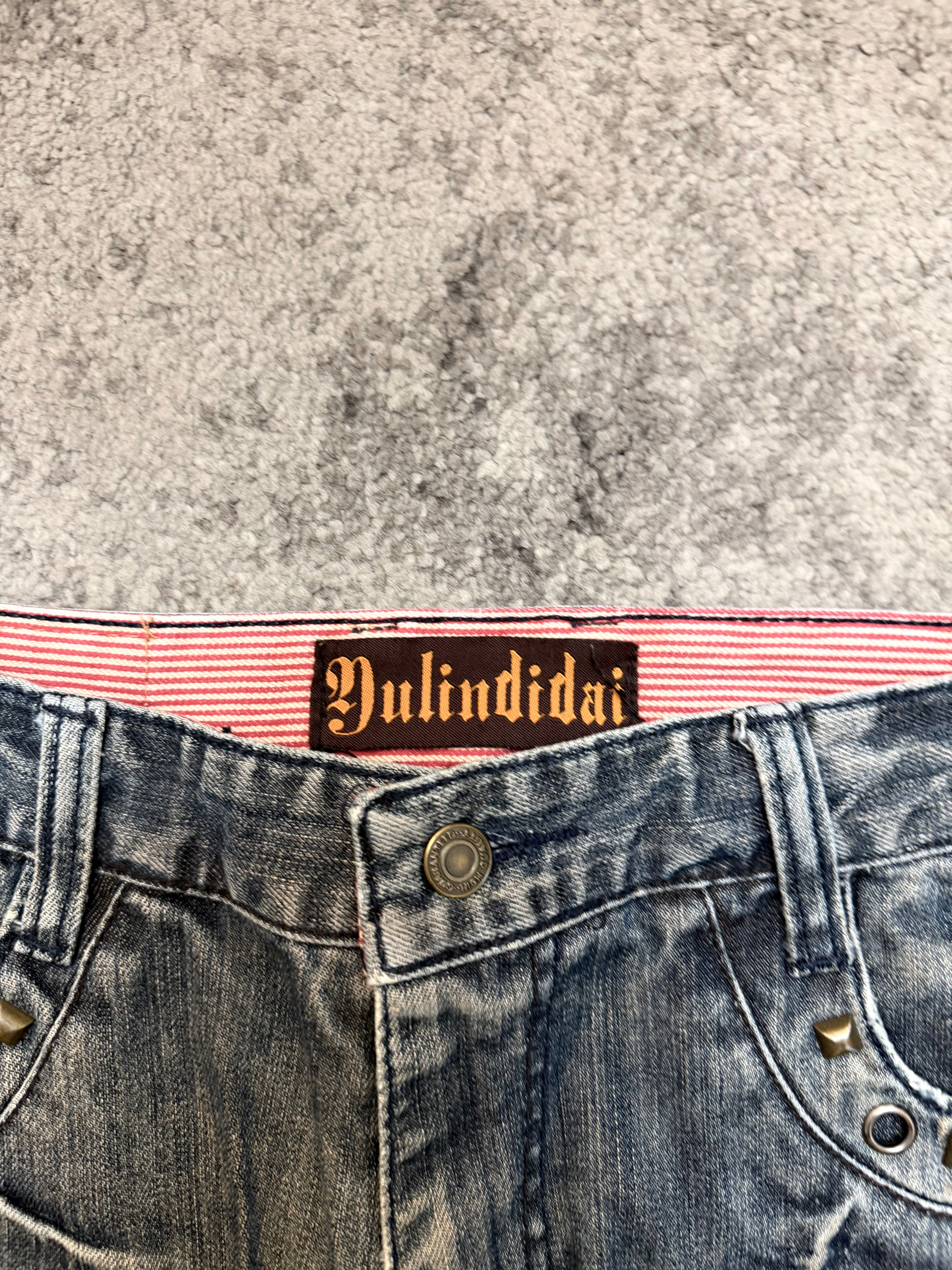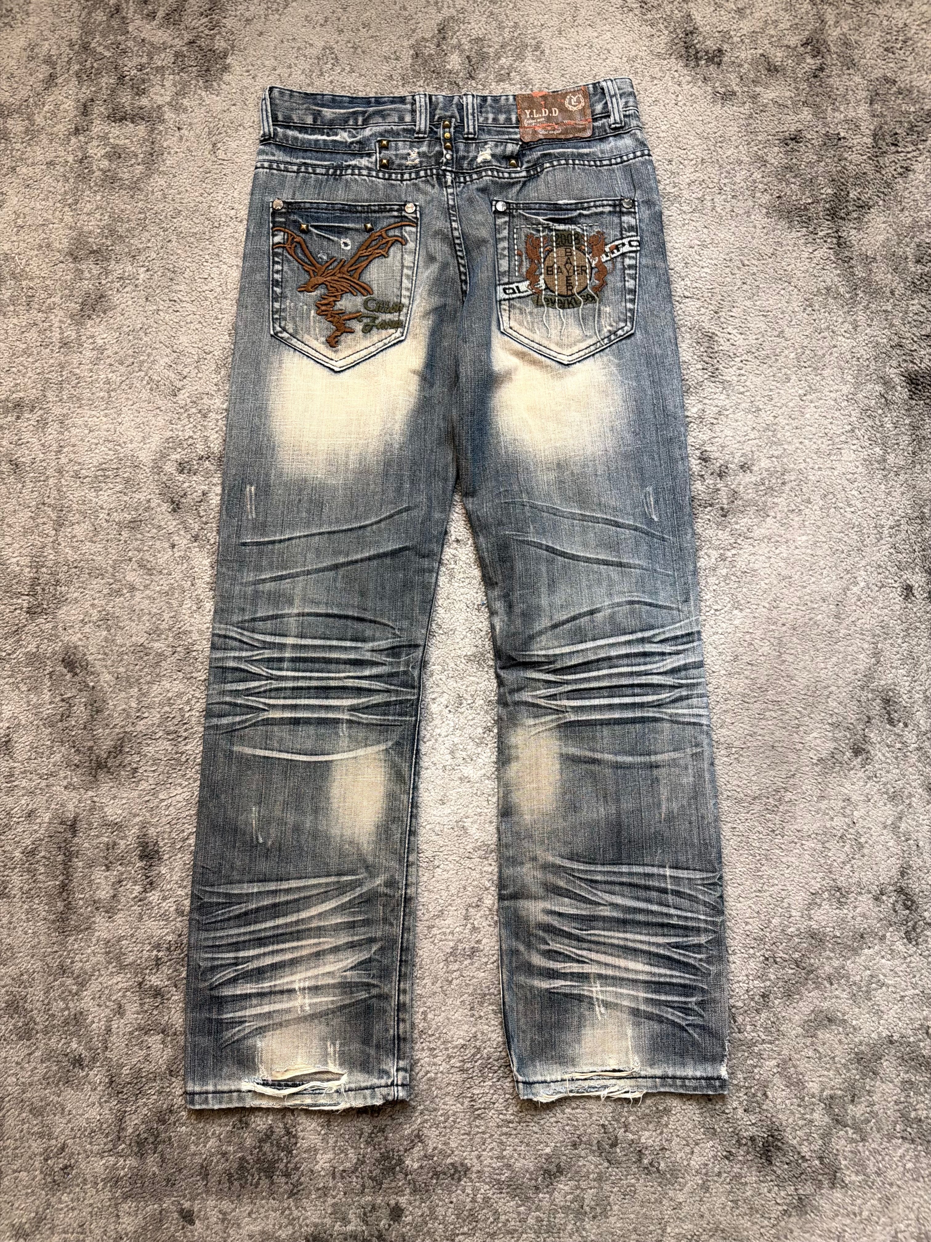A standout piece from Japan’s underground denim scene — these JULINDIDAI jeans merge intricate embroidery with raw distressing. The heavy fading, ripped knees, and whiskered texture tell a story of wear and defiance, while the embroidered eagle and crest motifs on the back pockets capture a sense of freedom and strength.