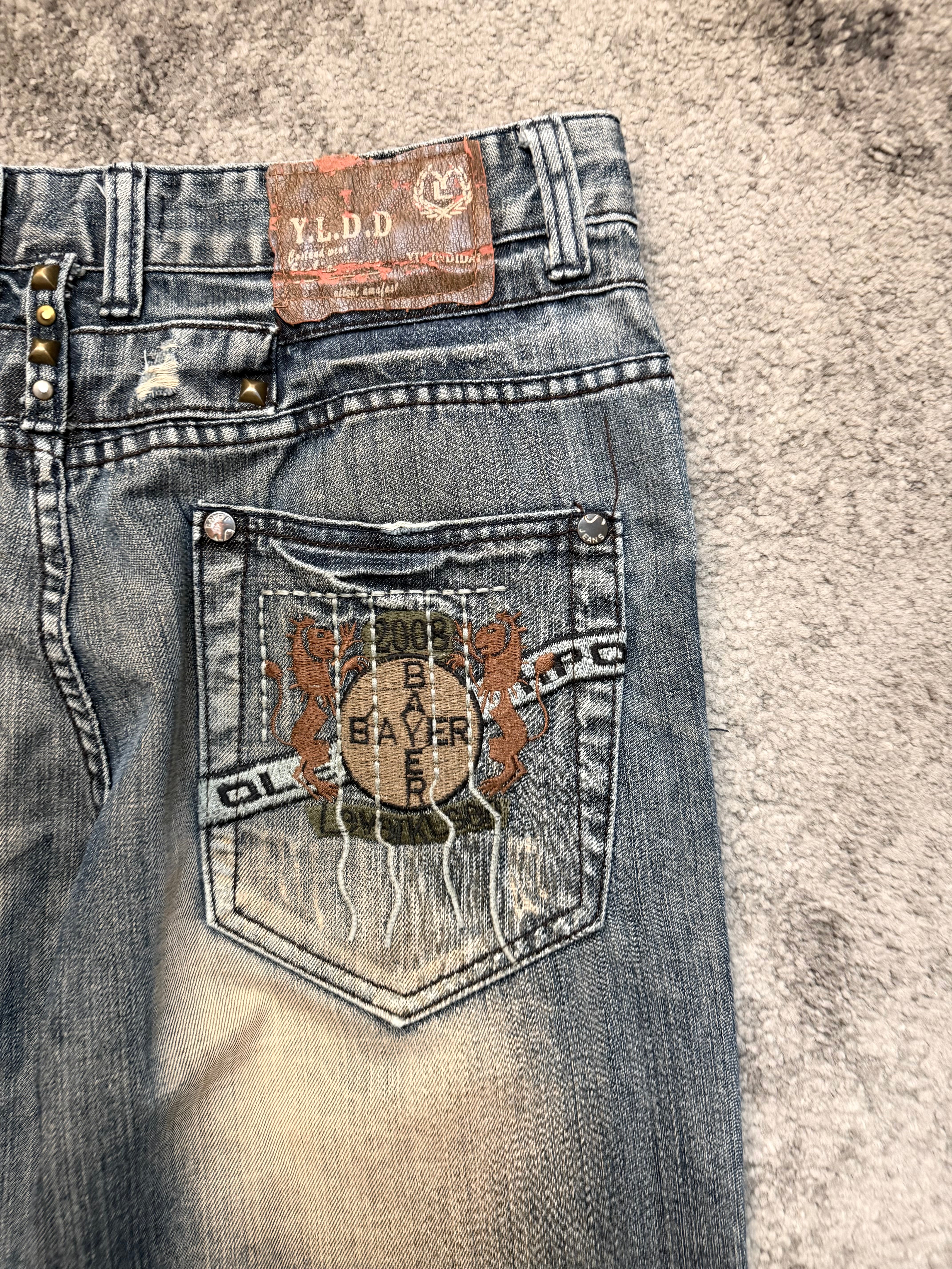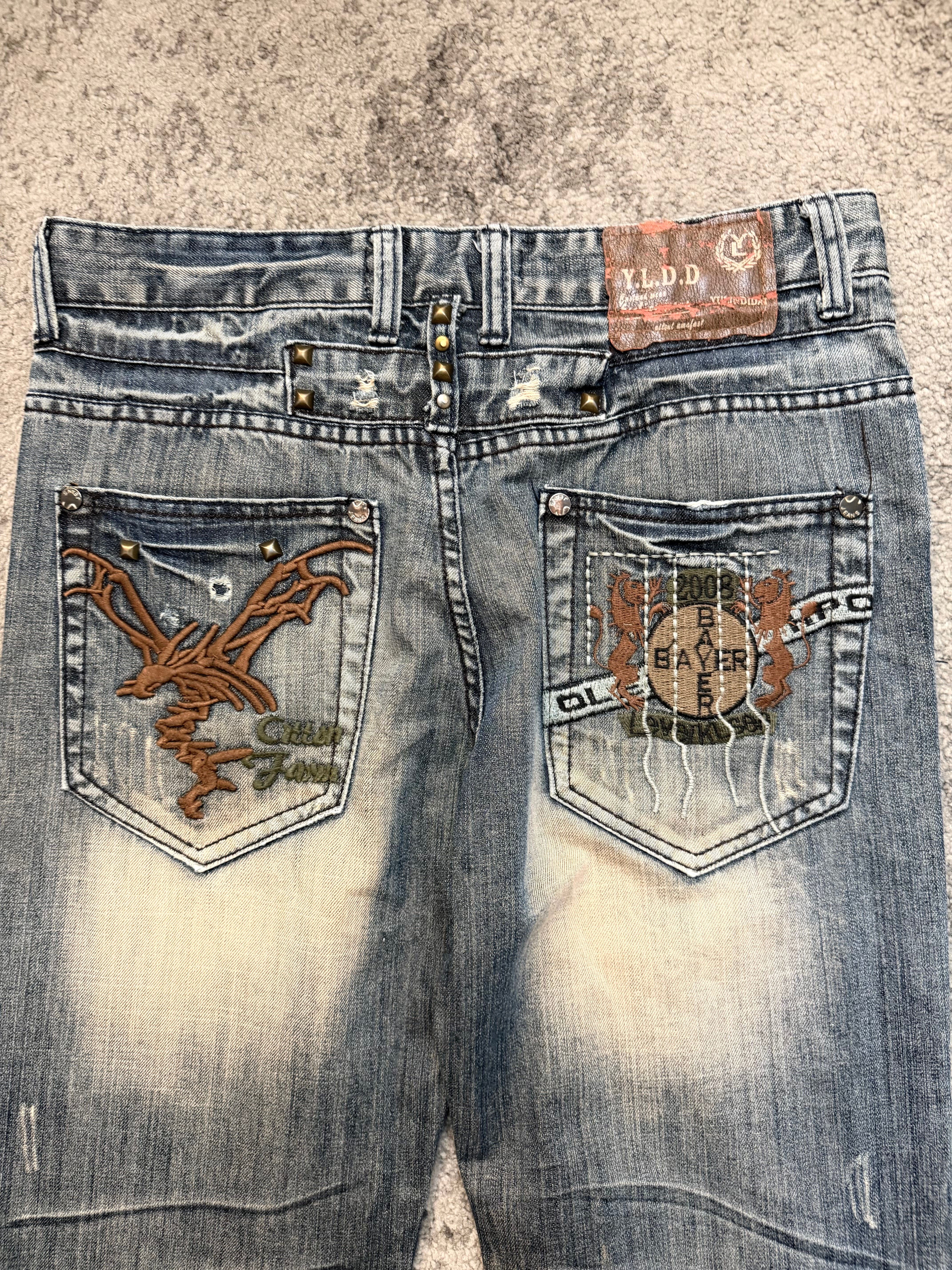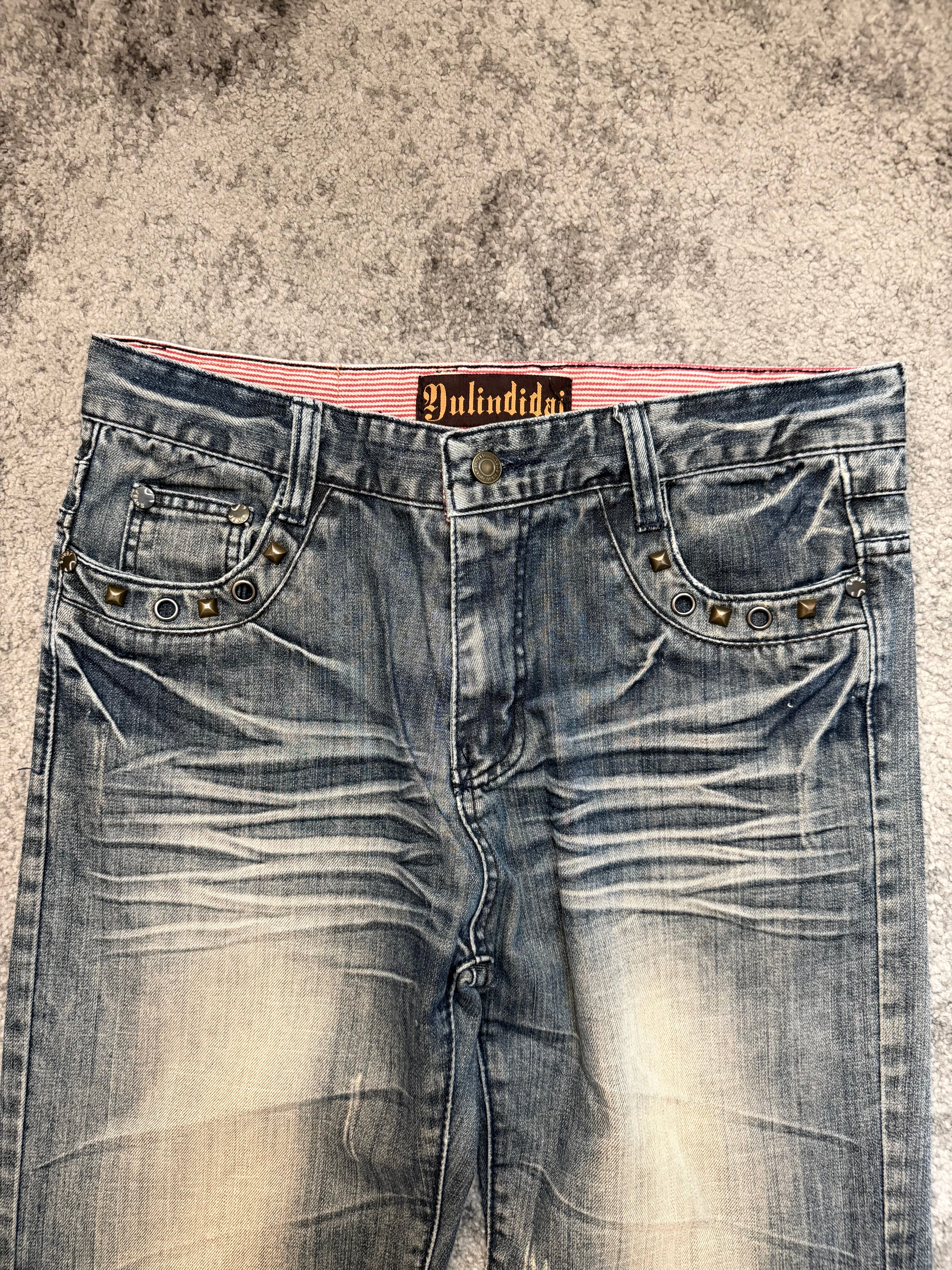 A standout piece from Japan’s underground denim scene — these JULINDIDAI jeans merge intricate embroidery with raw distressing. The heavy fading, ripped knees, and whiskered texture tell a story of wear and defiance, while the embroidered eagle and crest motifs on the back pockets capture a sense of freedom and strength.
