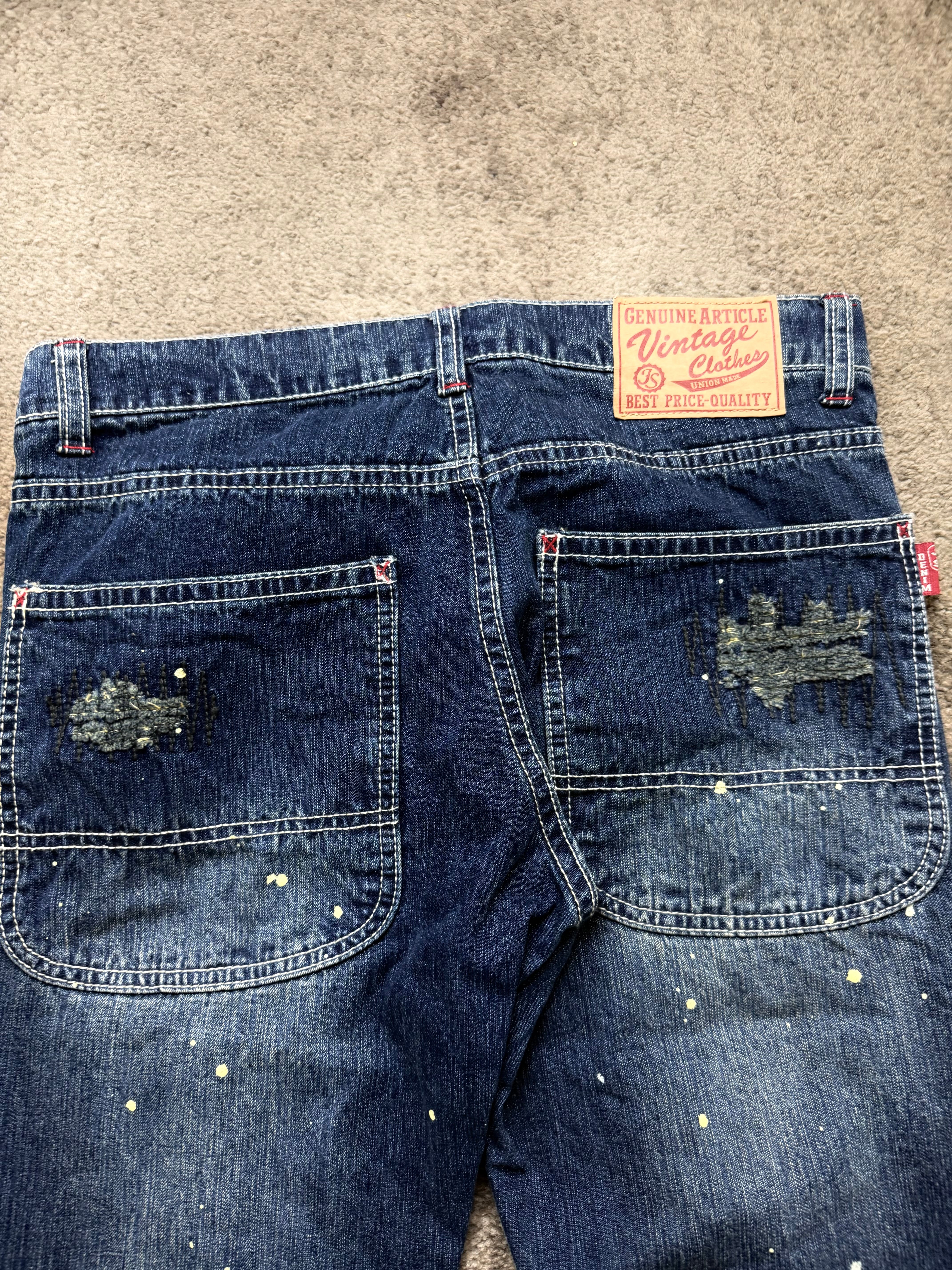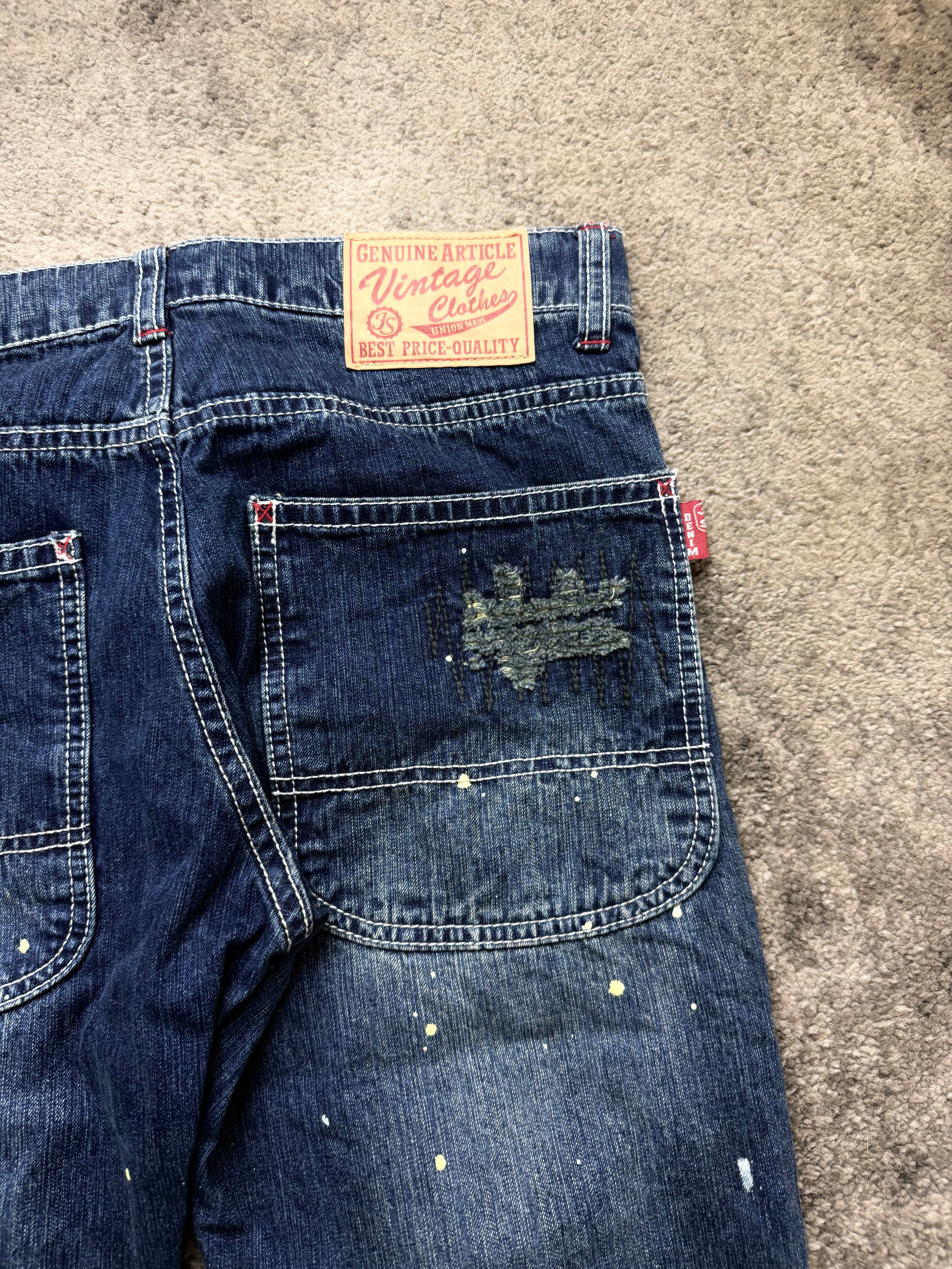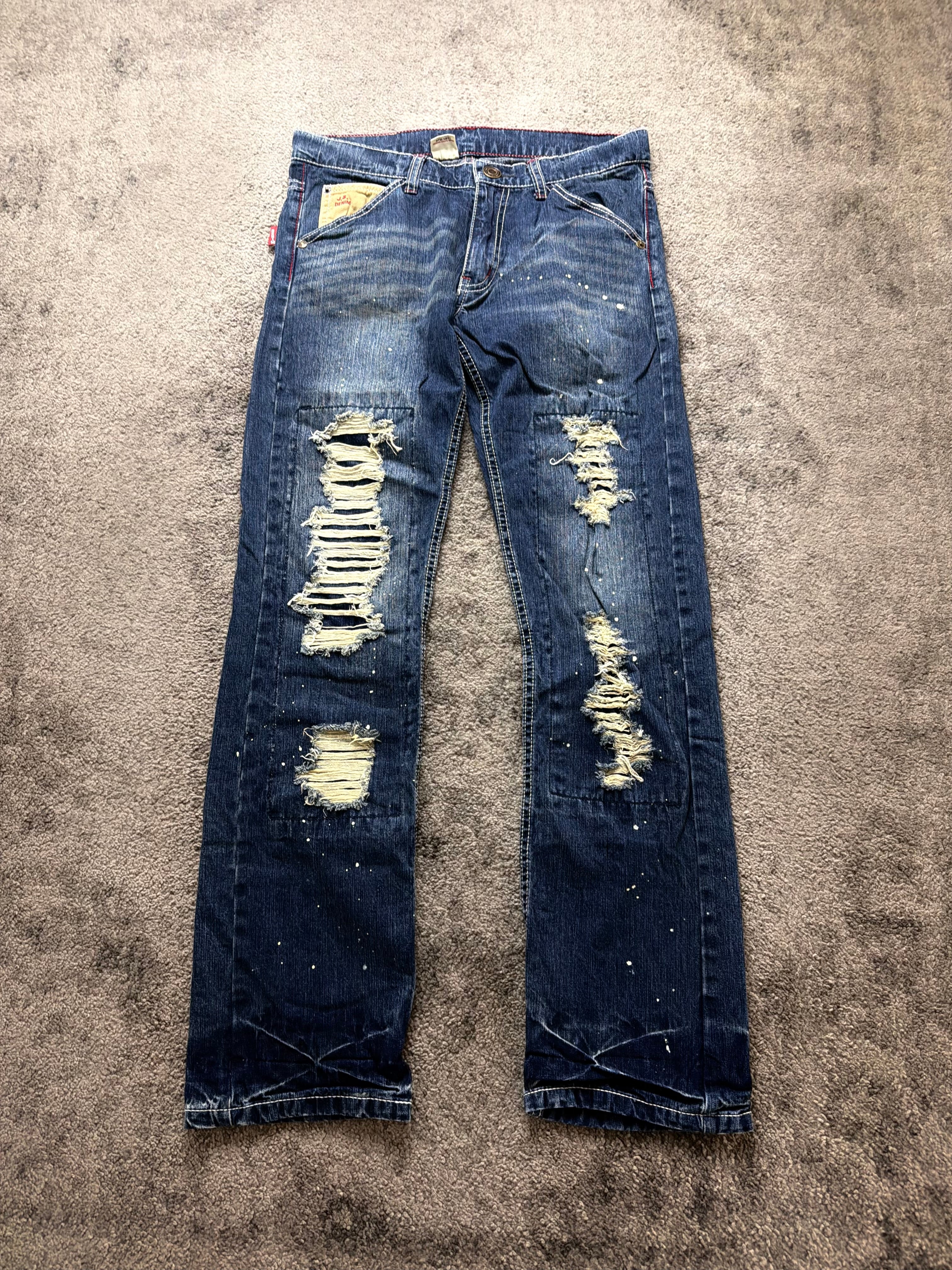 Condition: Pre-loved, good vintage condition. Intentional heavy distressing, rips, and paint splatter are part of the original design. No structural damage—denim still feels solid and wearable.
