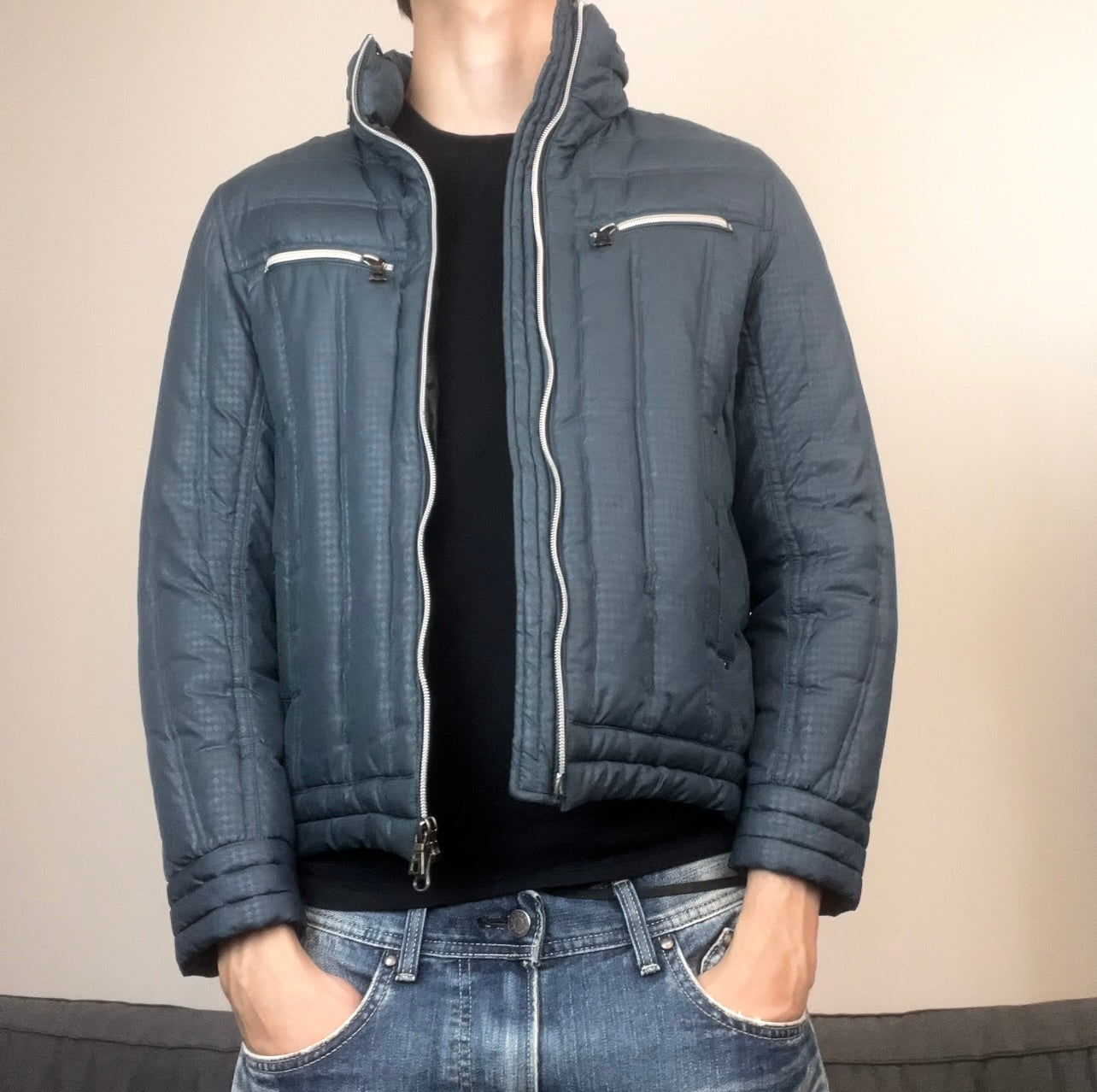 Constructed from high-quality nylon with lightweight down padding for warmth without bulk. The dual chest zippers and adjustable waist snap tabs enhance both functionality and edge — a quiet nod to Tokyo’s early 2000s street refinement.