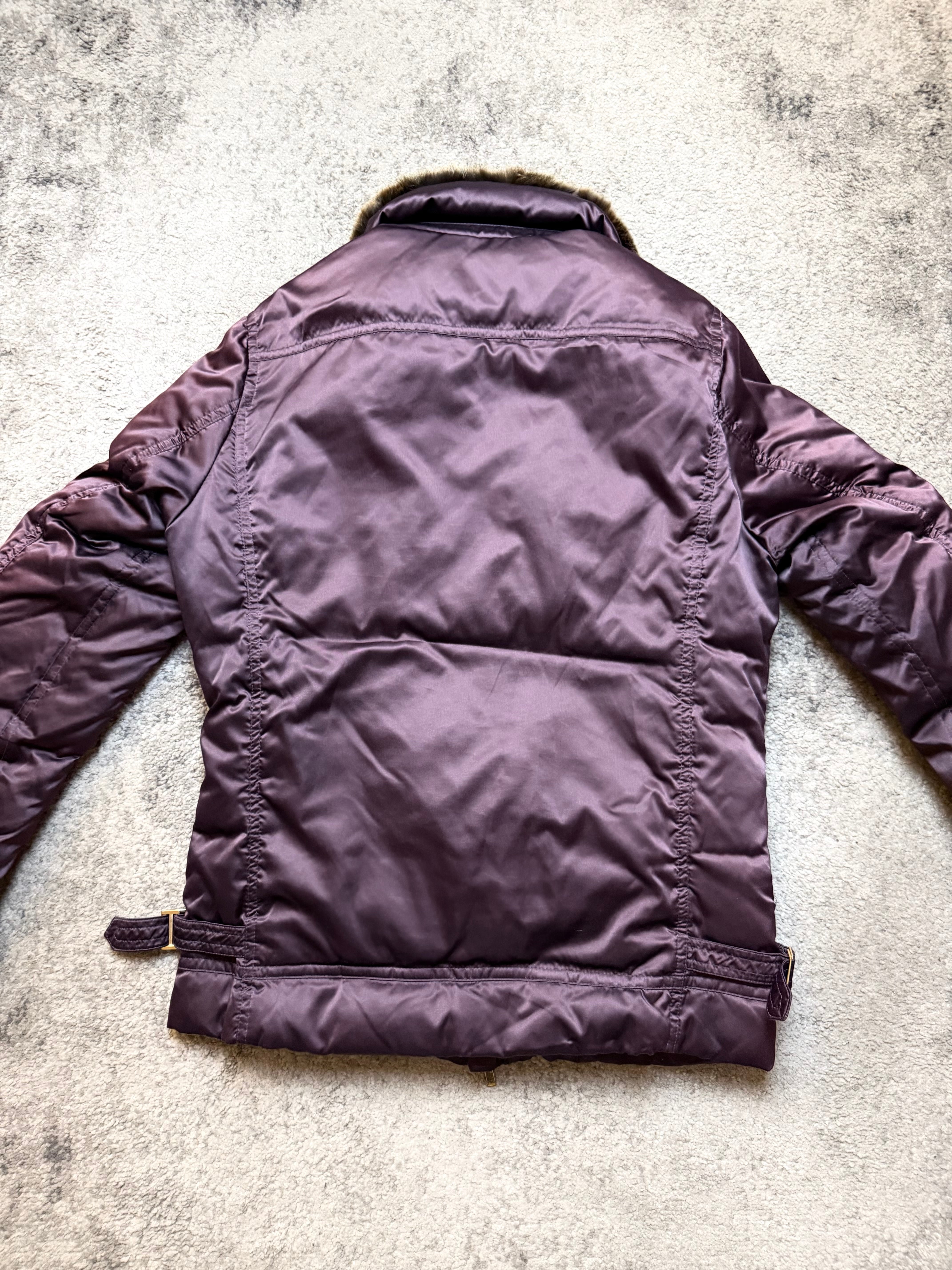 Details: Intricate panel stitching, metal hardware, adjustable waist tabs, secure zip pockets, and a beautifully structured silhouette. The rich plum-purple tone gives it a unique, sophisticated edge rarely seen today.