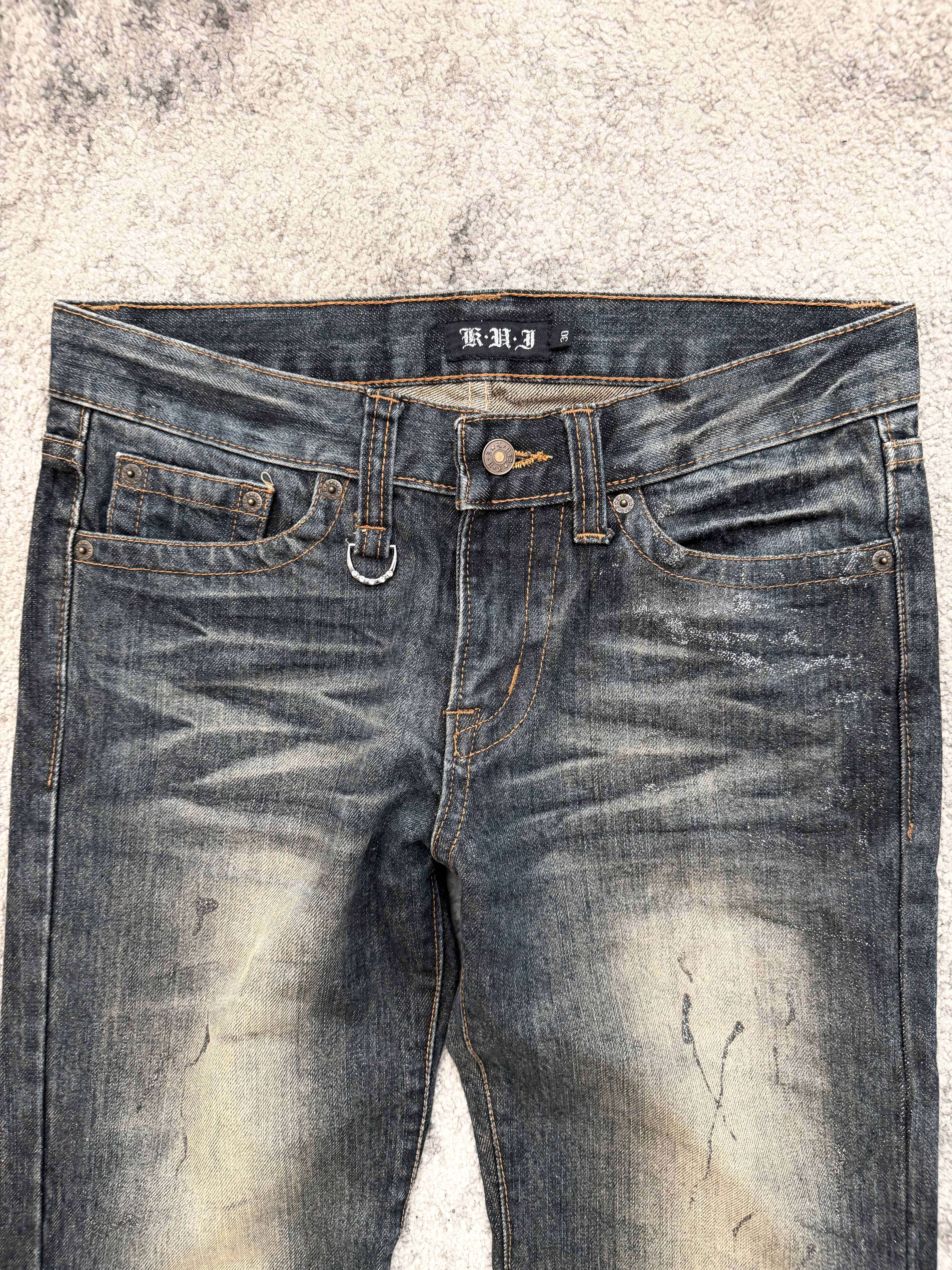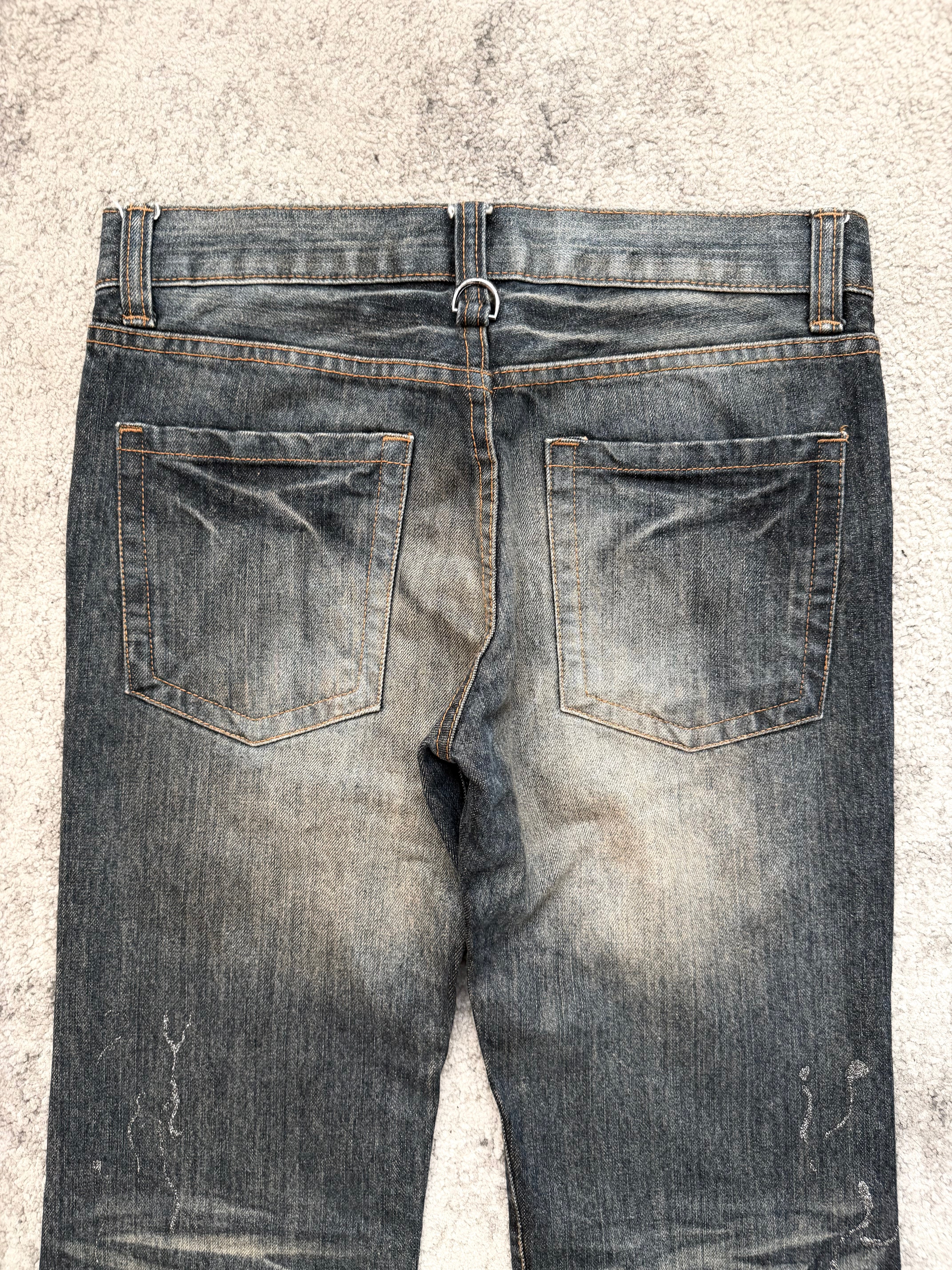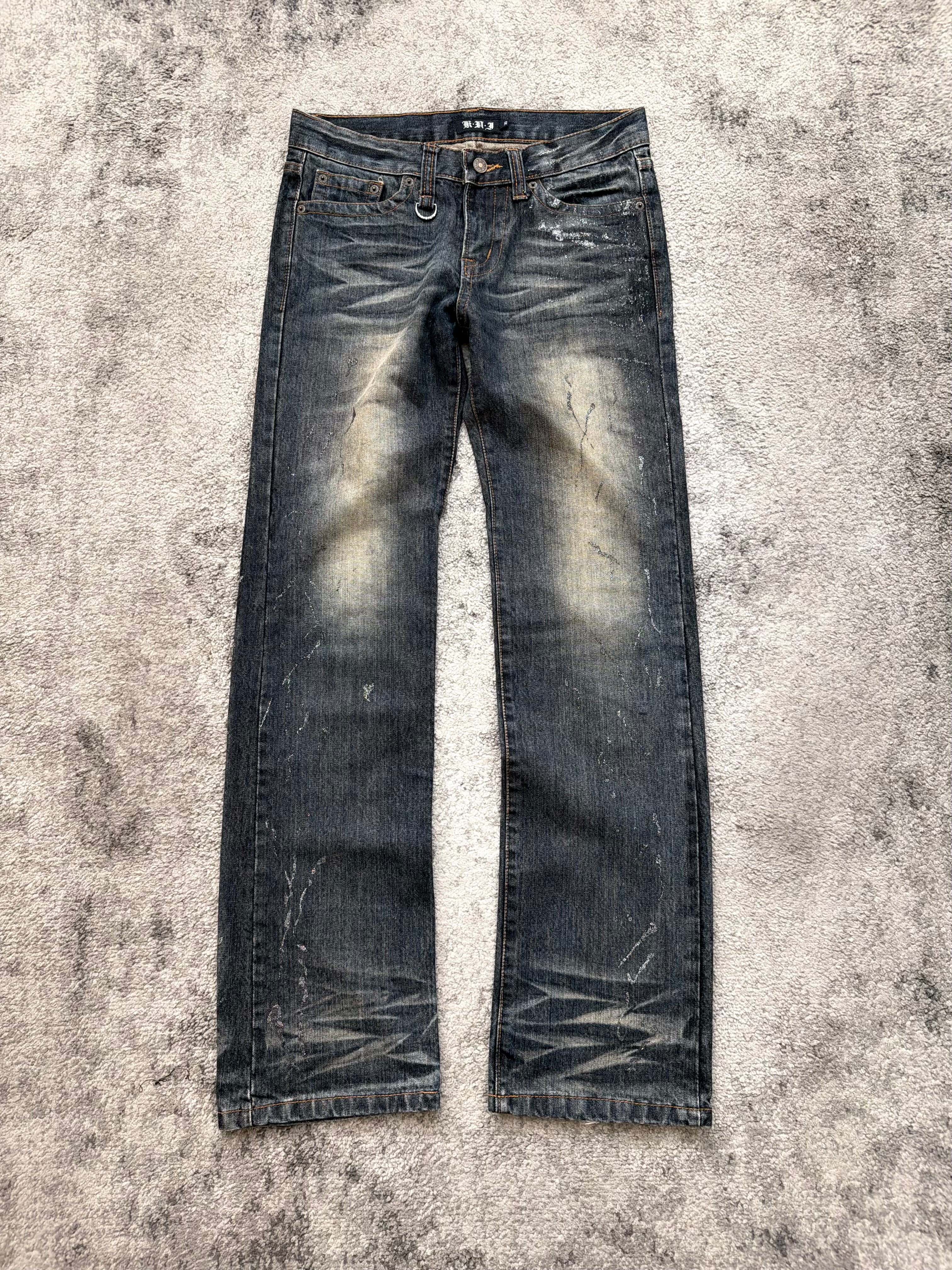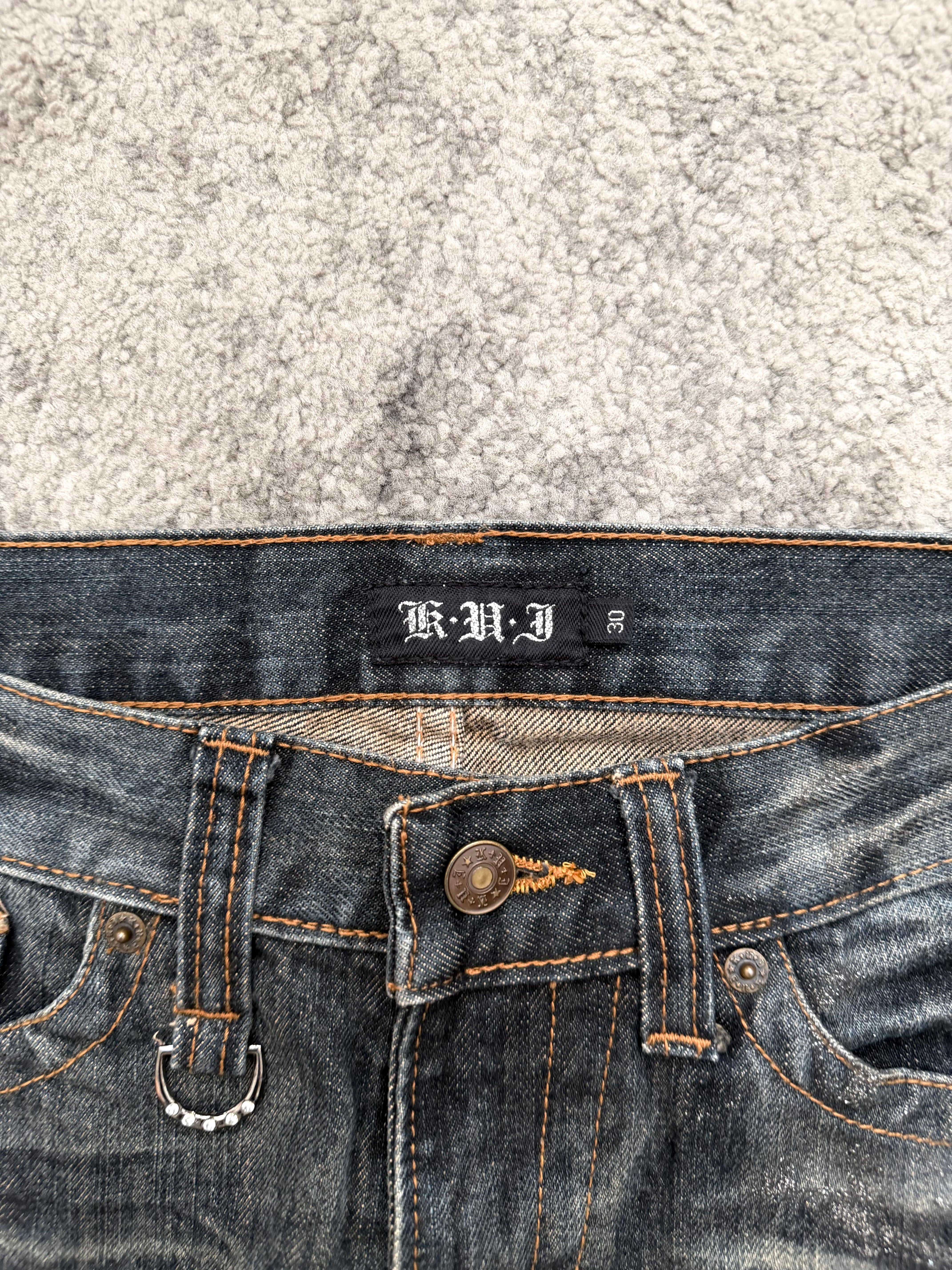 A hauntingly beautiful K.U.I Japan piece that captures the soul of early 2000s Tokyo street fashion. Faded, marked, and raw — this denim feels like it’s lived a life on stage and in the shadows.