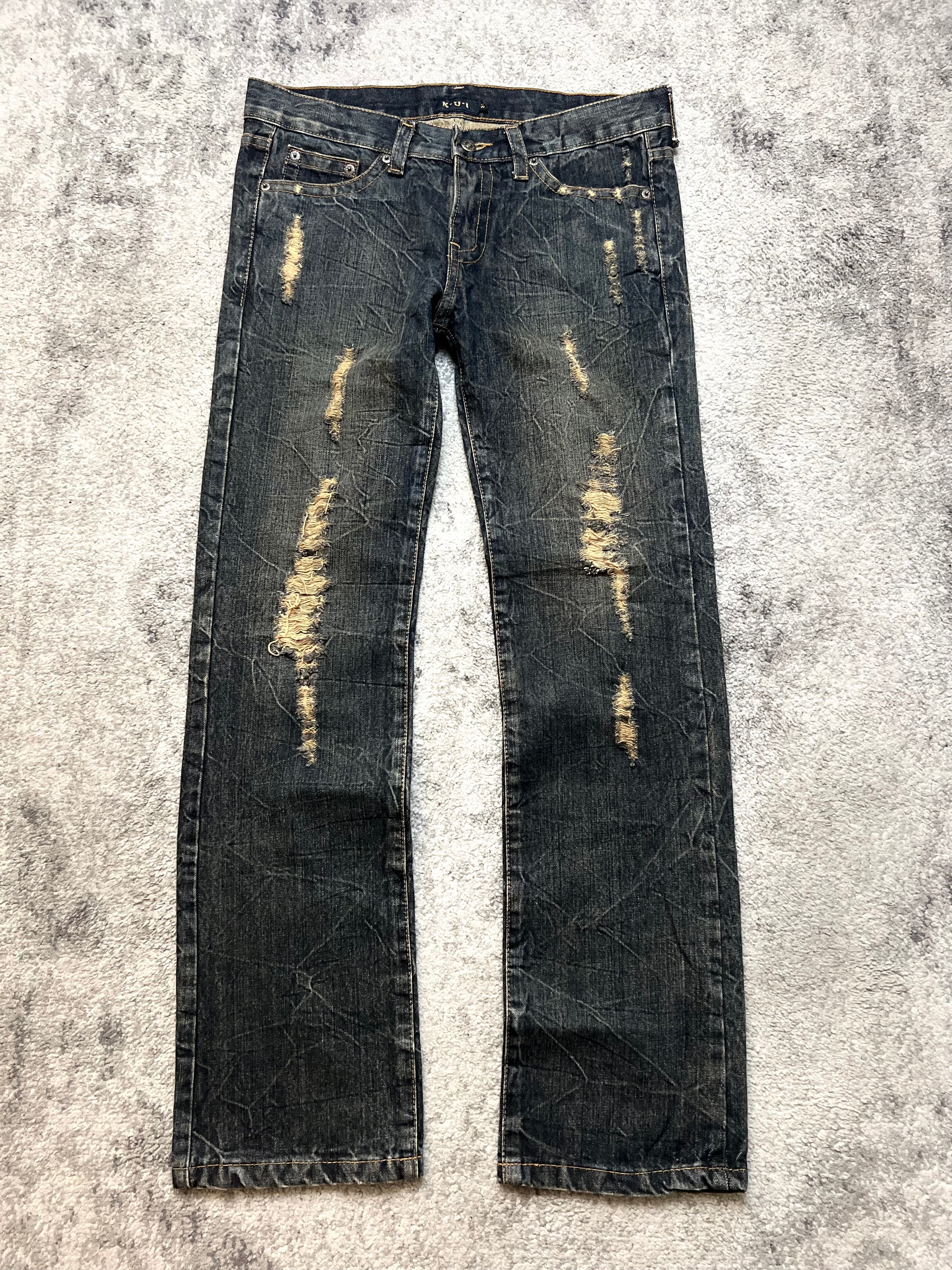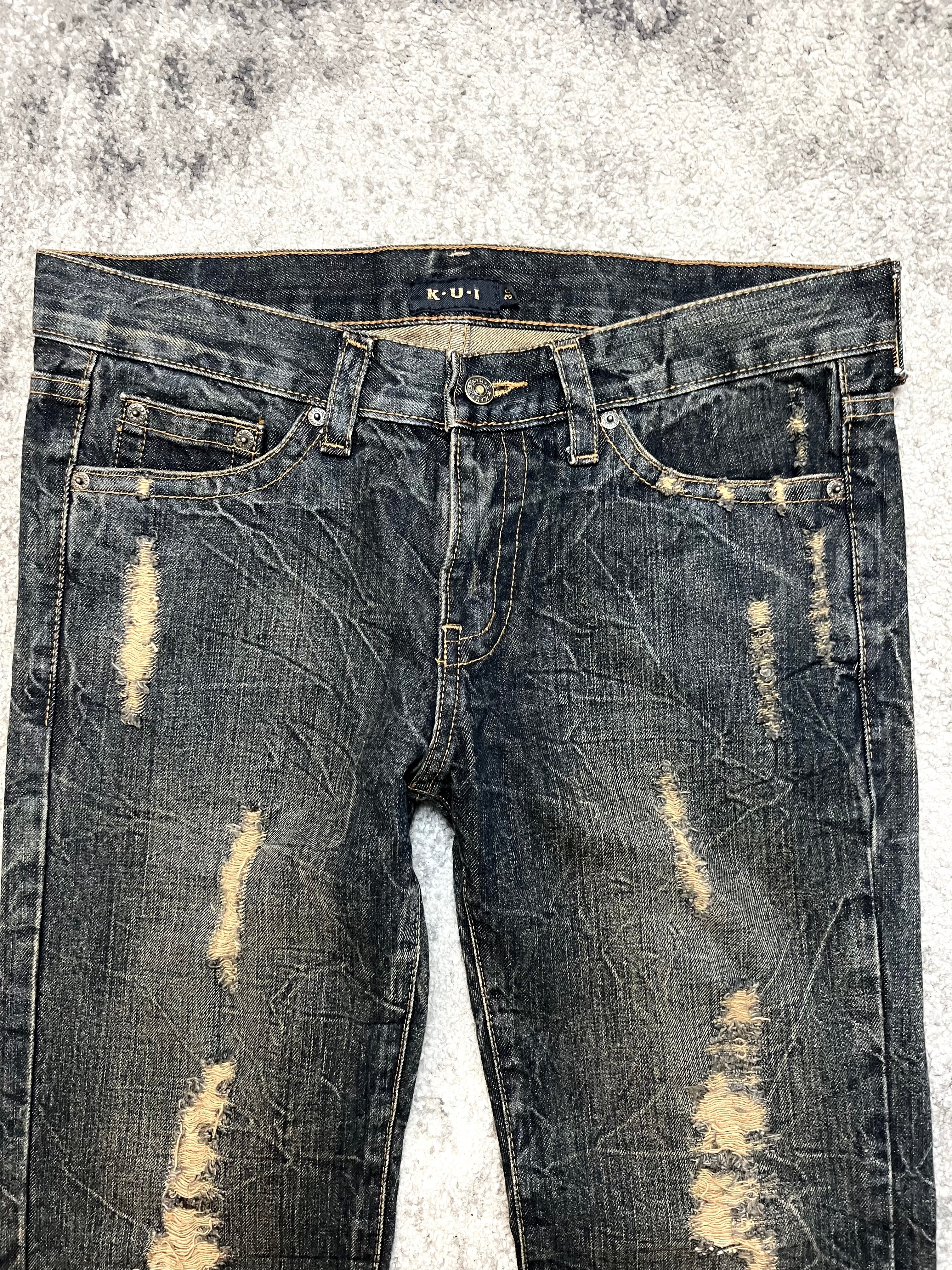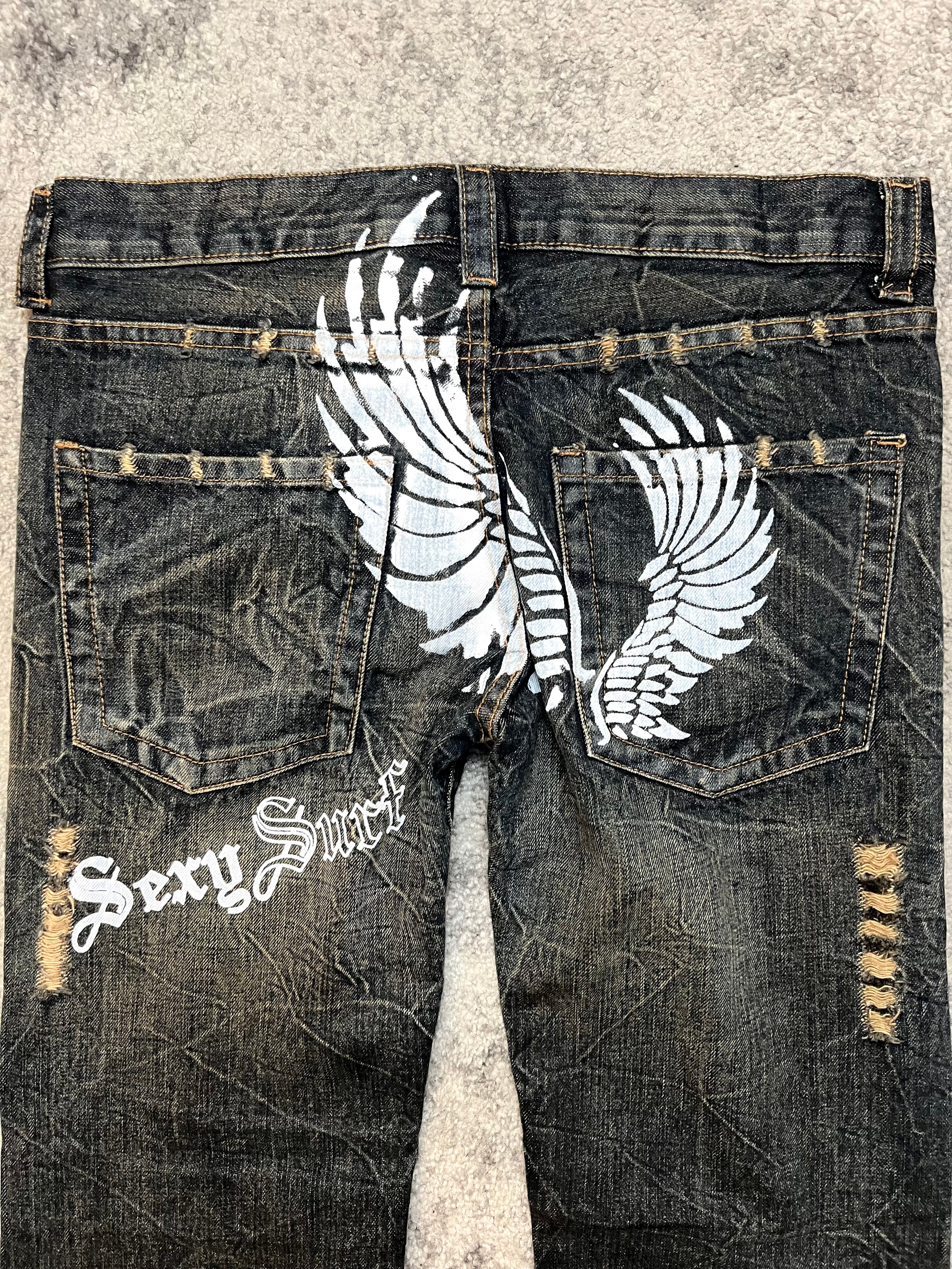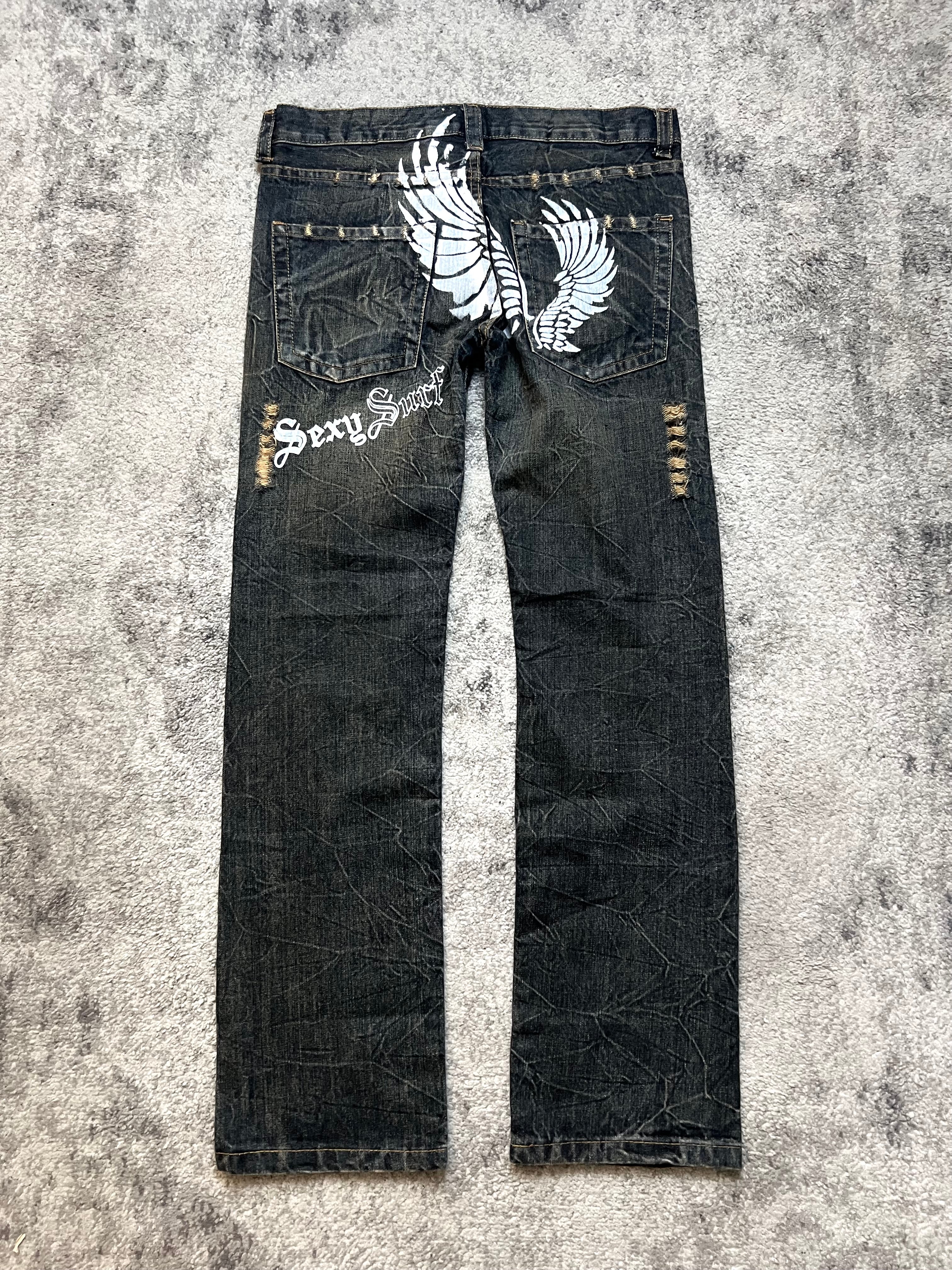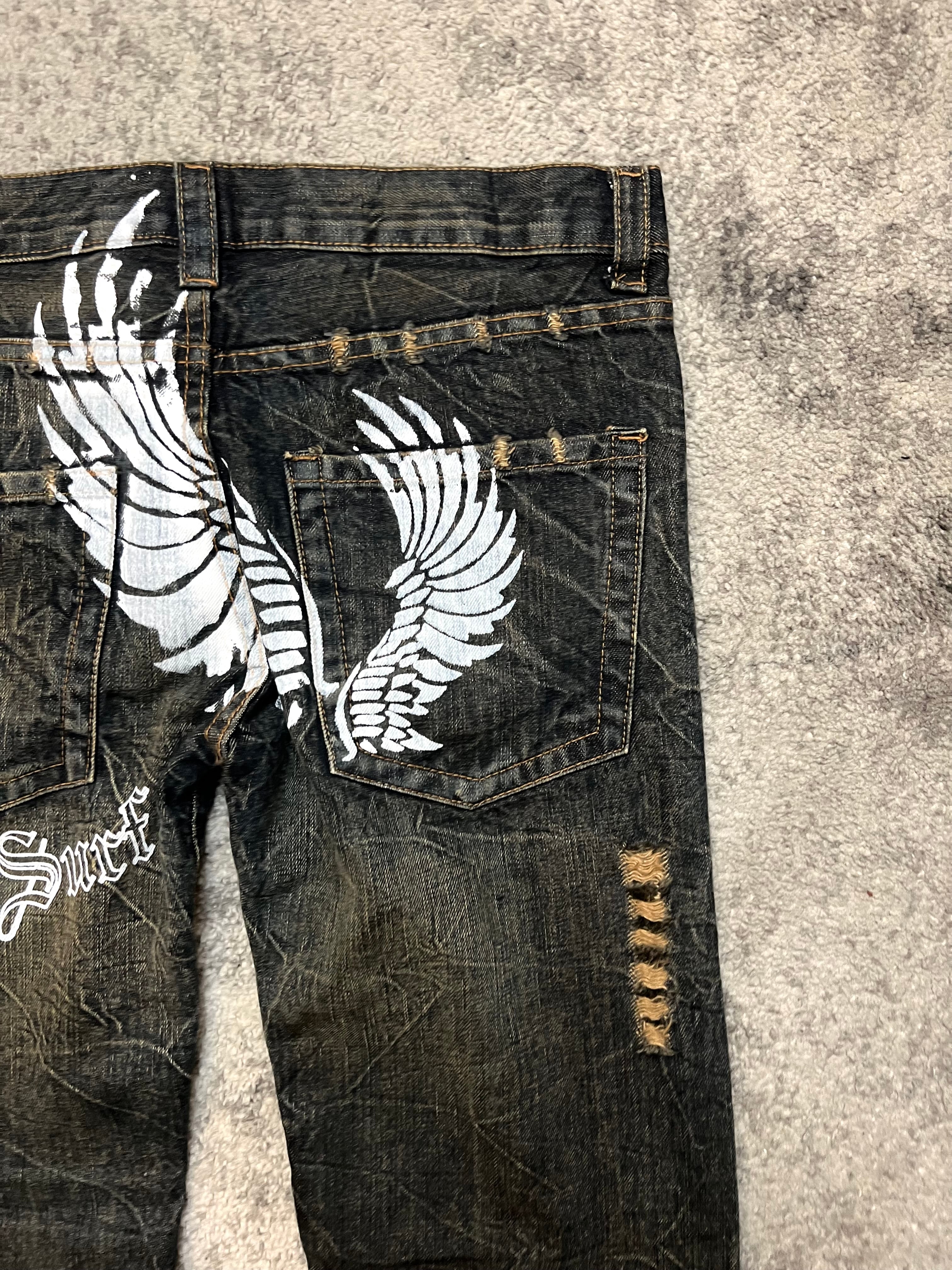 A rare piece from K.U.I, blending the rebellious energy of 2000s Japanese streetwear with bold gothic detailing. The washed black denim carries deep whiskering and heavy distressing, giving it that raw, lived-in character. On the back, the striking white wing graphic and “Sexy Spirit” embroidery elevate the jeans into statement territory — dramatic yet refined.