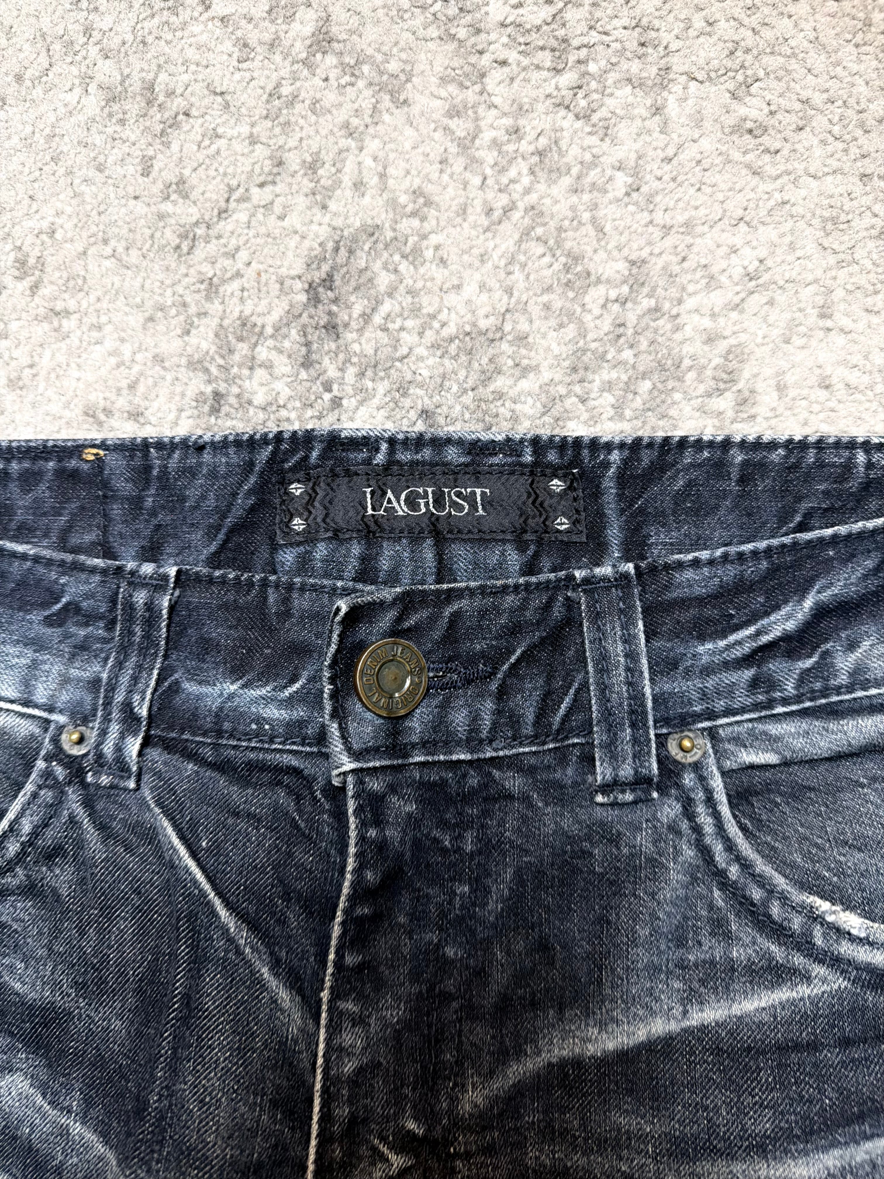 Details: Raw-cut hems, faded creasing on front + back, subtle distress marks, classic 5-pocket layout, LAGUST back patch.