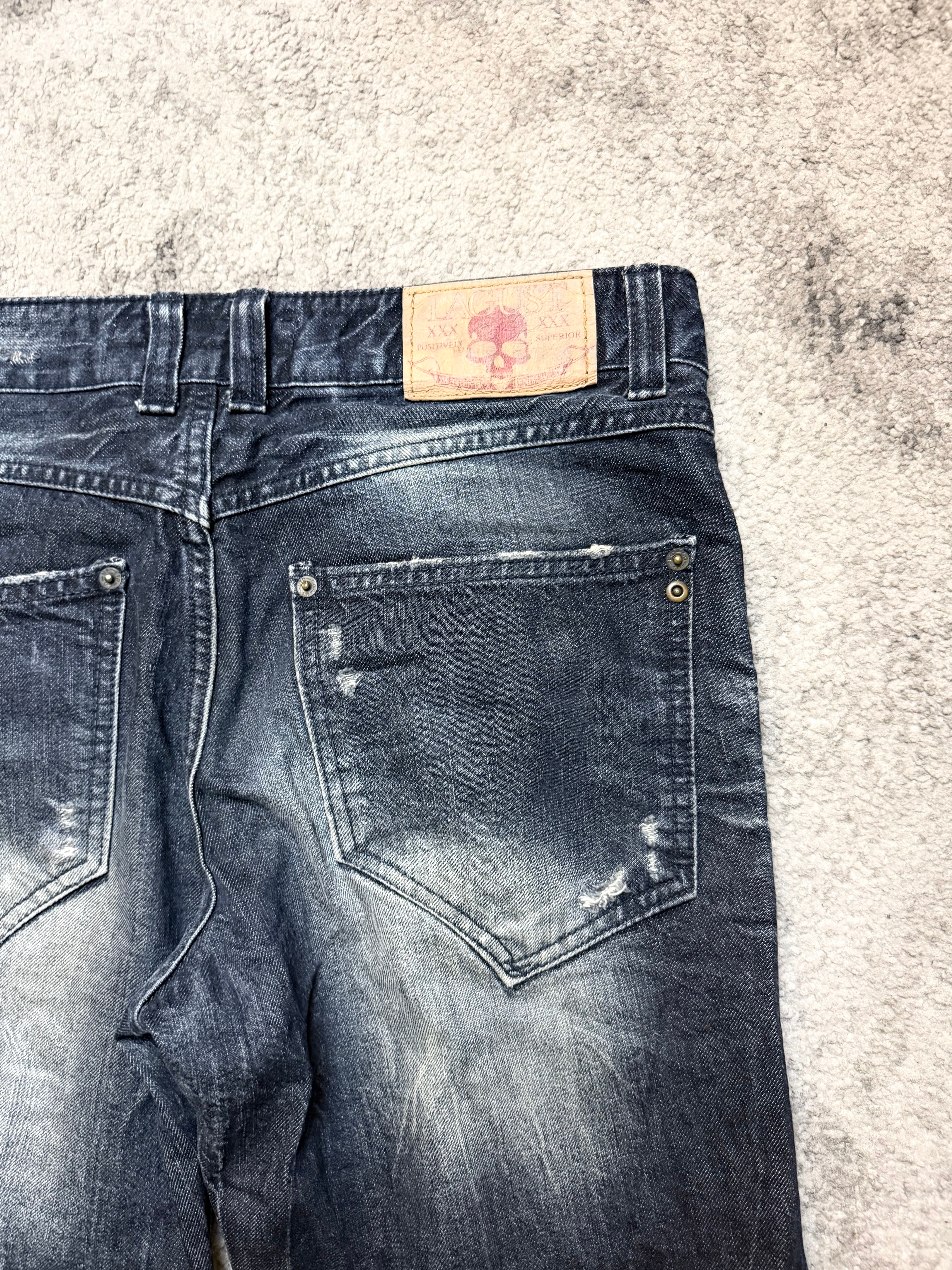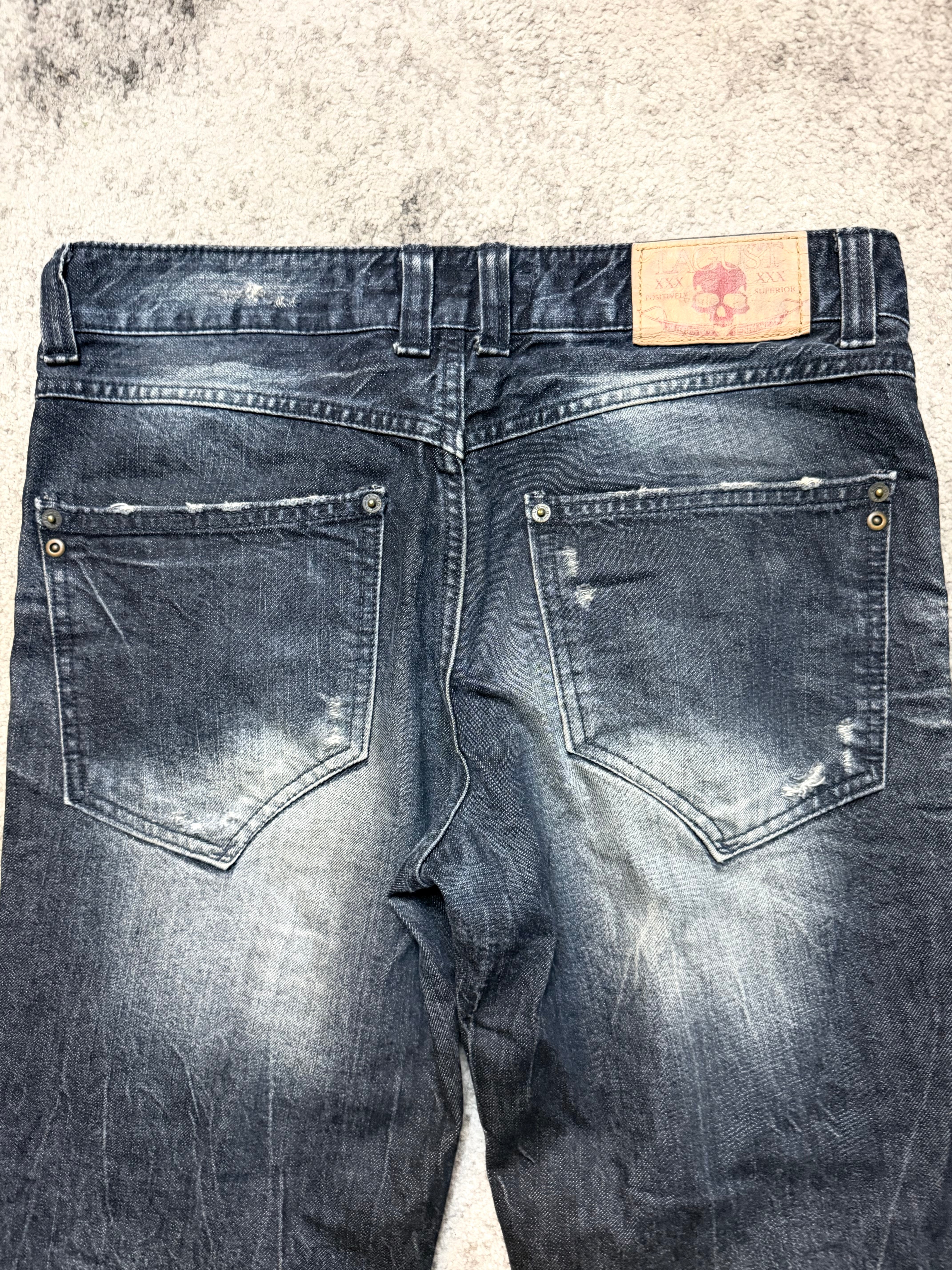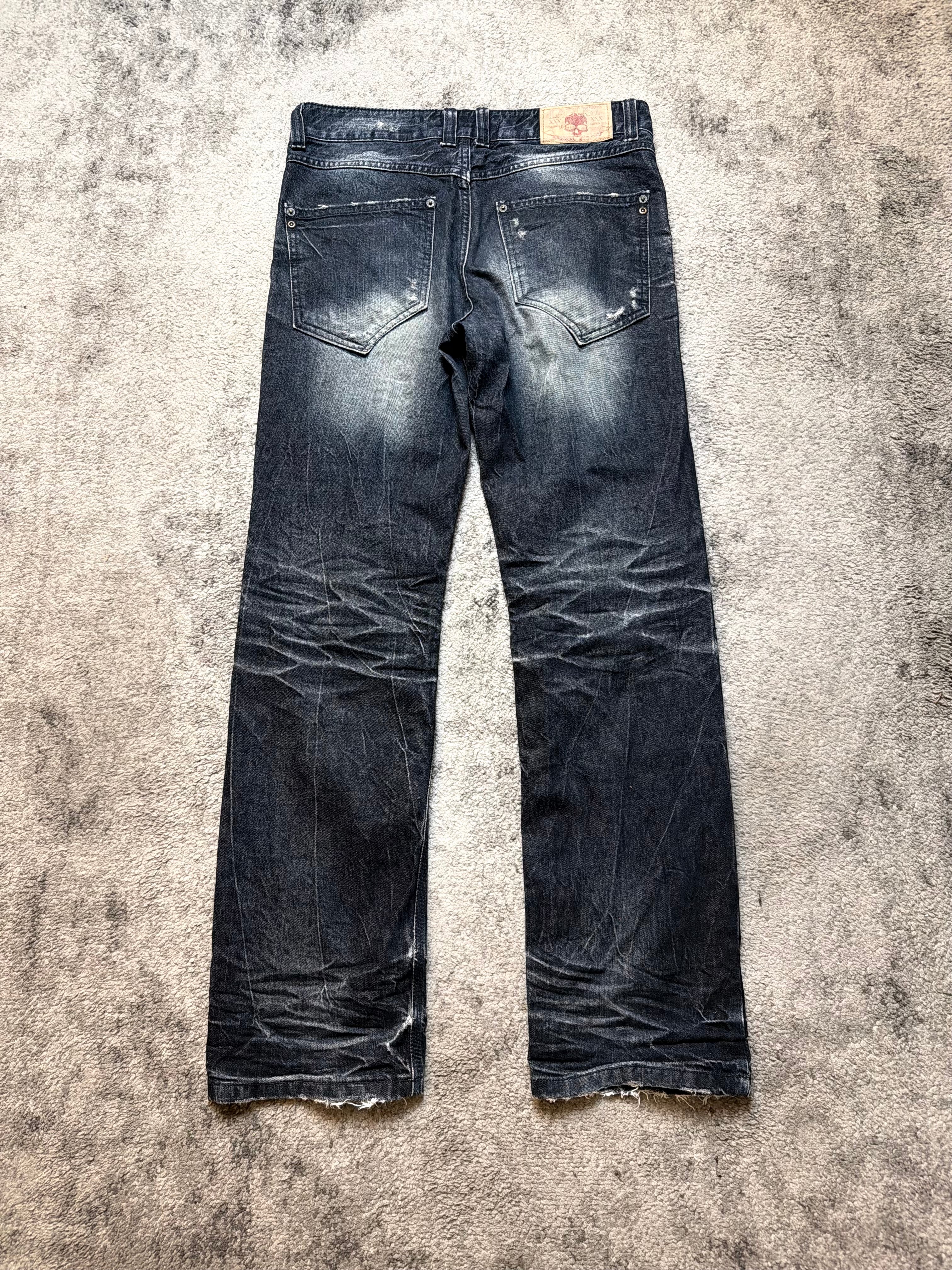 A pair of denim born from the darker corners of Japanese archive aesthetics — raw, lived-in, and effortlessly cool. This LAGUST piece carries that unmistakable underground energy: a deep, ink-washed indigo base with heavy vintage fading, natural whiskering, and rough distressing that feels authentic rather than over-designed.
