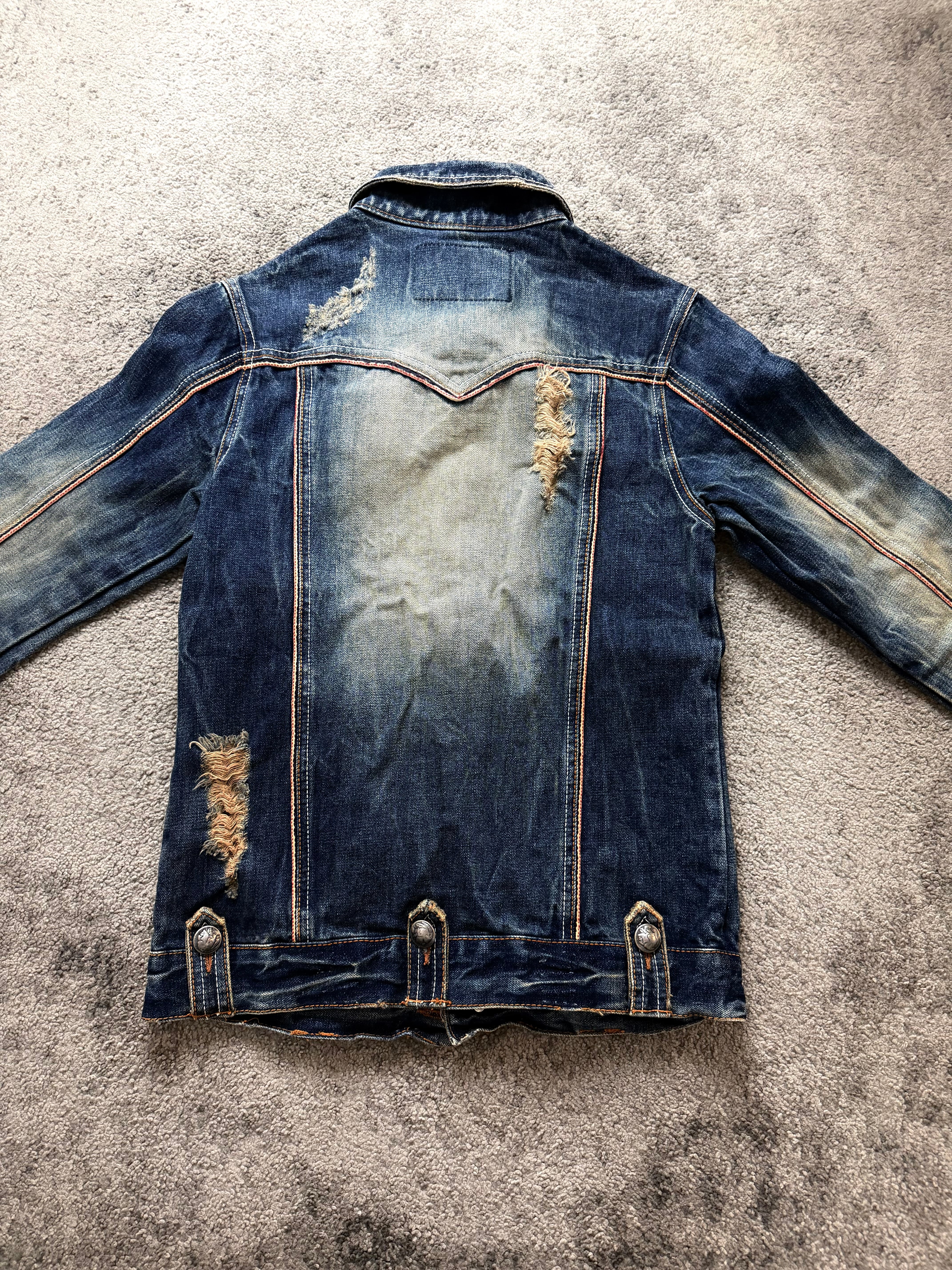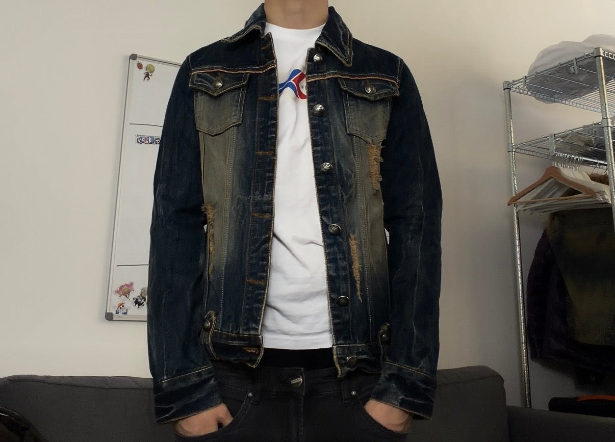 This jacket feels like it’s already been on stage. The fading, the destruction, the structure — everything hits. Not just denim, but presence.