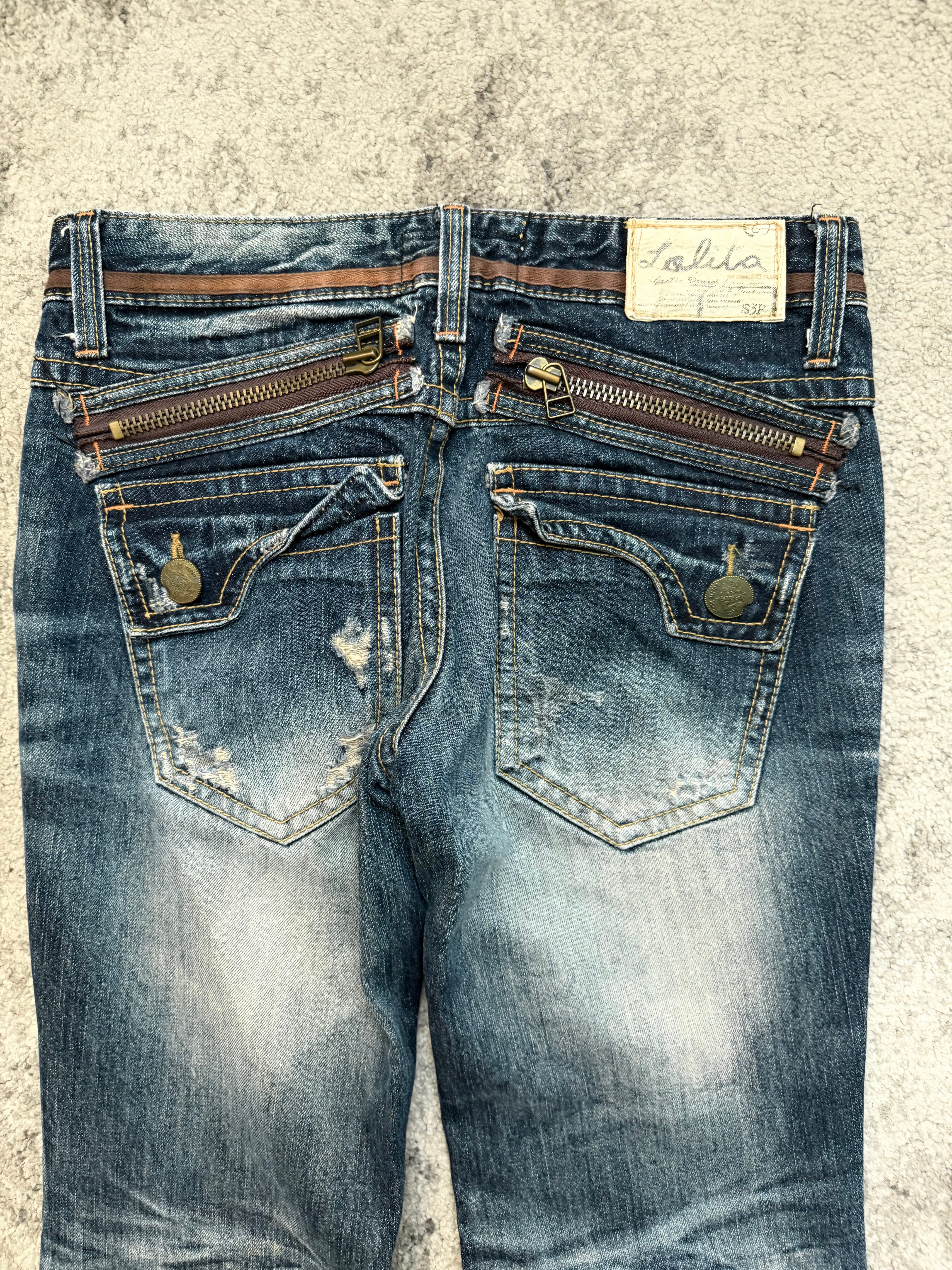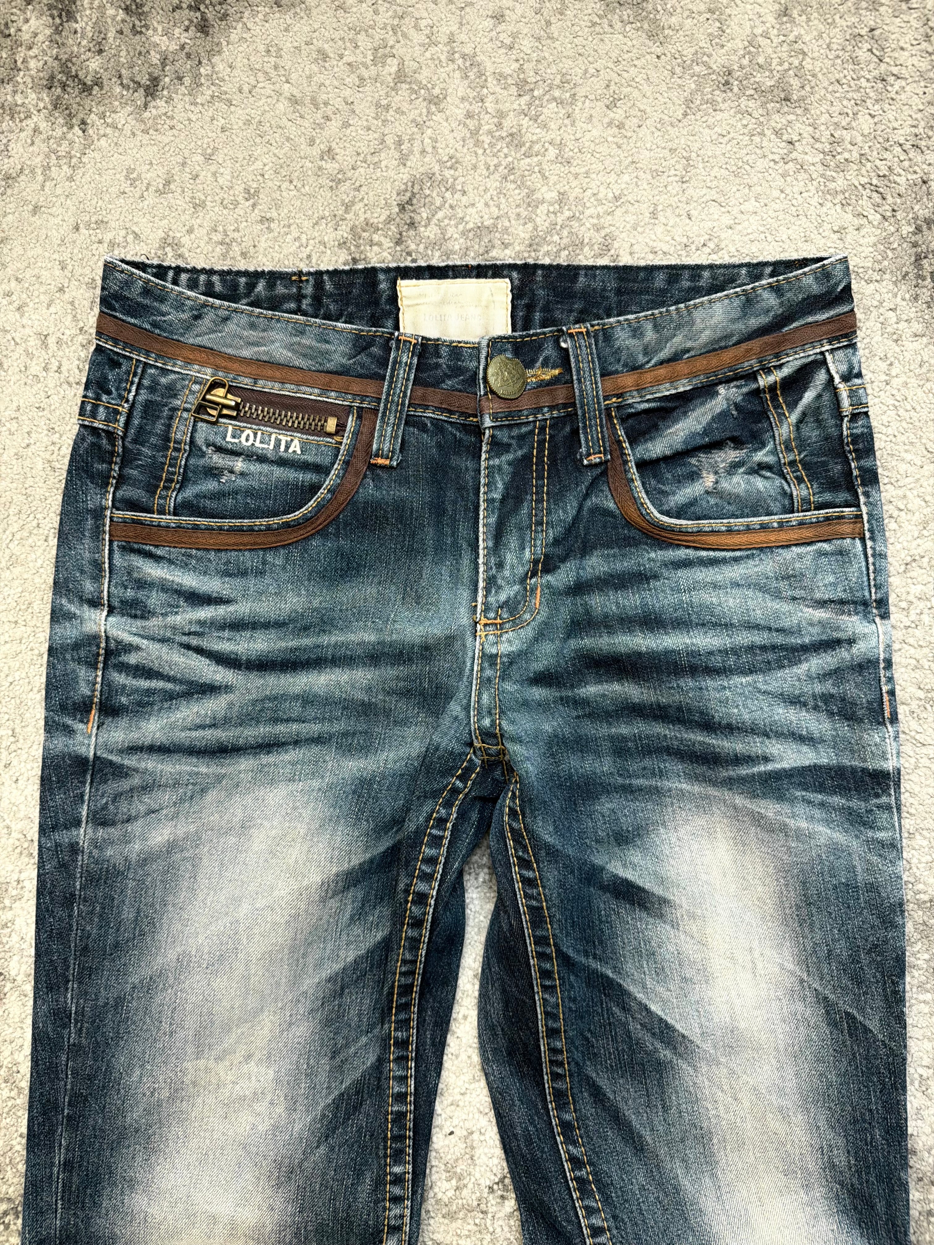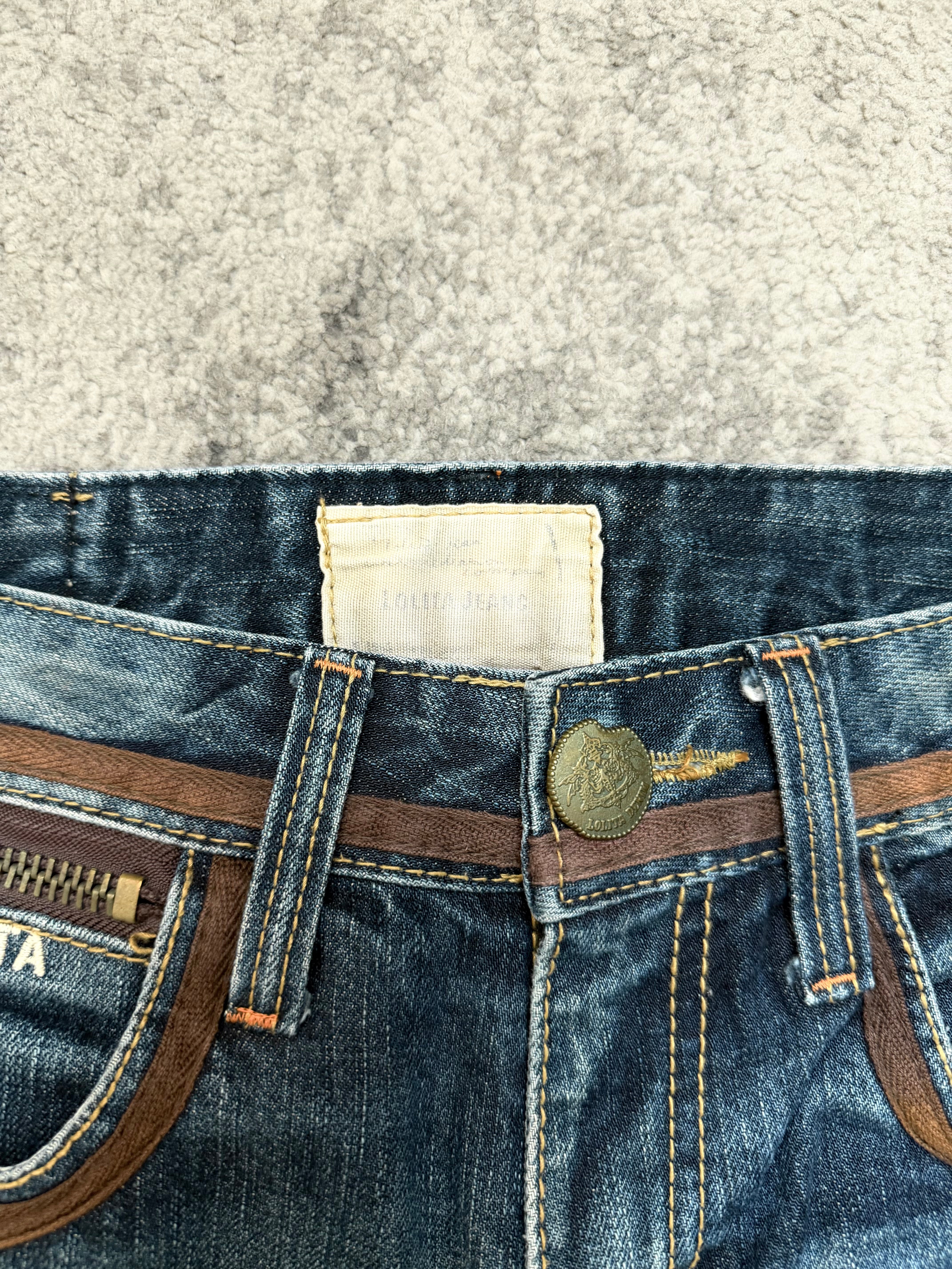 From Japan’s LOLITA line, this piece radiates that early-2000s host energy – sleek, confident, and unbothered. Faded indigo meets caramel stitching and zipper-backed details for a look that’s equal parts chaos and control.