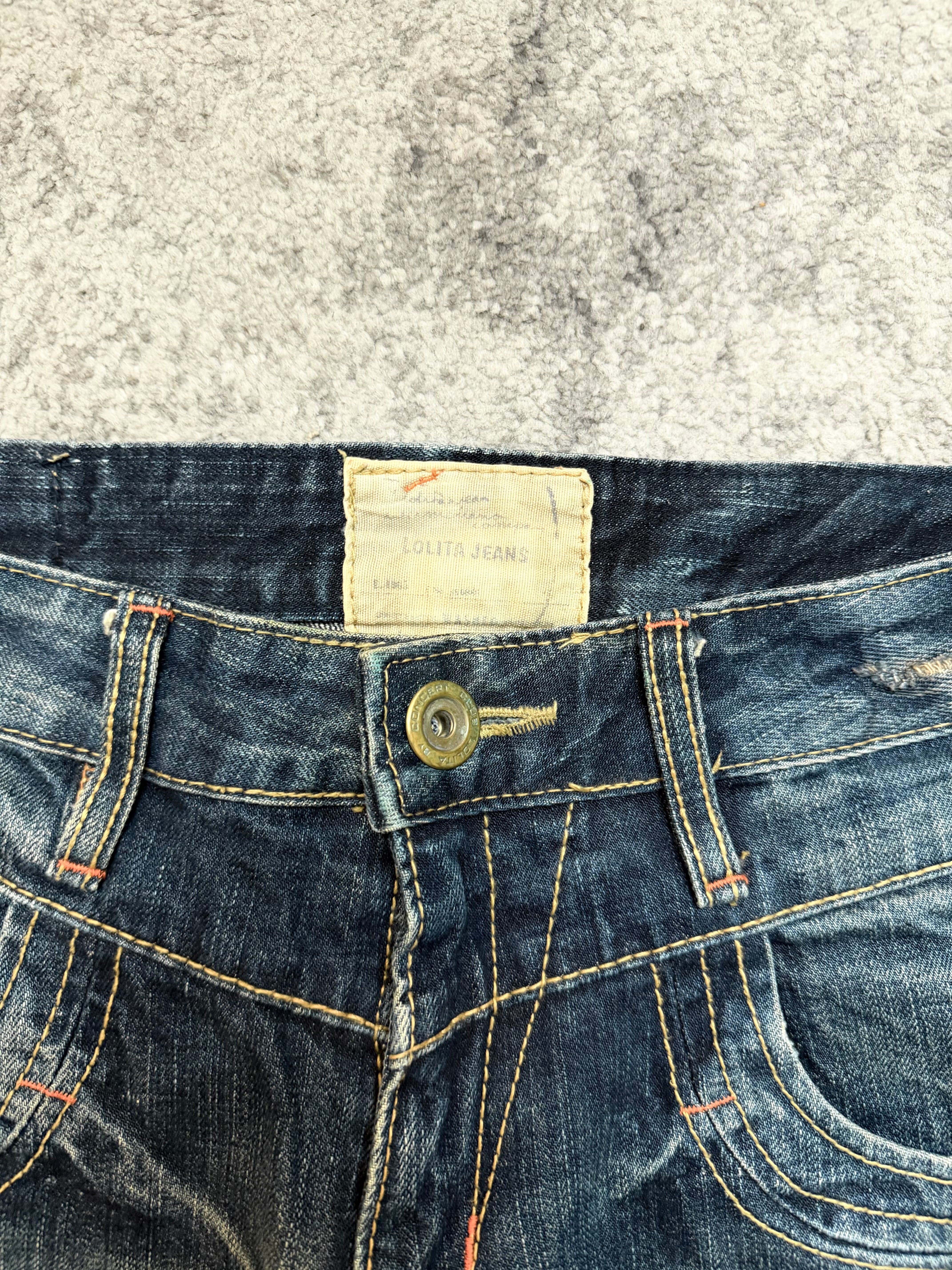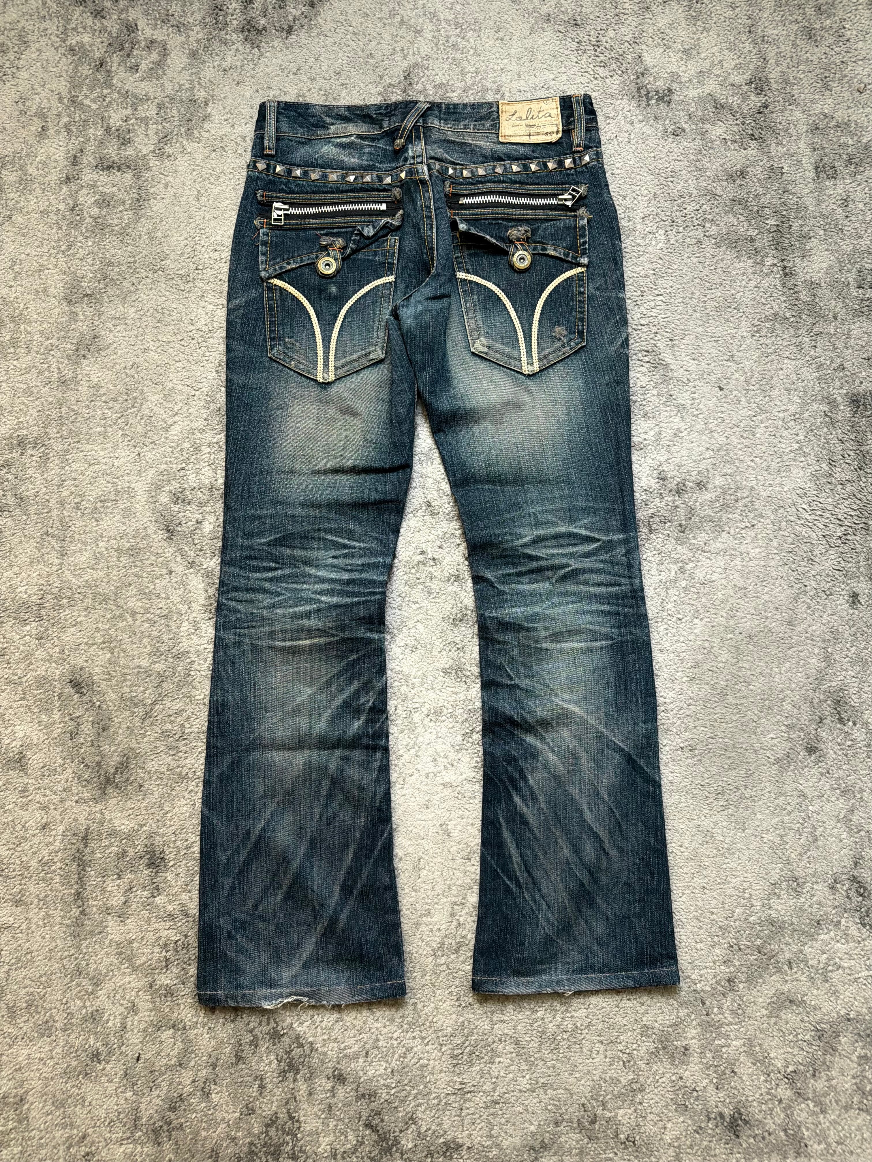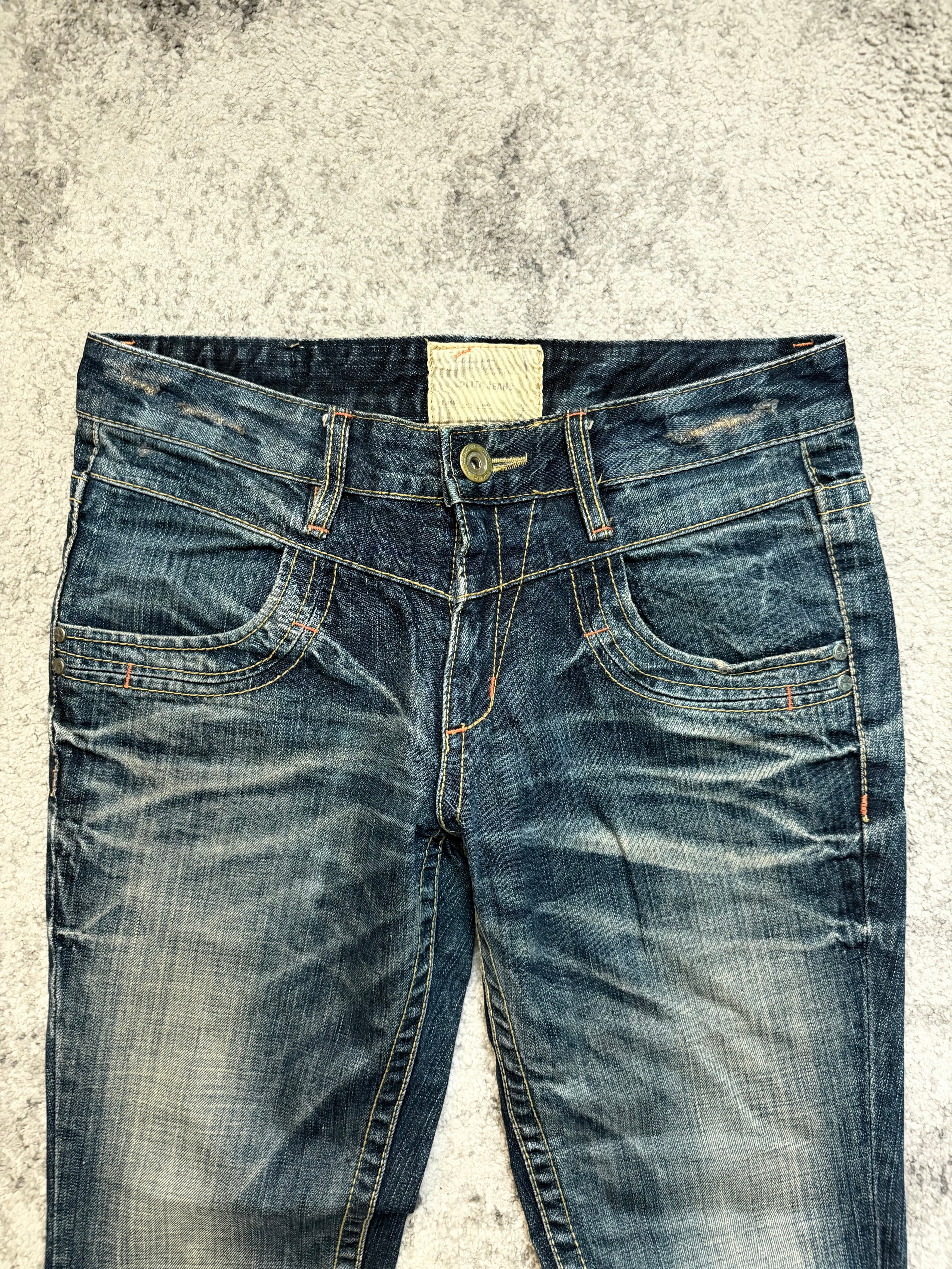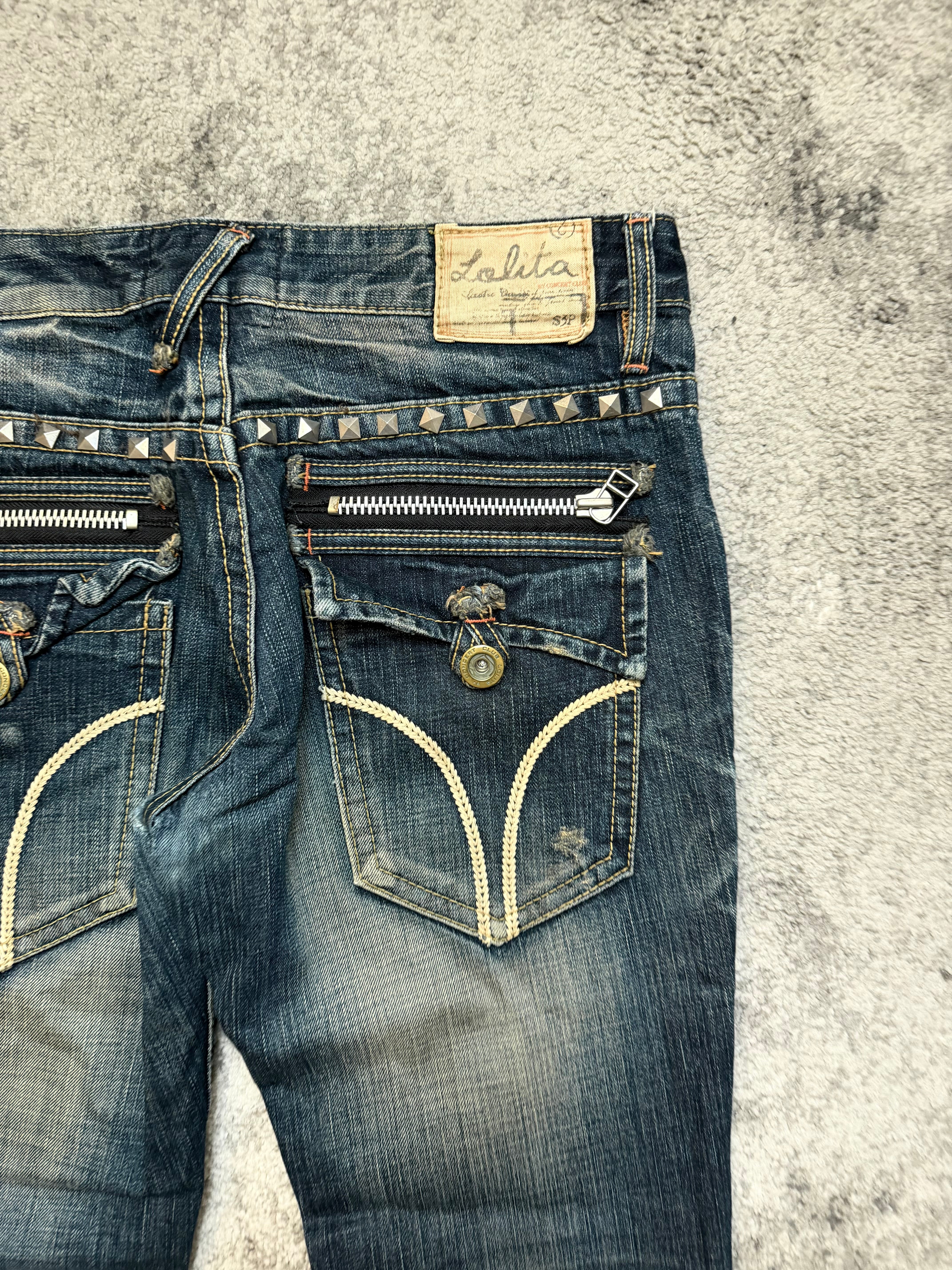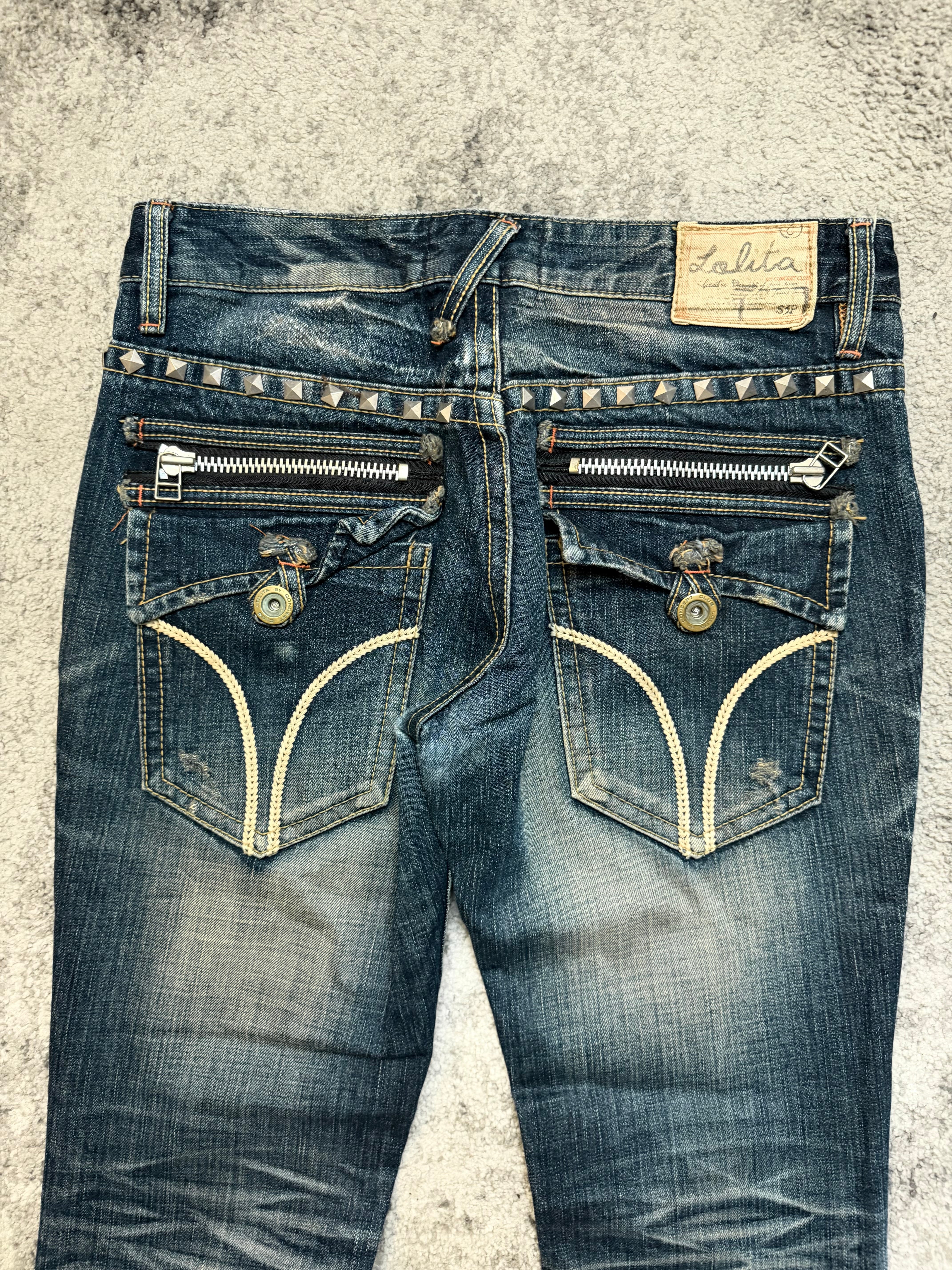 From Japan’s LOLITA label, this pair channels pure Y2K decadence — a mix of host-core sensuality and underground cool. The fading, creasing, and studded details feel alive, like a memory of loud nights and quiet mornings.