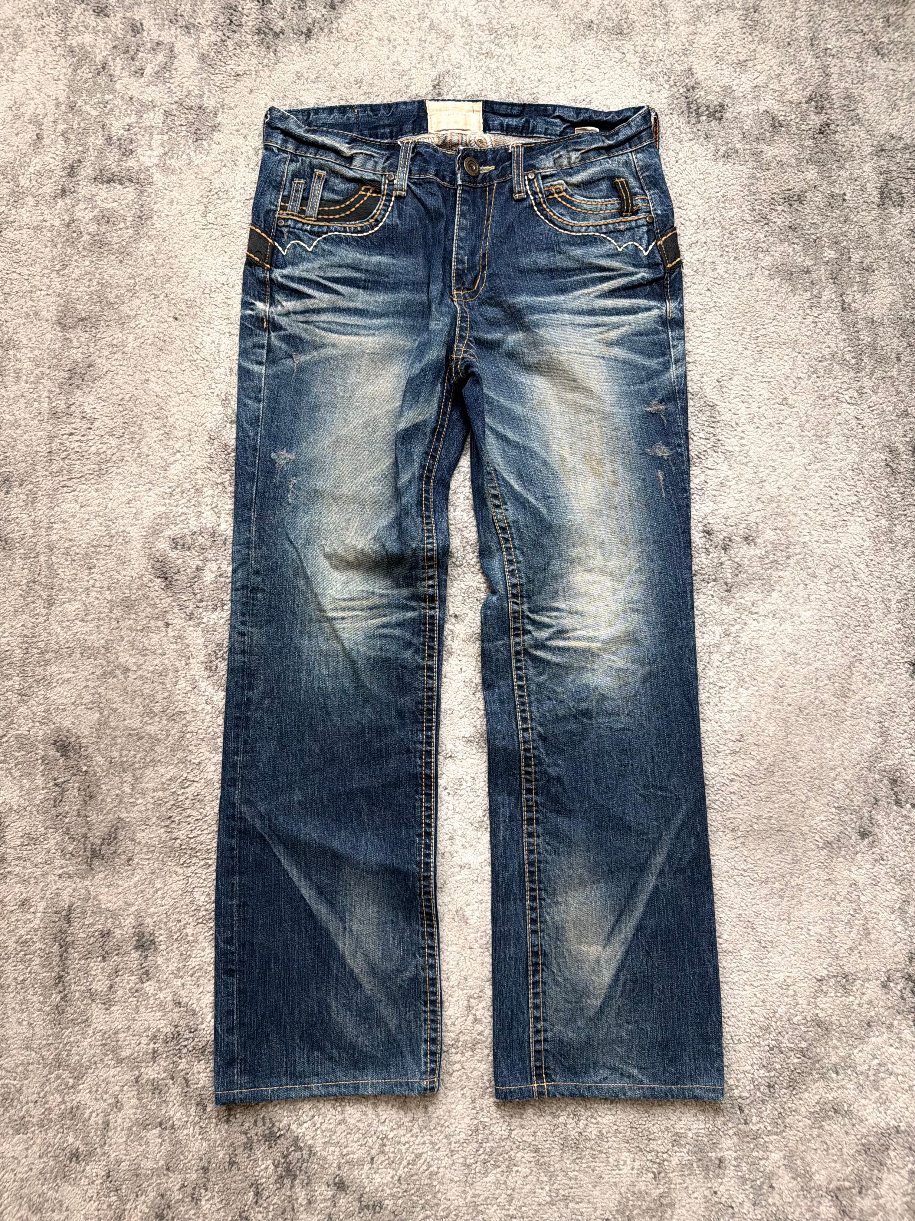 Crafted from mid-weight Japanese indigo denim with deep vintage fading, honeycomb whiskers, and signature contrast stitching. The standout feature — dramatic embroidered back detailing and curved pocket lines — channels that unmistakable Y2K denim rebellion.