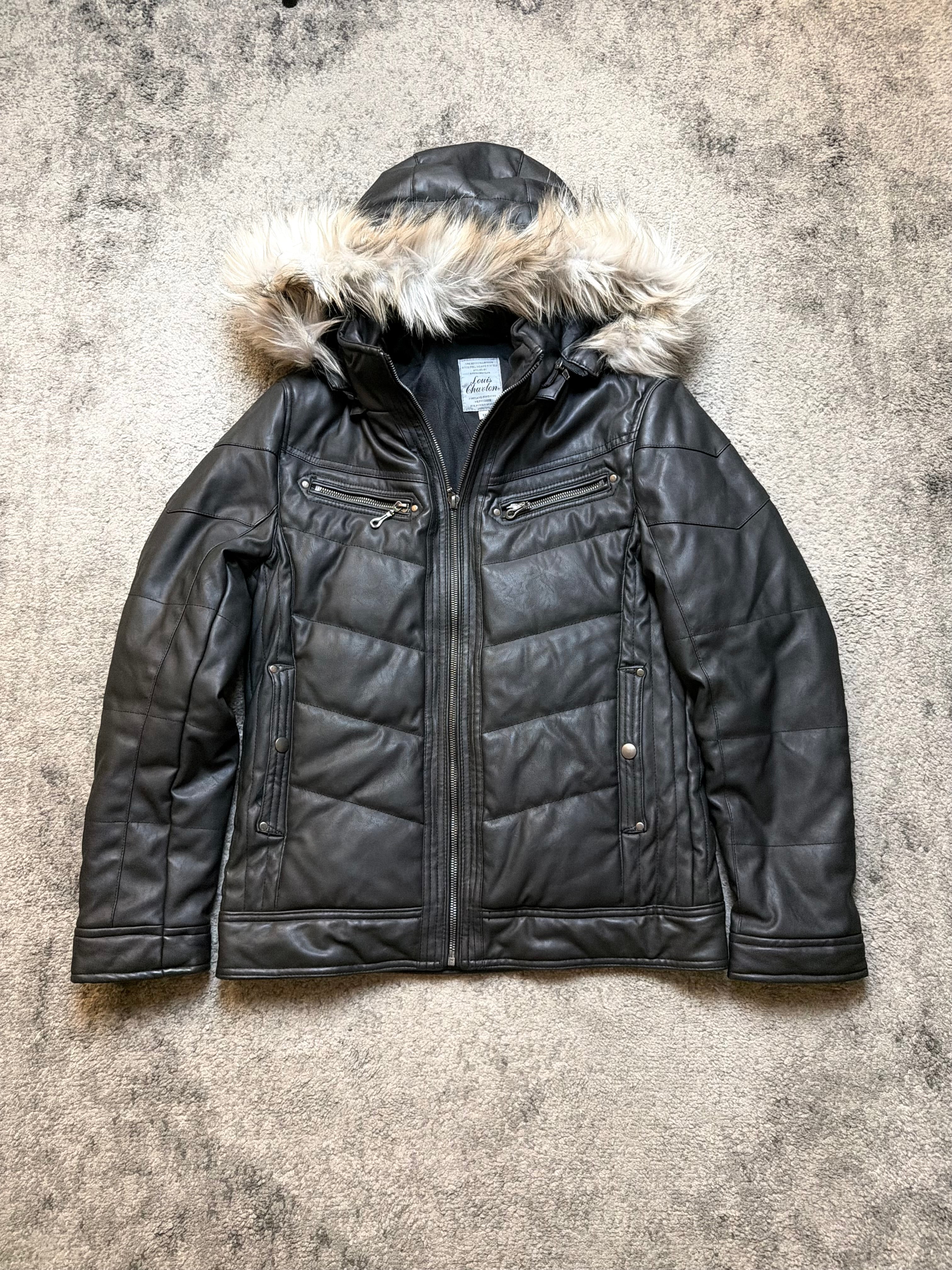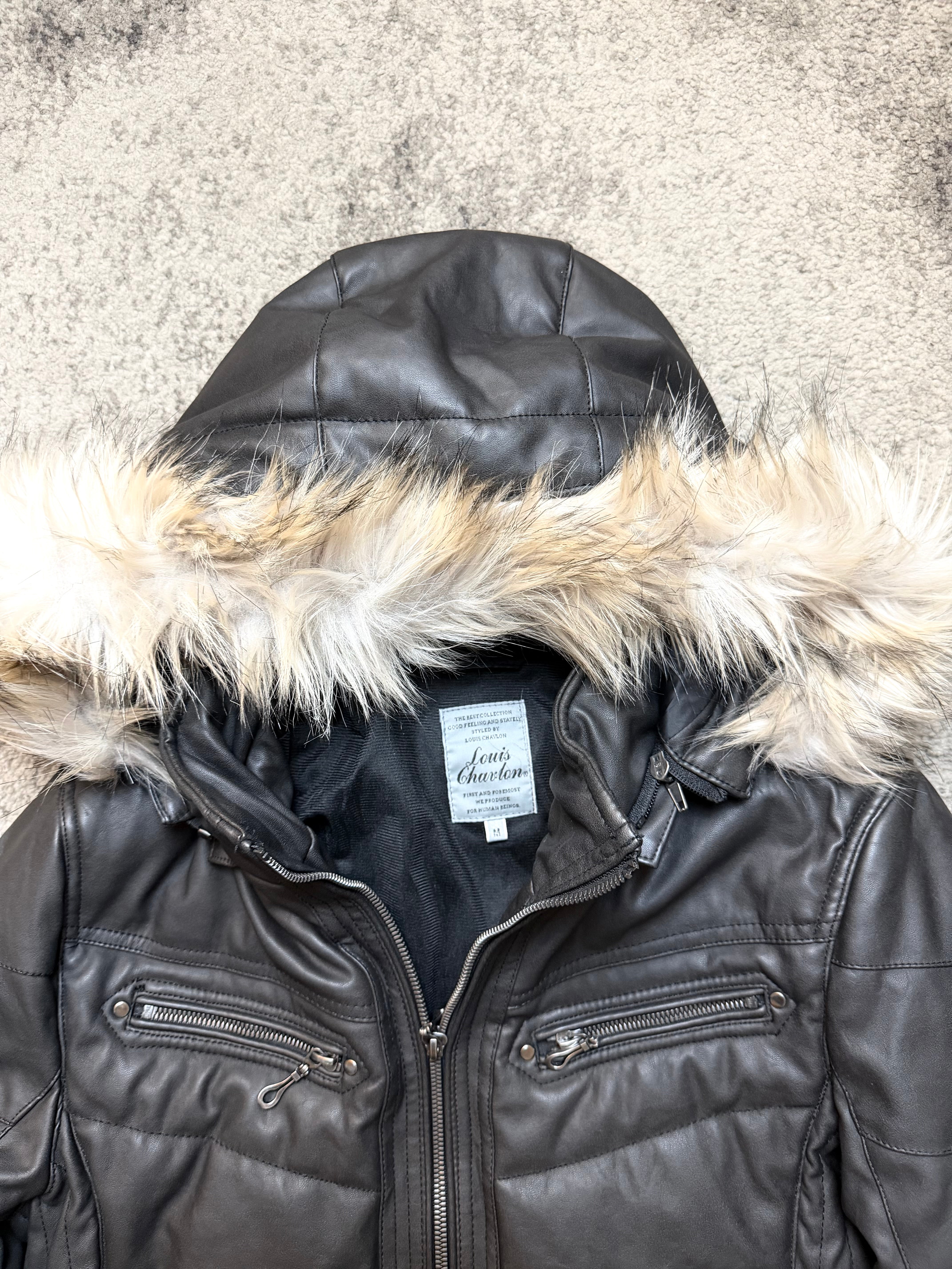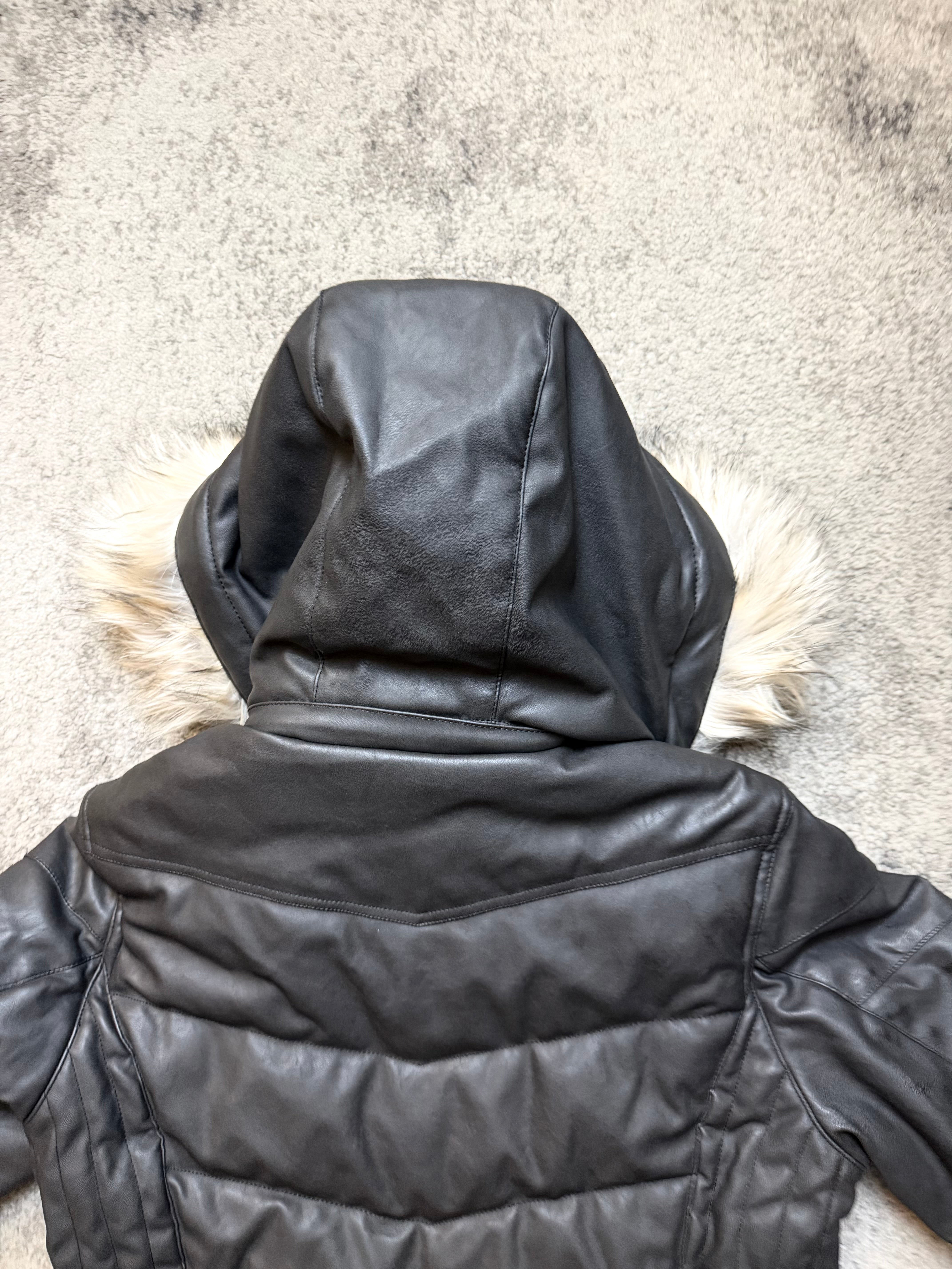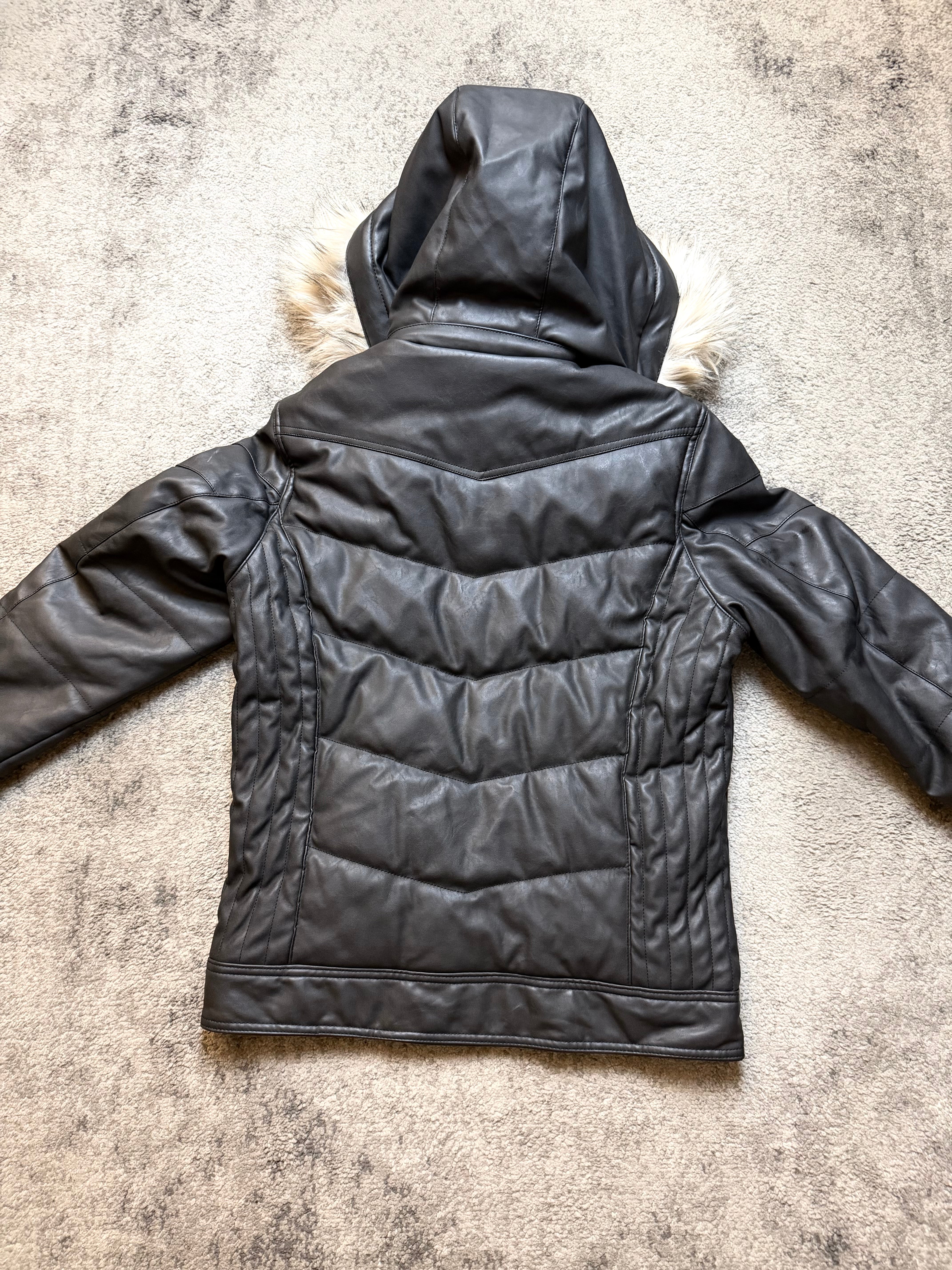 Material: Matte black faux-leather shell with padded quilting. Faux-fur trim on the hood — warm, dramatic, effortless. Smooth interior lining for everyday comfort.
