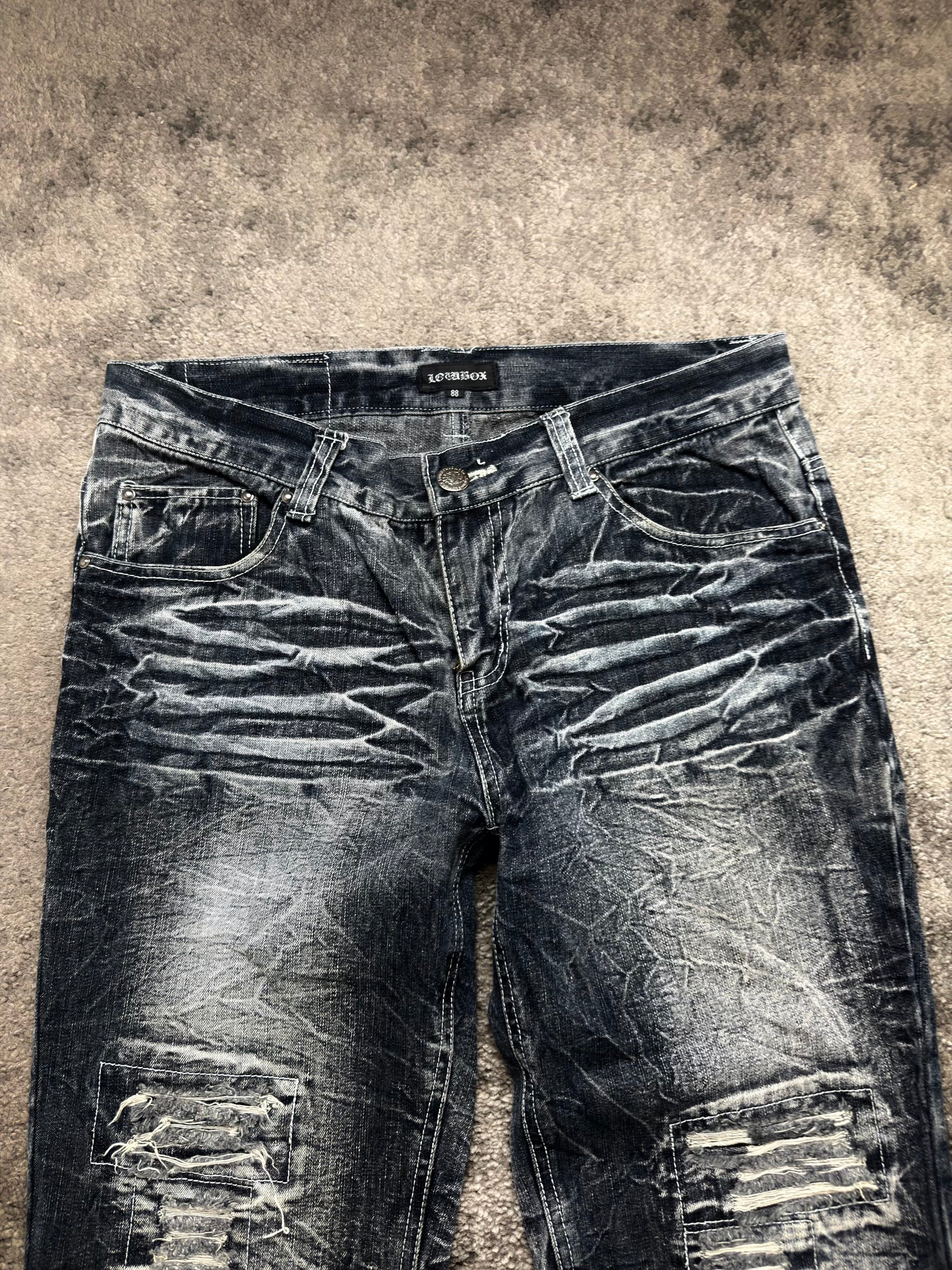 LOWBOX “Midnight Damage” Archive Denim – chaos carved into black. This pair feels straight out of the raw side of Japanese archive fashion. Deep black denim layered with heavy whiskering and aggressive distress panels that give it that worn-in rock energy. LOWBOX leans fully into the rebellious aesthetic – denim that looks like it survived late nights and loud music.