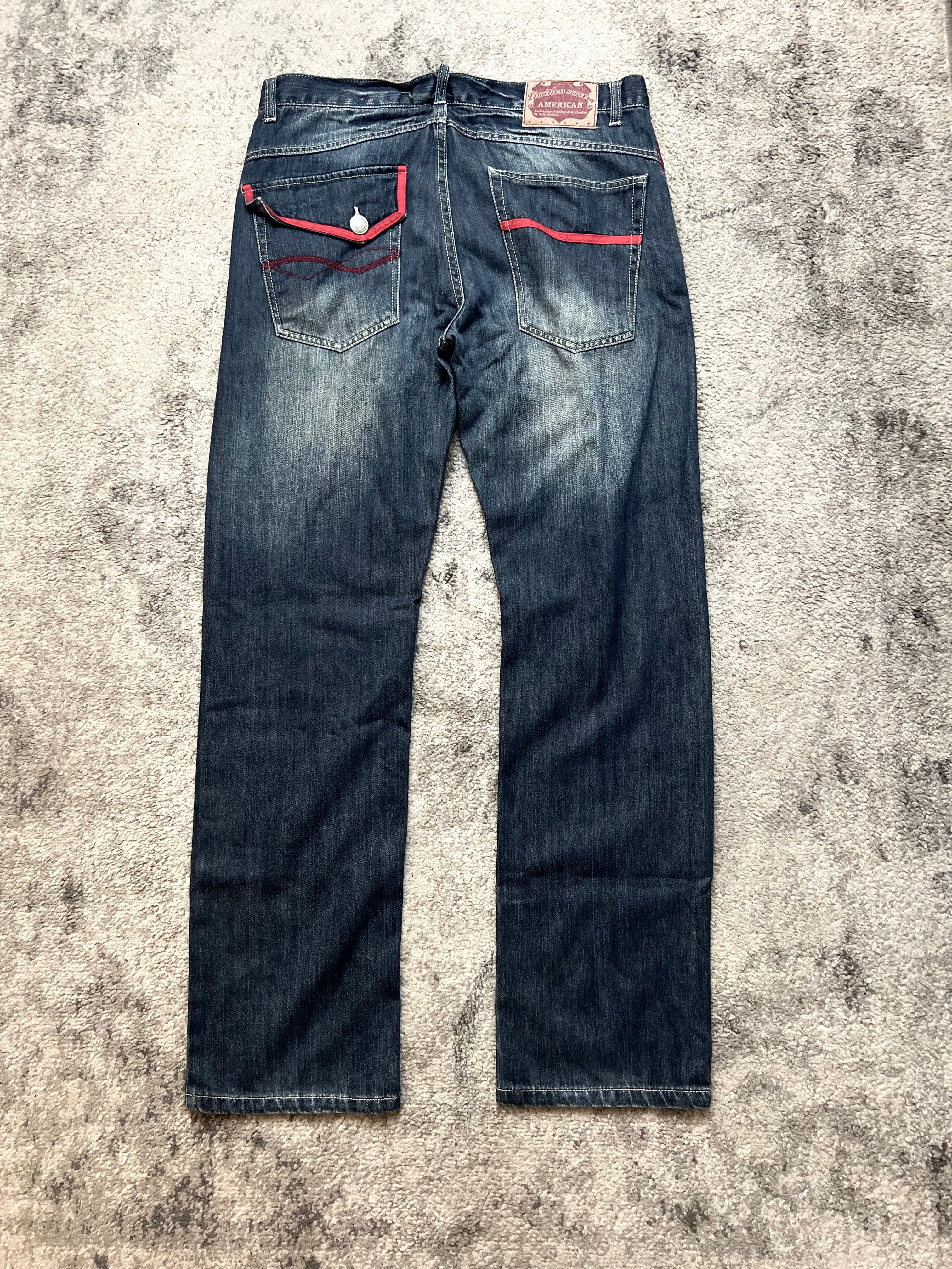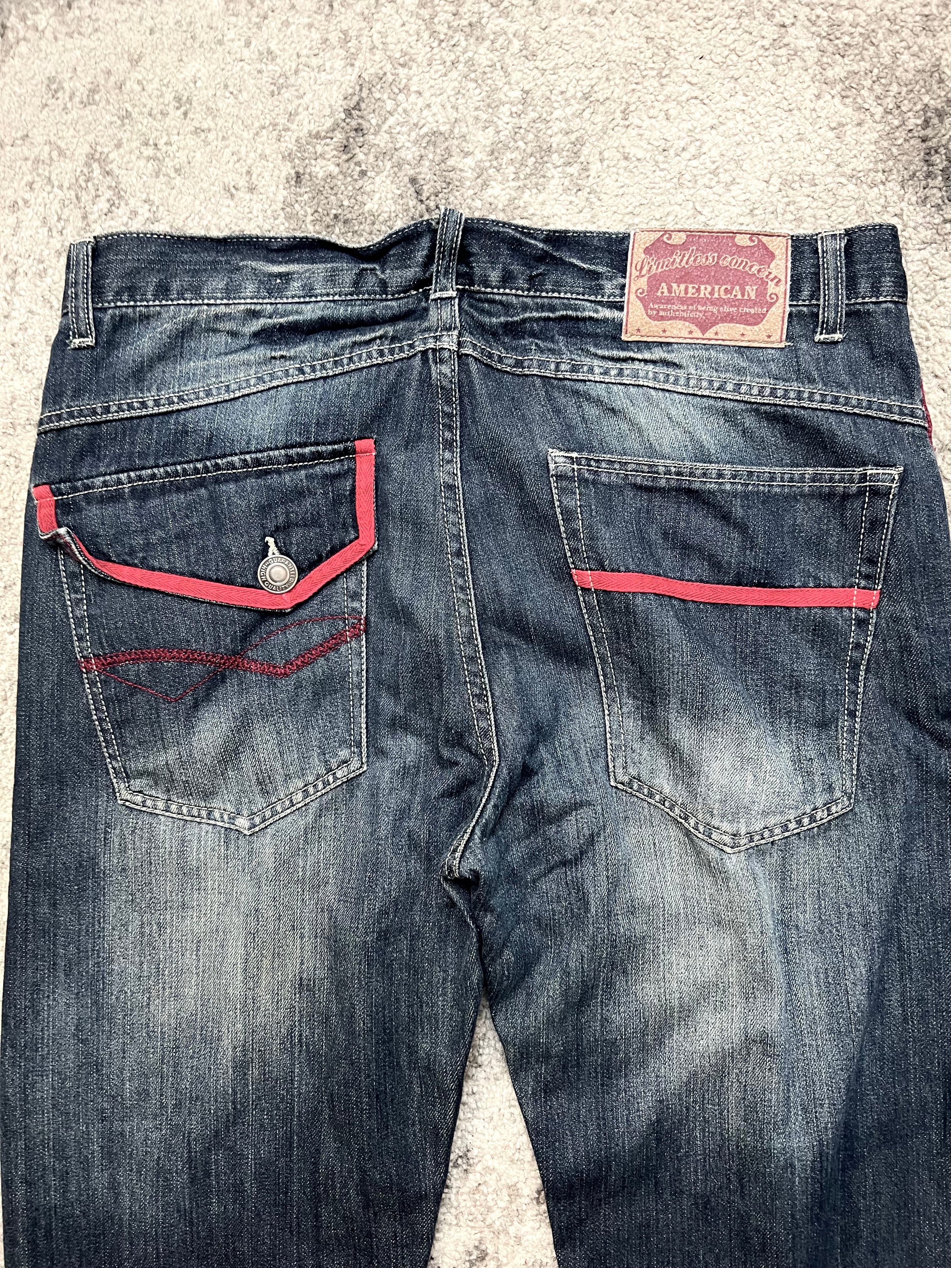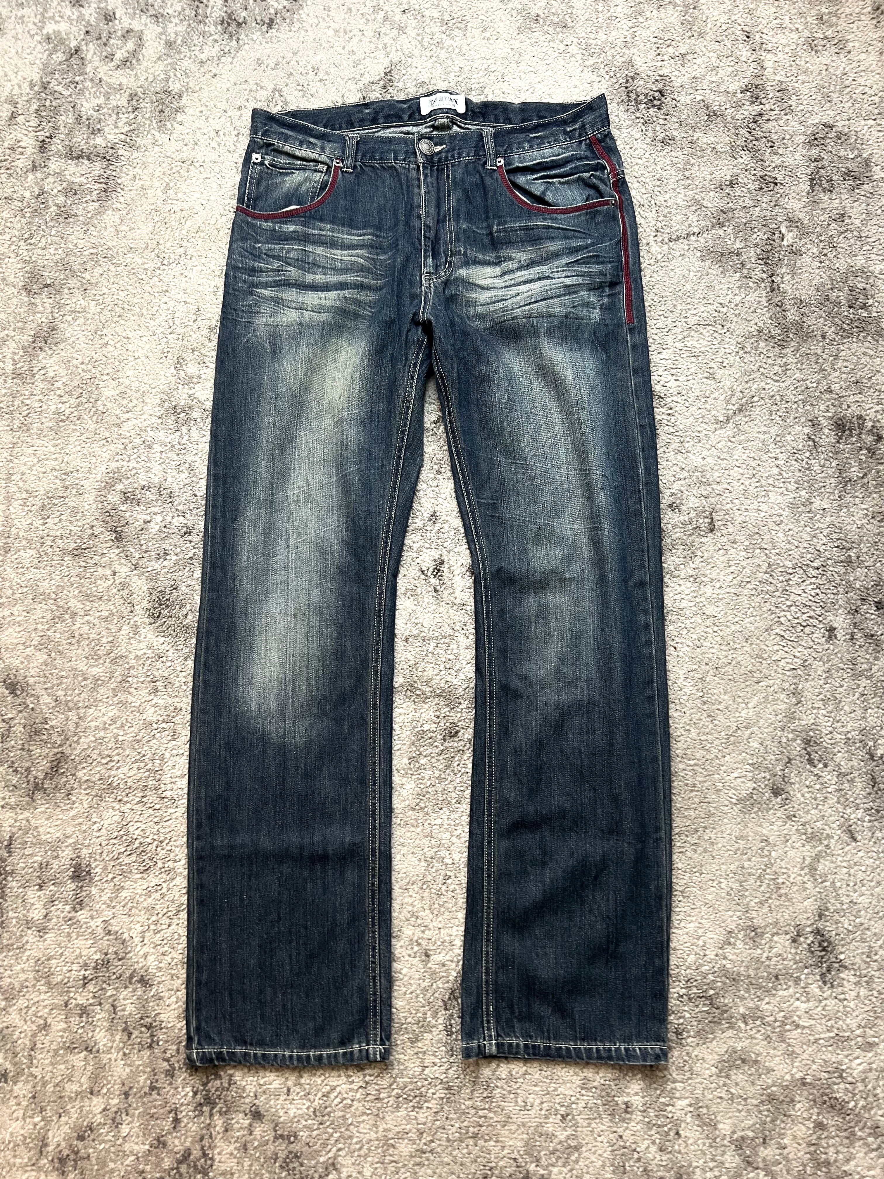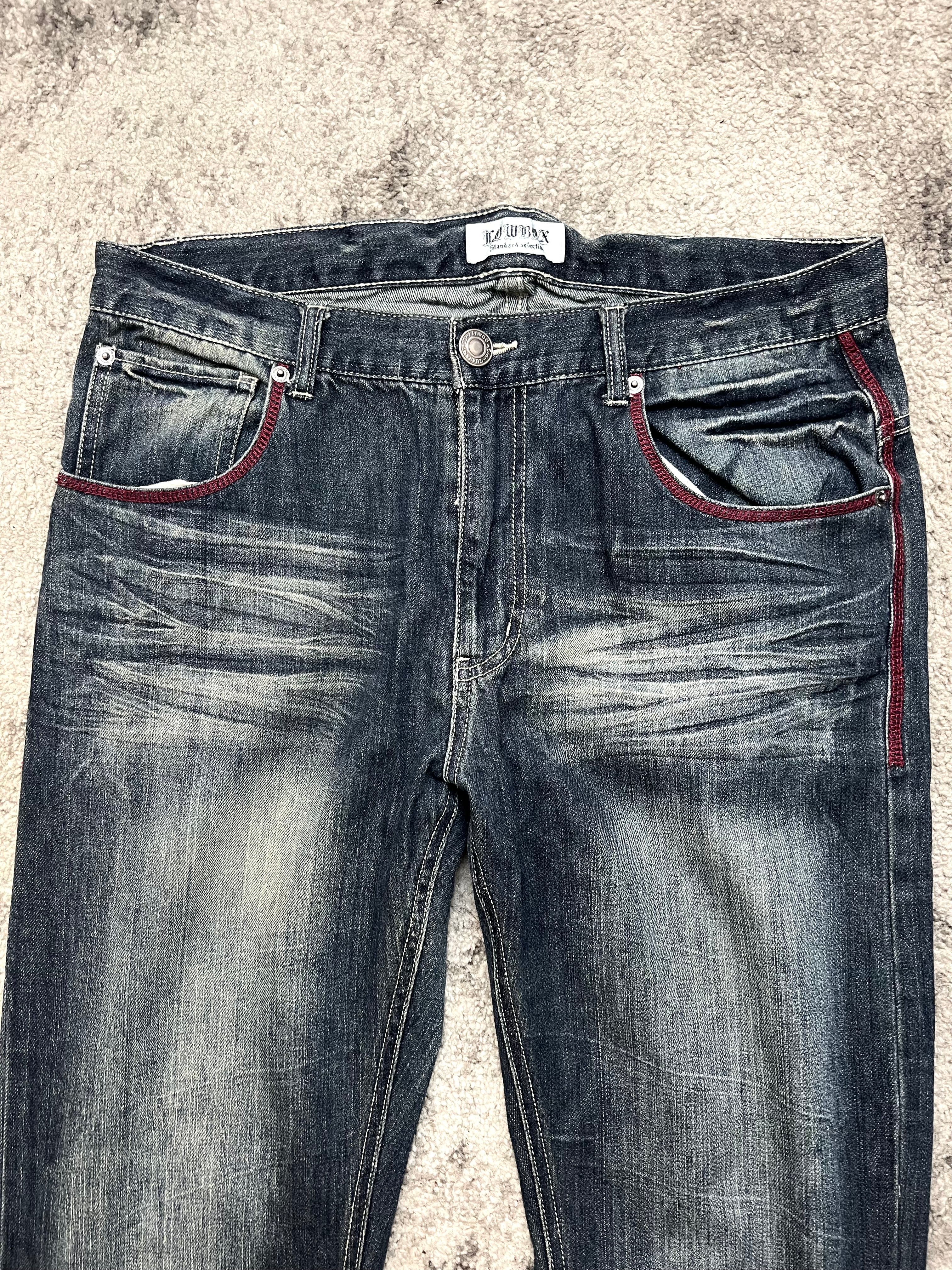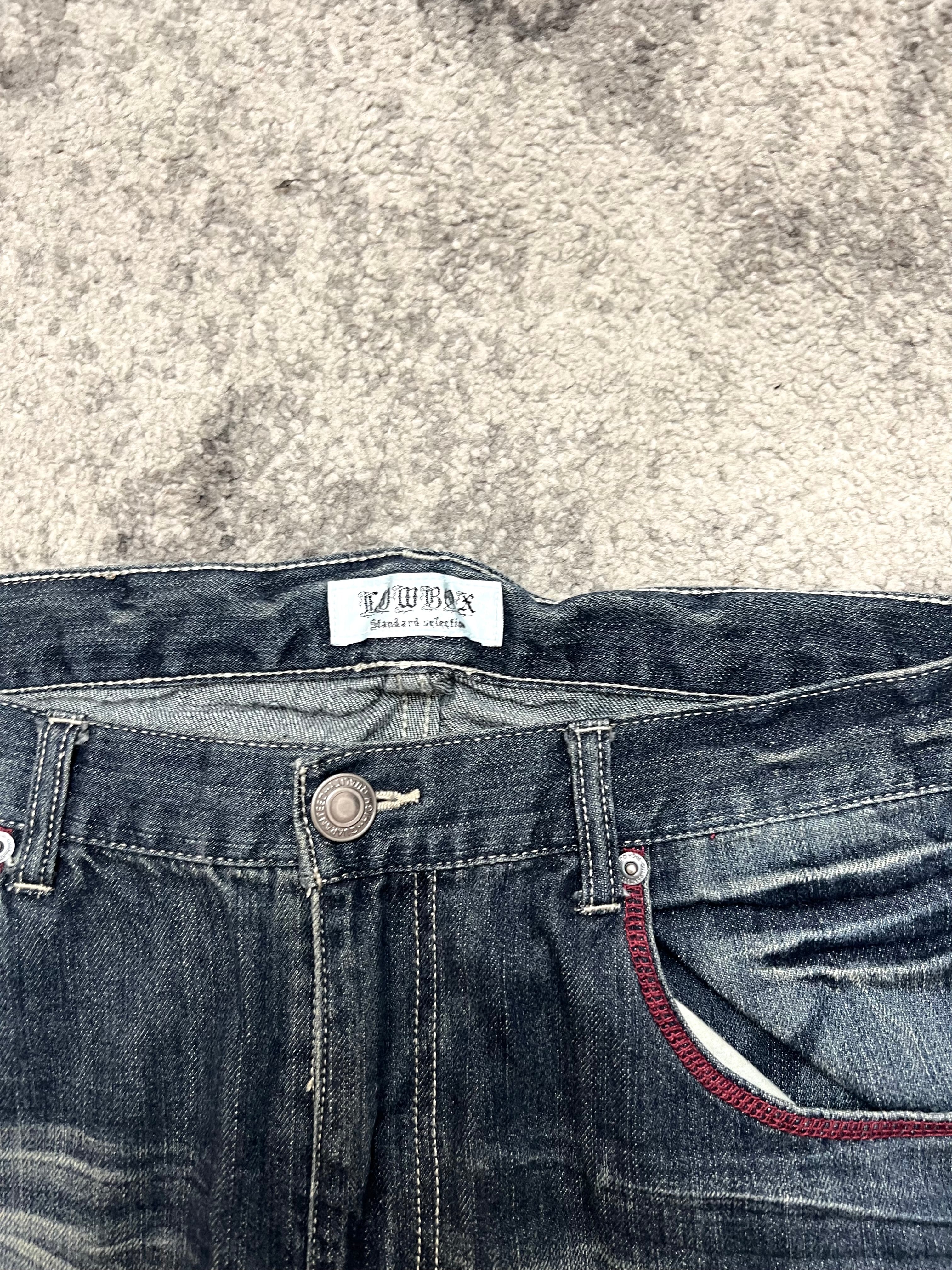 A clean yet striking take on early 2000s Japanese streetwear — this LOWBOX denim balances subtle wear with bold detail. Crafted from midweight indigo cotton, it features natural fading and whiskering that give it lived-in depth, contrasted by sharp red piping along the pockets for that signature Japanese flair.