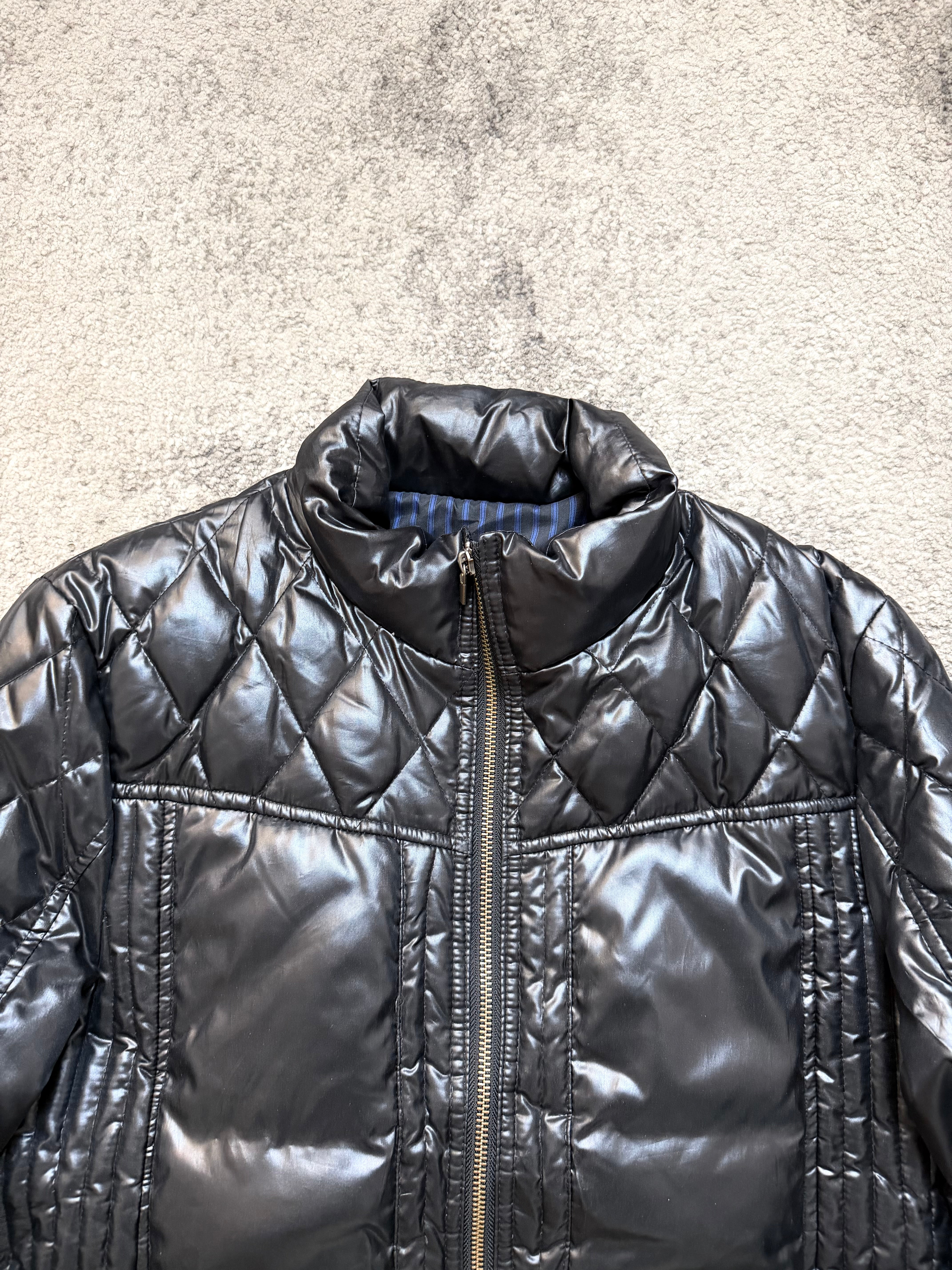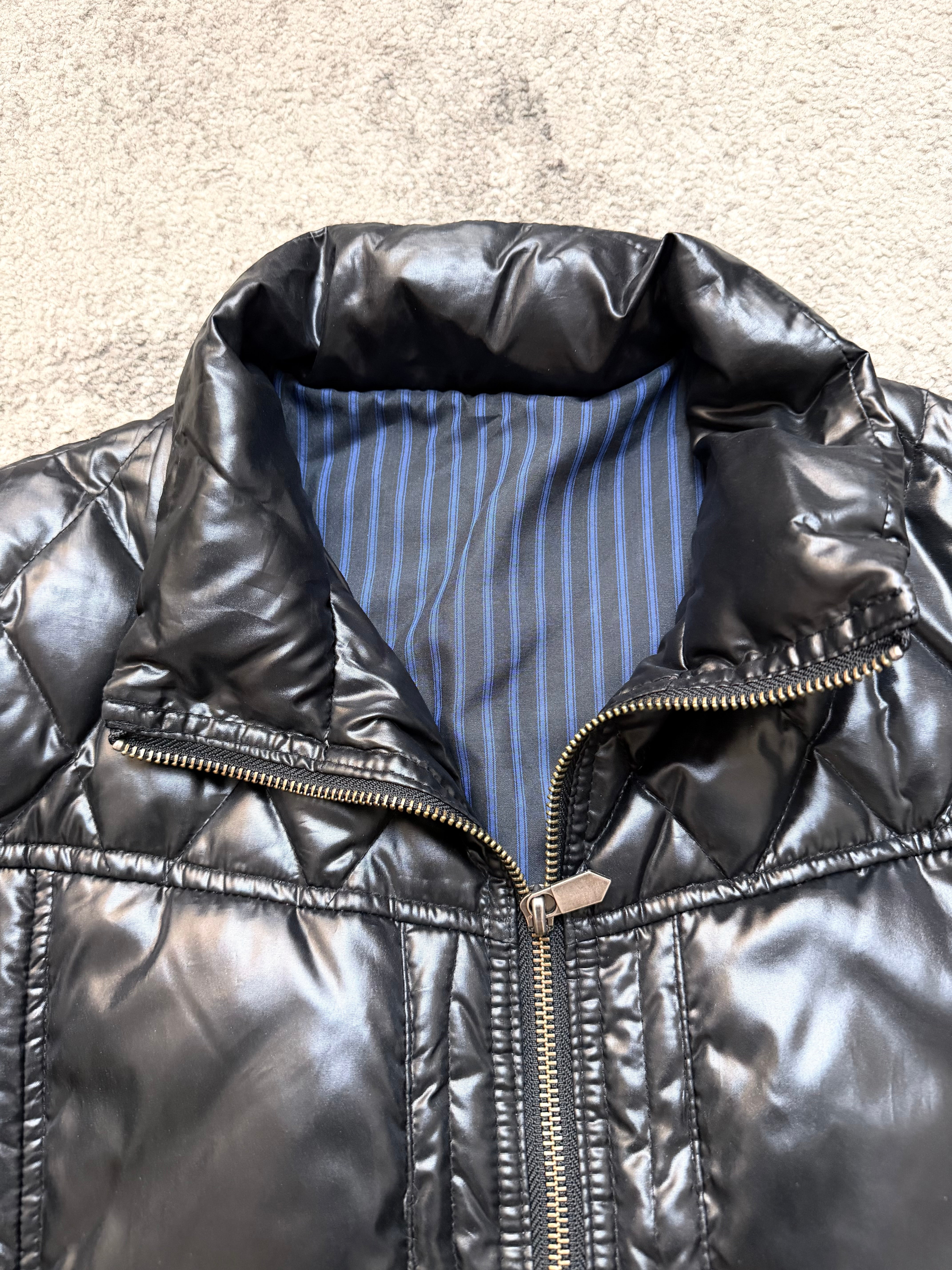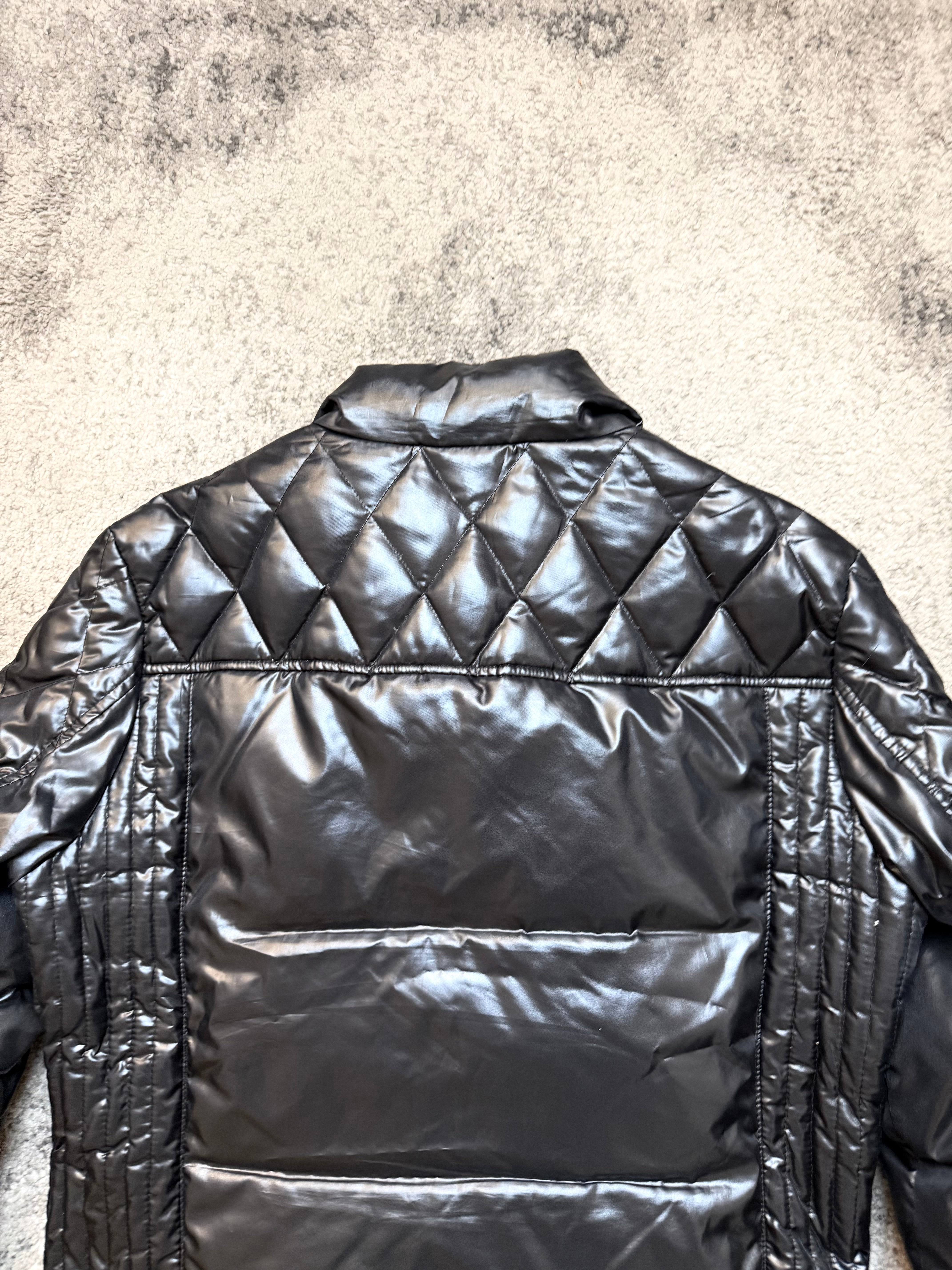 This rare Monsieur Nicole padded jacket blends luxury tailoring with stealth-tech energy: a shiny jet-black quilted shell, sculpted diamond paneling, and a subtle moto-inspired fit that hugs without restricting. Heat-retaining yet lightweight — built for movement, for city rhythm.