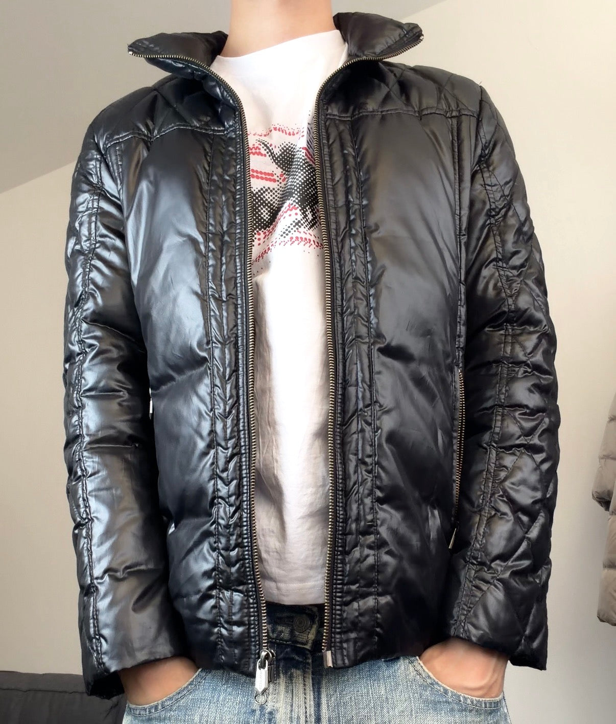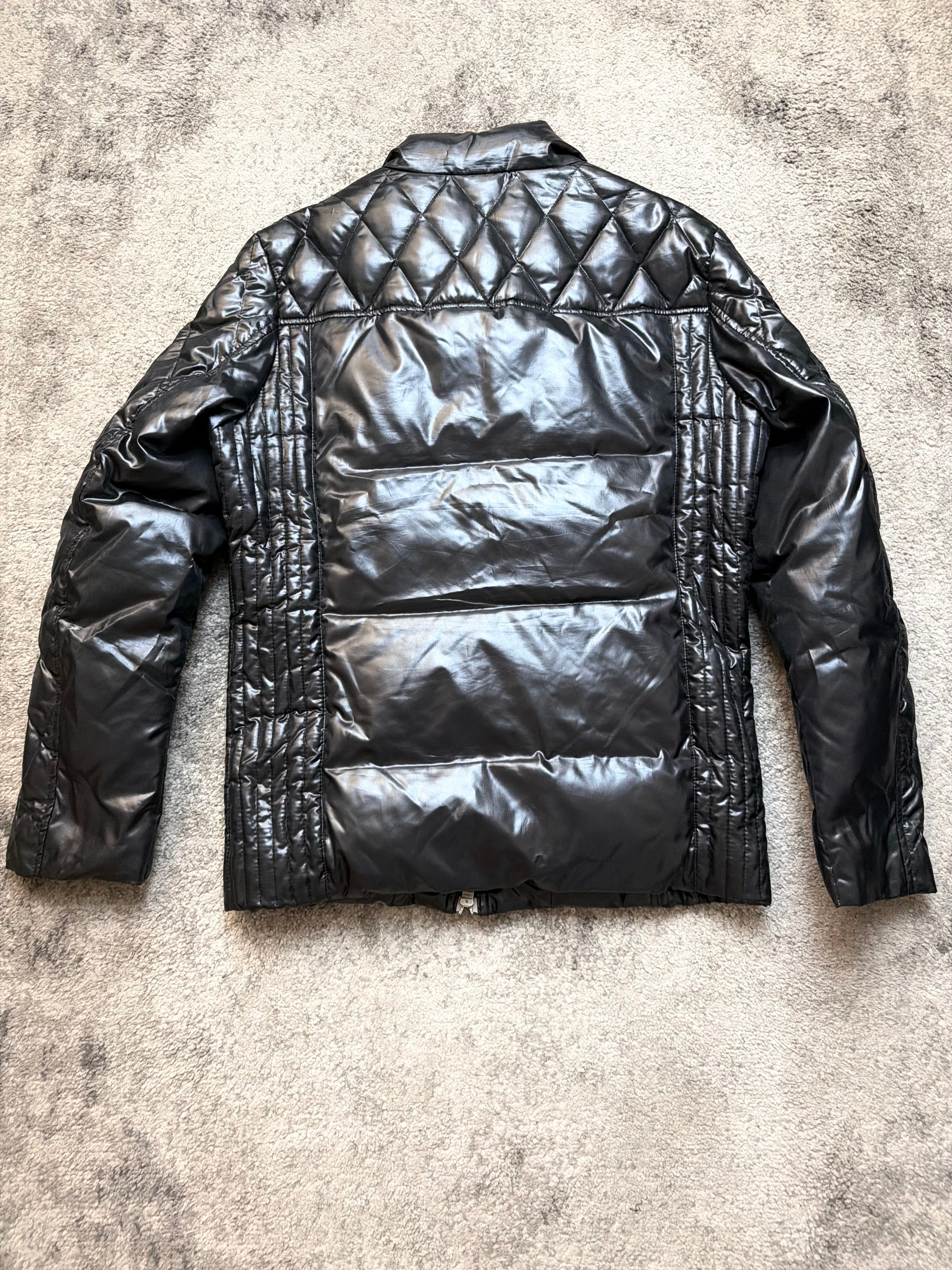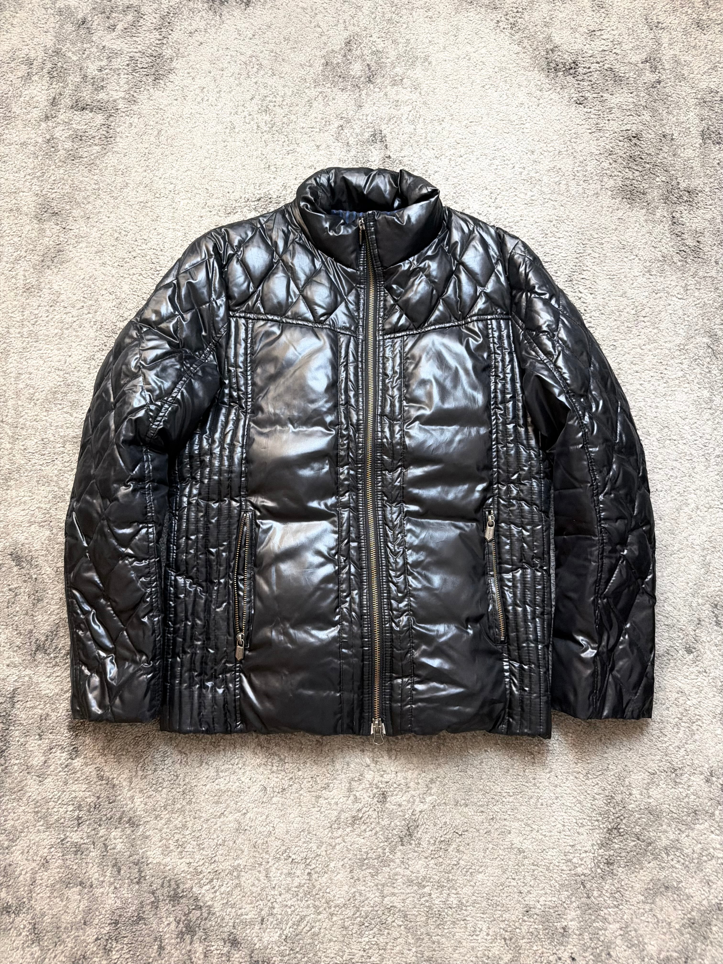 This rare Monsieur Nicole padded jacket blends luxury tailoring with stealth-tech energy: a shiny jet-black quilted shell, sculpted diamond paneling, and a subtle moto-inspired fit that hugs without restricting. Heat-retaining yet lightweight — built for movement, for city rhythm.