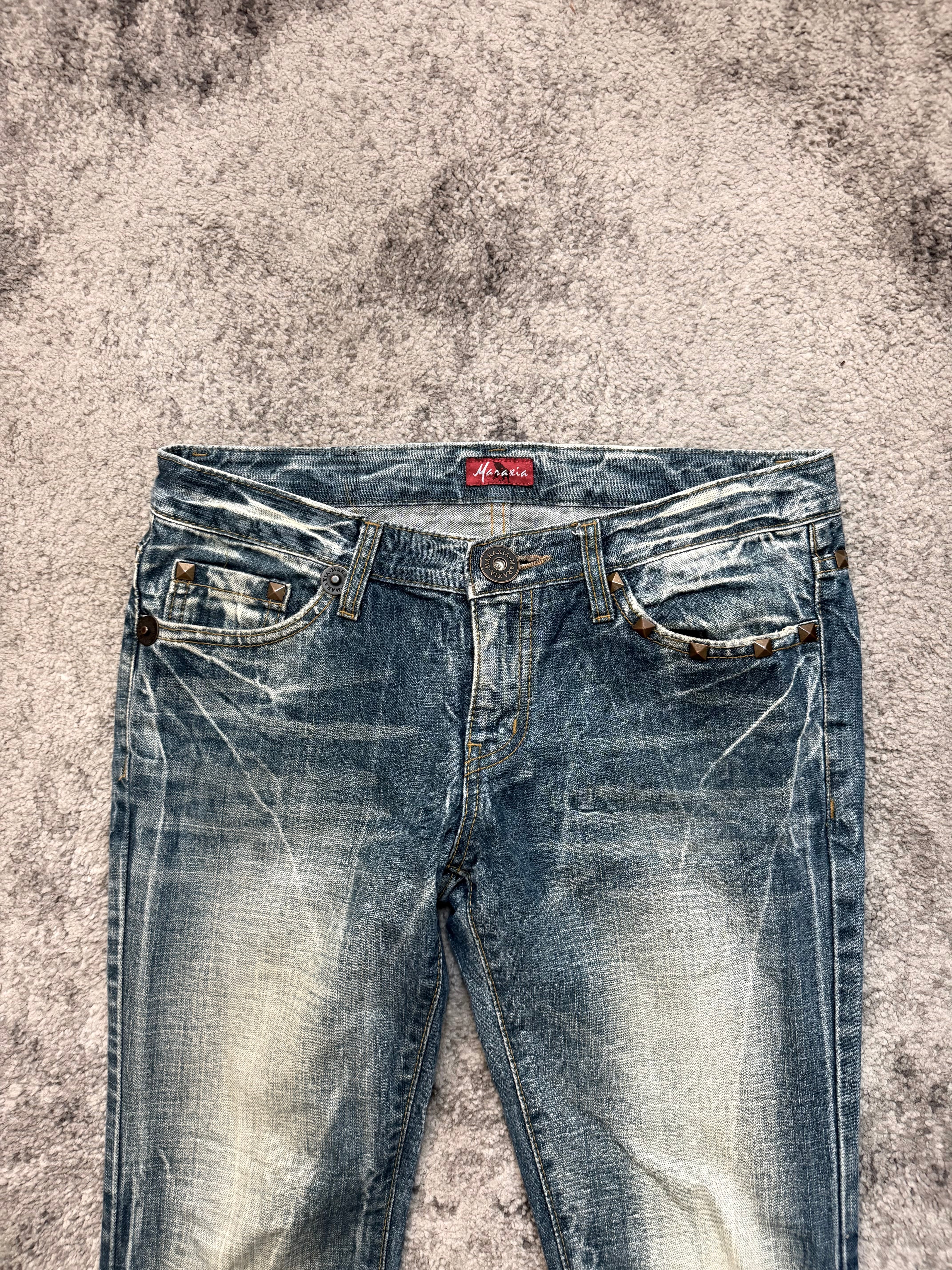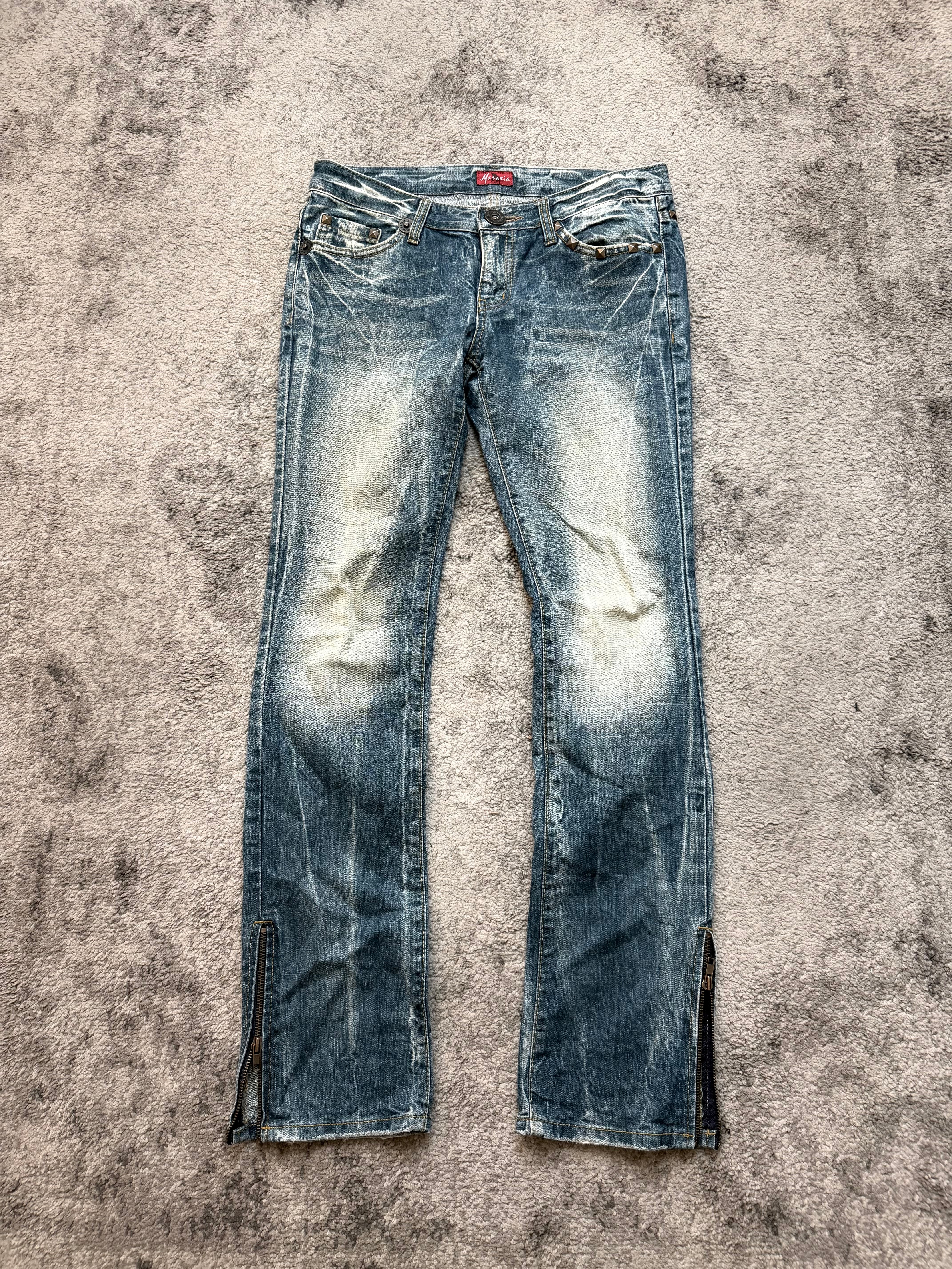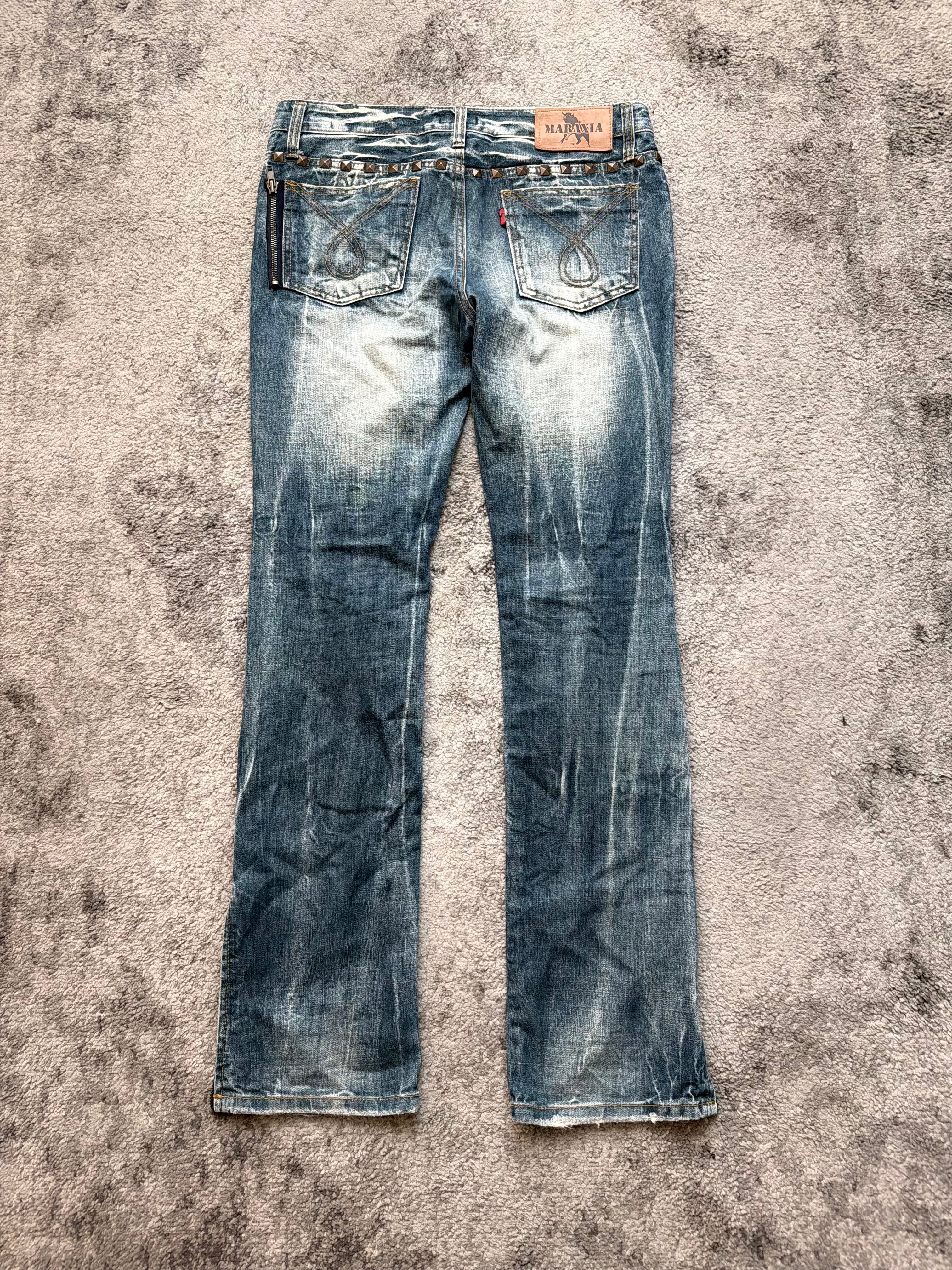 A pair of jeans made for late–night streets and low-lit bars — that unmistakable Japanese archive energy. MARAXIA brings distressed romance to denim, and this pair is a perfect example: lived-in whiskers, washed-down indigo, and dramatic fading that feels almost cinematic. The subtle bootcut silhouette with zip-open hems adds that rebellious, Number (N)ine–adjacent flair — a nod to slim silhouettes and rock-leaning styling.