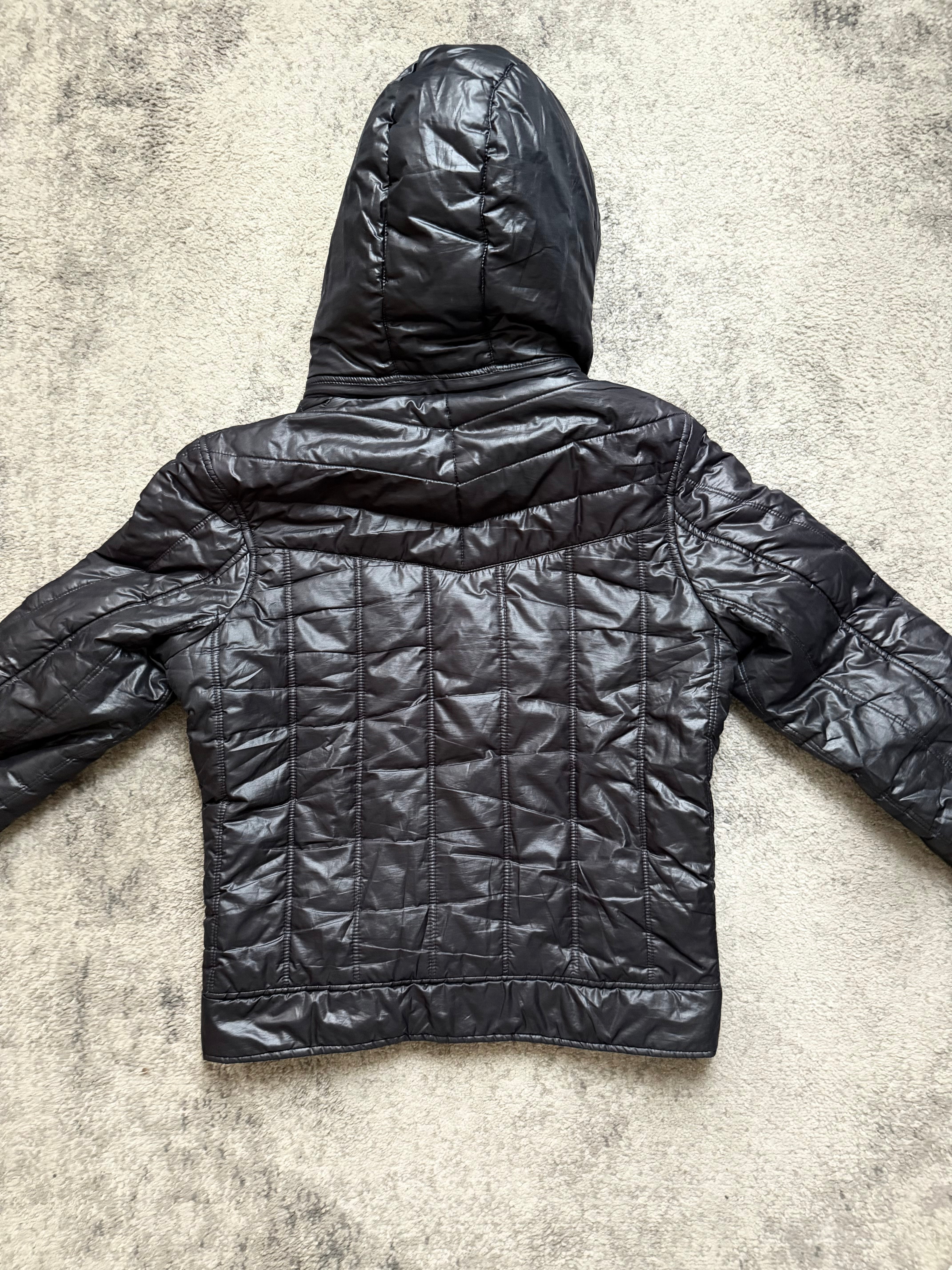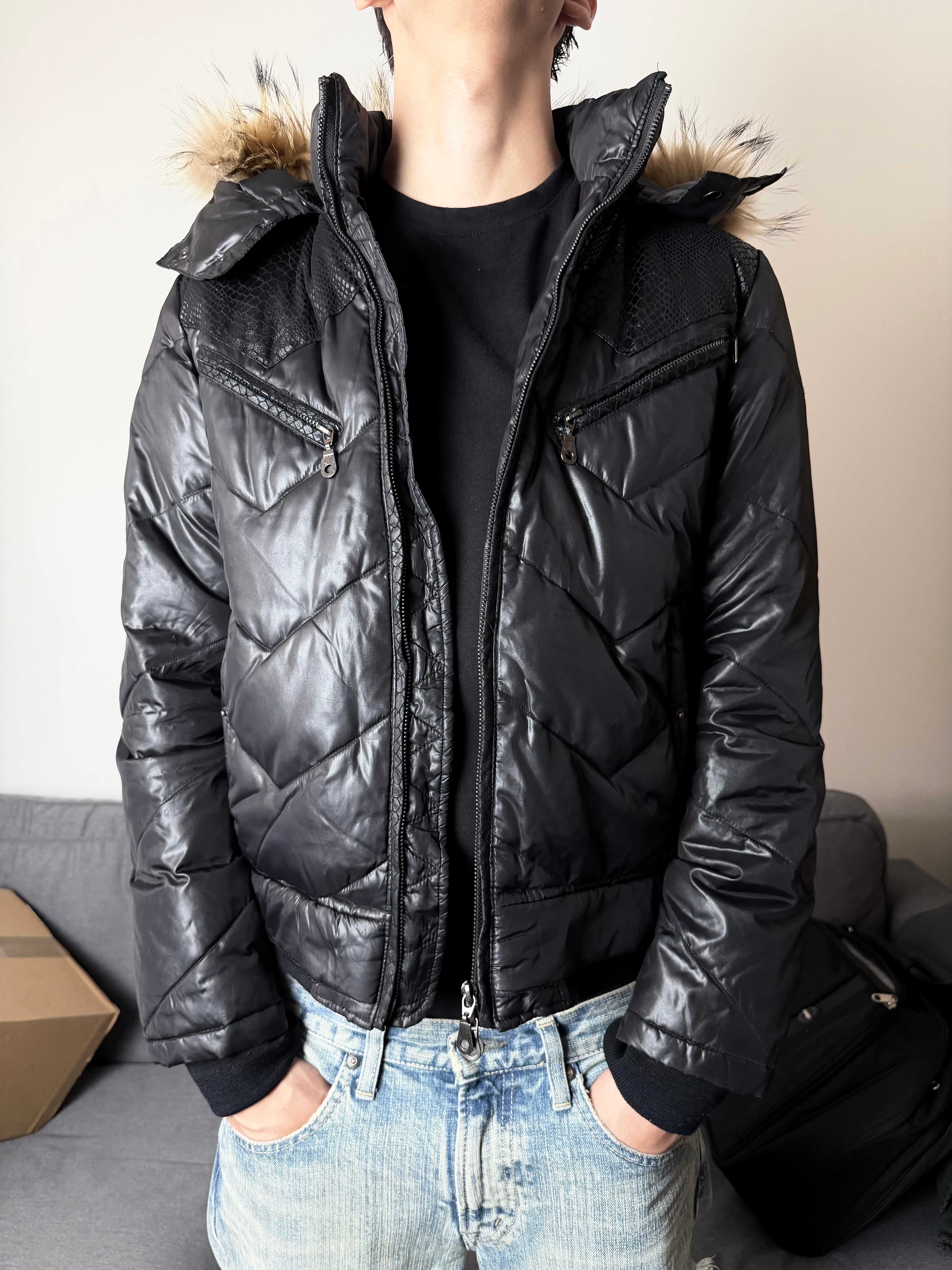Crafted from a subtle gloss nylon shell with vertical quilt lines, it features zip chest pockets, a detachable hood, and soft fleece inner lining for comfort and insulation. The minimalist silhouette gives off that elevated citywear energy — clean but with attitude.