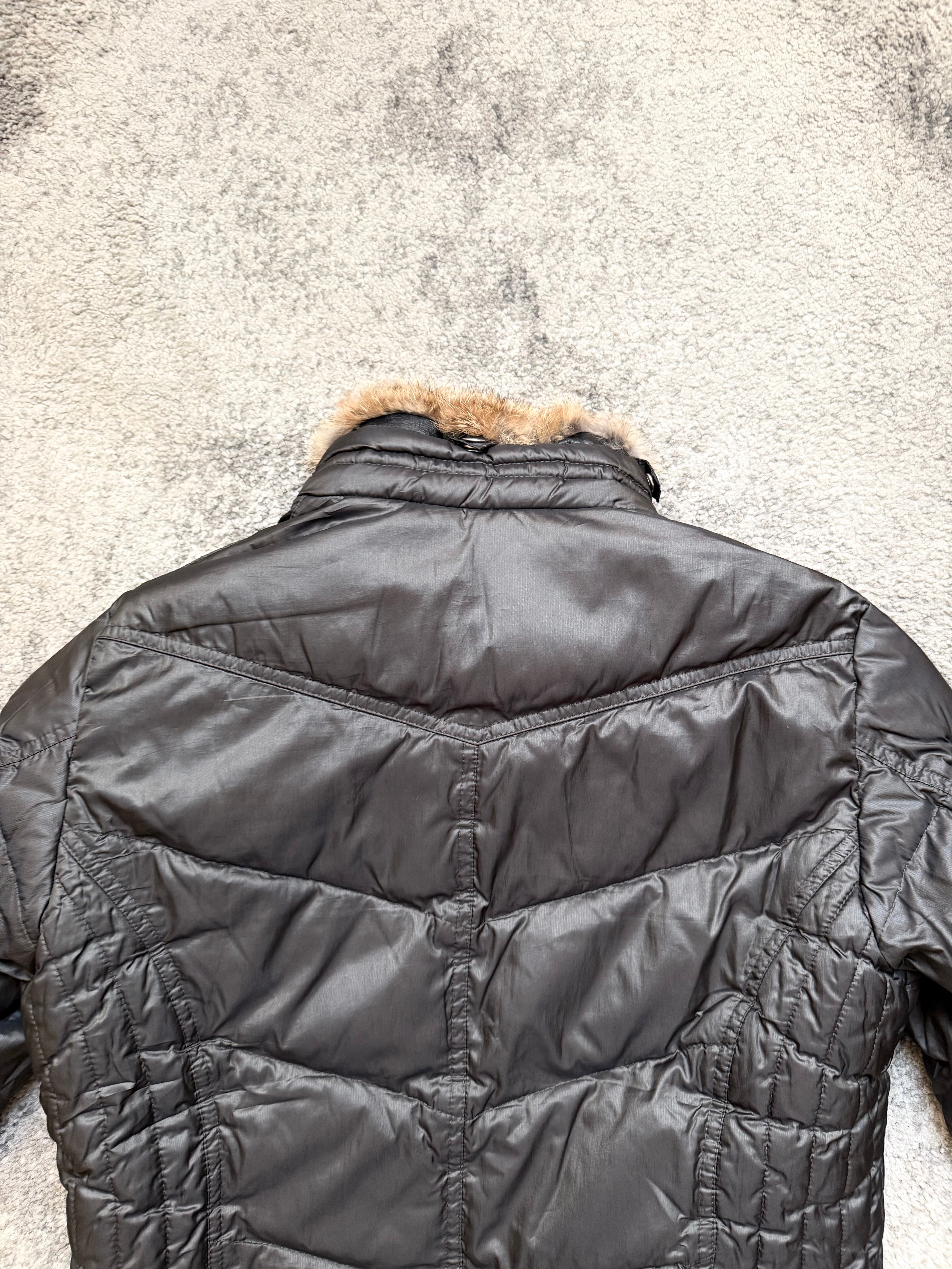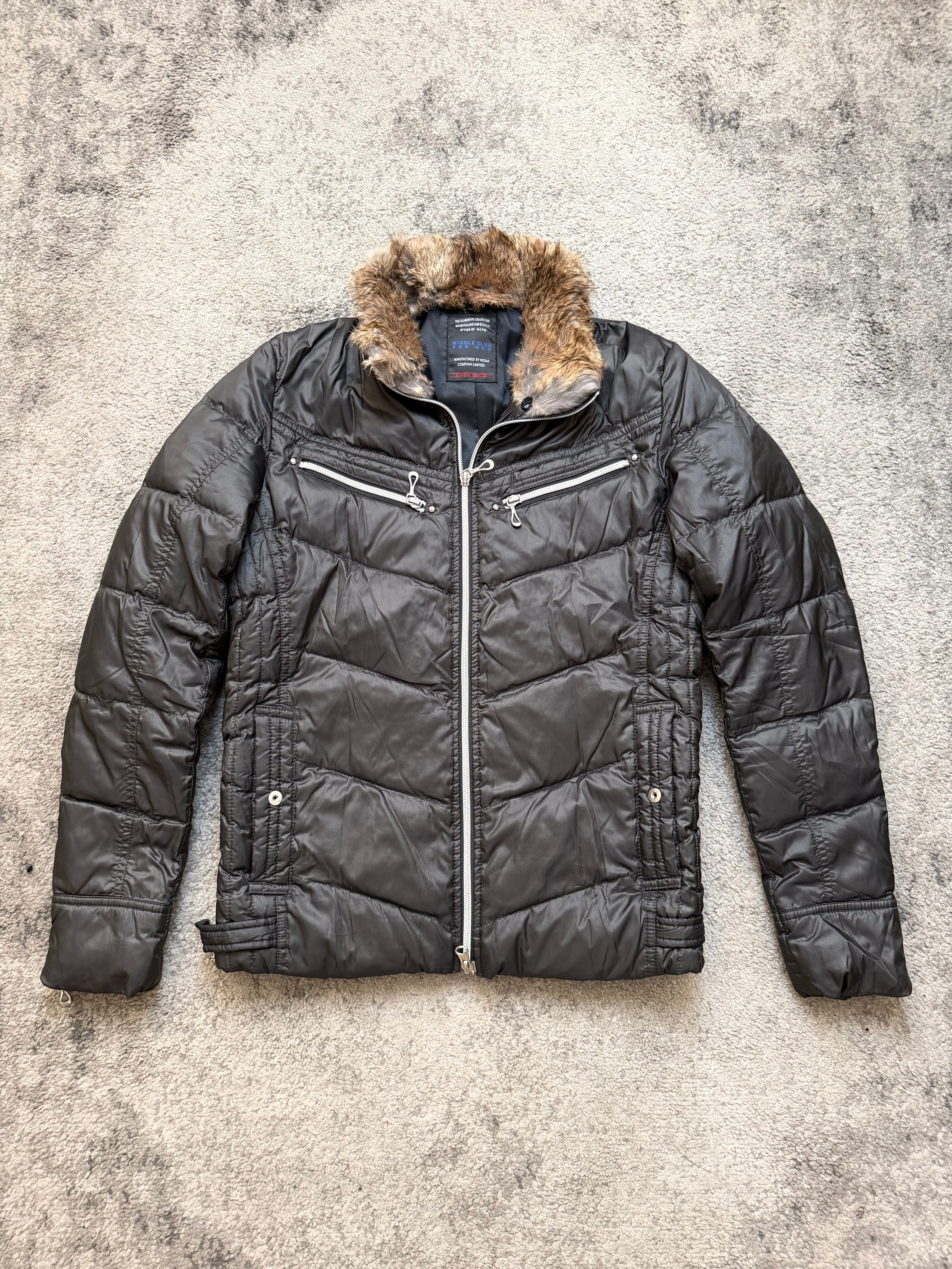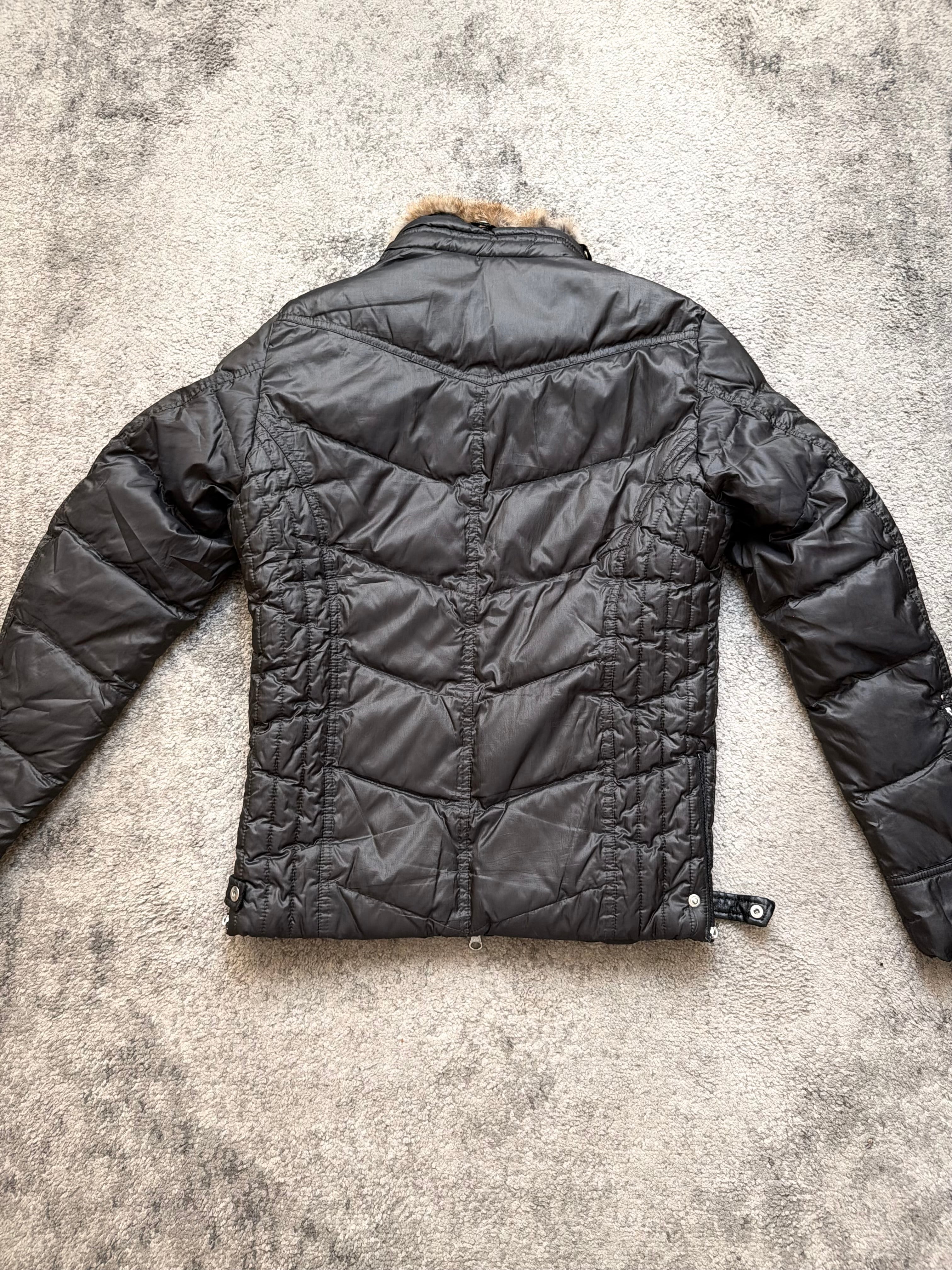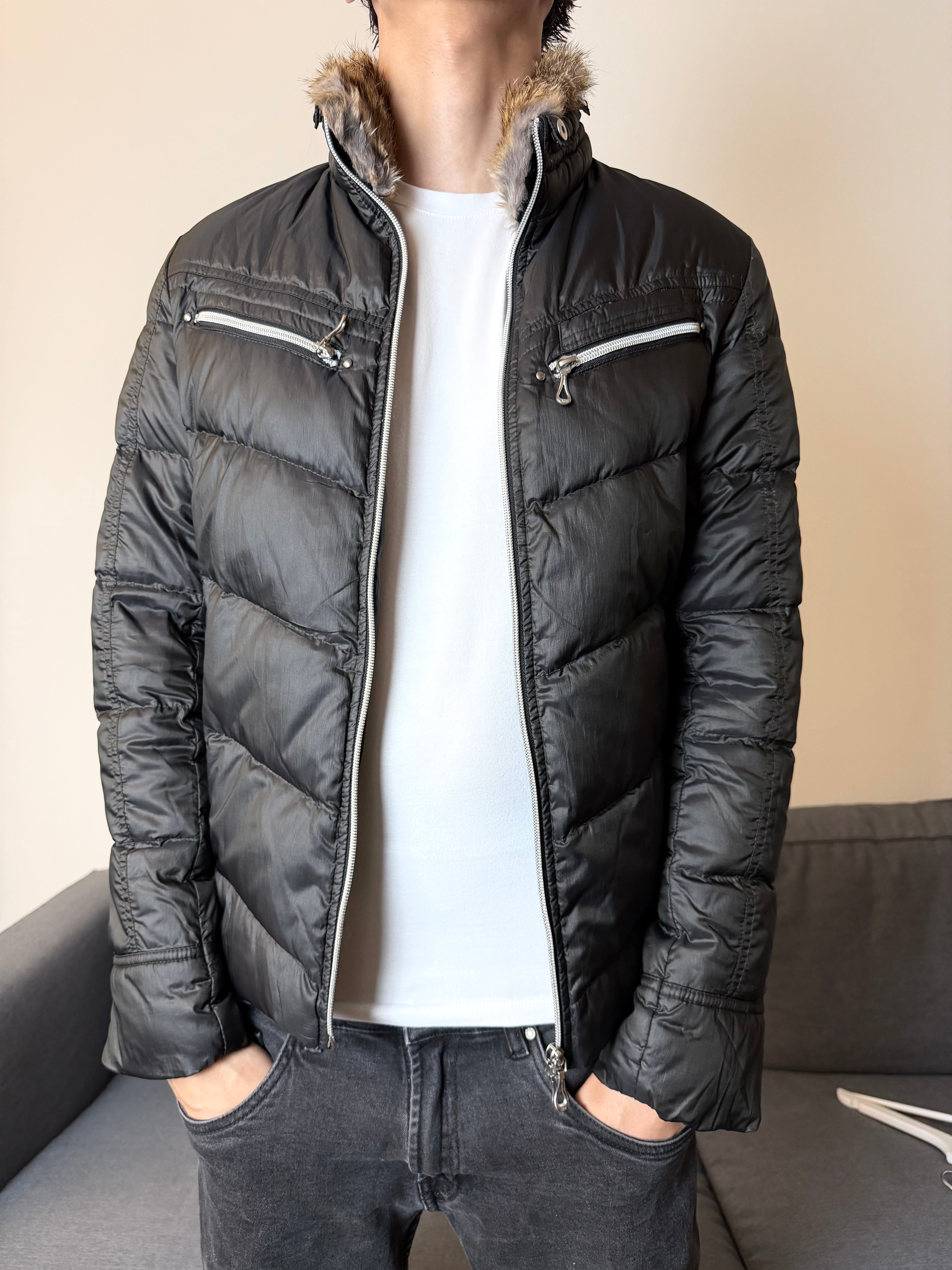 Lightweight but warm, padded with that signature Japanese down look. The faux-fur collar gives it a bold winter edge, removable if you want it cleaner. Front chest zip pockets add a touch of moto detail, while the sculpted paneling creates a fitted, streamlined silhouette—very Number (N)ine and early-2000s Harajuku attitude.