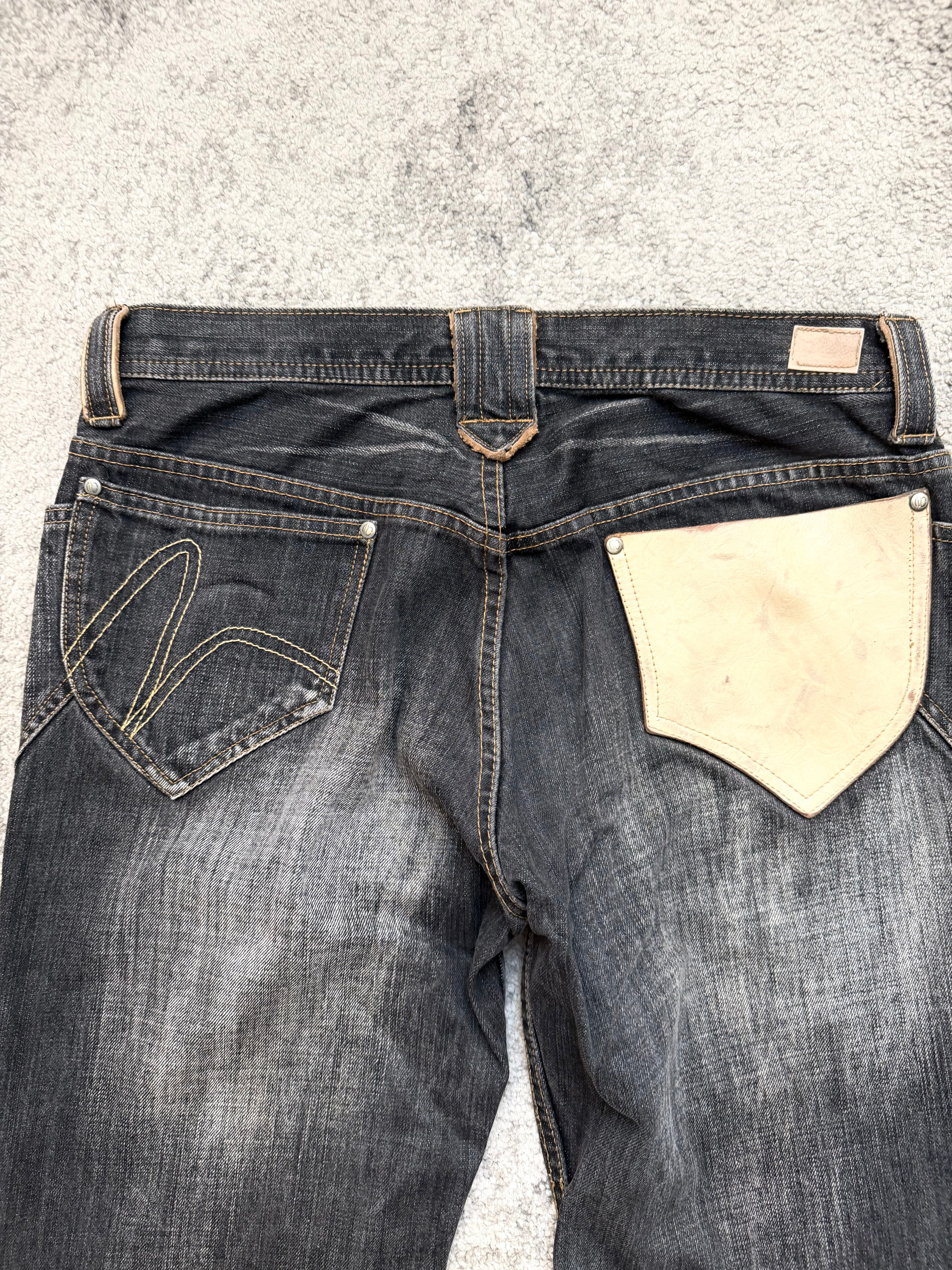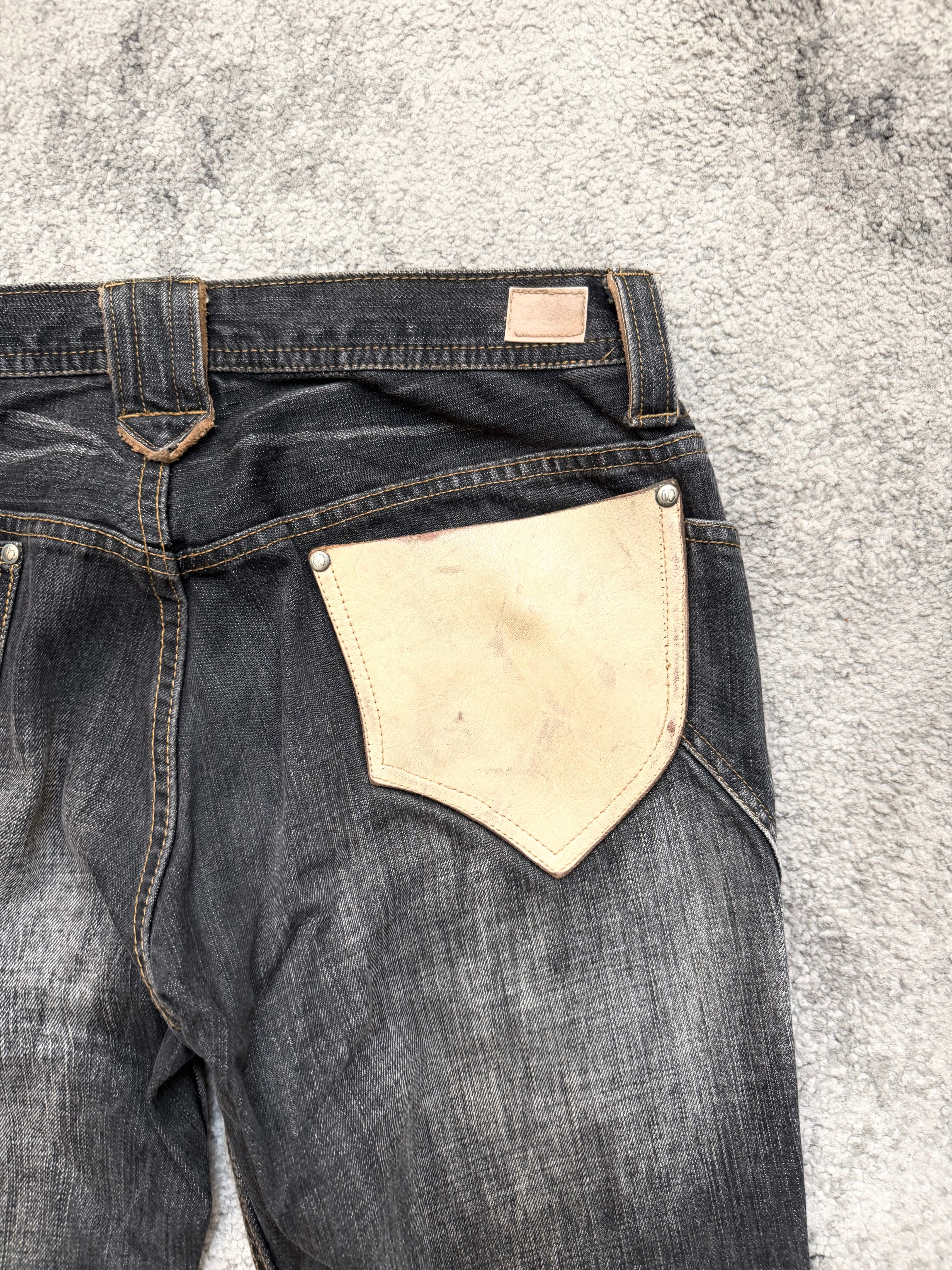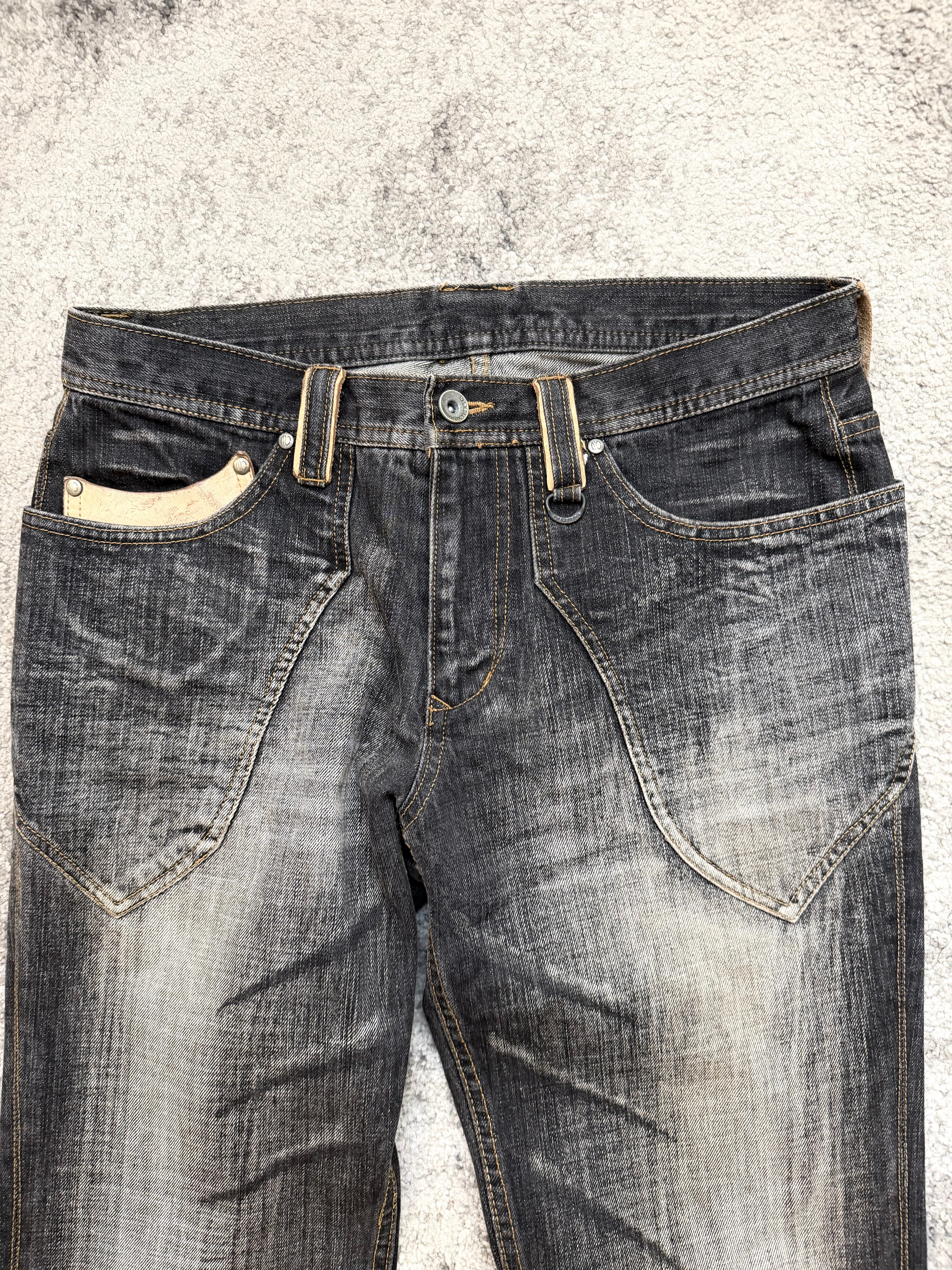 Constructed from premium Japanese cotton denim, they’re broken in perfectly but still sturdy, with no structural issues—just authentic aging and character. The asymmetric back-pocket design (one classic, one washed-out patch panel) gives them that subtle, slightly rebellious twist reminiscent of Number (N)ine’s understated asymmetry.