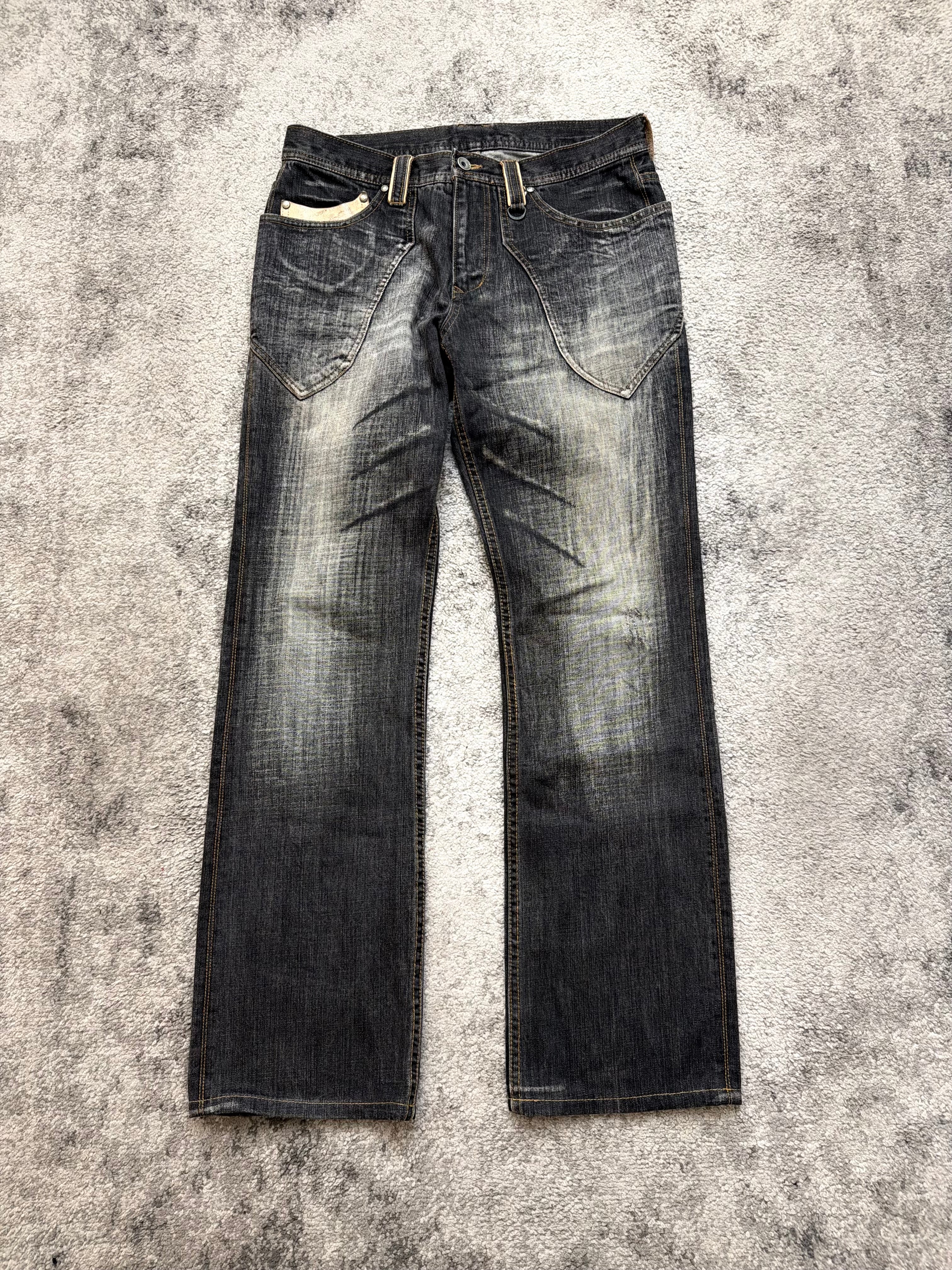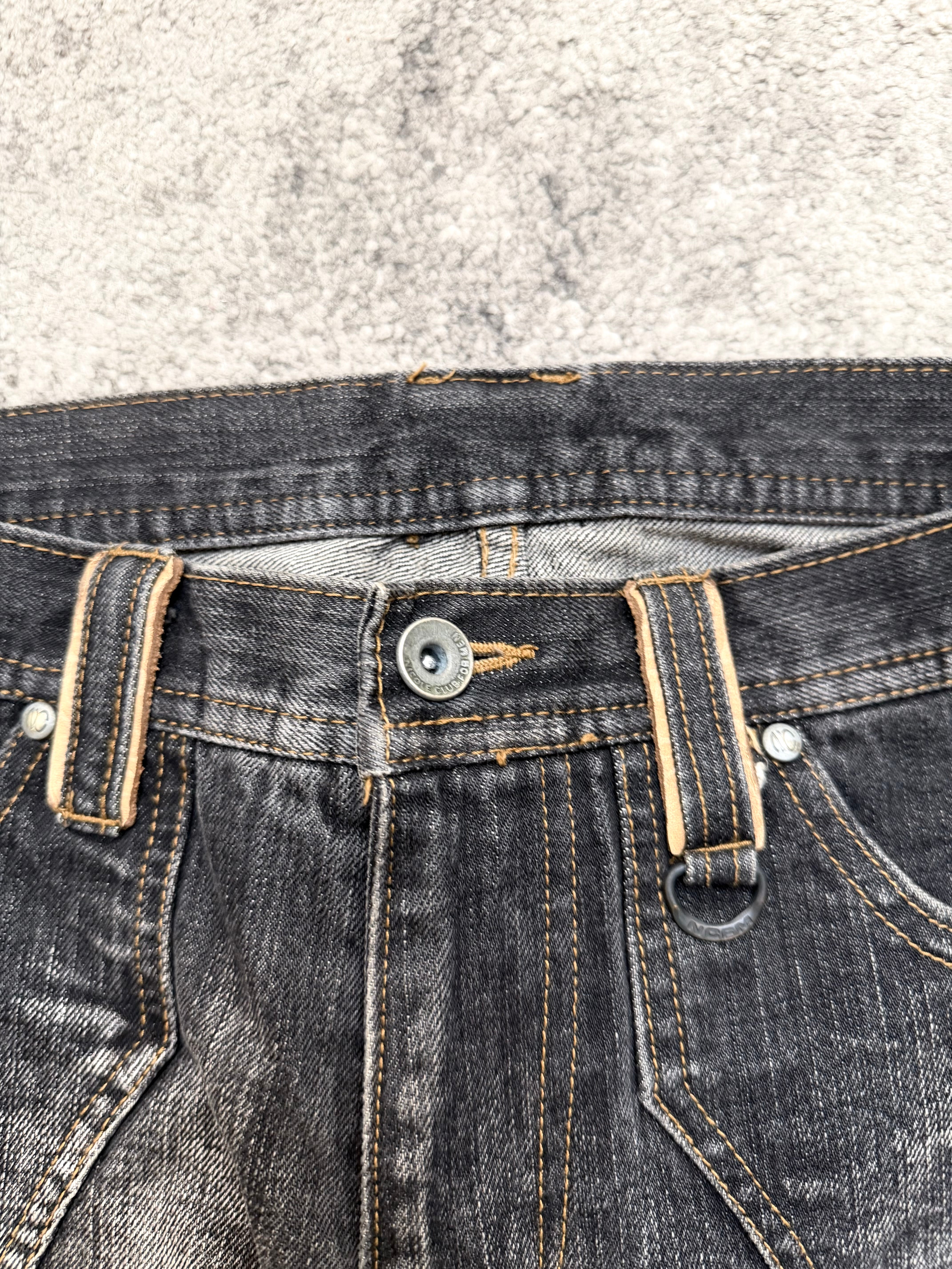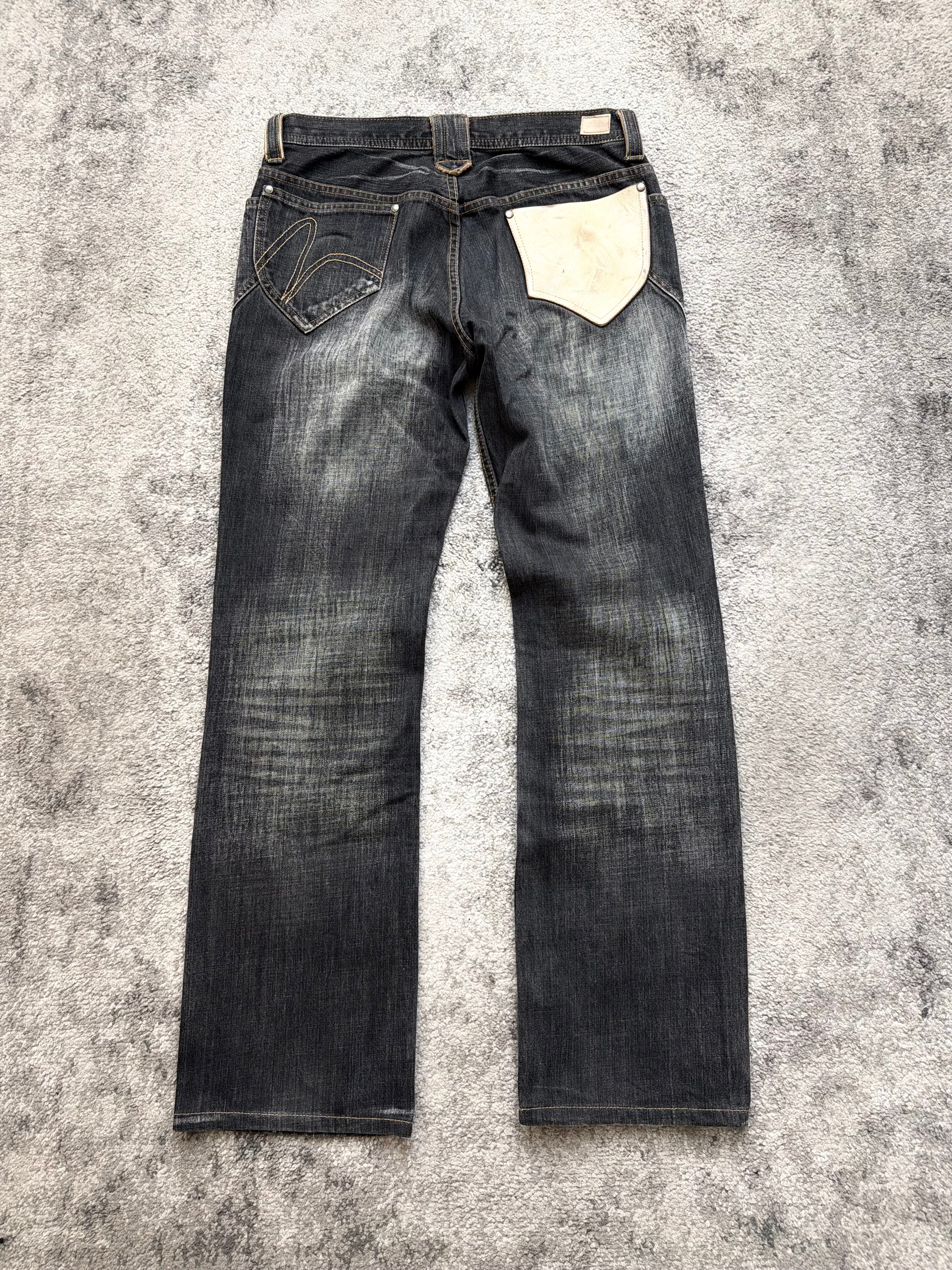 Constructed from premium Japanese cotton denim, they’re broken in perfectly but still sturdy, with no structural issues—just authentic aging and character. The asymmetric back-pocket design (one classic, one washed-out patch panel) gives them that subtle, slightly rebellious twist reminiscent of Number (N)ine’s understated asymmetry.