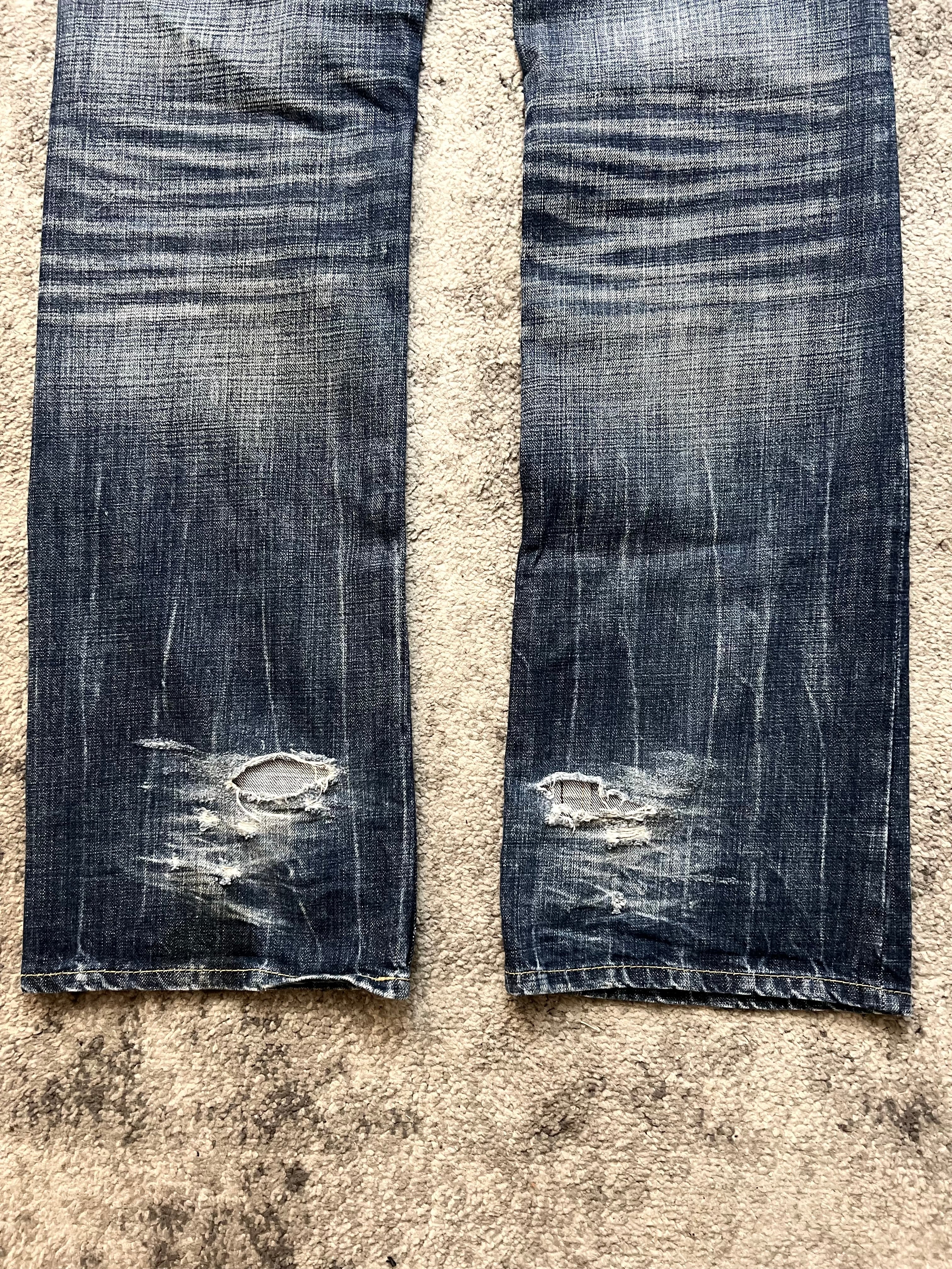 Distressed back hems and faded whiskers blend effortlessly with leather-trimmed pocket detailing and metallic rivets — subtle nods to the rugged luxury aesthetic Japan perfected during its golden archive era. Straight-leg fit for a timeless, easy silhouette that moves with quiet confidence.