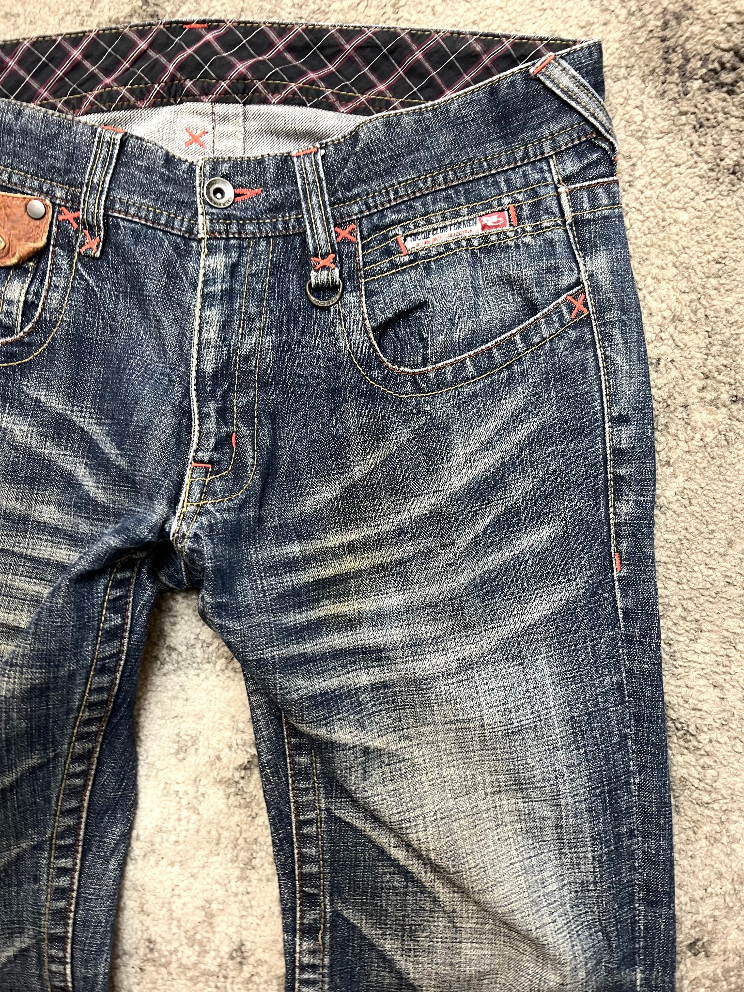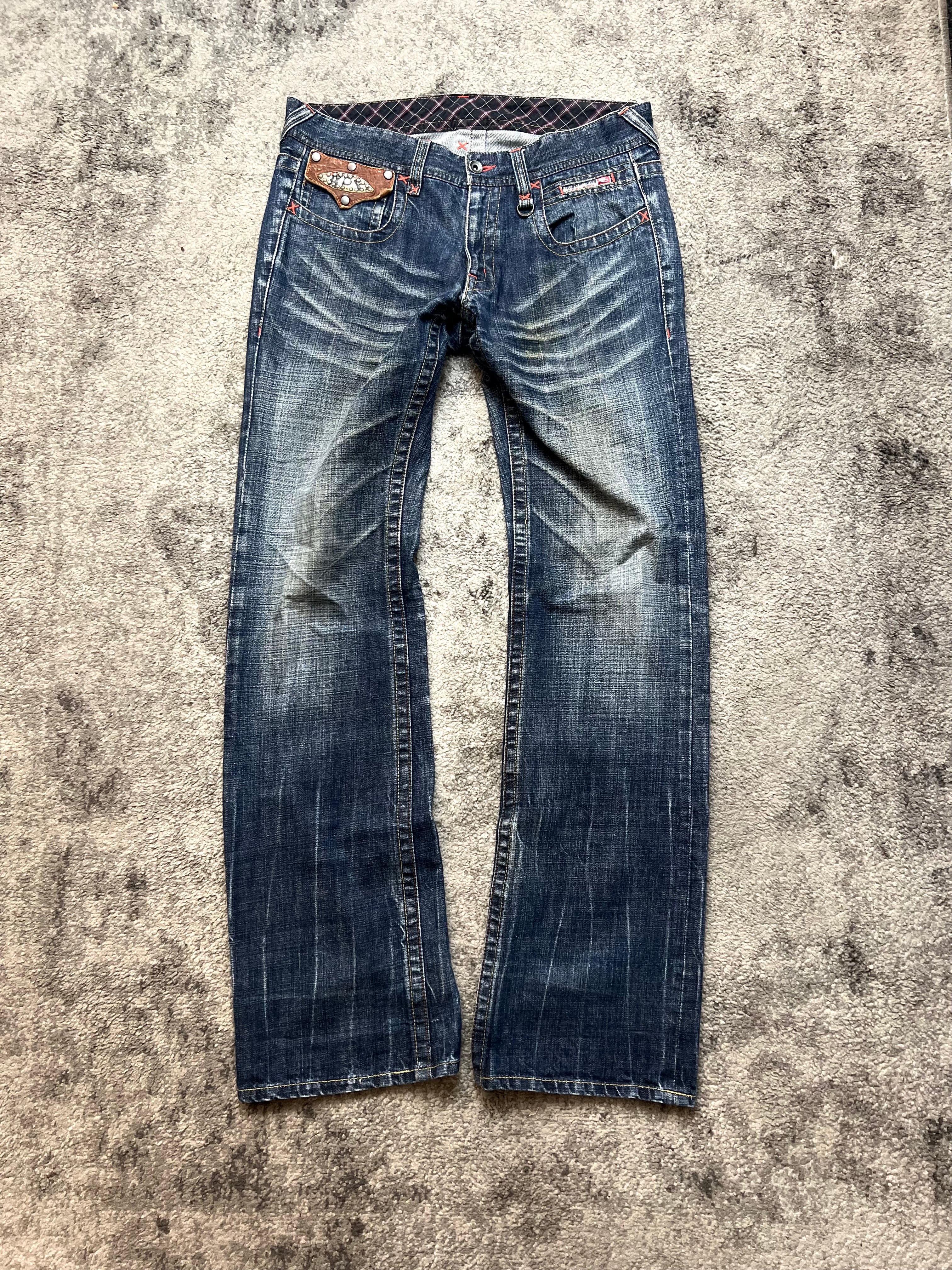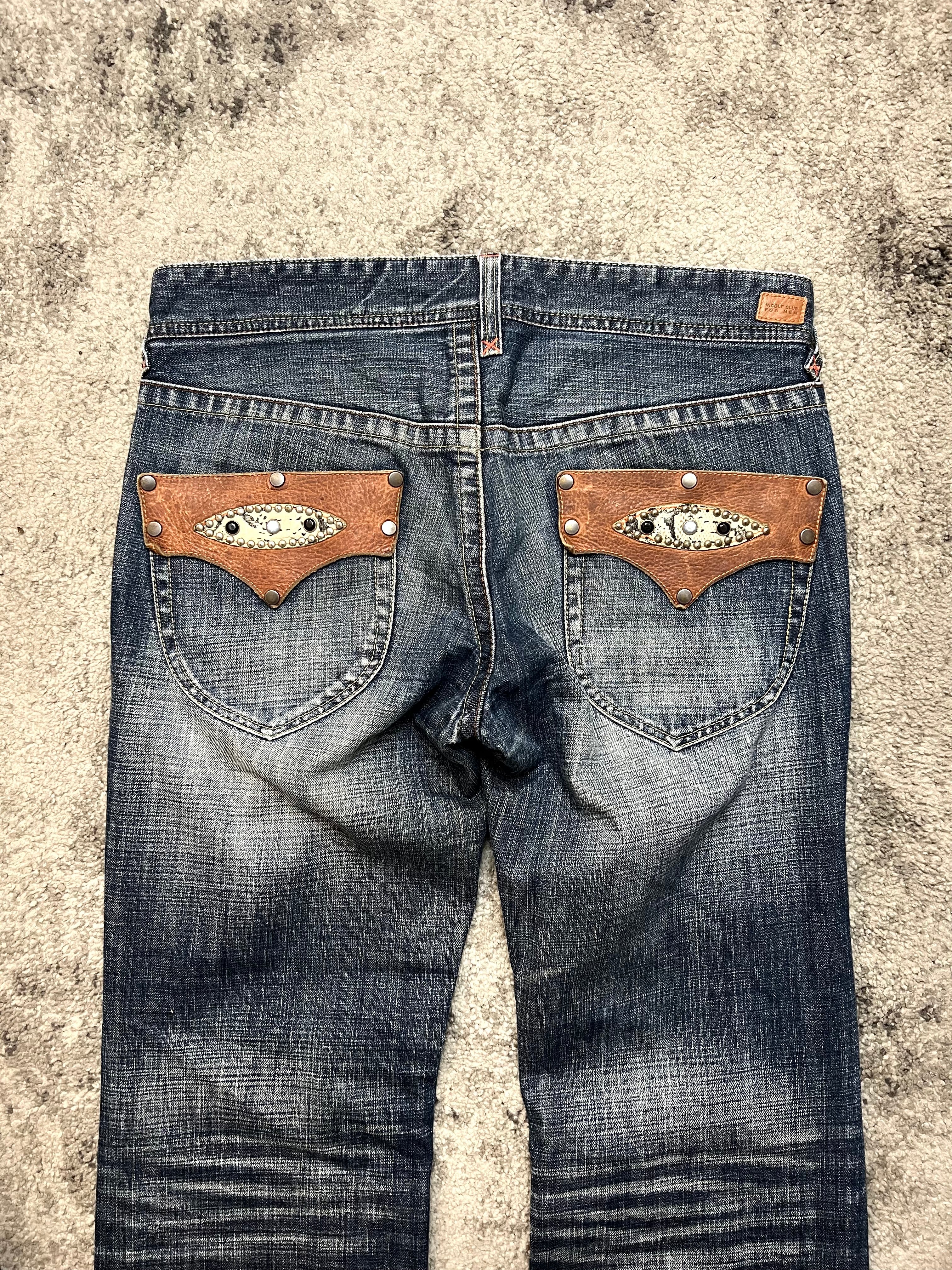 A perfect balance of vintage craftsmanship and subtle rebellion — this NICOLE CLUB denim carries that unmistakable early-2000s Japanese flair. Constructed from soft, mid-weight indigo cotton with a natural fade and honeycomb creasing that feels authentically worn.