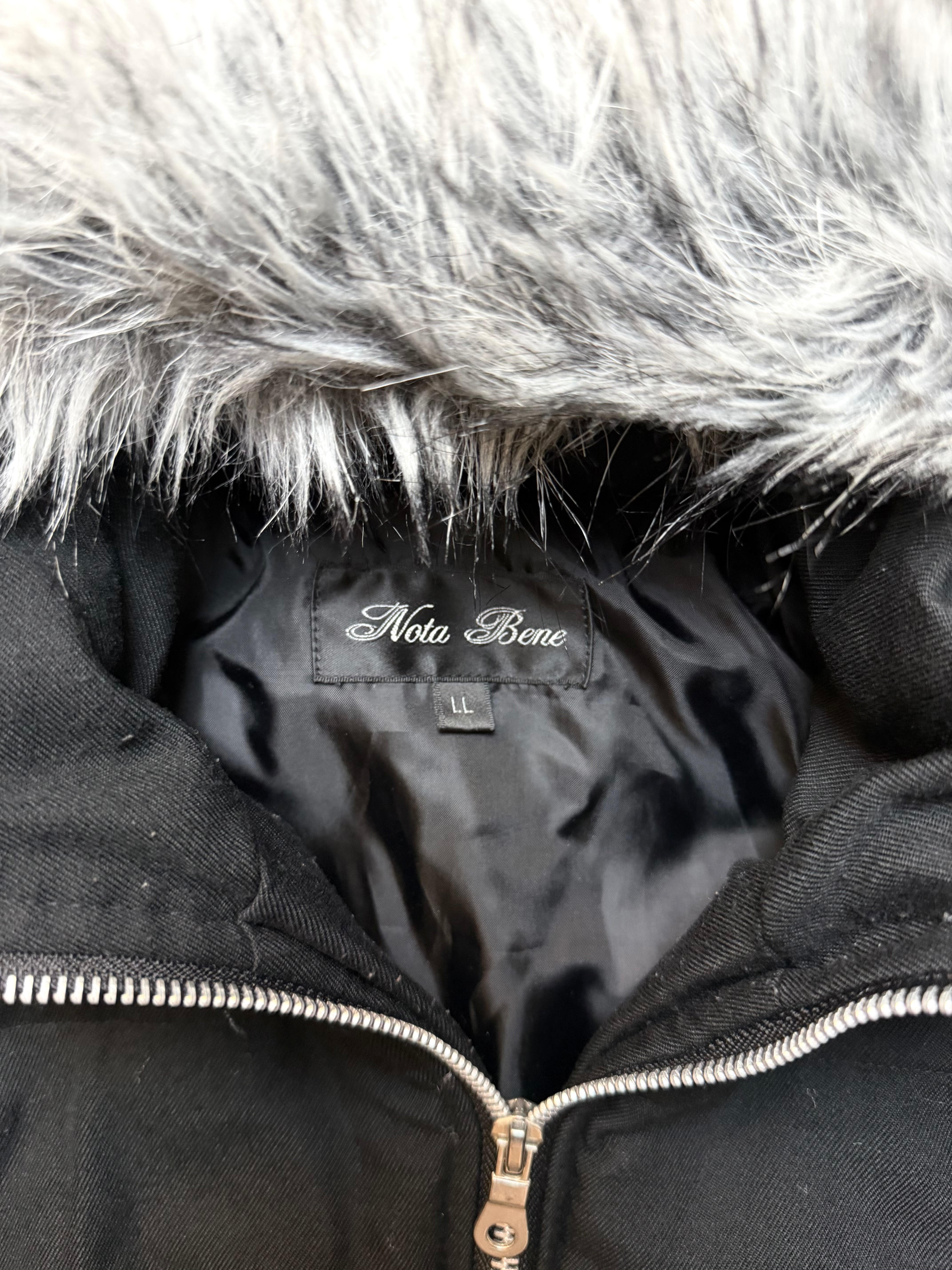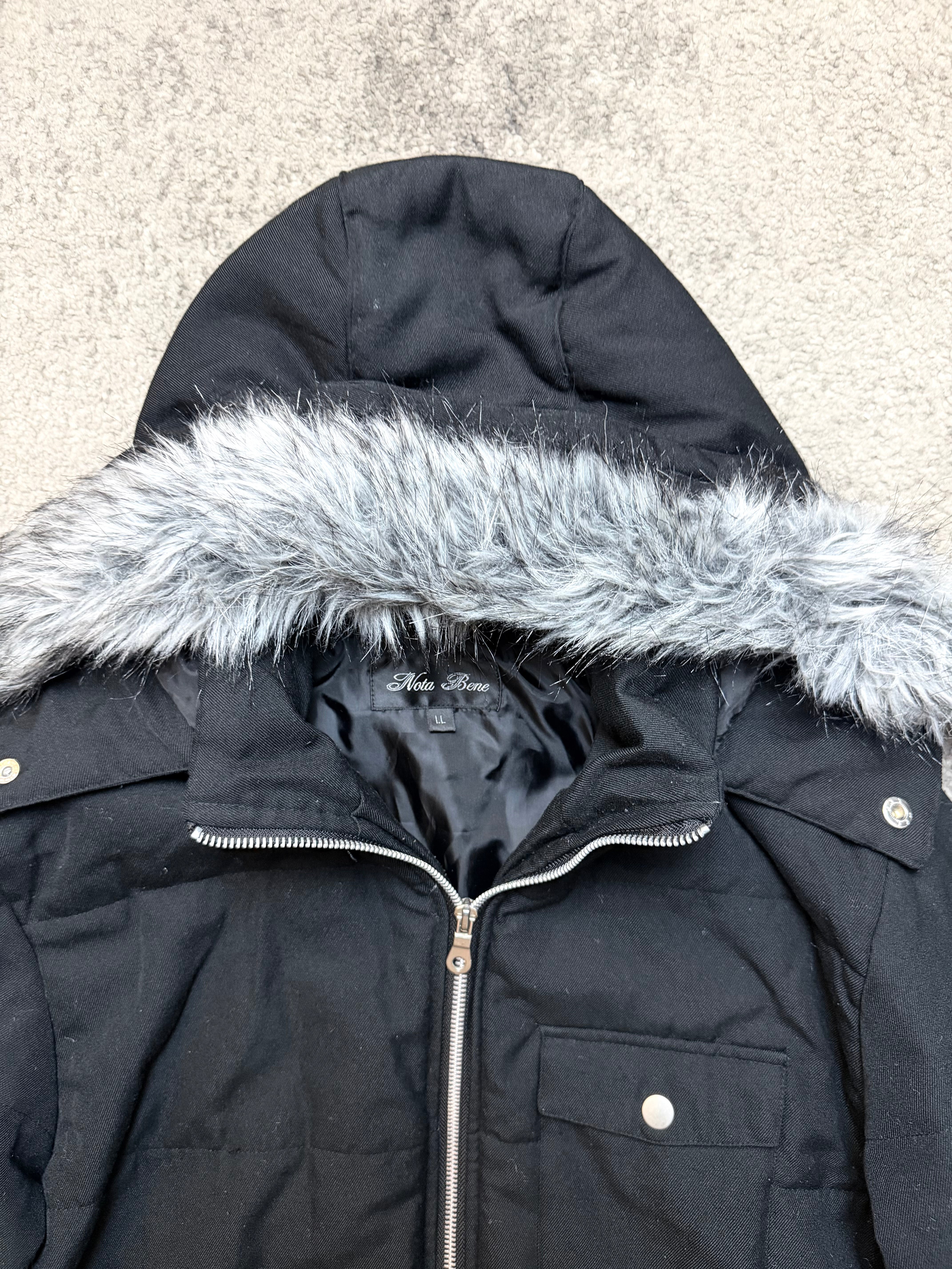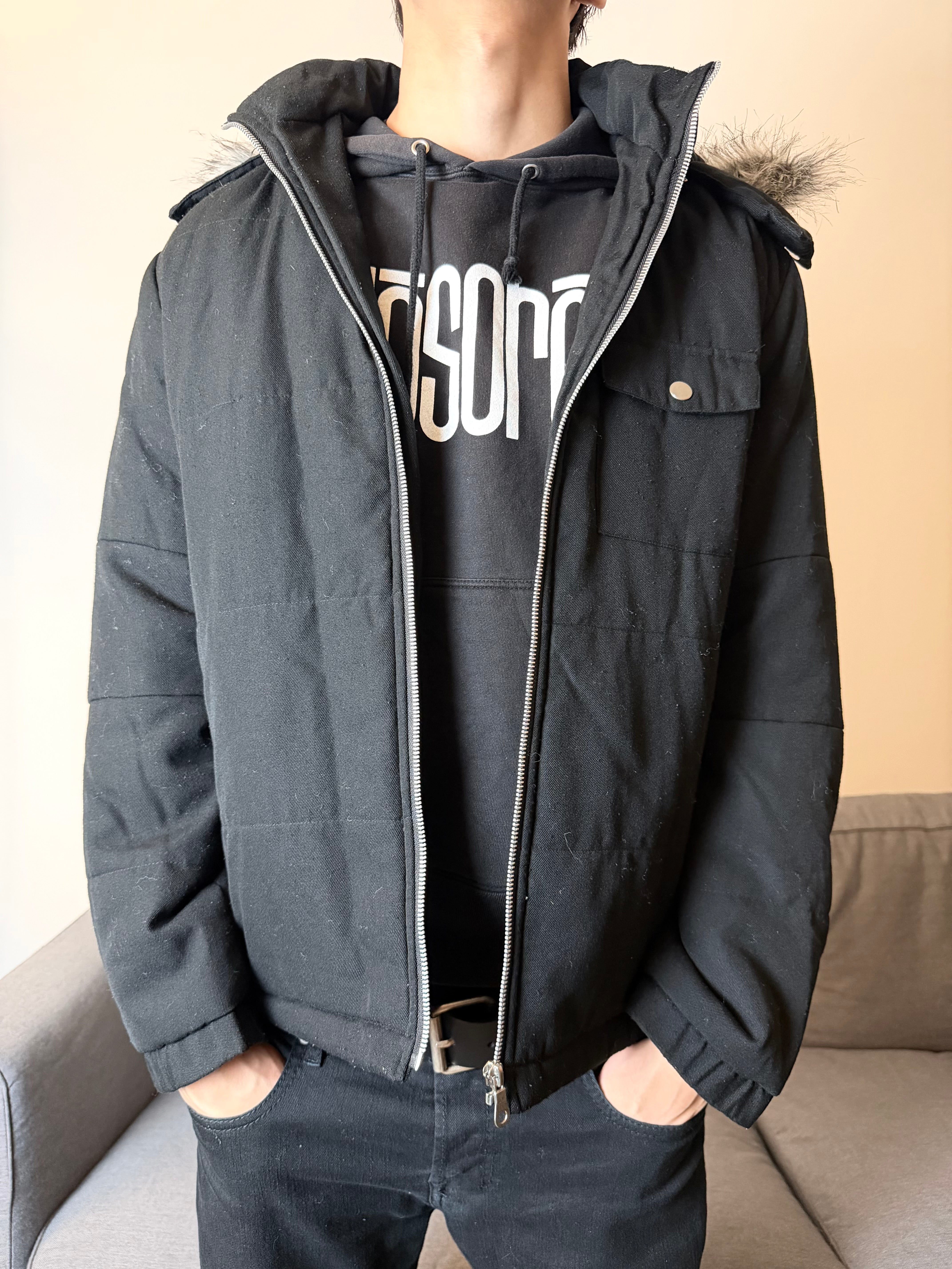 Matte black quilted shell with a warm padded interior. Faux-fur trim on the hood for that old-school Japanese street charm. Soft, durable, and reliably heat-locking without feeling bulky.