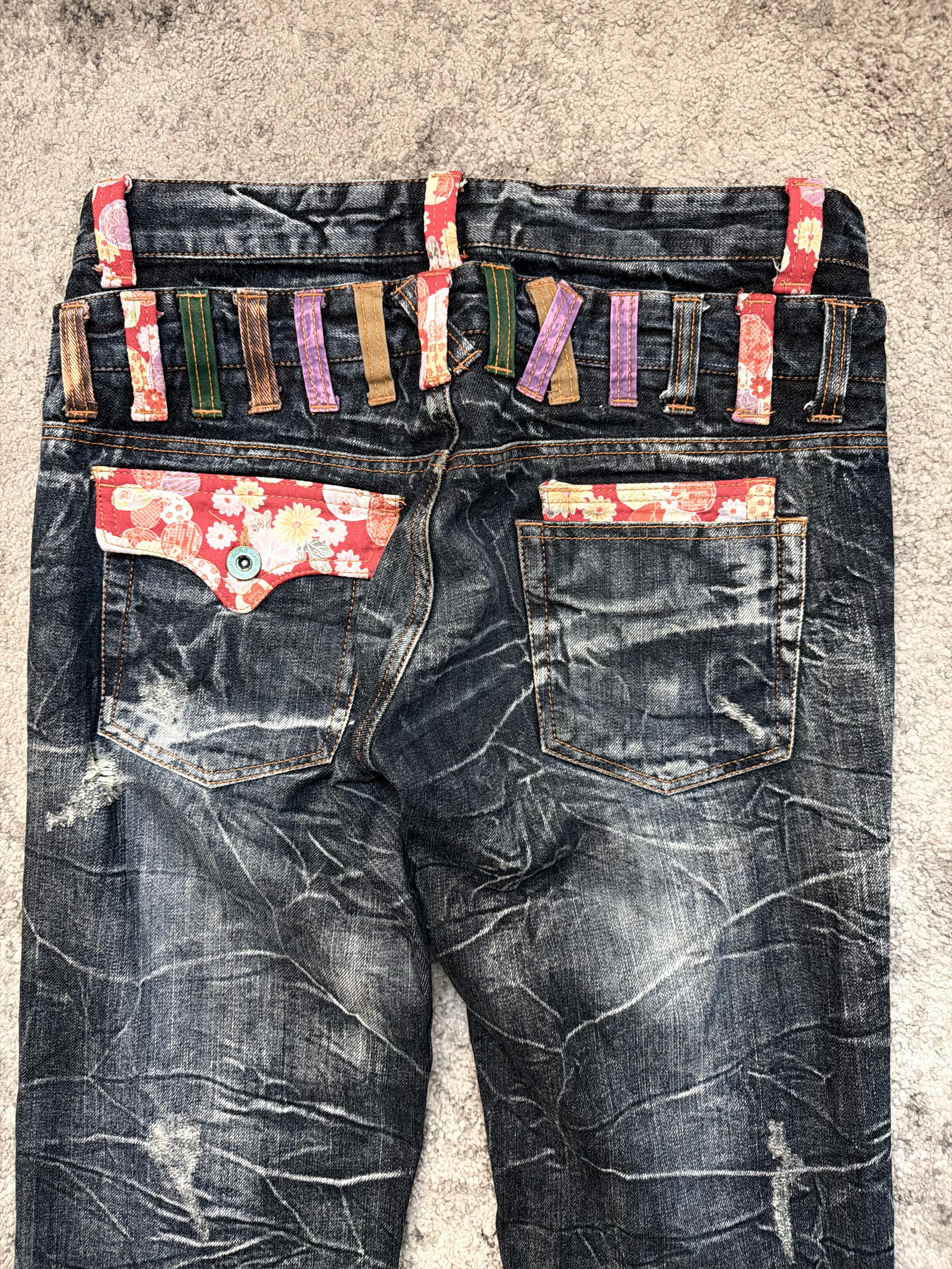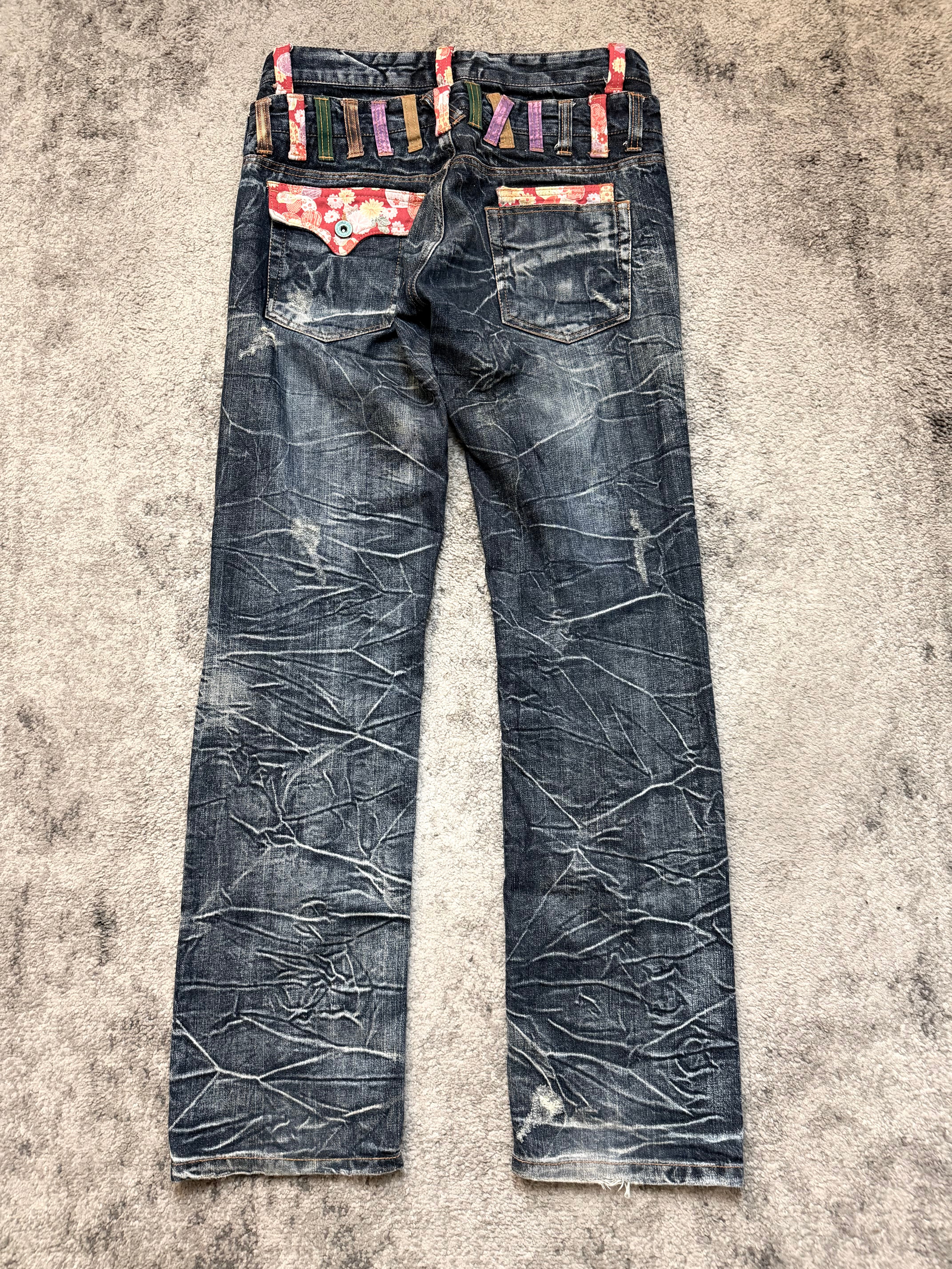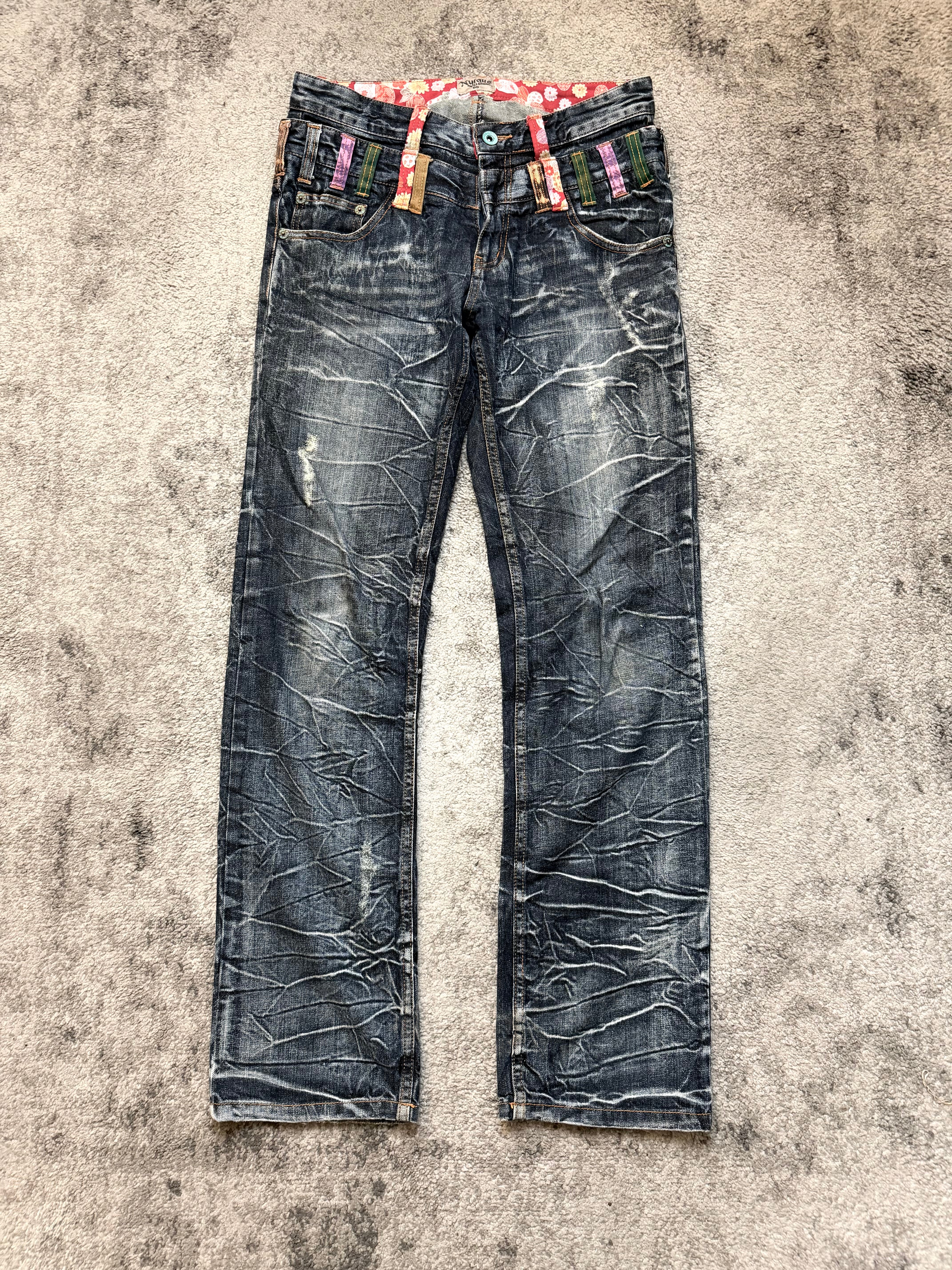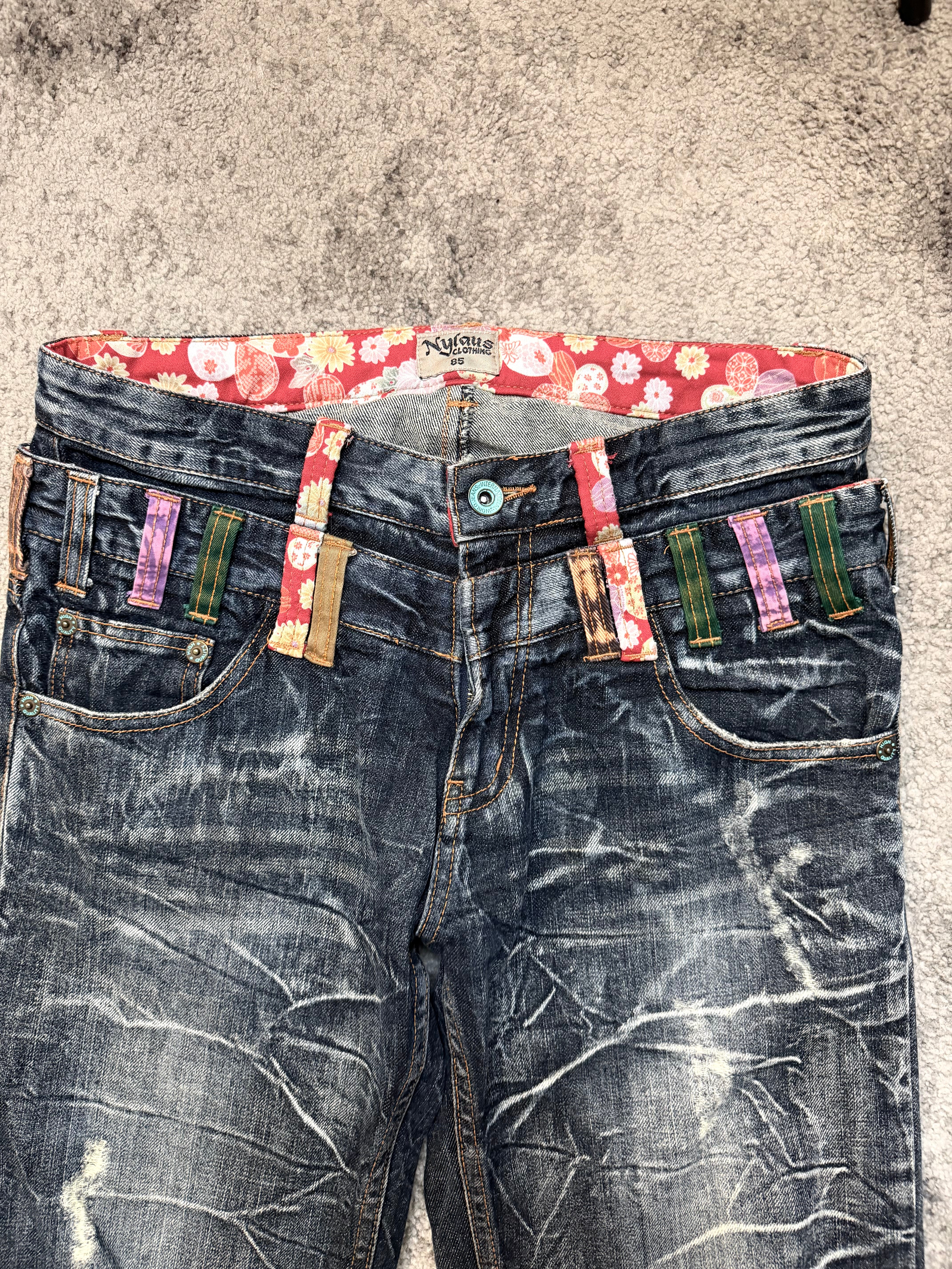 This pair from NYLAUS captures the raw, fearless energy of early 2000s Japanese street fashion — where denim became art. The heavy crinkle distressing and colorful patch details turn a classic silhouette into a statement of movement and individuality. A balance between chaos and control, made for those who live between the lines.