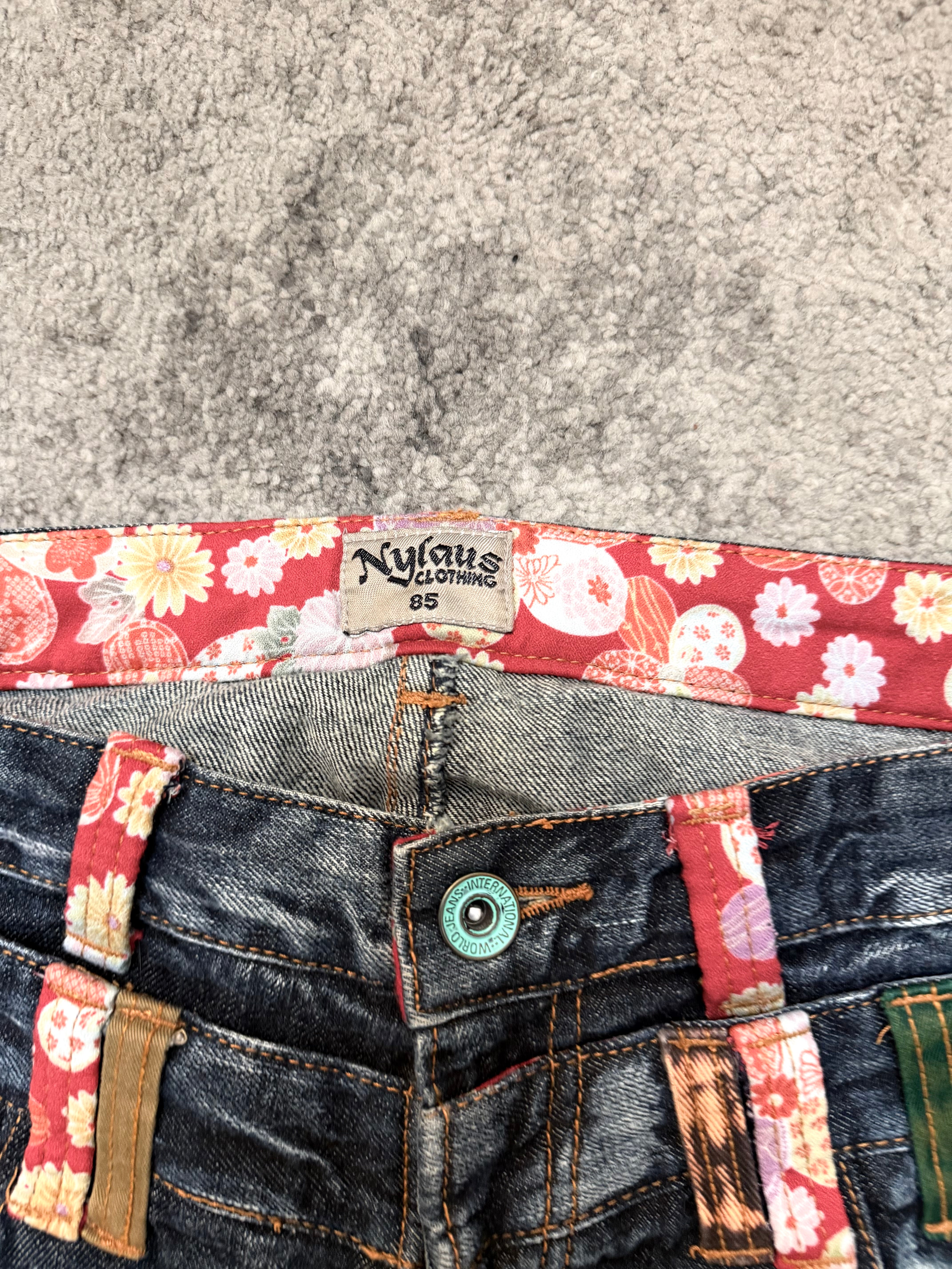 NYLAUS “Tokyo Patch Chaos Denim” – rebellion stitched in color.
