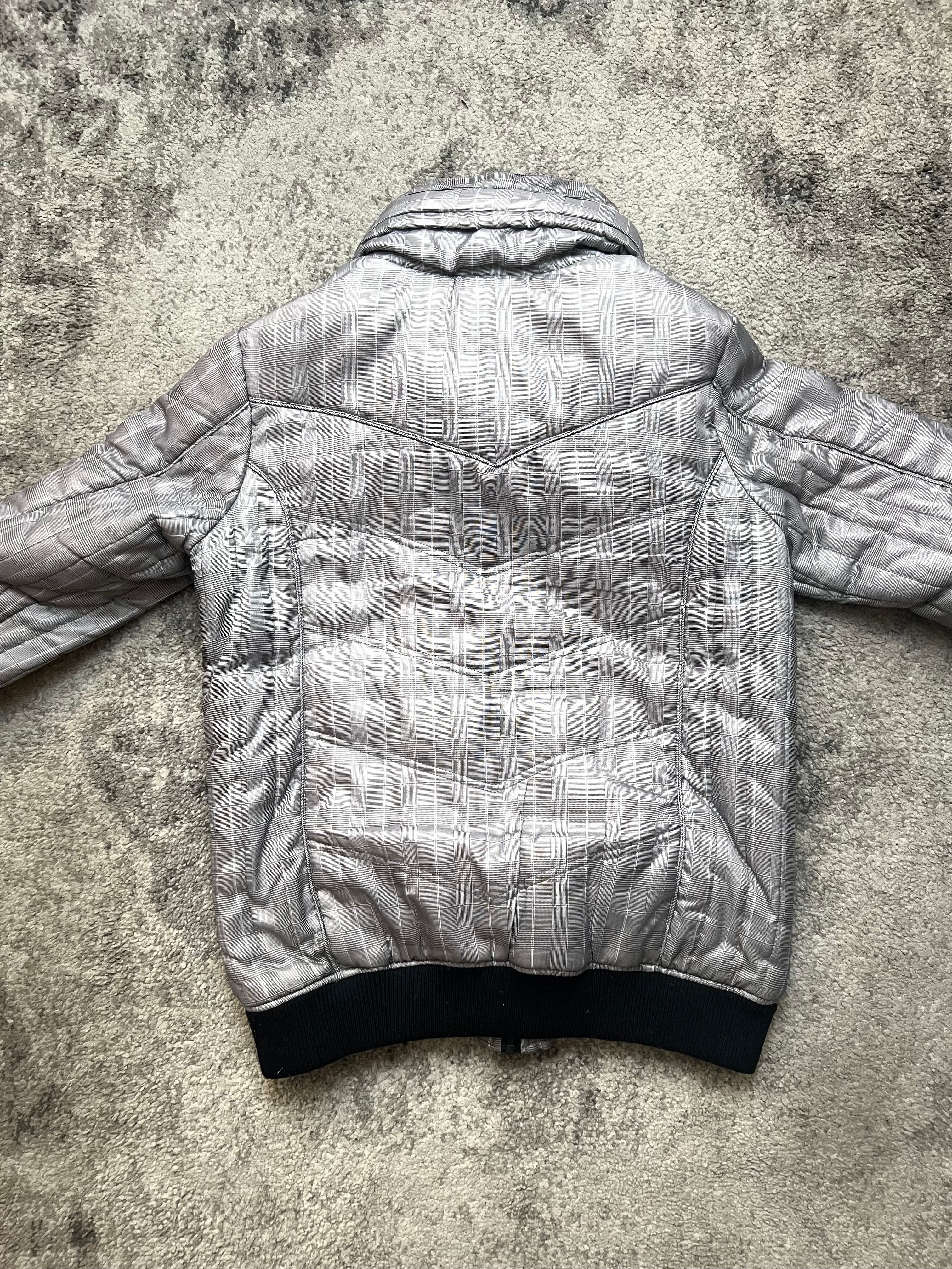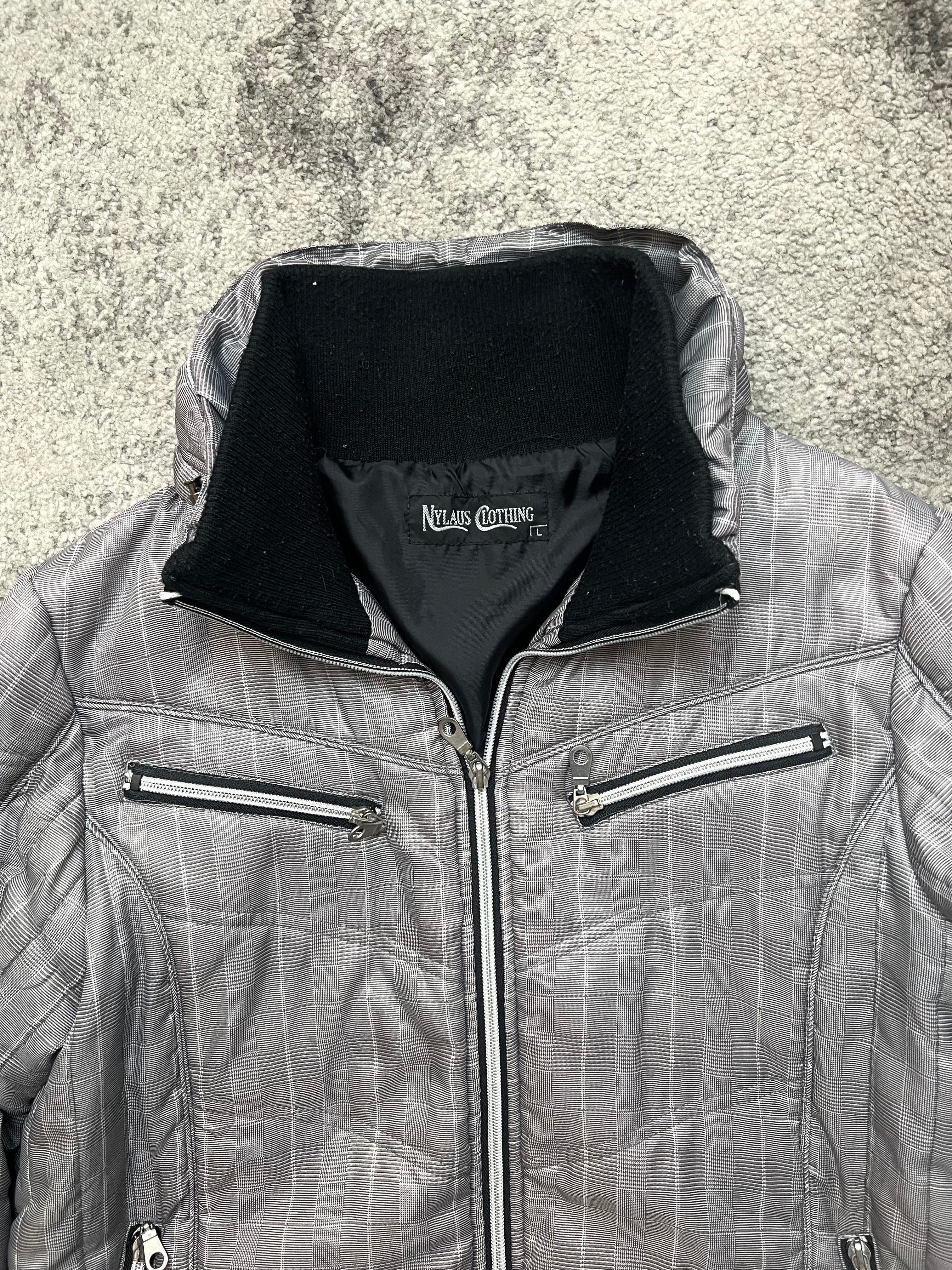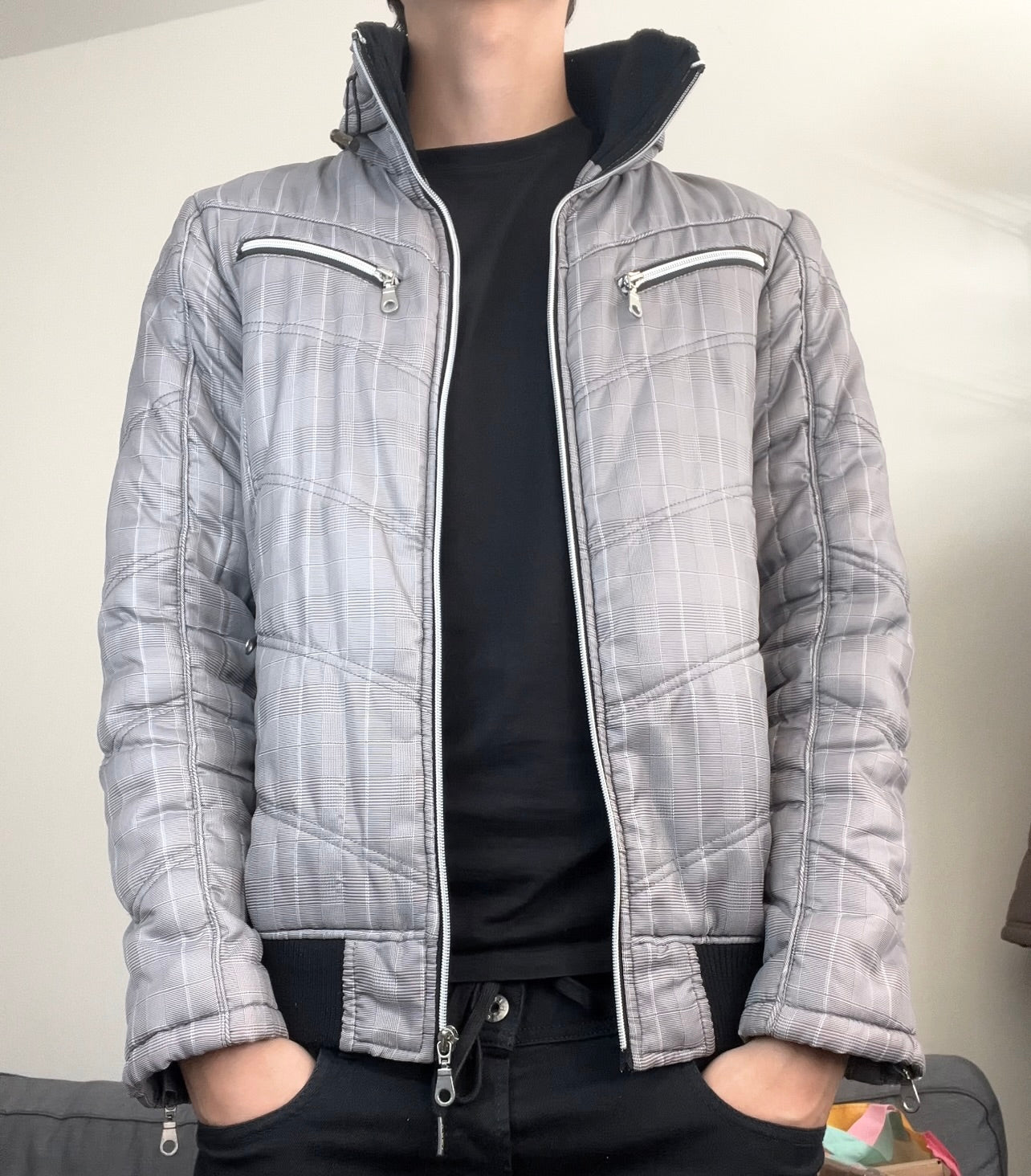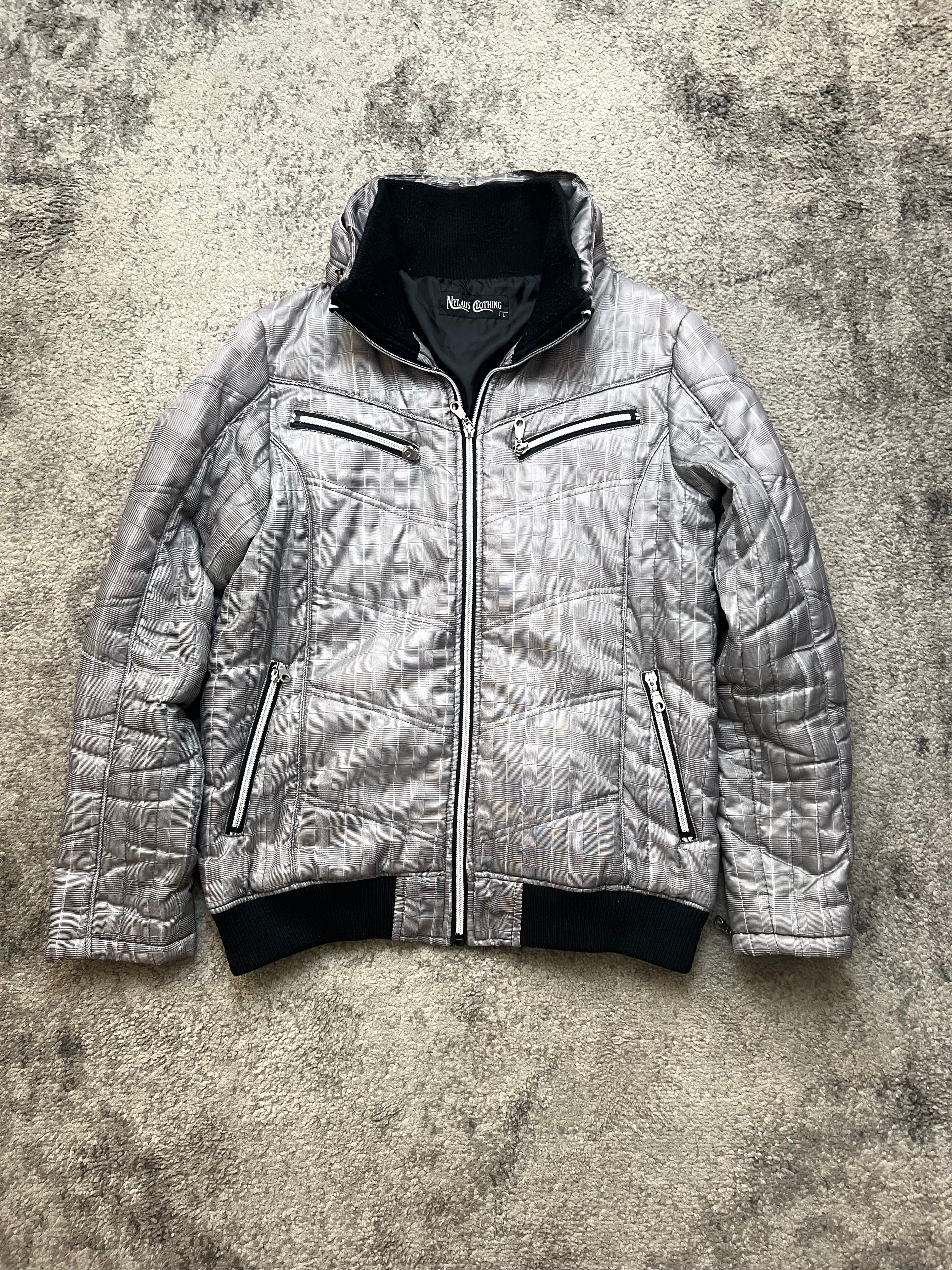 This NYLAUS puffer captures that early 2000s Tokyo cool — futuristic, sharp, and quietly bold. Crafted from a metallic silver shell with a subtle pinstripe weave, it reflects light with every movement. The design balances industrial energy with clean tailoring — zipped chest and side pockets, structured shoulders, and a ribbed hem for that classic fitted silhouette.