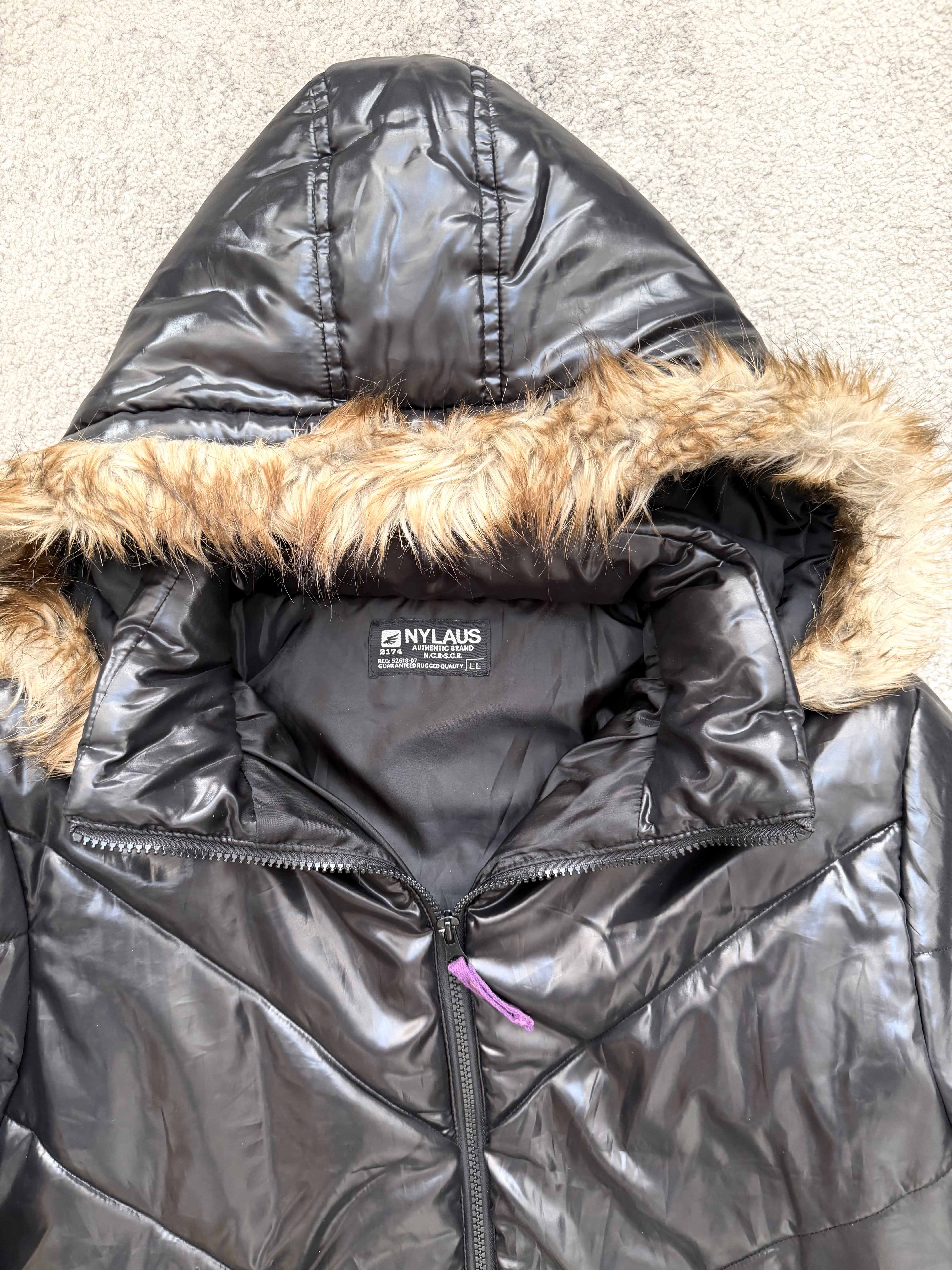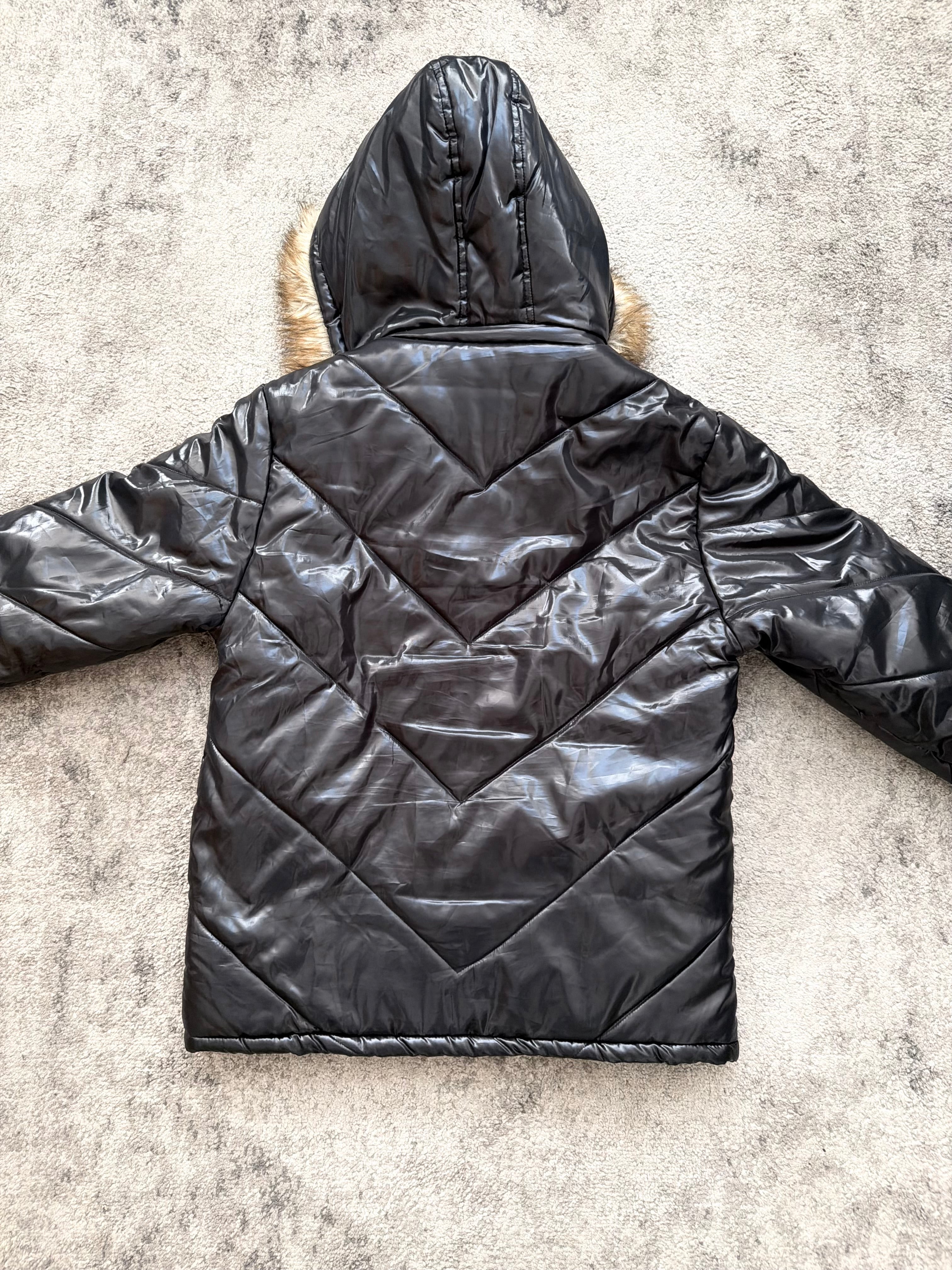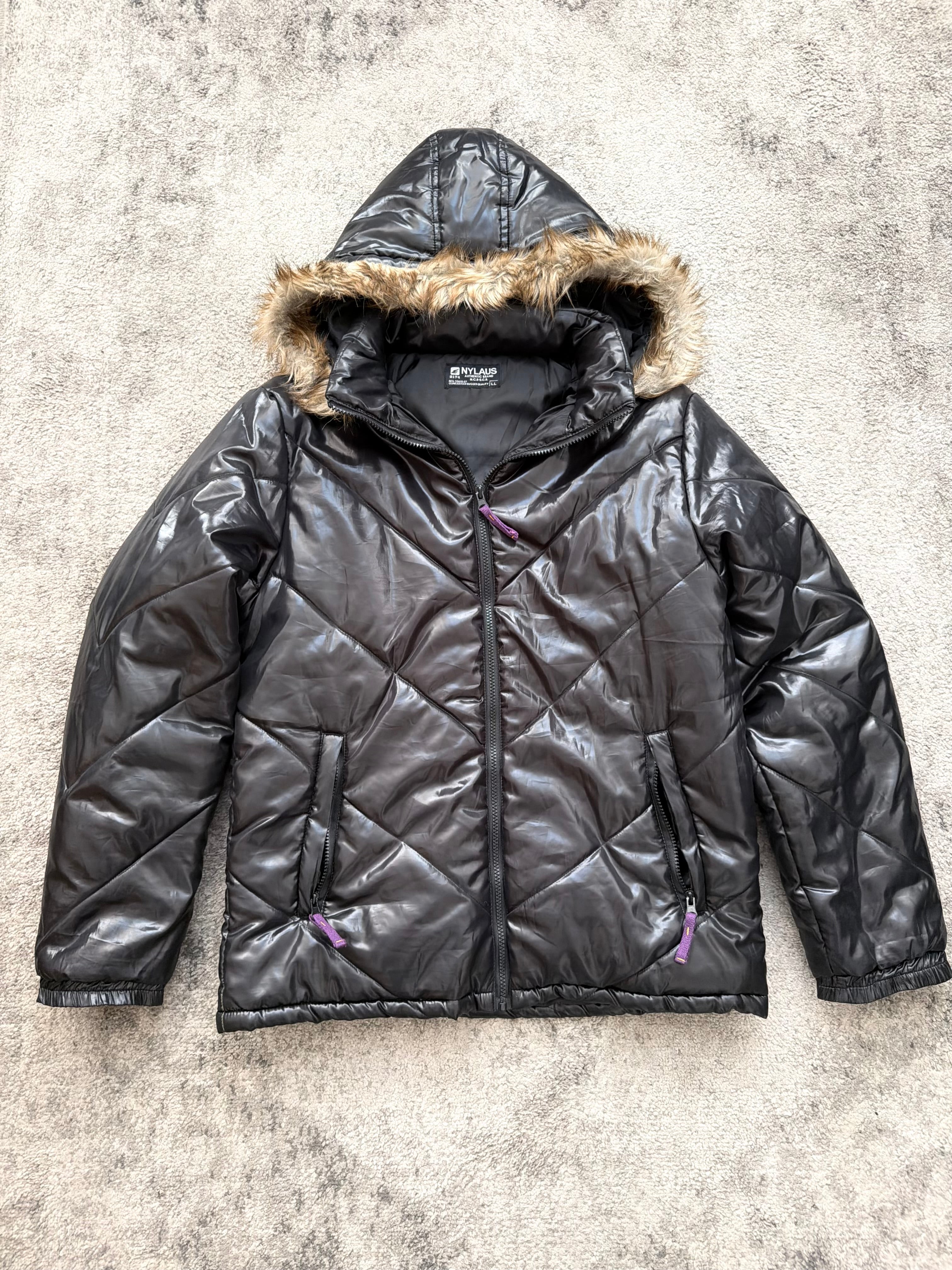 Crafted from glossy black nylon with geometric quilting and subtle purple zipper pulls that break the monochrome — a small touch that gives it that distinct Japanese underground feel. The detachable faux-fur hood adds warmth and attitude, making it perfect for both street layering and cold-weather wear.